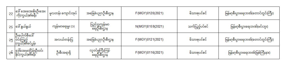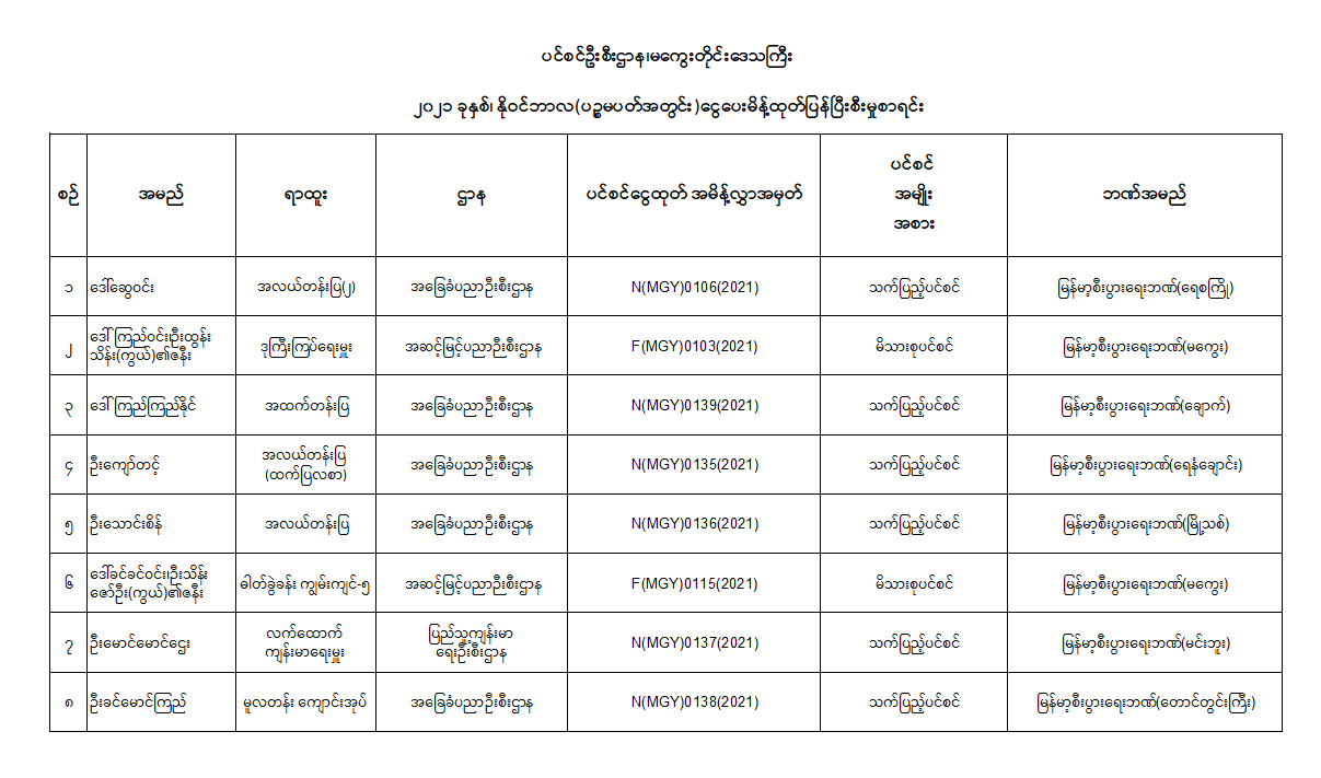 ပင်စင်ဦးစီးဌာန၊ မကွေးတိုင်းဒေသကြီး၏ ငွေပေးမိန့်ထုတ်ပြန်မှုစာရင်း (နိုဝင်ဘာ-ပဉ္စမအပတ်) pension_editor Thu, 12/02/2021 - 15:39