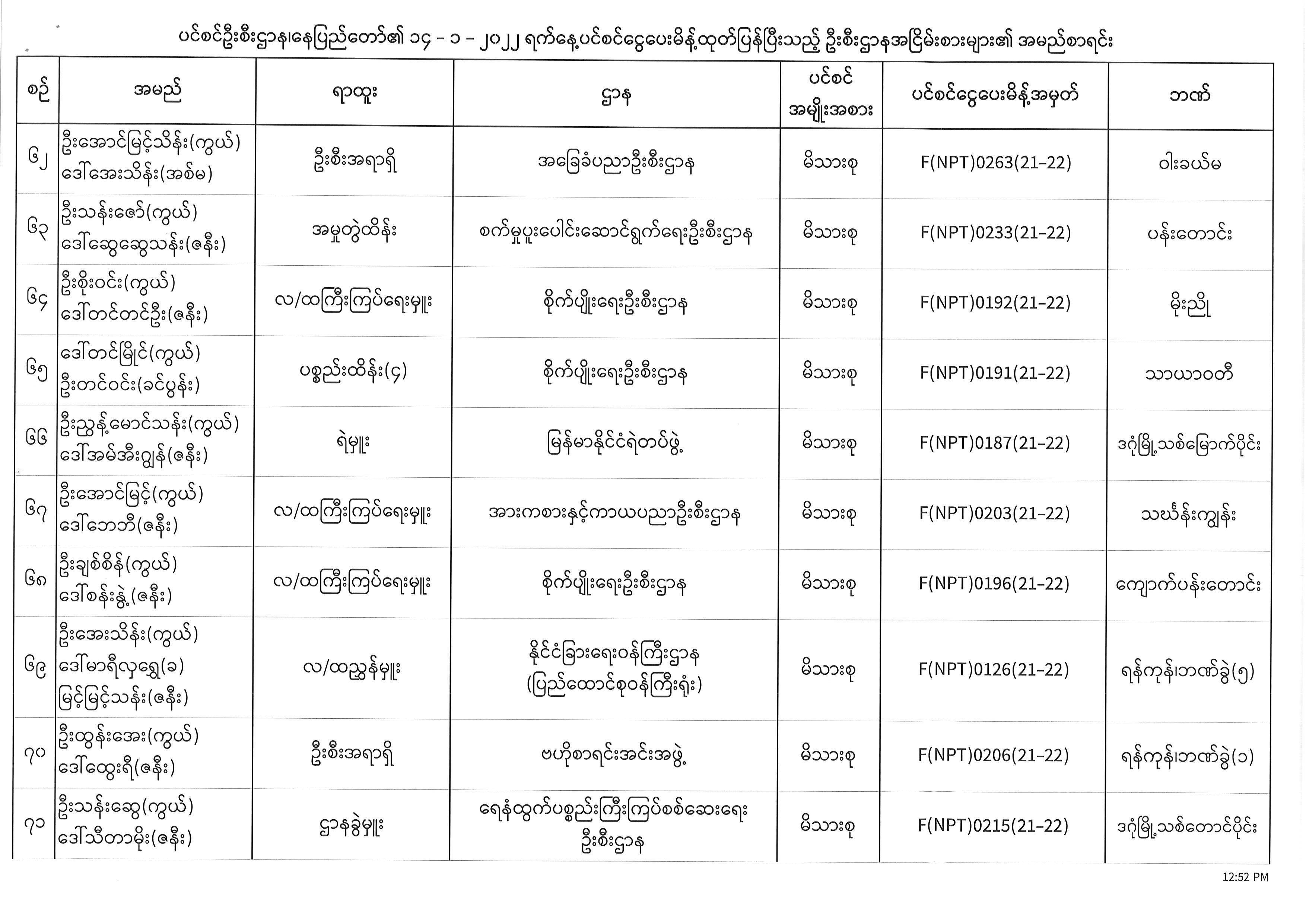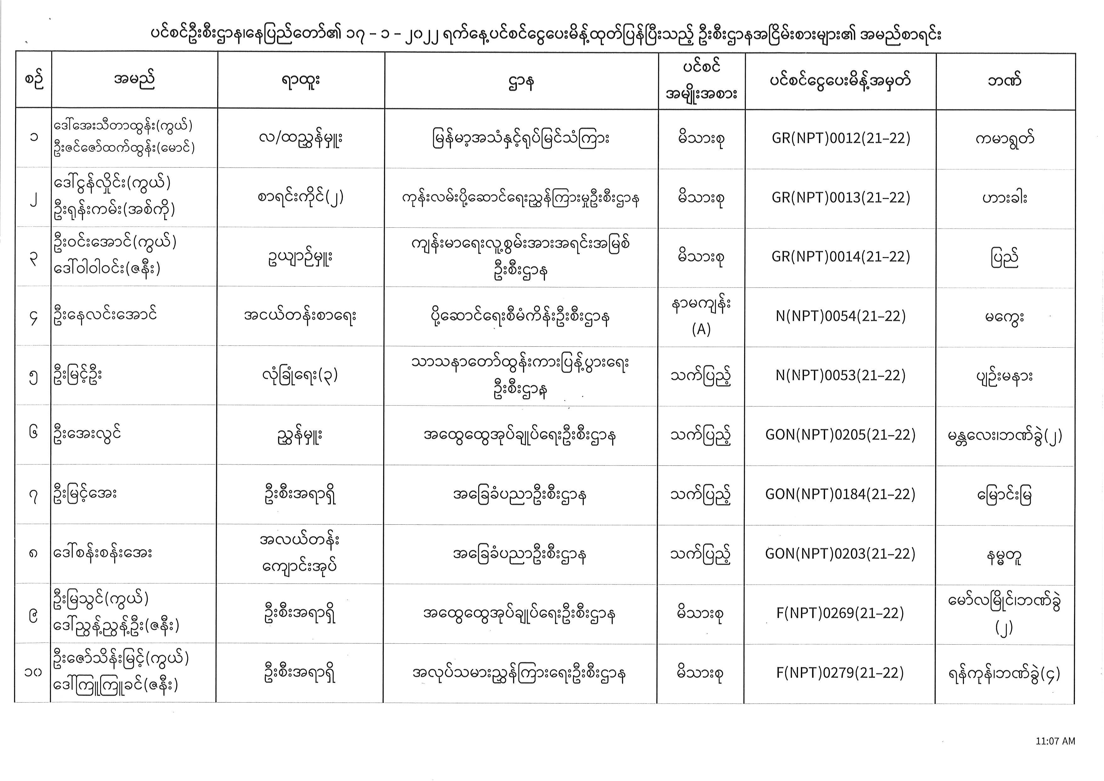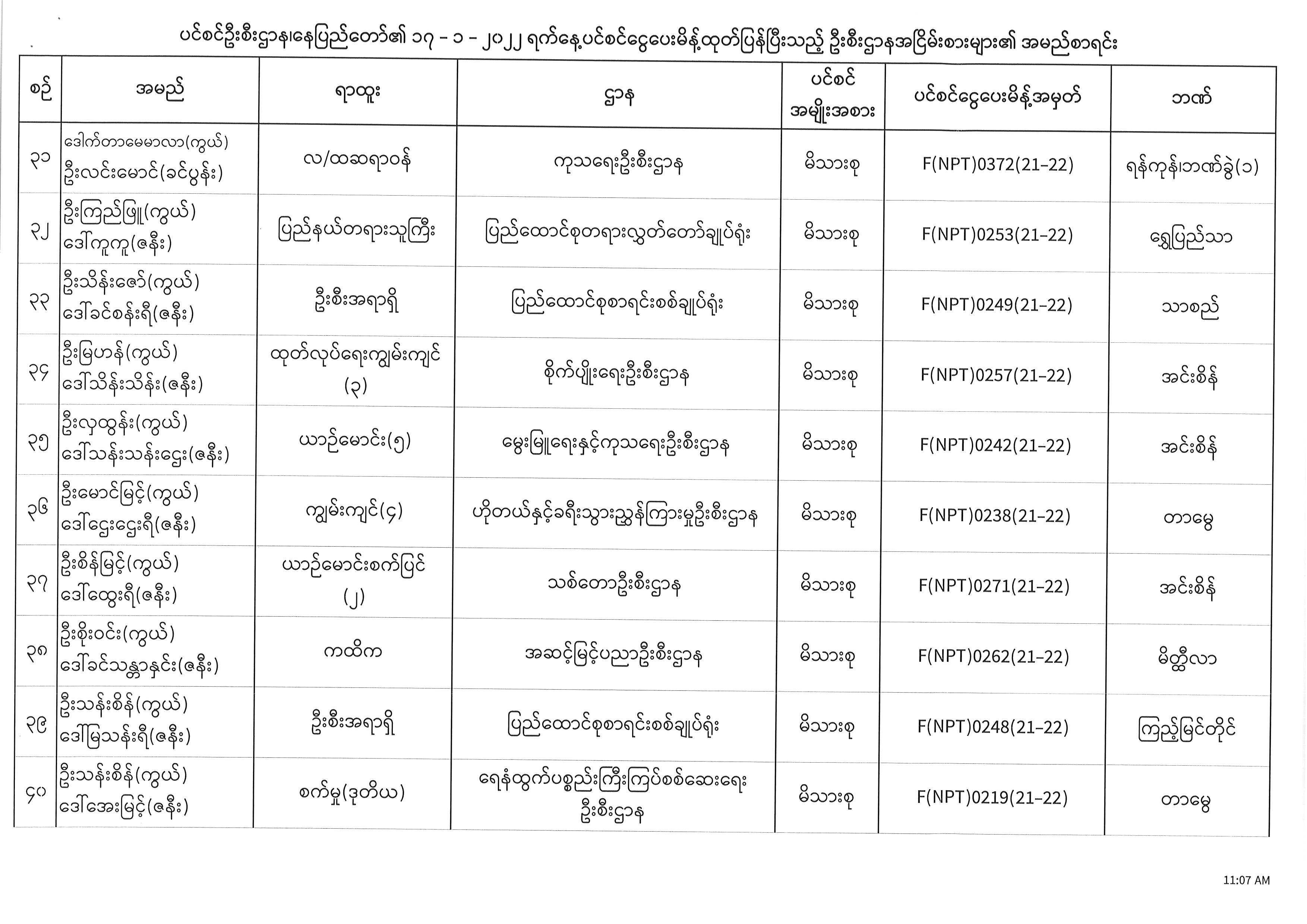 ပင်စင်ဦးစီးဌာန၊ နေပြည်တော်၏ ငွေပေးမိန့်ထုတ်ပြန်မှုစာရင်း (၁၄-၁-၂၀၂၁ နှင့် ၁၇-၁-၂၀၂၁) pension_editor Wed, 01/19/2022 - 13:29