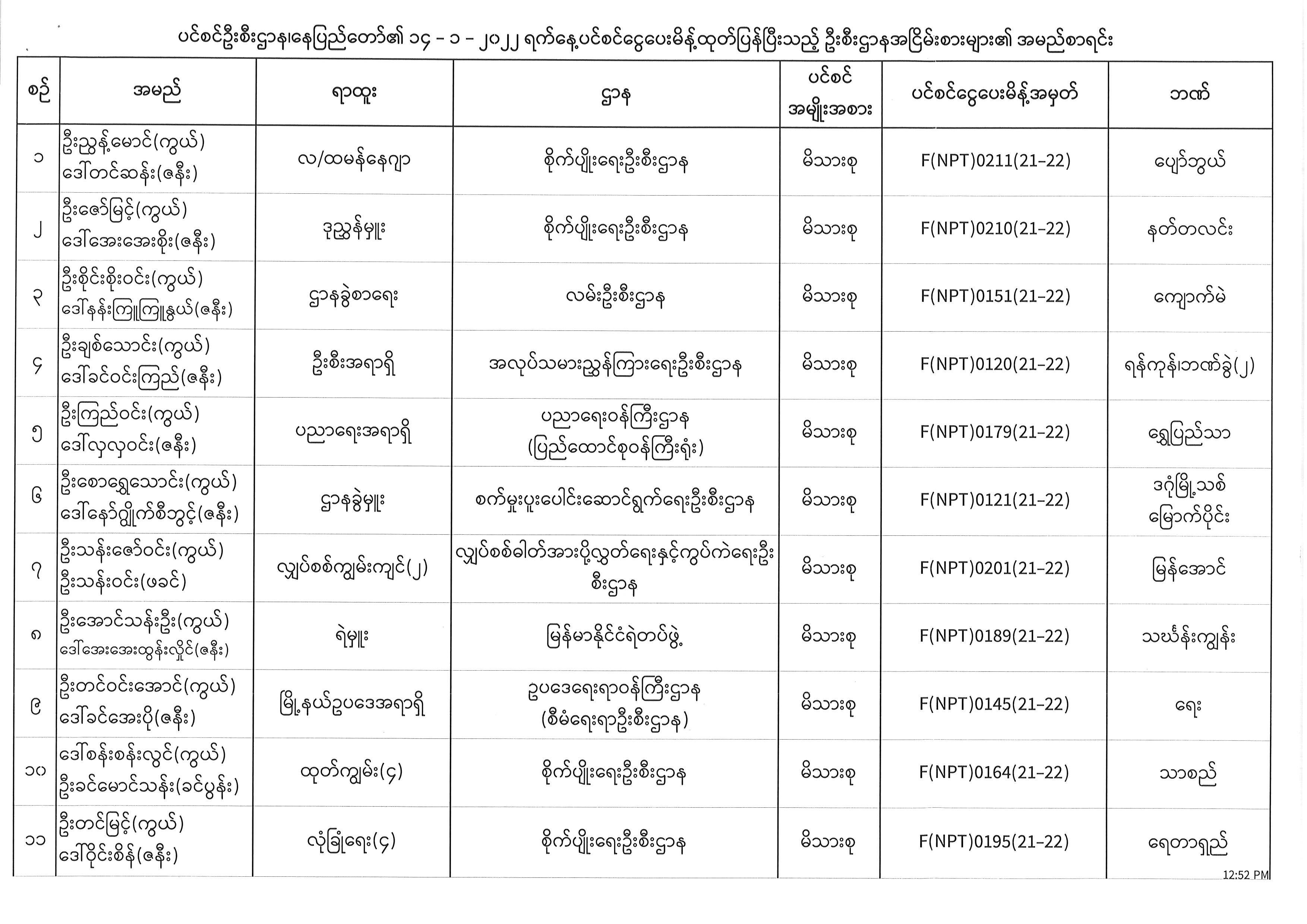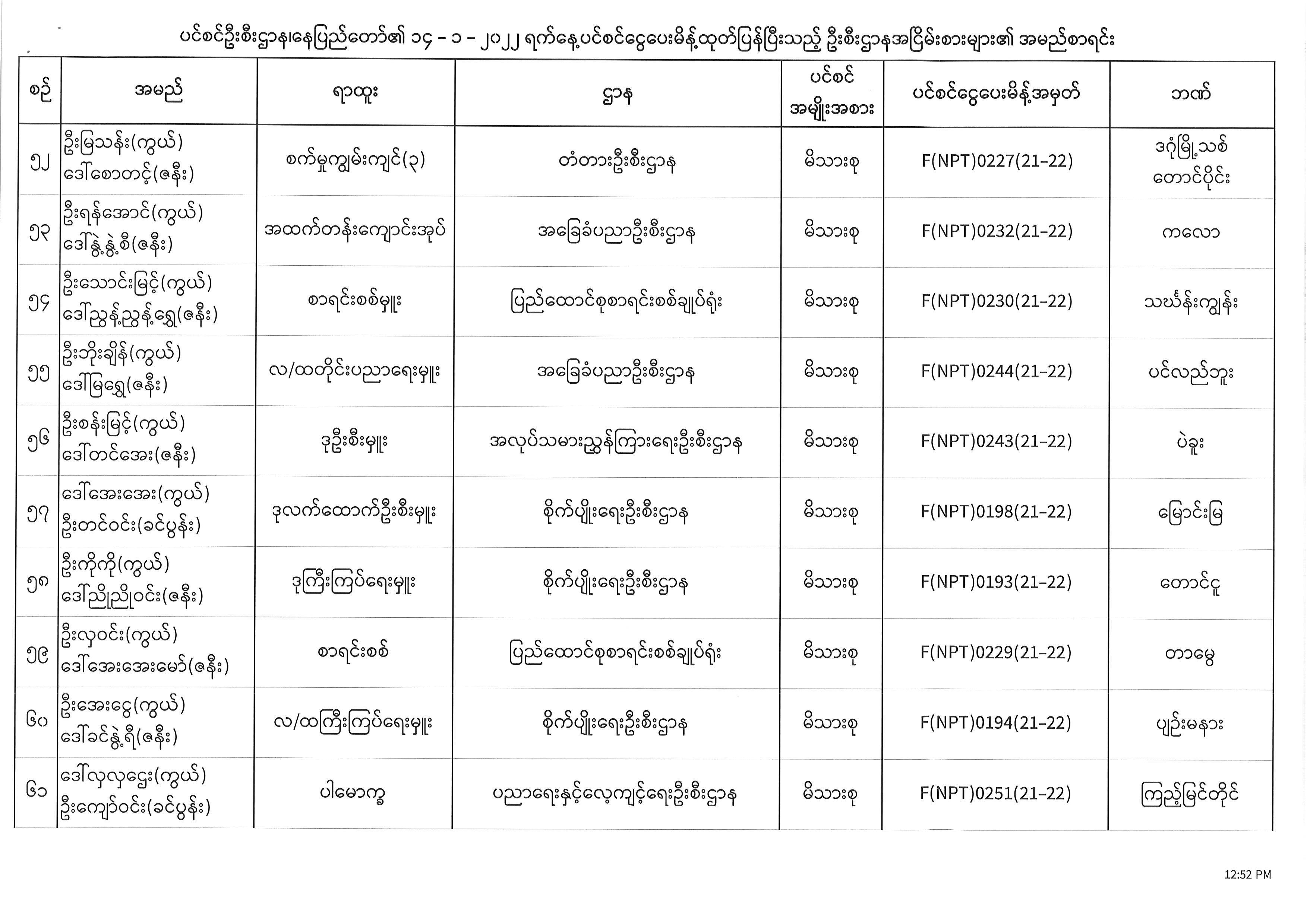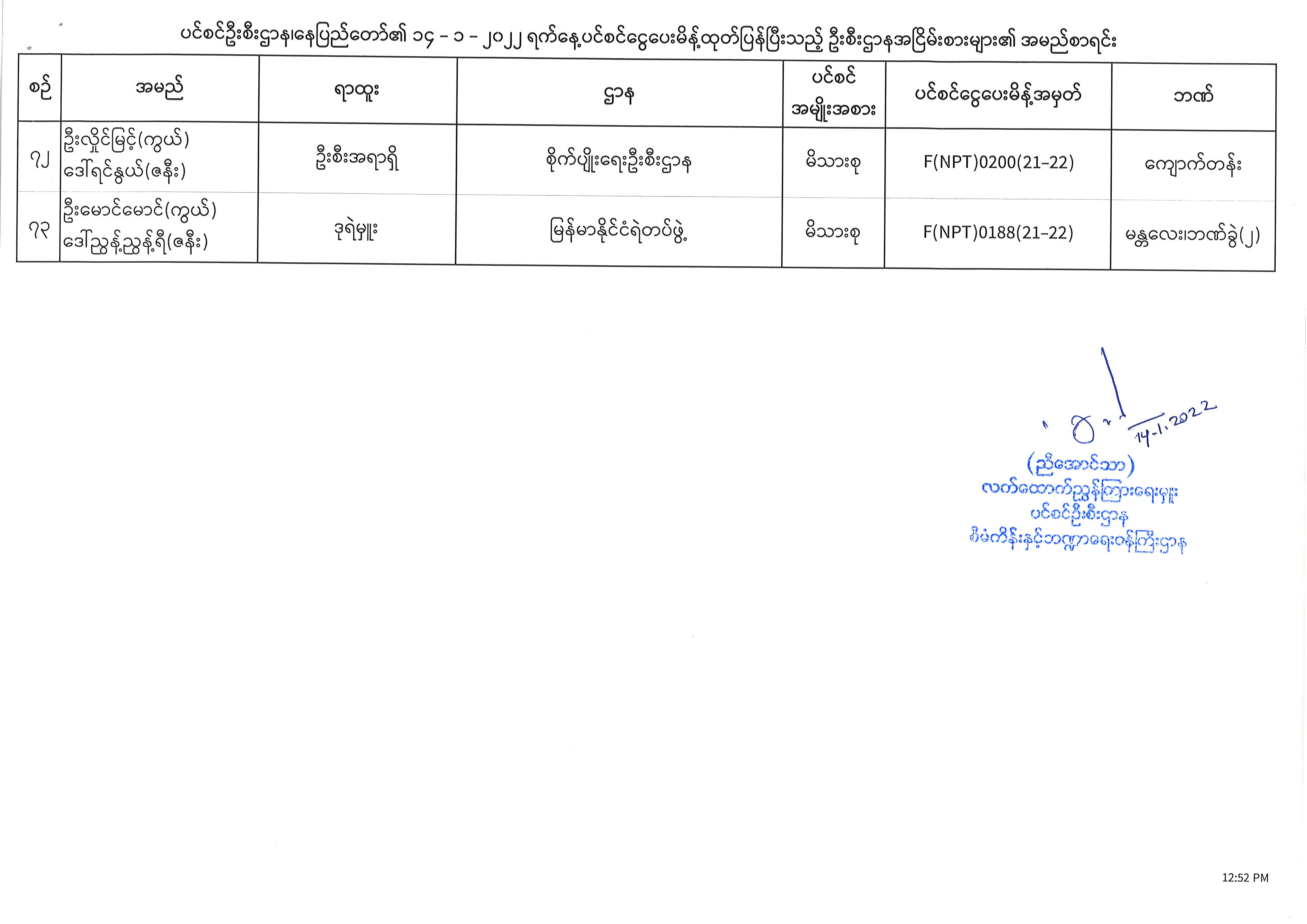 ပင်စင်ဦးစီးဌာန၊ နေပြည်တော်၏ ငွေပေးမိန့်ထုတ်ပြန်မှုစာရင်း (၁၄-၁-၂၀၂၁ နှင့် ၁၇-၁-၂၀၂၁) pension_editor Wed, 01/19/2022 - 13:29