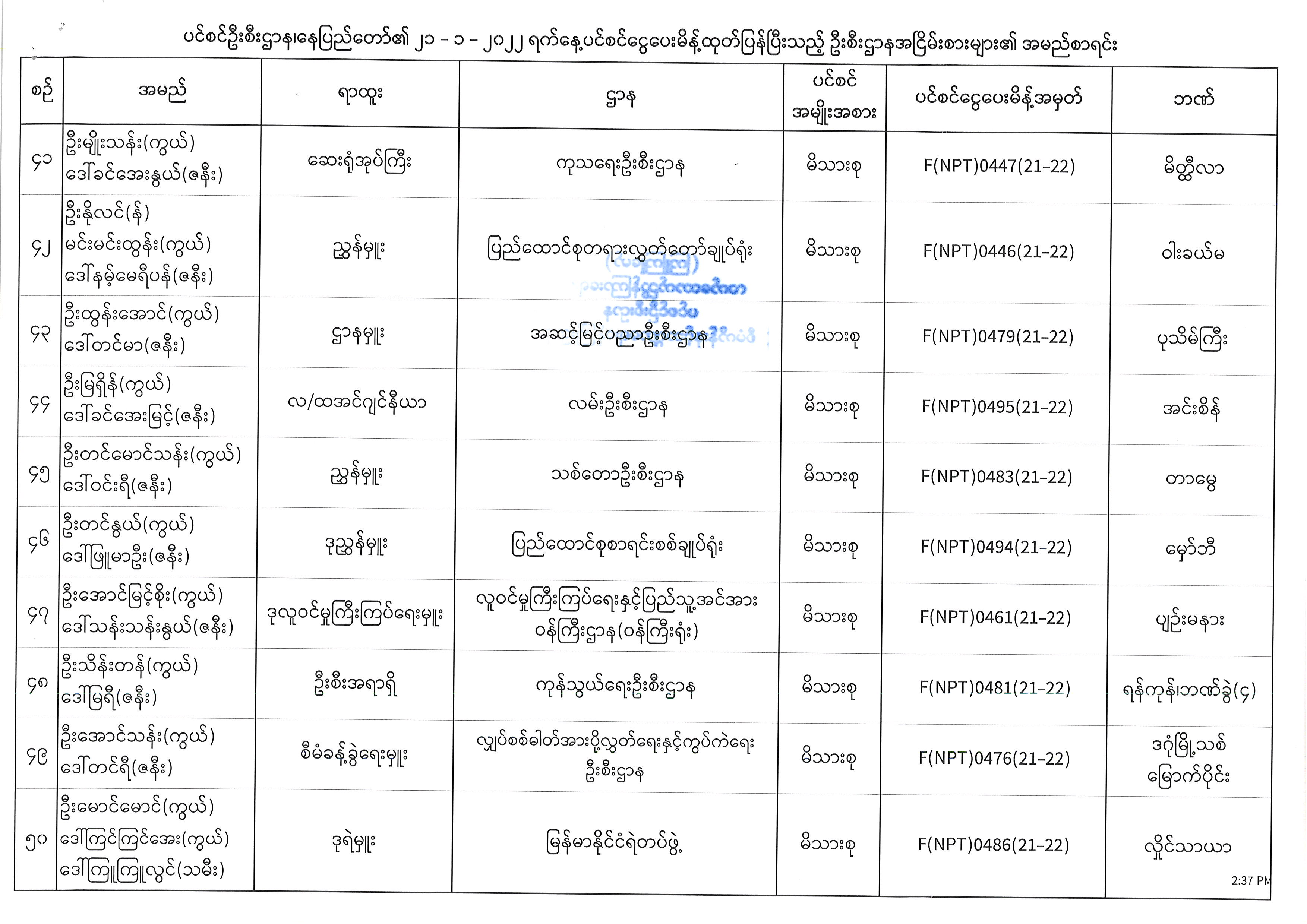 ပင်စင်ဦးစီးဌာန၊ နေပြည်တော်၏ ငွေပေးမိန့်ထုတ်ပြန်မှုစာရင်း (၂၀-၁-၂၀၂၂) pension_editor Mon, 01/24/2022 - 14:19