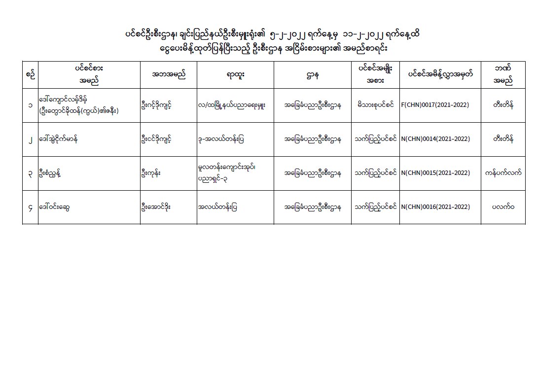 ပင်စင်ဦးစီးဌာန၊ ချင်းပြည်နယ်ဦးစီးမှူးရုံး၏ ငွေပေးမိန့်ထုတ်ပြန်မှုစာရင်း (၅-၂-၂၀၂၂ မှ ၁၁-၂-၂၀၂၂) pension_editor Mon, 02/14/2022 - 11:12