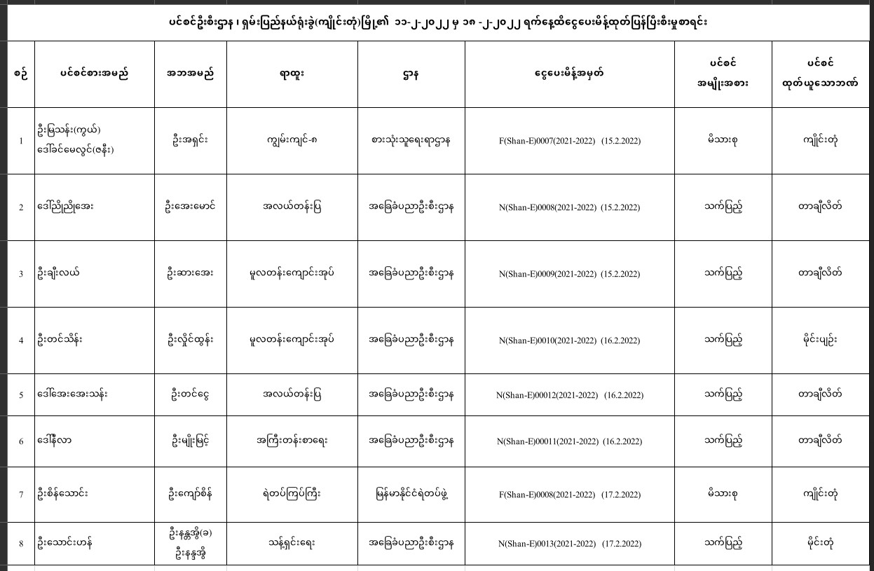 ပင်စင်ဦးစီးဌာန၊ ရှမ်းပြည်နယ်ရုံးခွဲ(ကျိုင်းတုံမြို့)၏ ငွေပေးမိန့်ထုတ်ပြန်မှုစာရင်း (၁၁-၂-၂၀၂၂ မှ ၁၈-၂-၂၀၂၂) pension_editor Fri, 02/18/2022 - 15:58