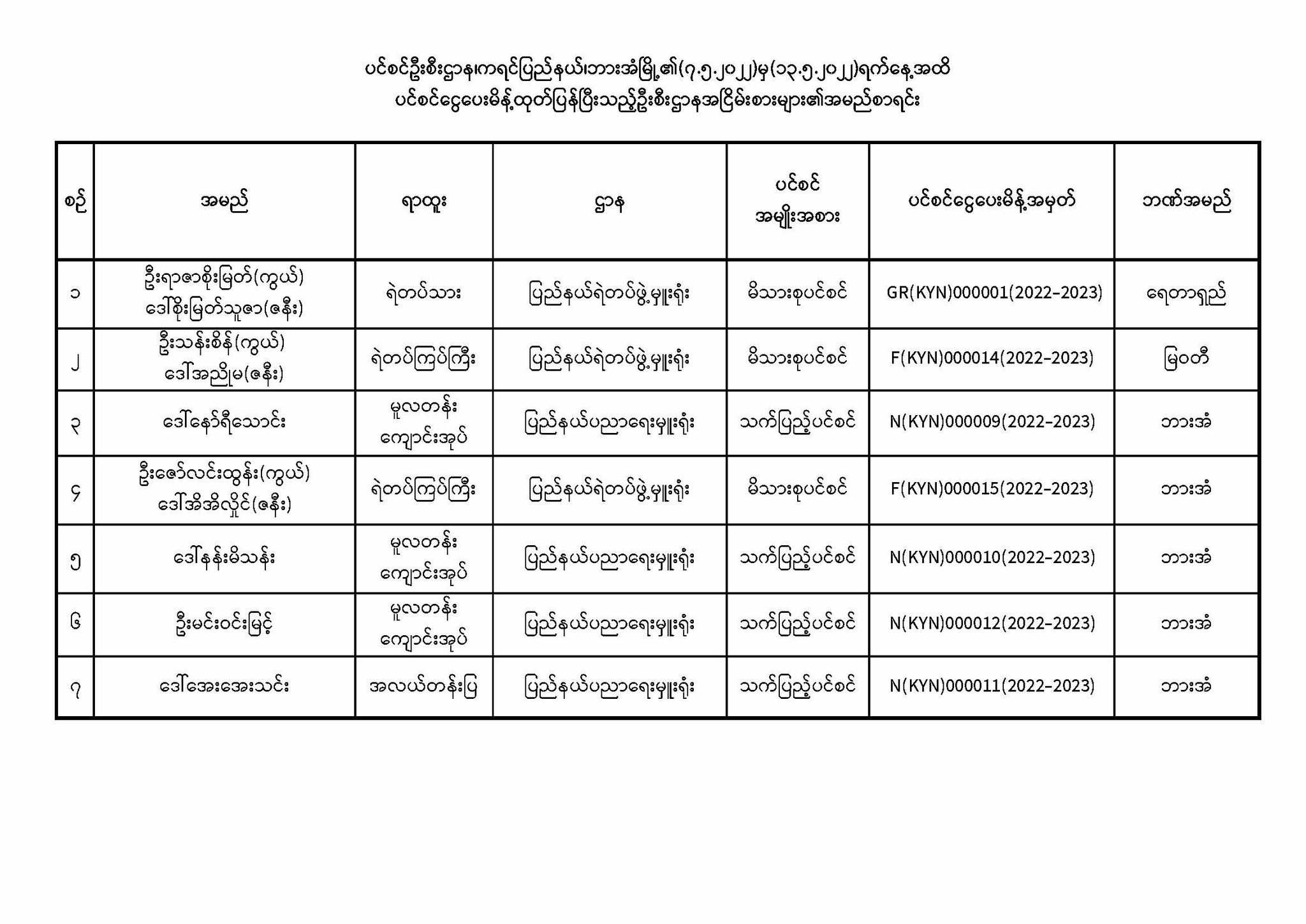 ပင်စင်ဦးစီးဌာန၊ ကရင်ပြည်နယ်၏ ငွေပေးမိန့်ထုတ်ပြန်မှုစာရင်း (၇-၅-၂၀၂၂ မှ ၁၃-၅-၂၀၂၂) pension_editor Fri, 05/13/2022 - 11:31