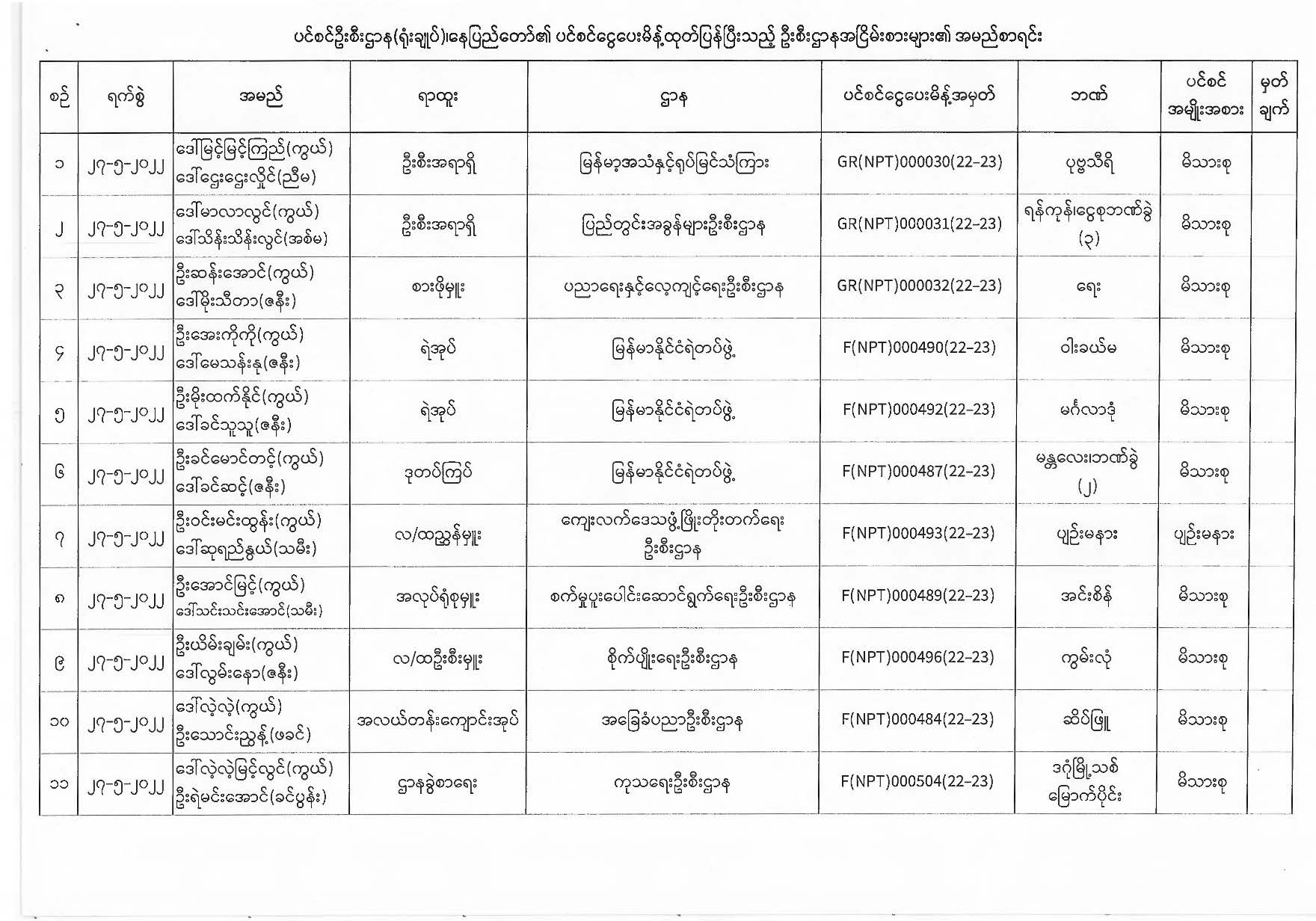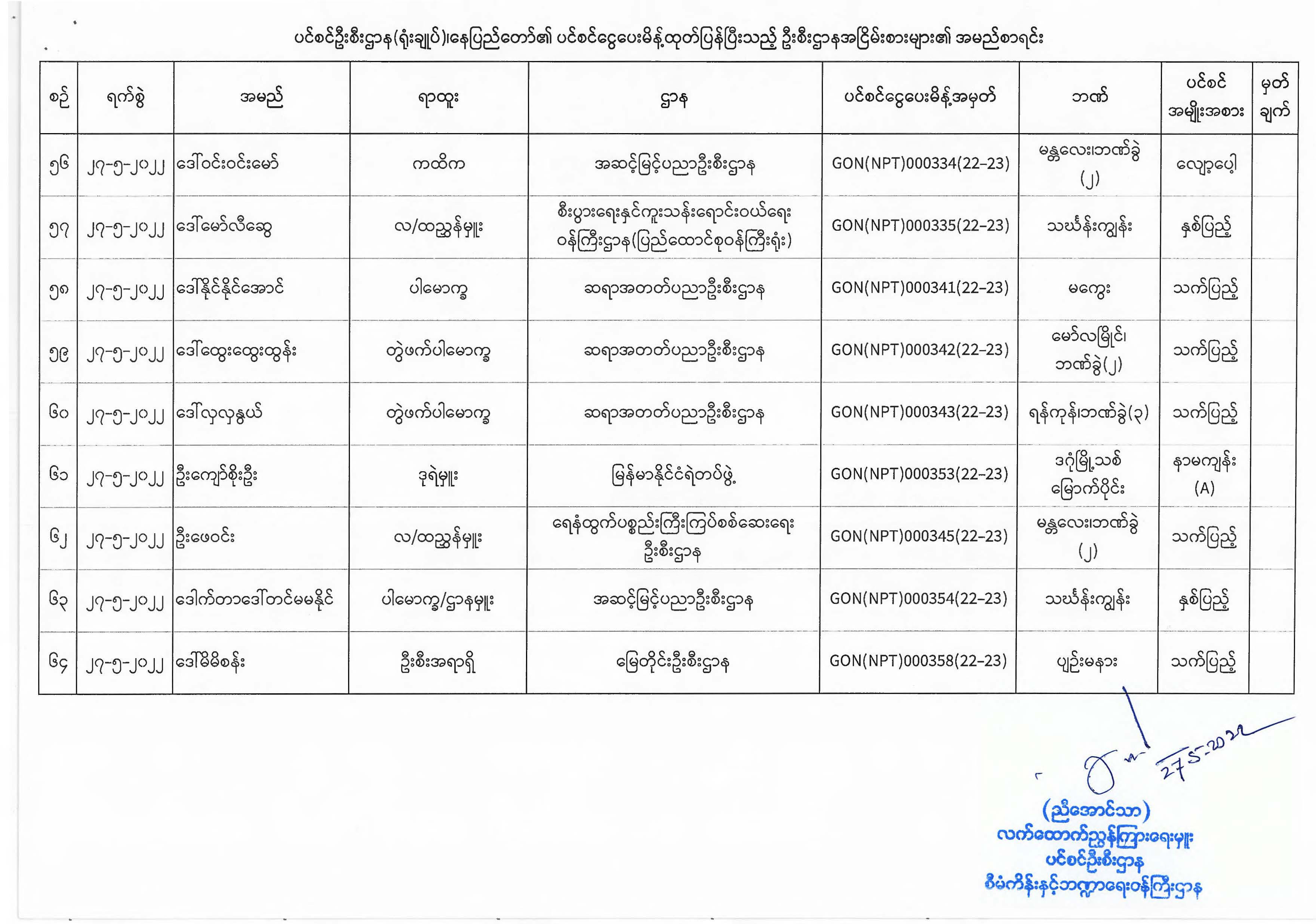 ပင်စင်ဦးစီးဌာန၊ နေပြည်တော်၏ ငွေပေးမိန့်ထုတ်ပြန်မှုစာရင်း (၂၇-၅-၂၀၂၂)