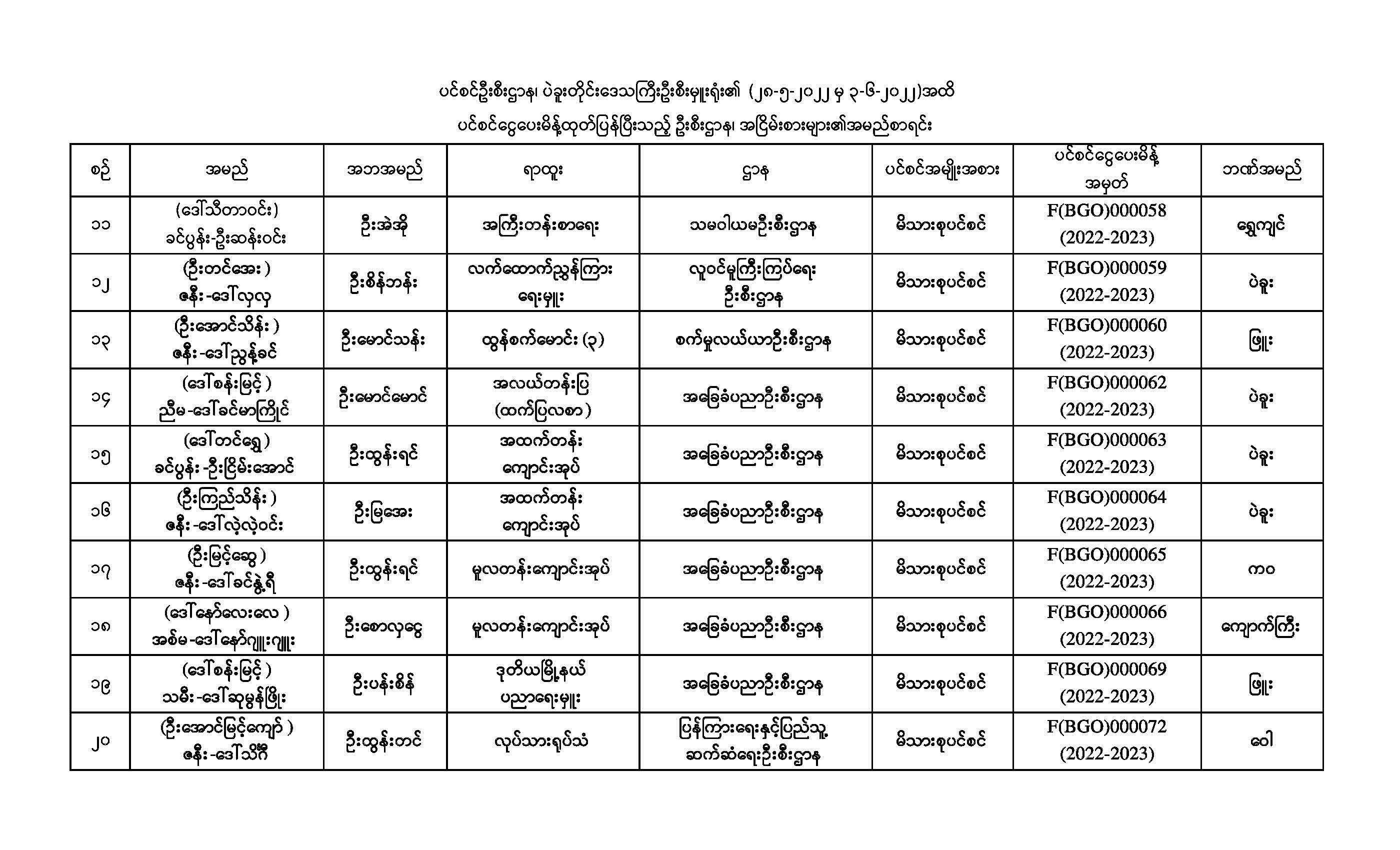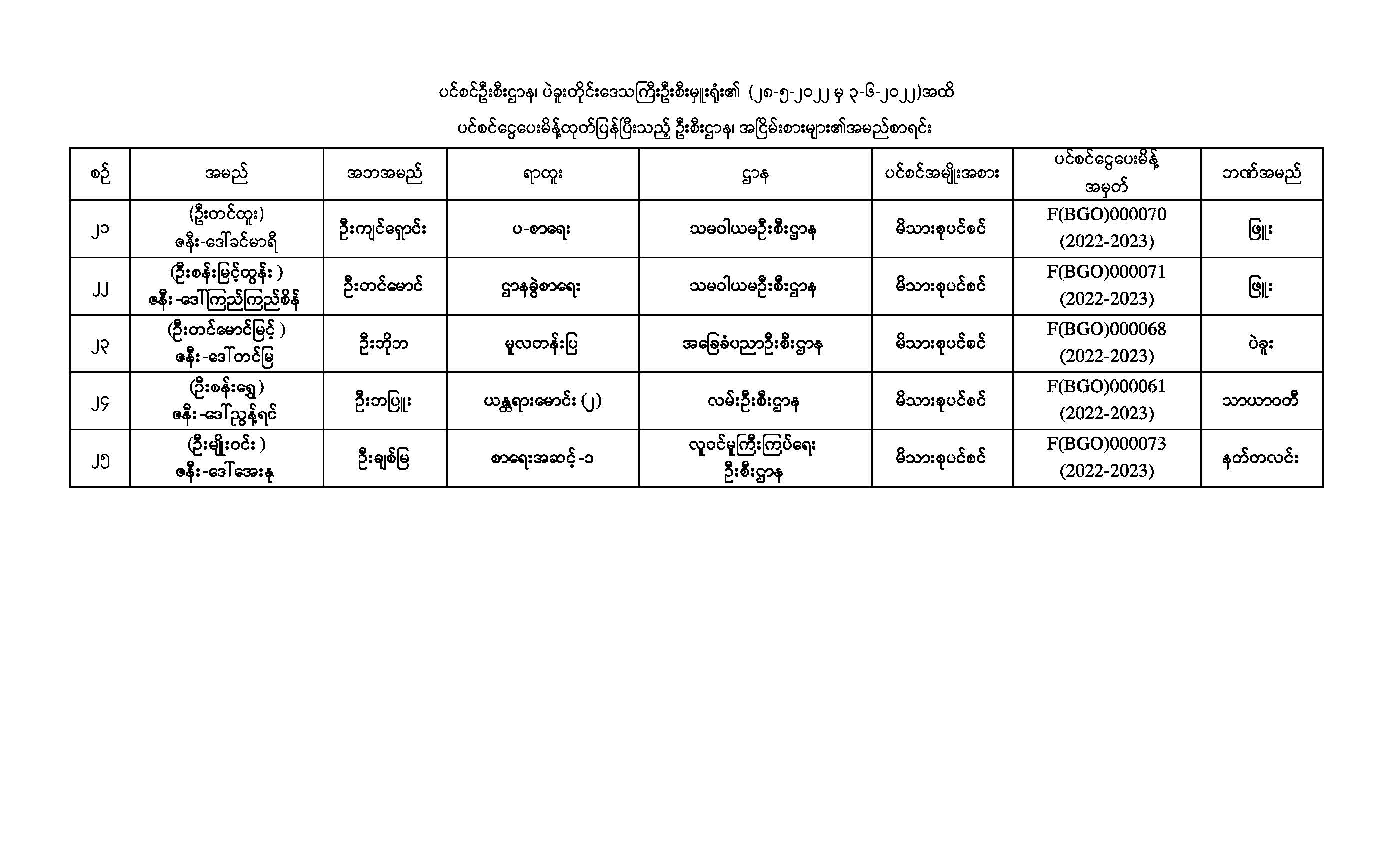 ပင်စင်ဦးစီးဌာန၊ ပဲခူးတိုင်းဒေသကြီးဦးစီးမှူးရုံး၏ ငွေပေးမိန့်ထုတ်ပြန်မှုစာရင်း (၂၈-၅-၂၀၂၂ မှ ၃-၆-၂၀၂၂) pension_editor Wed, 06/08/2022 - 15:21