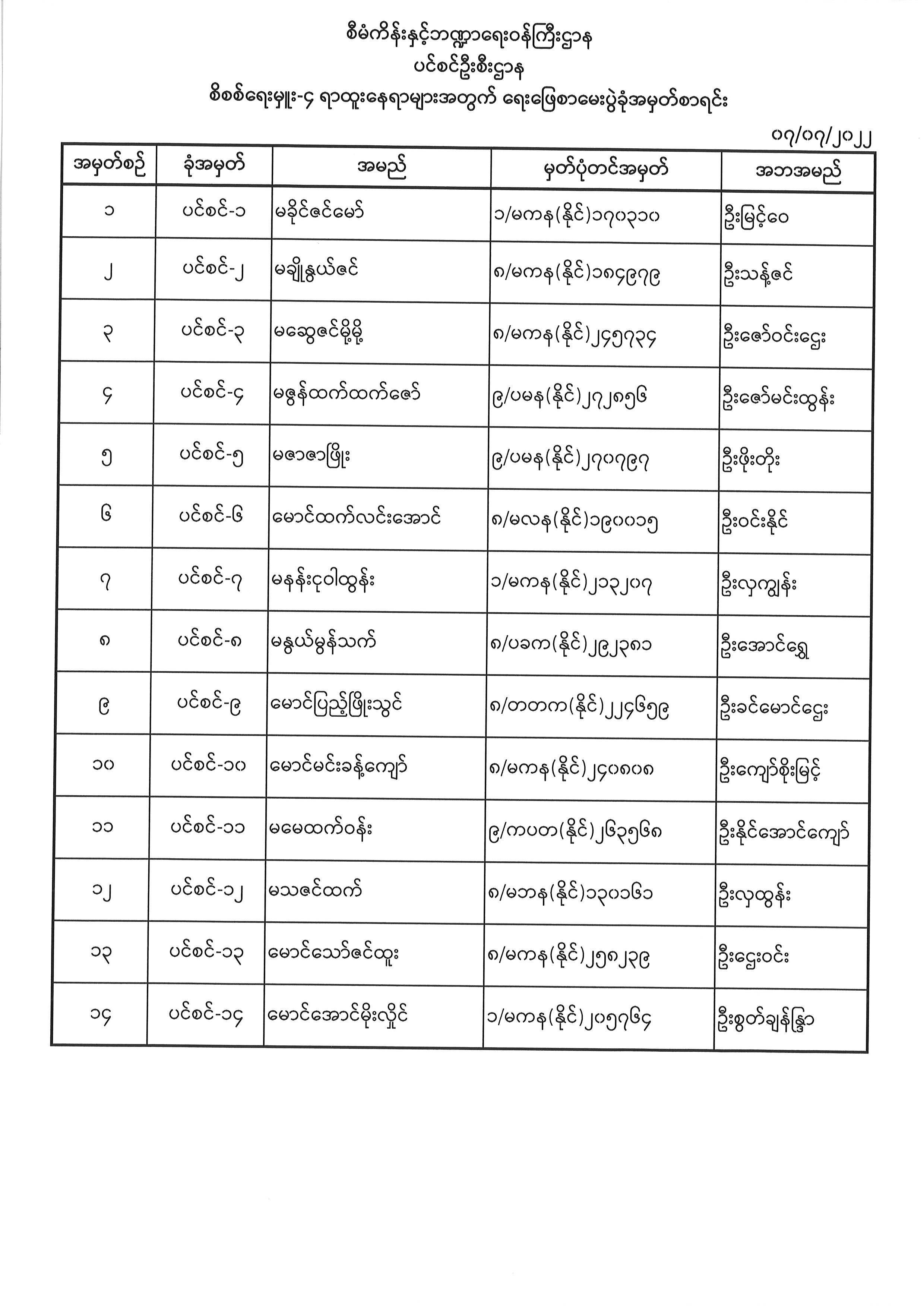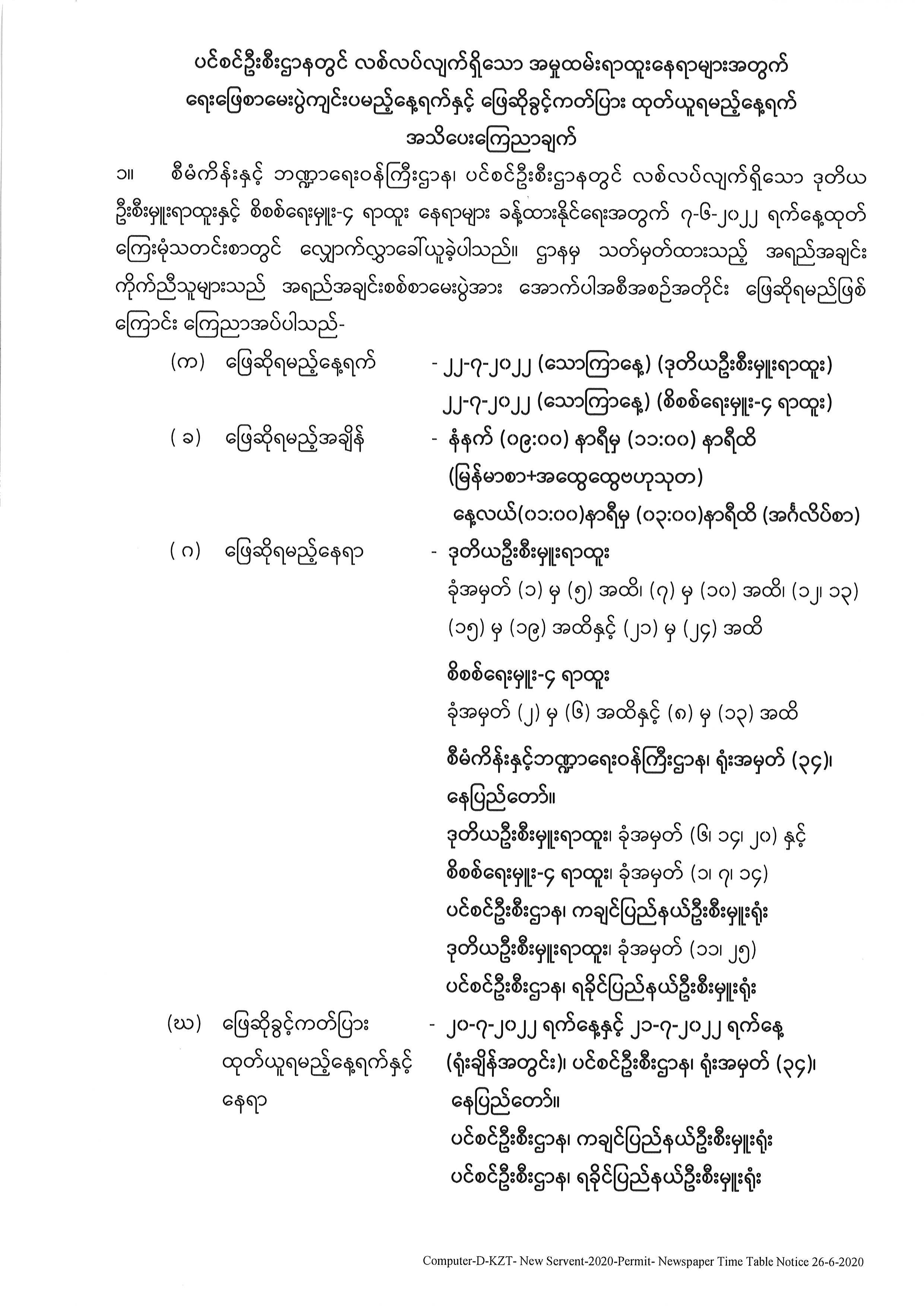 ပင်စင်ဦးစီးဌာနတွင် လစ်လပ်လျက်ရှိသော အမှုထမ်းရာထူးနေရာများအတွက် ရေးဖြေစာမေးပွဲကျင်းပမည့်နေ့ရက်နှင့် ဖြေဆိုခွင့်ကတ်ပြား ထုတ်ယူရမည့်နေ့ရက် အသိပေးကြေညာချက် pension_editor Thu, 07/07/2022 - 12:07
