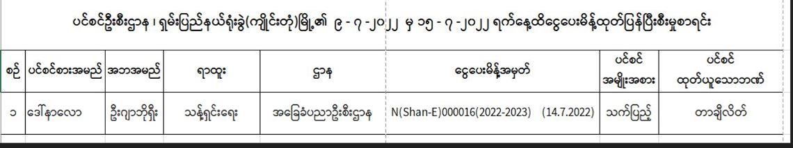 ပင်စင်ဦးစီးဌာန၊ ရှမ်းပြည်နယ်ရုံးခွဲ(ကျိုင်းတုံမြို့)၏ ငွေပေးမိန့်ထုတ်ပြန်မှုစာရင်း (၉-၇-၂၀၂၂ မှ ၁၅-၇-၂၀၂၂) pension_editor Thu, 07/14/2022 - 14:05
