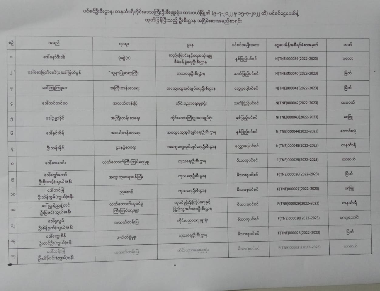 ပင်စင်ဦးစီးဌာန၊ တနင်္သာရီတိုင်း၏ ငွေပေးမိန့်ထုတ်ပြန်မှုစာရင်း (၉-၇-၂၀၂၂ မှ ၁၅-၇-၂၀၂၂) pension_editor Thu, 07/14/2022 - 14:20