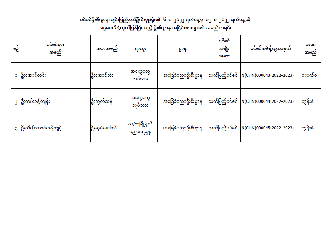 ပင်စင်ဦးစီးဌာန၊ချင်းပြည်နယ်၏ငွေပေးမိန့်ထုတ်ပြန်မှုစာရင်း(၆.၈.၂၀၂၂ မှ ၁၂.၈.၂၀၂၂) pension_editor Fri, 08/12/2022 - 15:25