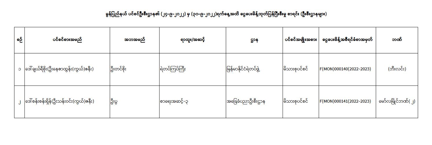 ပင်စင်ဦးစီးဌာန၊ မွန်ပြည်နယ်ဦးစီးမှူးရုံး၏ ငွေပေးမိန့်ထုတ်ပြန်မှုစာရင်း (၂၄-၉-၂၀၂၂ မှ ၃၀-၉-၂၀၂၂) pension_editor Tue, 10/04/2022 - 12:53