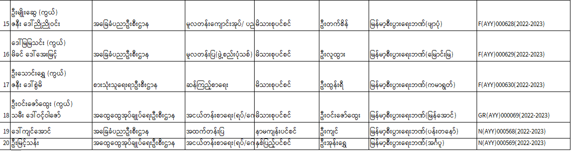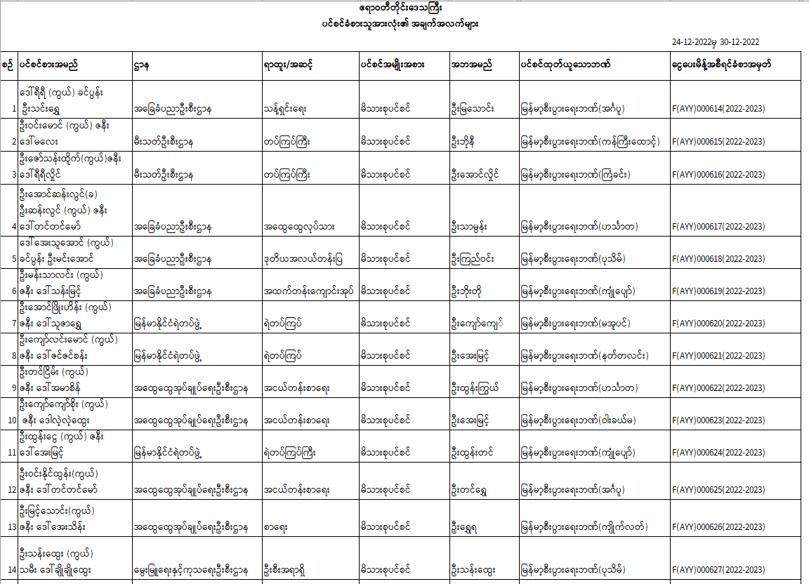 ပင်စင်ဦးစီးဌာန၊ ဧရာဝတီတိုင်းဒေသကြီး၏ (၂၄-၁၂-၂၀၂၂ ) မှ (၃၀-၁၂-၂၀၂၂ ) ရက်နေ့ထိငွေပေးမိန့်ထုတ်ပြန်ပြီးစီးမှုစာရင်း
