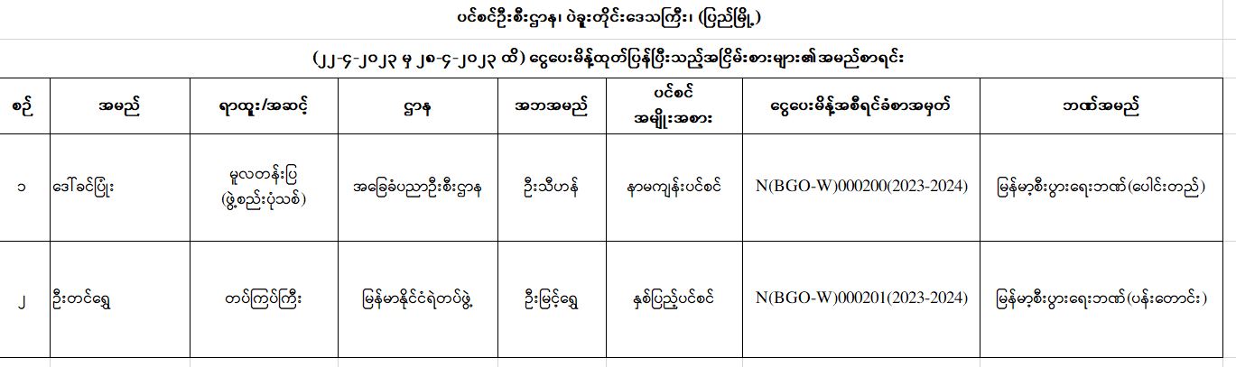 ပင်စင်ဦးစီးဌာန၊ ပဲခူးတိုင်းရုံးခွဲ(ပြည်မြို့)၏ ငွေပေးမိန့်ထုတ်ပြန်မှုစာရင်း (၂၂-၄-၂၀၂၃ မှ ၂၈-၄-၂၀၂၃) pension_editor Thu, 05/04/2023 - 16:19