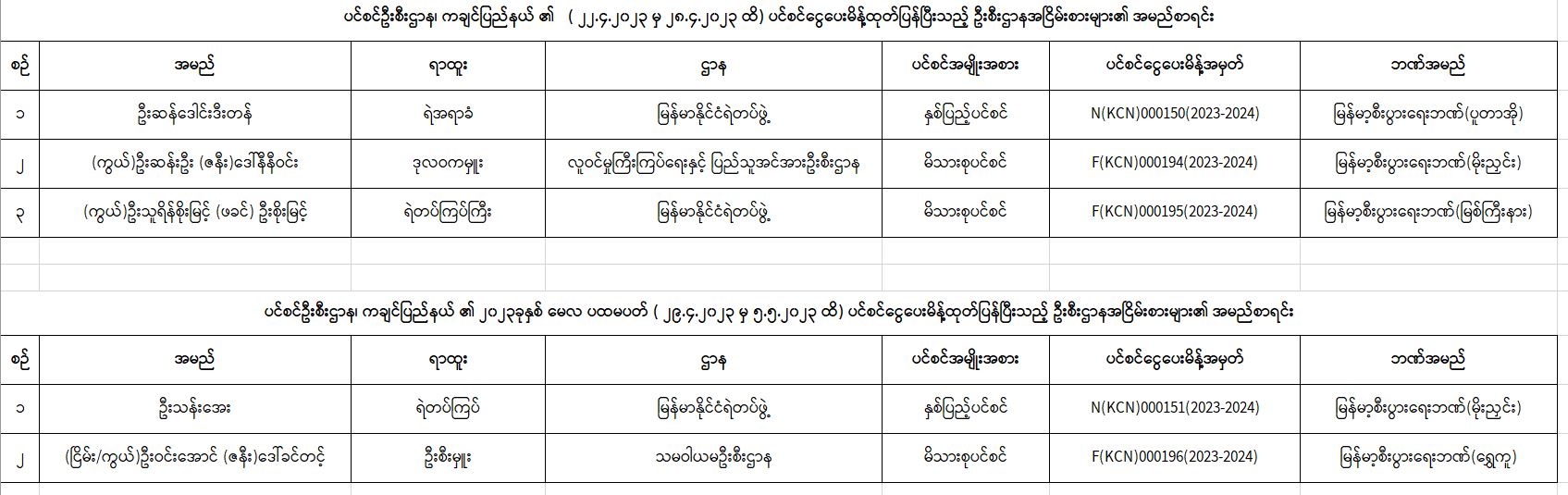 ပင်စင်ဦးစီးဌာန၊ ကချင်ပြည်နယ်ဦးစီးမှူးရုံး၏ ငွေပေးမိန့်ထုတ်ပြန်မှုစာရင်း ငွေပေးမိန့်ထုတ်ပြန်မှု စာရင်း ( ၂၂-၄-၂၀၂၃ မှ ၅-၅-၂၀၂၃ ထိ) pension_editor Mon, 05/08/2023 - 11:05
