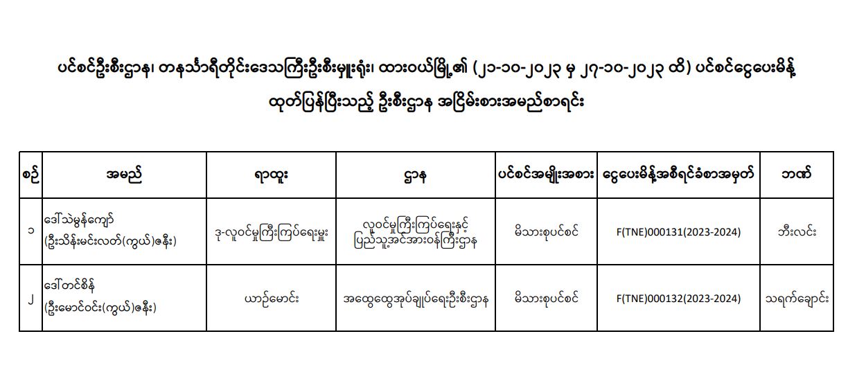 ပင်စင်ဦးစီးဌာန၊ တနင်္သာရီတိုင်းဒေသကြီးဦးစီးမှူးရုံး၏ ငွေပေးမိန့်ထုတ်ပြန်မှုစာရင်း (၂၁-၁၀-၂၀၂၃ မှ ၂၇-၁၀-၂၀၂၃) pension_editor Wed, 10/25/2023 - 14:08