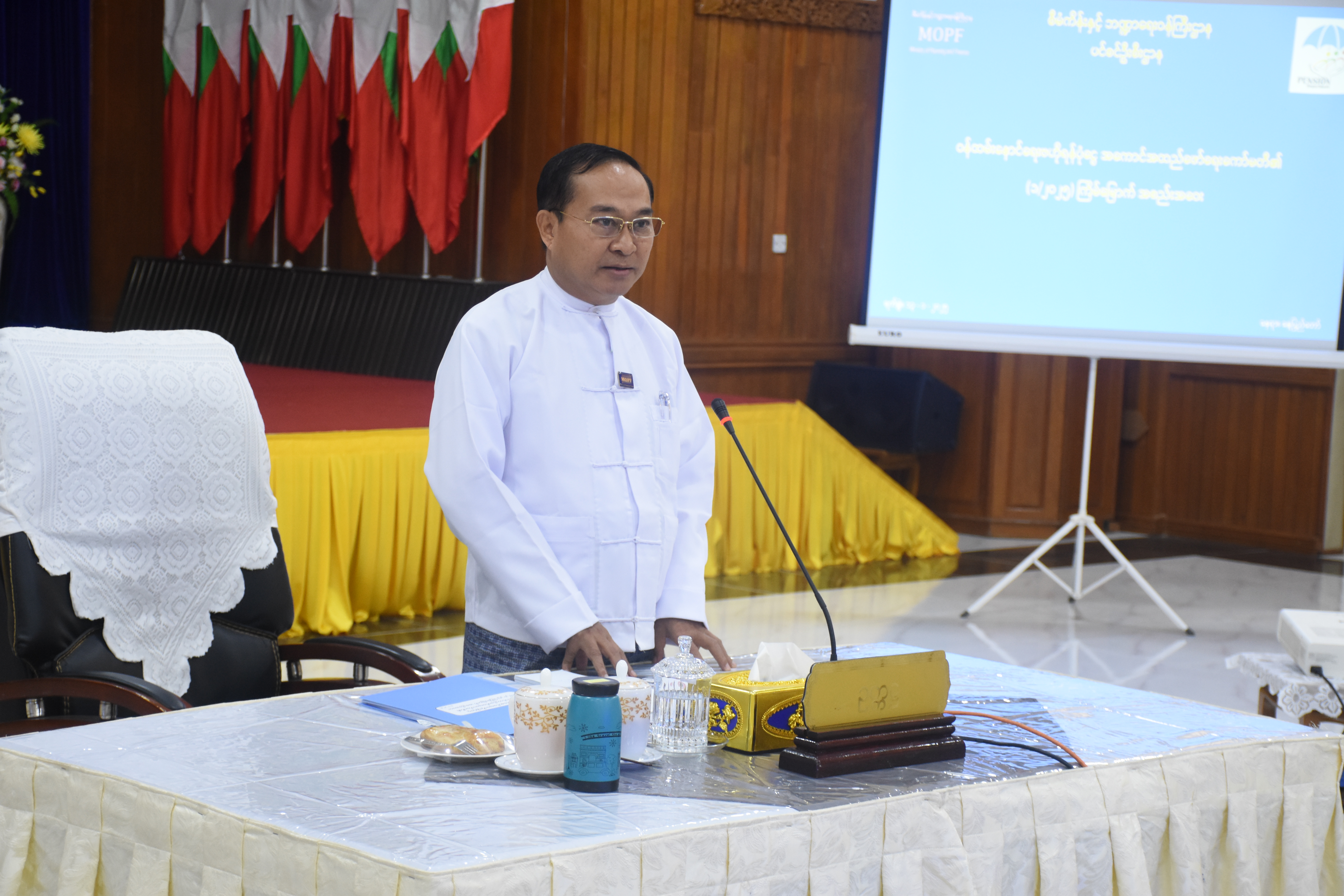 အစည်းအဝေးတွင် စီမံကိန်းနှင့် ဘဏ္ဍာရေးဝန်ကြီးဌာန၊ ဒုတိယဝန်ကြီး ဦးမင်းထွဋ်က အဖွင့်အမှာ စကားပြောကြားရာ၌ ဝန်ထမ်းနောင်ရေး ဗဟိုရန်ပုံငွေစနစ်သည် ဝန်ထမ်းများအတွက် ရေရှည်ဆောင်ရွက်သွားရမည့်ကိစ္စဖြစ်ကြောင်း၊ ဝန်ထမ်းများ၏ အကျိုးခံစားခွင့်များ ပိုမိုလုံလောက်ပြည့်စုံစေရေးအတွက် ရင်းနှီးမြှုပ်နှံမှုနှင့်ပတ်သက်၍ ကြိုတင်စဉ်းစားထားရှိရန်၊ ရေရှည်တည်တံ့ခိုင်မြဲသော ပင်စင်စနစ်ဖြစ်ပေါ်လာစေရန် ရည်ရွယ်ပြီး ဝန်ထမ်းနောင်ရေး ဗဟိုရန်ပုံငွေစနစ် အကောင်အထည်ဖော်ရေးကို ကော်မတီအနေဖြင့် ဆက်လက်ကြိုးပမ်းဆောင်ရွက်သွားရမည် ဖြစ်ကြောင်း၊ ထို့ကြောင့် မိမိတို့အနေဖြင့် ယခုအချိန်ထိ ဆောင်ရွက်ထားရှိမှုများအပေါ် အခြေခံ၍ ဆက်လက်ဆောင်ရွက်ရန်ကိစ္စများ၊ ကြိုတင်ပြင်ဆင် ဆောင်ရွက်ထားသင့်သည့်ကိစ္စများ၊ ရန်ပုံငွေစနစ် ကျင့်သုံးမည့်ပုံစံနှင့် လိုက်လျောညီထွေဖြစ်မည့် ဥပဒေကြမ်းဖြစ်ရေးအတွက် လိုအပ်သည်များ ပြင်ဆင်၊ ဖြည့်စွက်ပြီး ပြန်လည်တင်ပြနိုင်ရေး ဆက်လက်ဆောင်ရွက်သွားကြရန် ဖြစ်ကြောင်း ဆောင်ရွက်သင့်သည့် ကိစ္စရပ်များကို ဆက်လက်ညှိနှိုင်းဆွေးနွေးကြရန် ဖြစ်ကြောင်းစသည်ဖြင့် ပြောကြားခဲ့ပါသည်။