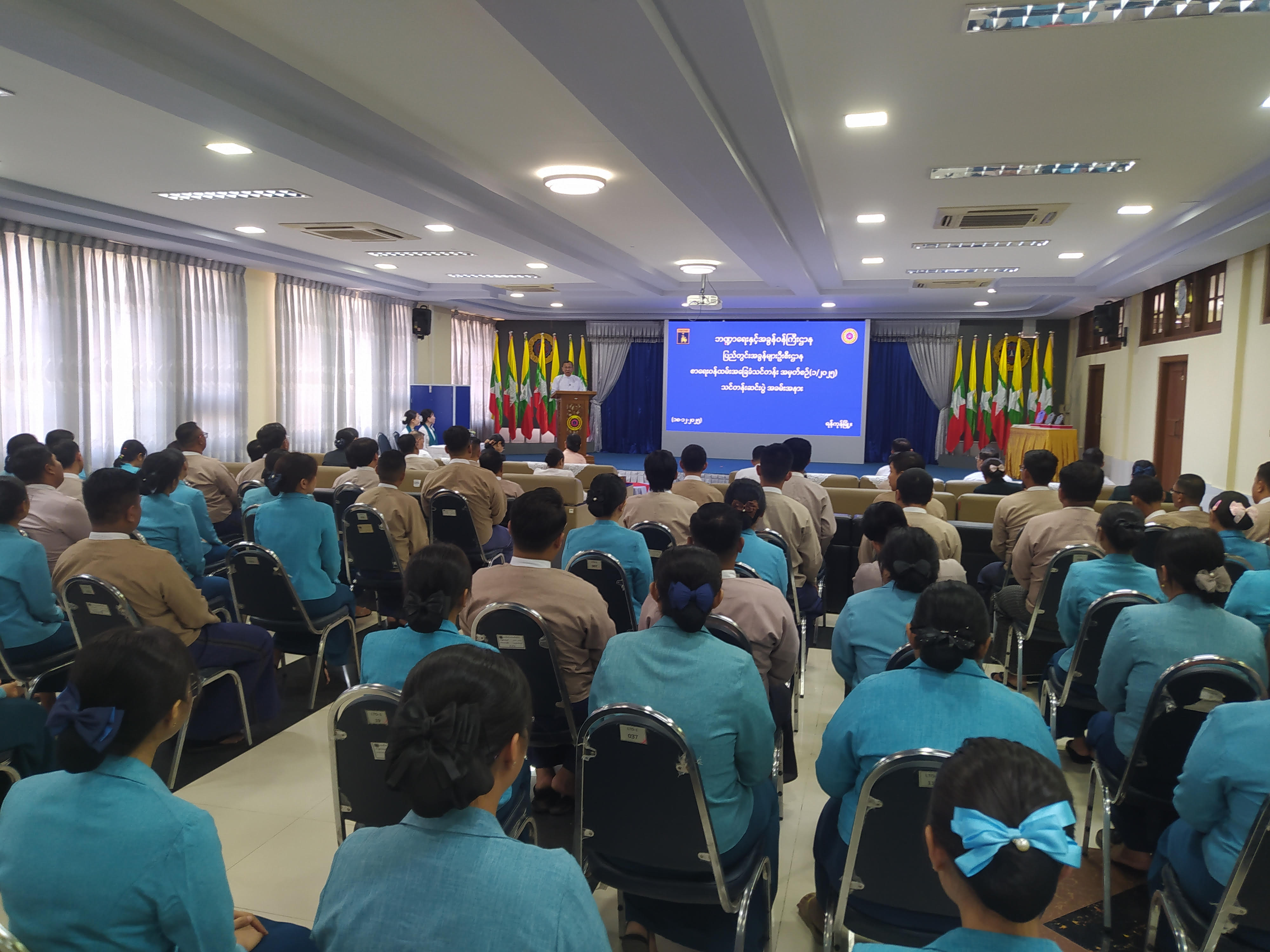 ဘဏ္ဍာရေးနှင့်အခွန်ဝန်ကြီးဌာန ပြည်တွင်းအခွန်များဦးစီးဌာန၊ စာရေးဝန်ထမ်းအခြေခံ သင်တန်းအမှတ်စဉ် (၁/၂၀၂၅) သင်တန်းဆင်းပွဲအခမ်းအနားကို ယနေ့မွန်းလွဲ (၂) နာရီတွင် ရန်ကုန်မြို့ရှိ အခွန်ထမ်းကြီးများဆိုင်ရာအခွန်ရုံး (၁)၊ သင်တန်းခန်းမ၌ ကျင်းပသည်။