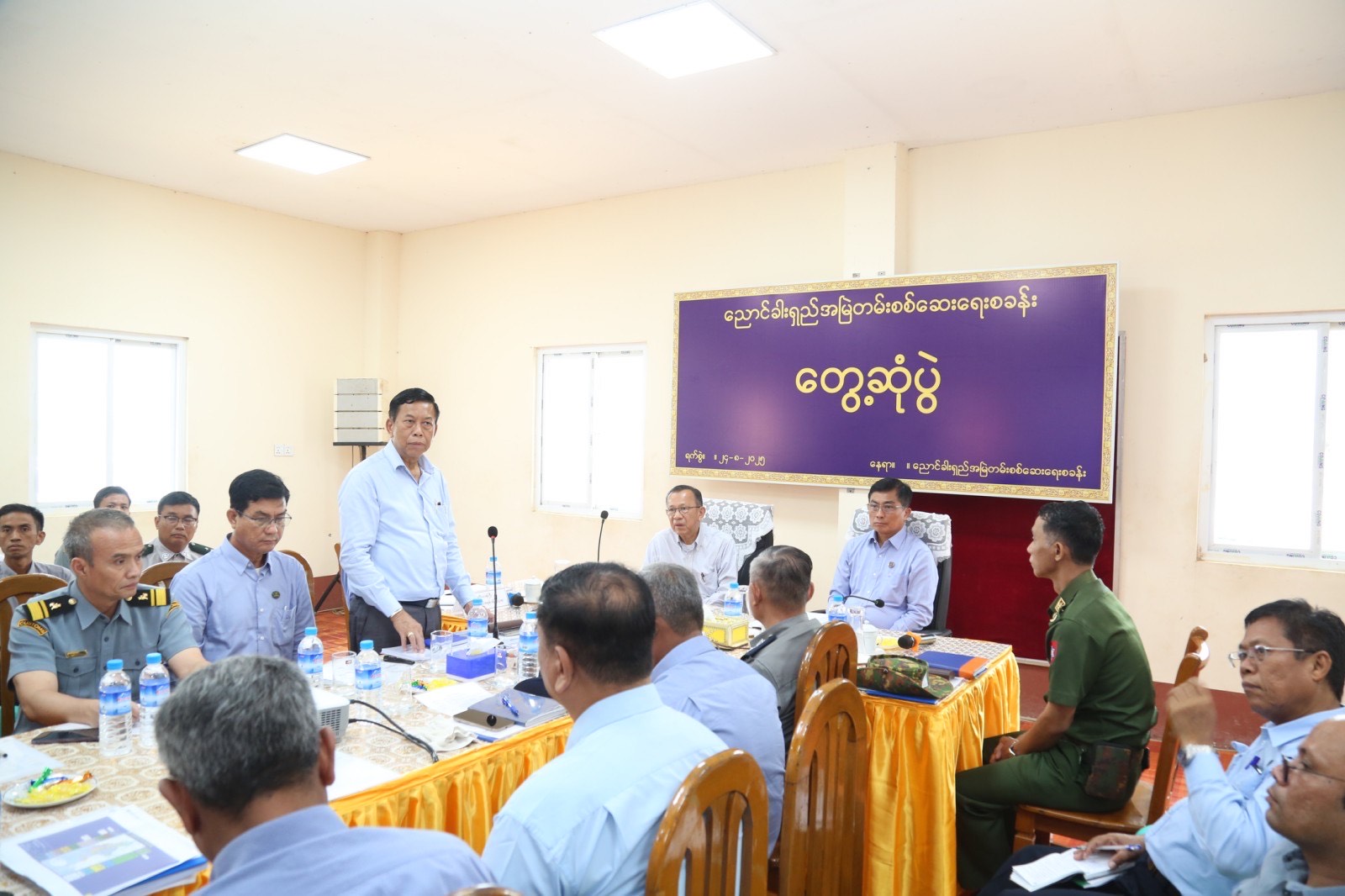 ထို့နောက် အစည်းအဝေးခန်းမ၌ အကောက်ခွန်ဦးစီးဌာန၊ ကုန်သွယ်ရေးဦးစီးဌာန၊ လူဝင်မှုကြီးကြပ်ရေးဦးစီးဌာန၊ မြန်မာနိုင်ငံရဲတပ်ဖွဲ့နှင့် ဌာနဆိုင်ရာတာဝန်ရှိသူများနှင့် တွေ့ဆုံရာ အကောက်ခွန်ဦးစီးဌာန၊ ညွှန်ကြားရေးမှူးချုပ်က ညောင်ခါးရှည် အမြဲတမ်းစစ်ဆေးရေးစခန်းတွင် အကောက်ခွန်ကုန်ပစ္စည်းစစ်ဆေးခြင်းဆိုင်ရာ လုပ်ငန်းဆောင်ရွက်မှုအခြေအနေများကို ရှင်းလင်းတင်ပြပြီး တက်ရောက်လာကြသည့် ဌာနဆိုင်ရာတာဝန်ရှိသူများက လုပ်ငန်းဆောင်ရွက်မှုအခြေအနေများနှင့် လိုအပ်ချက်များကို ရှင်းလင်းတင်ပြသည်။