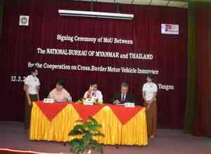 စီမံကိန်းနှင့်ဘဏ္ဍာရေးဝန်ကြီးဌာန၊ မြန်မာ့အာမခံလုပ်ငန်းနှင့် ထိုင်းနိုင်ငံပိုင် Road Accident VICTIMS Protection Co.,Ltd. (RVP), Thai General Insurance Association (TGIA) တို့အကြား နားလည်မှုစာချွန်လွှာ (MoU) ရေးထိုးပွဲအခမ်းအနားကို မြန်မာ့အာမခံ လုပ်ငန်း ရုံးချုပ်(ရန်ကုန်)၌ ယနေ့ (၁၂.၃.၂၀၁၉) ရက်နေ့ နံနက်(၁၁:၀၀)နာရီတွင် ကျင်းပပြုလုပ်ရာ အာမခံလုပ်ငန်းကြီးကြပ်ရေးအဖွဲ့အတွင်းရေးမှူး ဦးဇော်နိုင်၊ မြန်မာ့အာမခံ လုပ်ငန်း ဦးဆောင်ညွှန်ကြားရေးမှူး ဒေါက်တာစန္ဒာဦး၊ ထိုင်းနိုင်ငံ Road Accident VICTIMS Protection Co.,Ltd. (RVP) ၏ ဦးဆောင်ညွှန်ကြားရေးမှူး Mr.