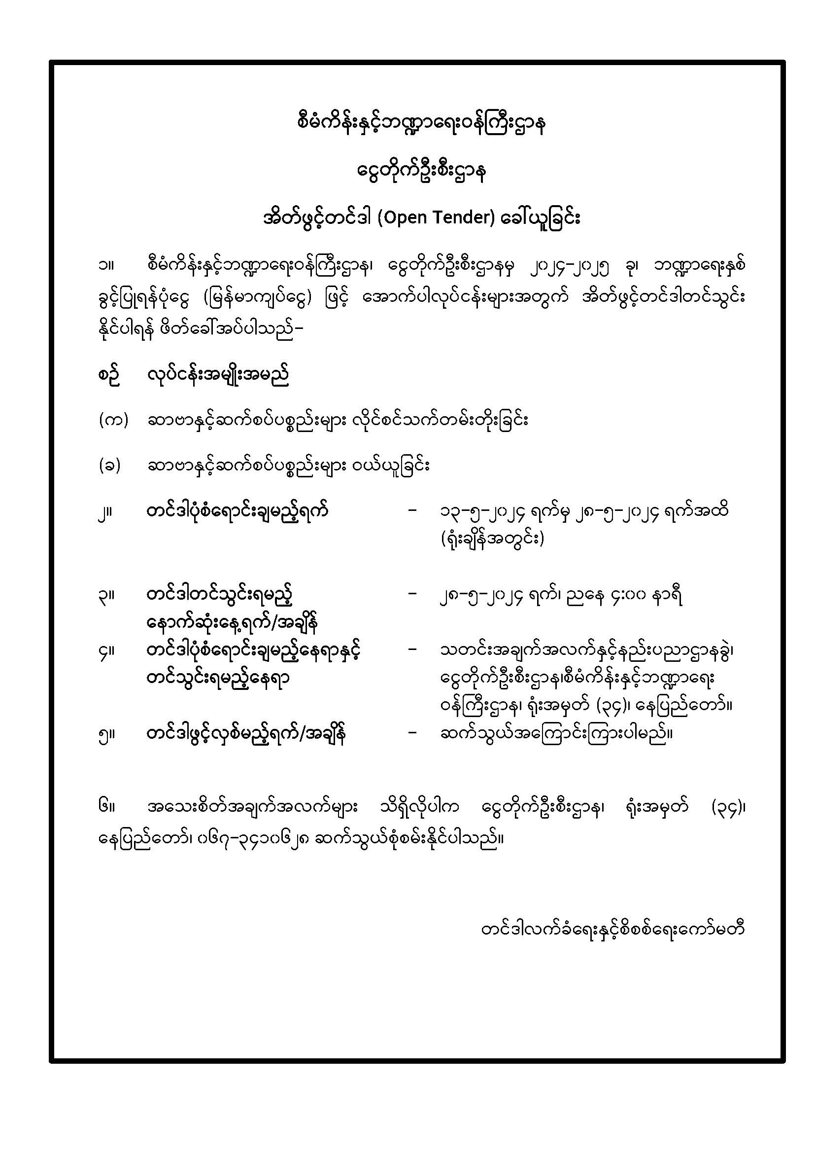 စီမံကိန်းနှင့်ဘဏ္ဍာရေးဝန်ကြီးဌာန၊ ငွေတိုက်ဦးစီးဌာန အိတ်ဖွင့်တင်ဒါ (Open Tender) ခေါ်ယူခြင်း td_editor Wed, 05/08/2024 - 10:17