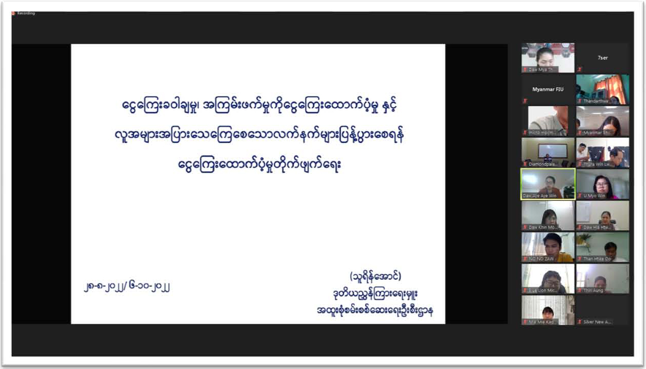ငွေကြေးထောက်ပံ့မှုတိုက်ဖျက်ရေးဆိုင်ရာ အသိပညာမြှင့်တင်ရေး သင်တန်းကို မြန်မာနိုင်ငံငွေကြေးဆိုင်ရာစုံစမ်းထောက်လှမ်းရေးအဖွဲ့ (MFIU) ၊