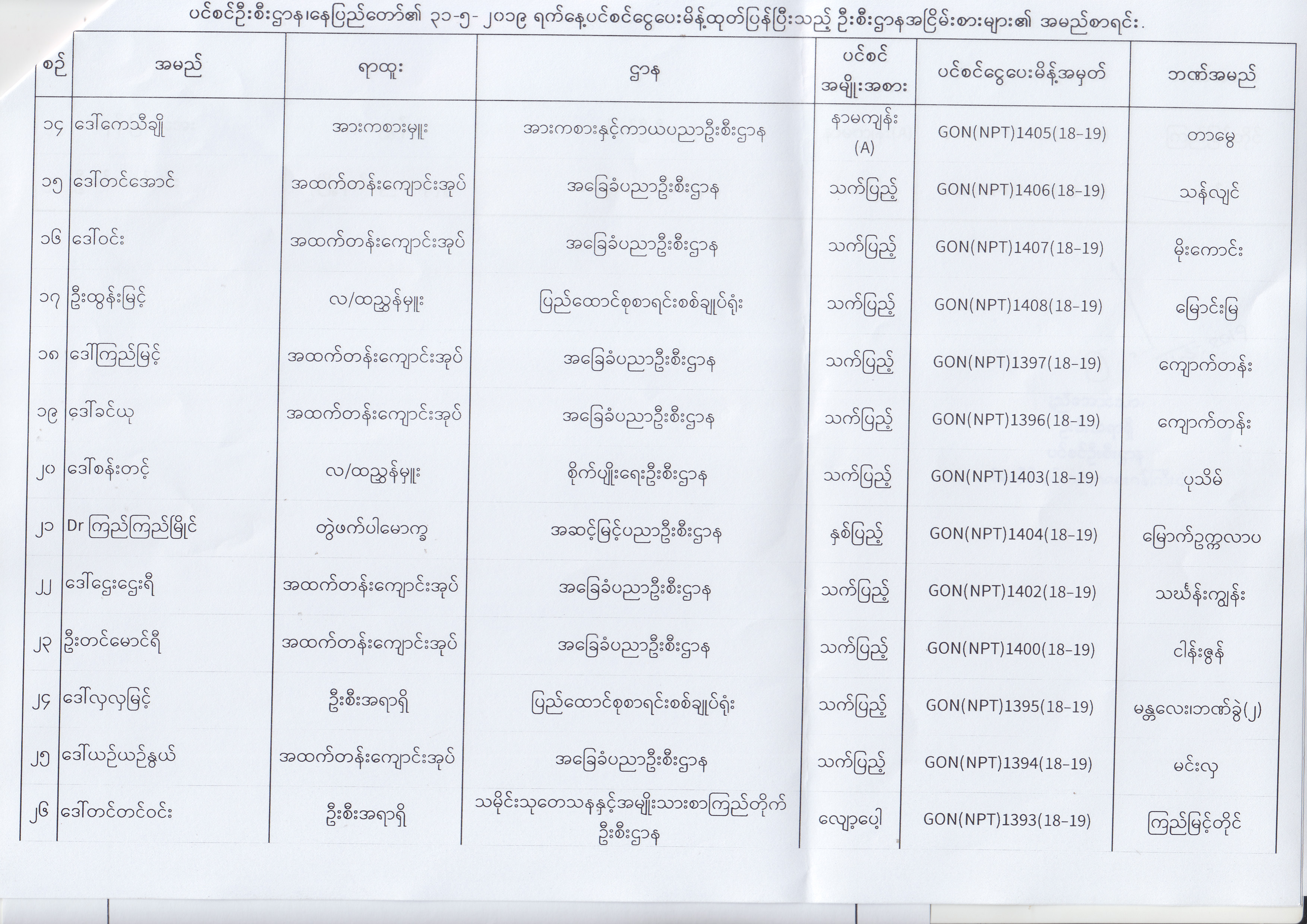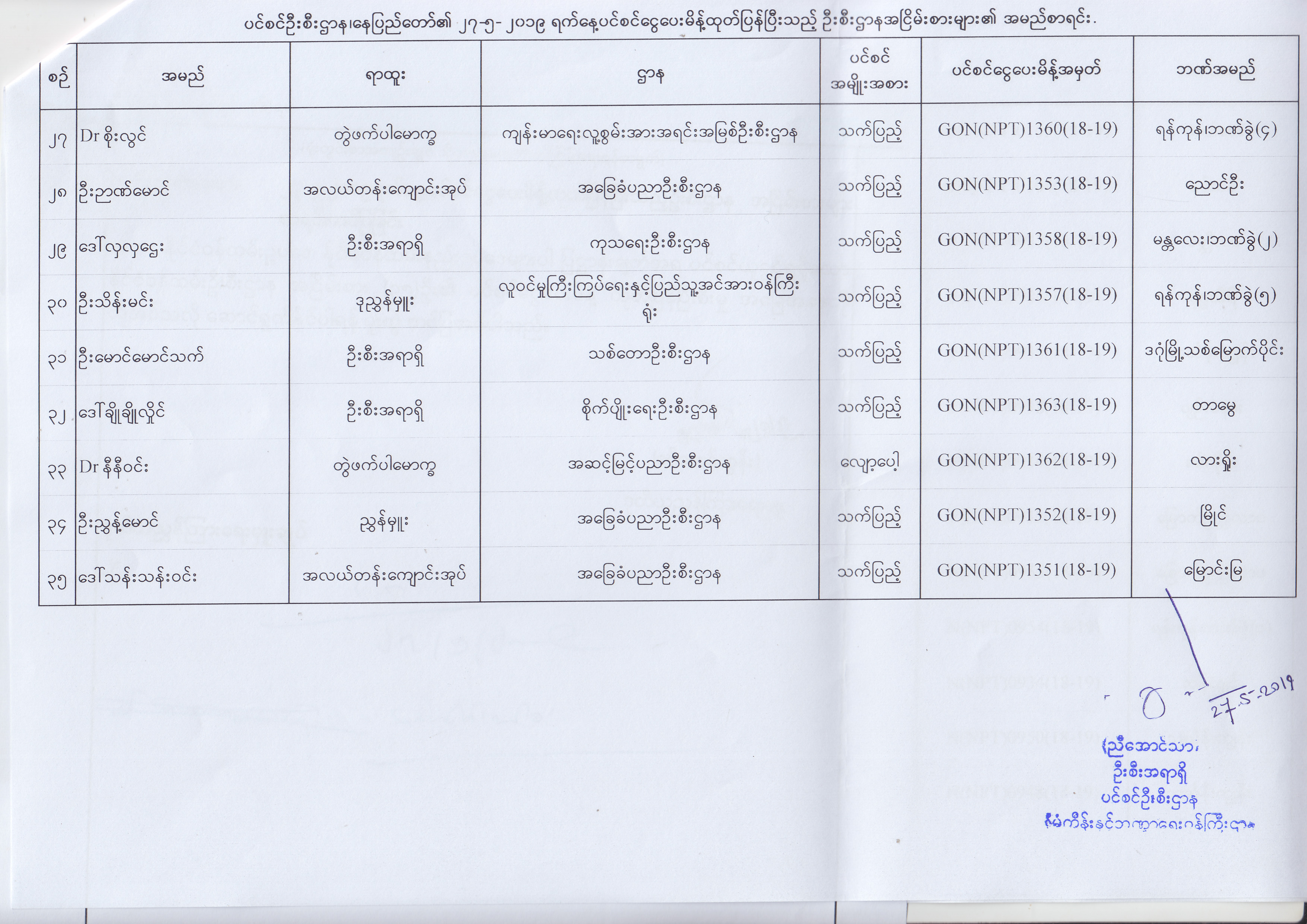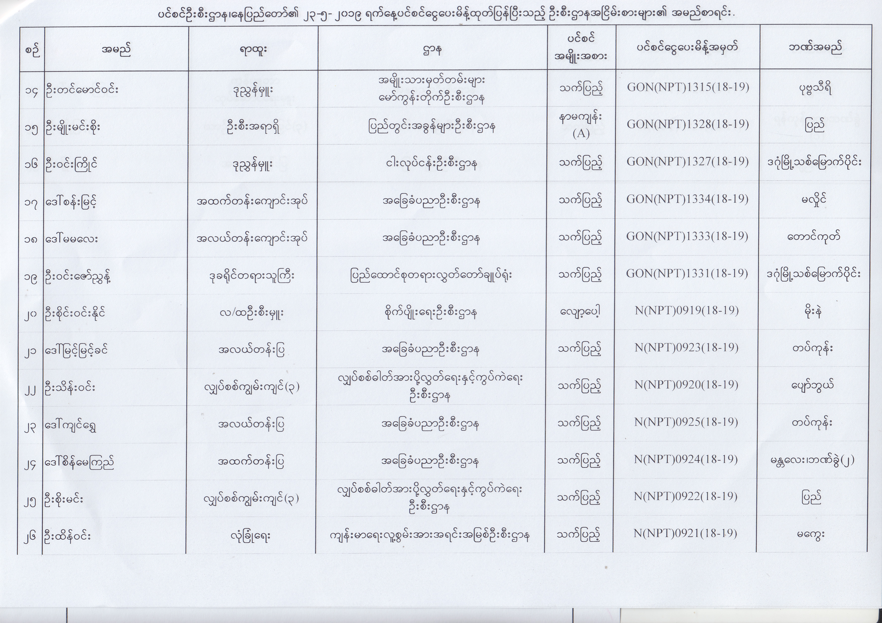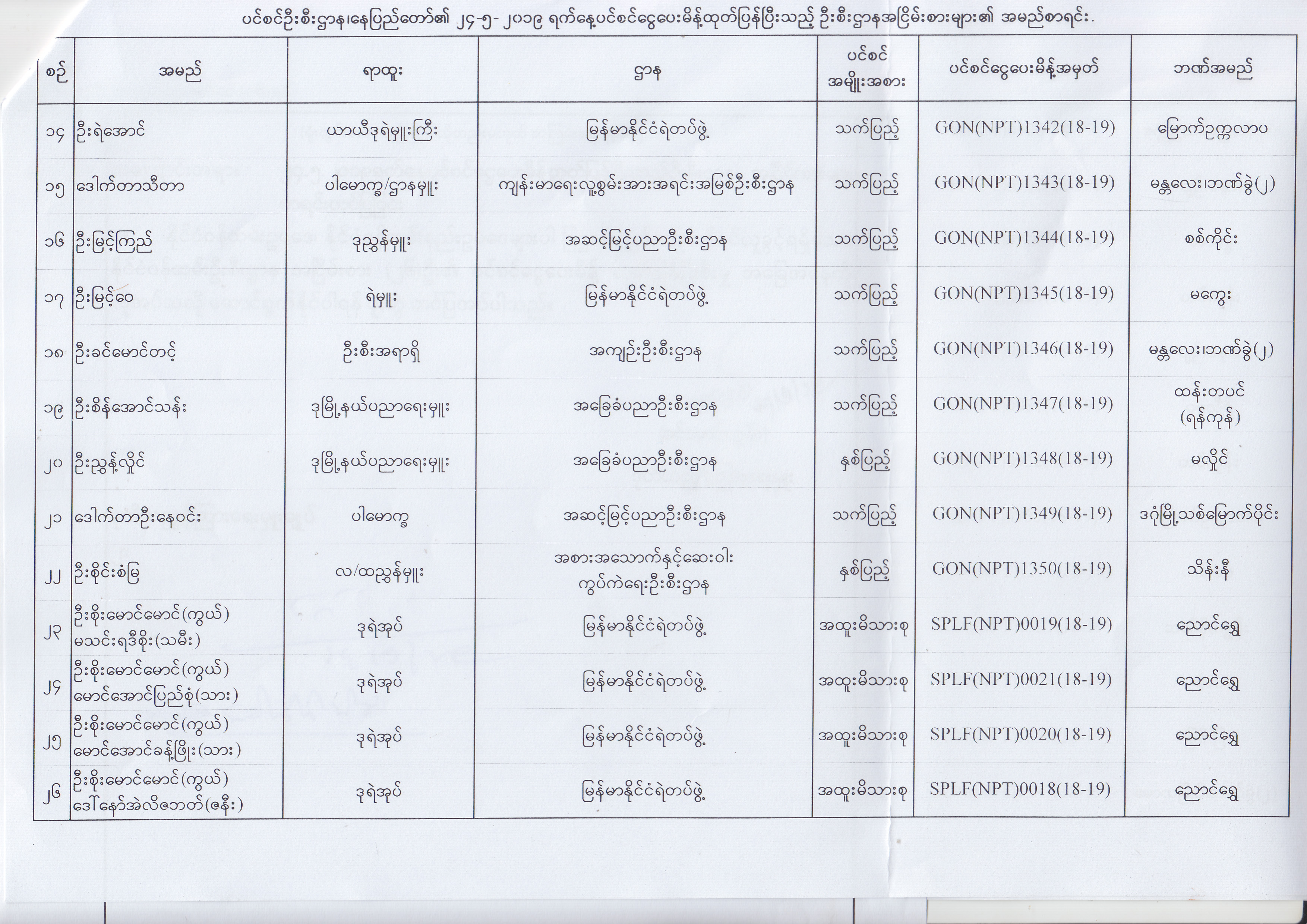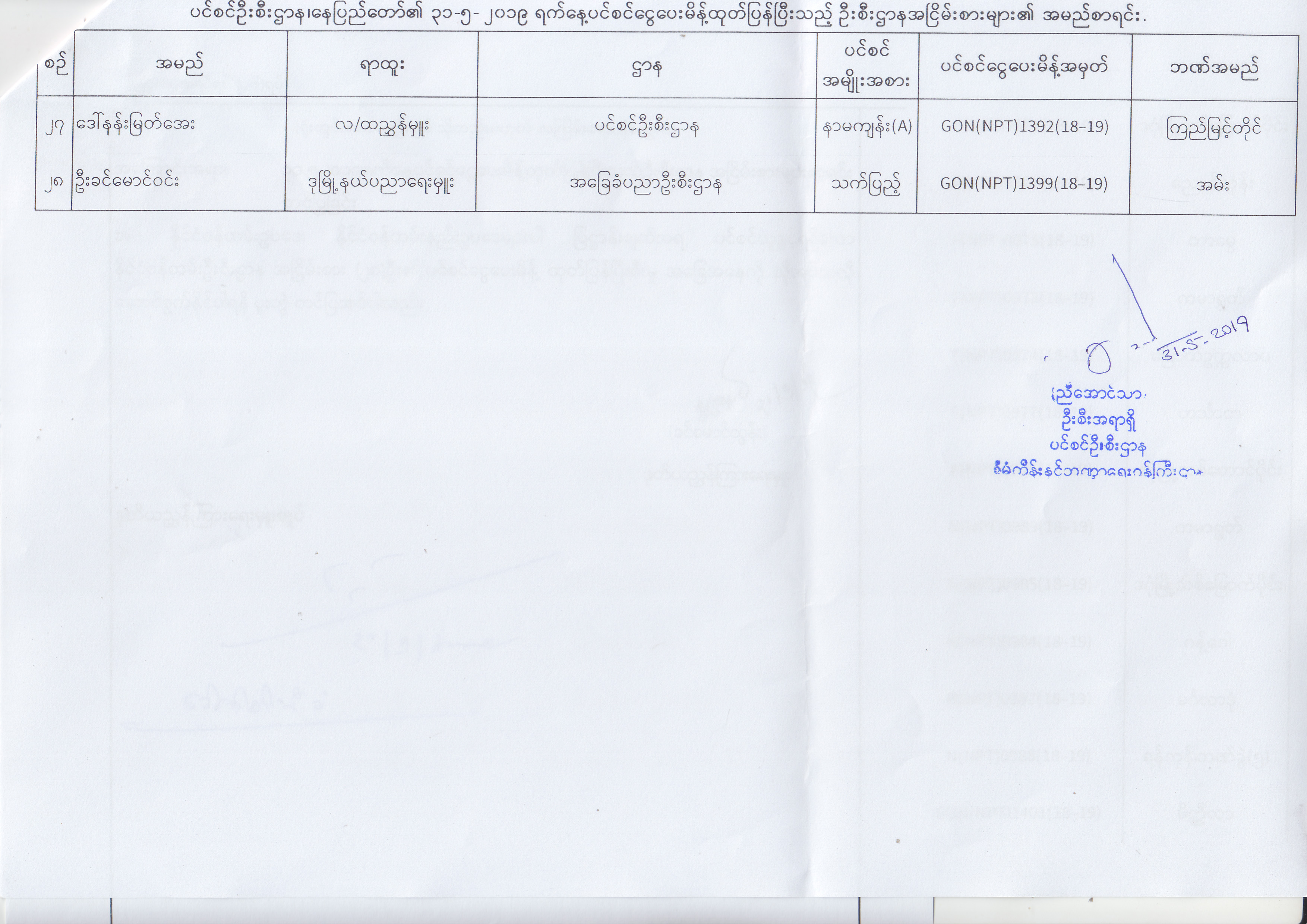 ပင်စင်ဦးစီးဌာ၊ နေပြည်တော်၏ ၂၁.၅.၂၀၁၉ မှ ၃၁.၅.၂၀၁၉ ရက်နေ့အထိ ပင်စင်ငွေပေးမိန့်ထုတ်ပြန်ပြီးသည့် ဦးစီးဌာနအငြိမ်းစားများ၏ အမည်စာရင်း pension_editor Tue, 06/04/2019 - 11:13