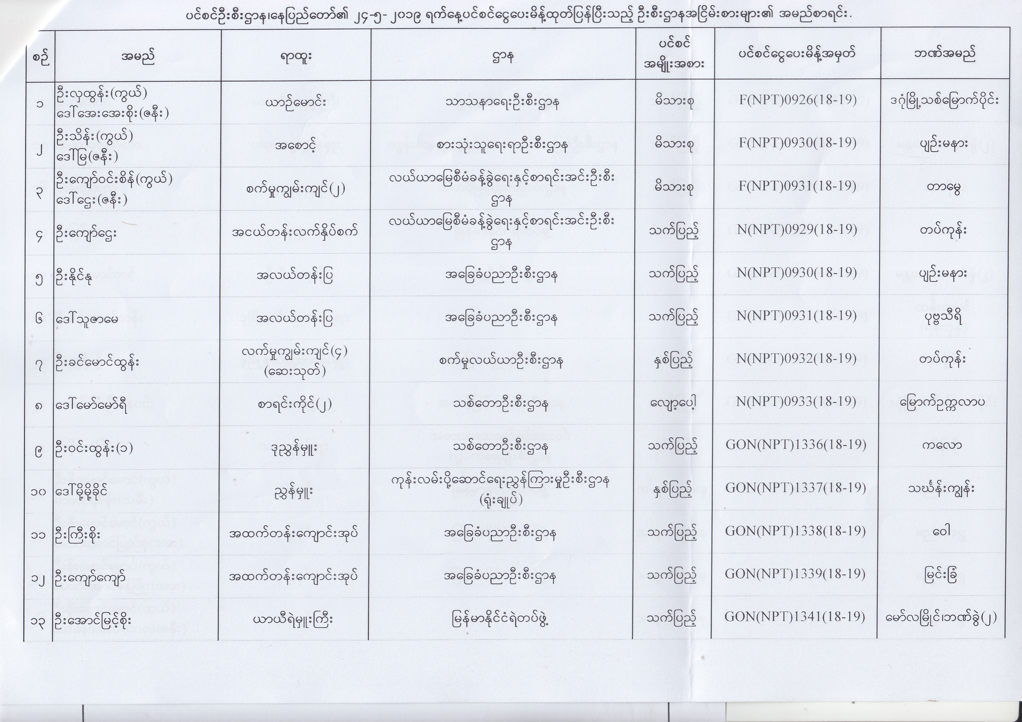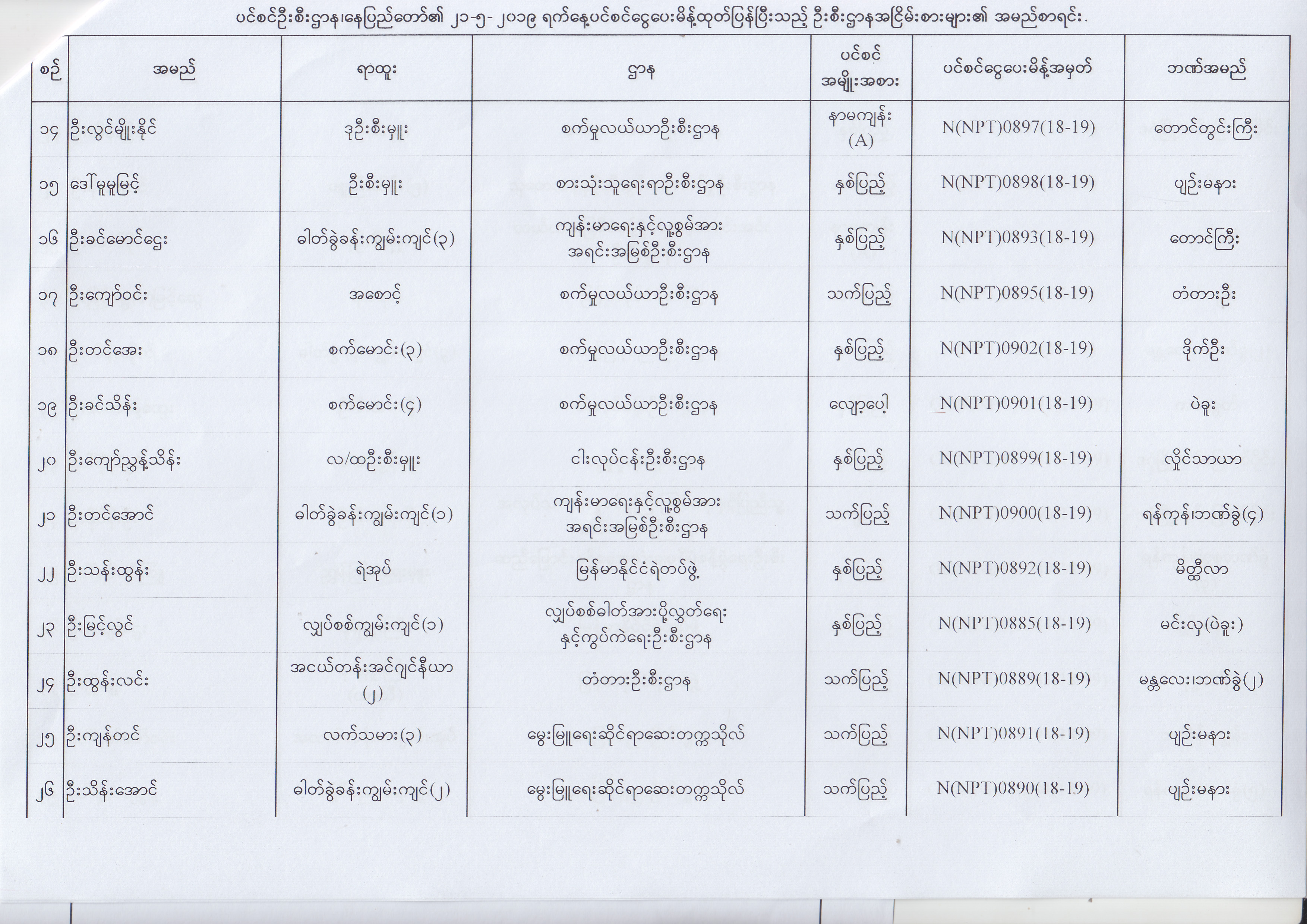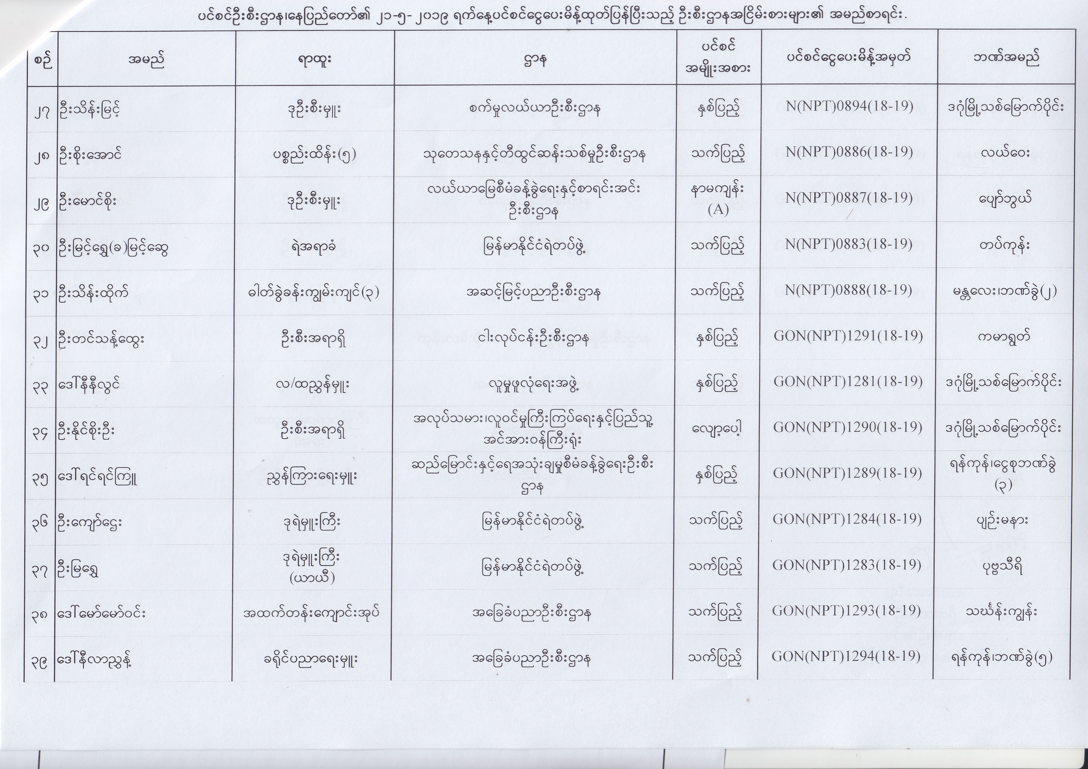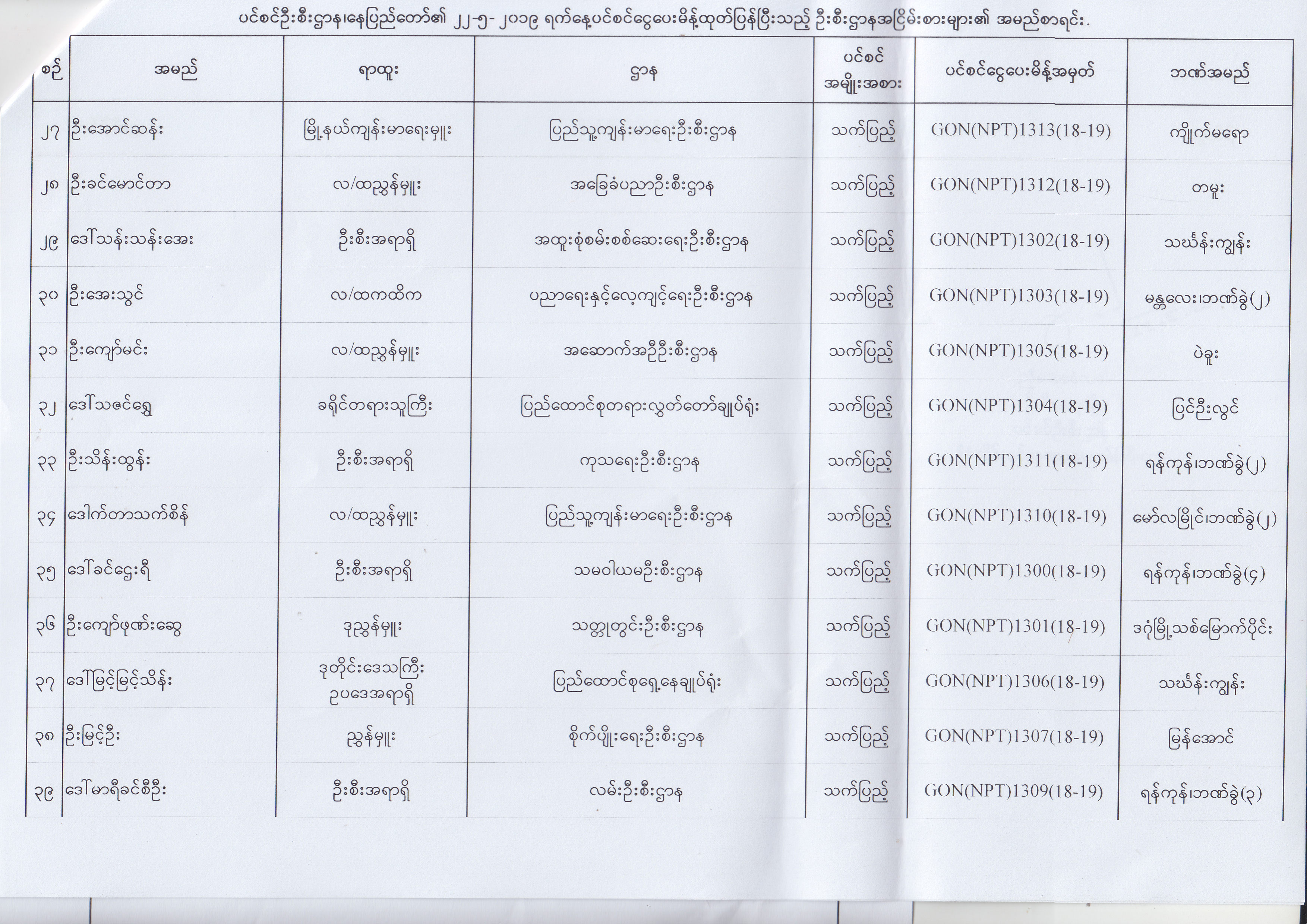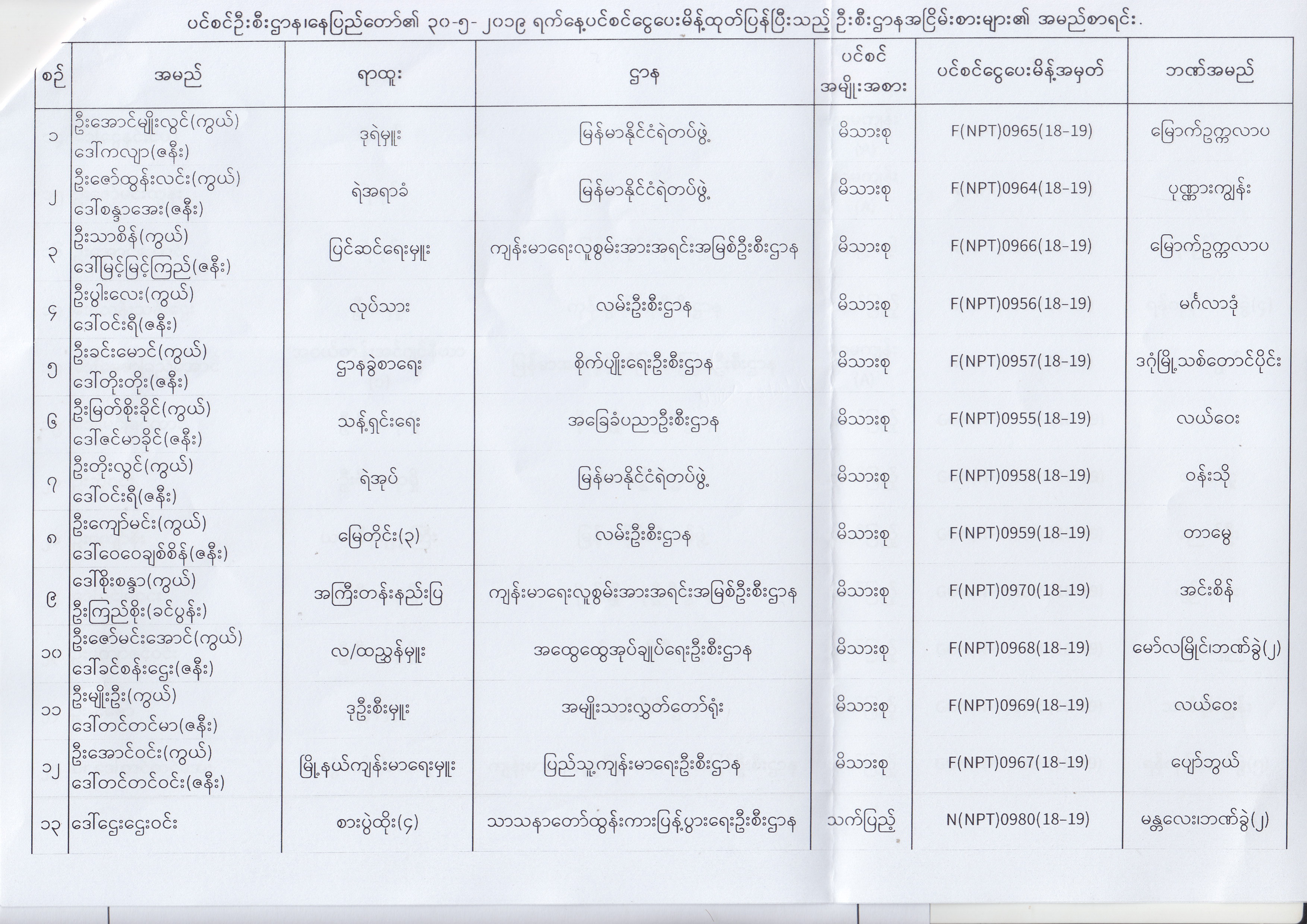 ပင်စင်ဦးစီးဌာ၊ နေပြည်တော်၏ ၂၁.၅.၂၀၁၉ မှ ၃၁.၅.၂၀၁၉ ရက်နေ့အထိ ပင်စင်ငွေပေးမိန့်ထုတ်ပြန်ပြီးသည့် ဦးစီးဌာနအငြိမ်းစားများ၏ အမည်စာရင်း pension_editor Tue, 06/04/2019 - 11:13