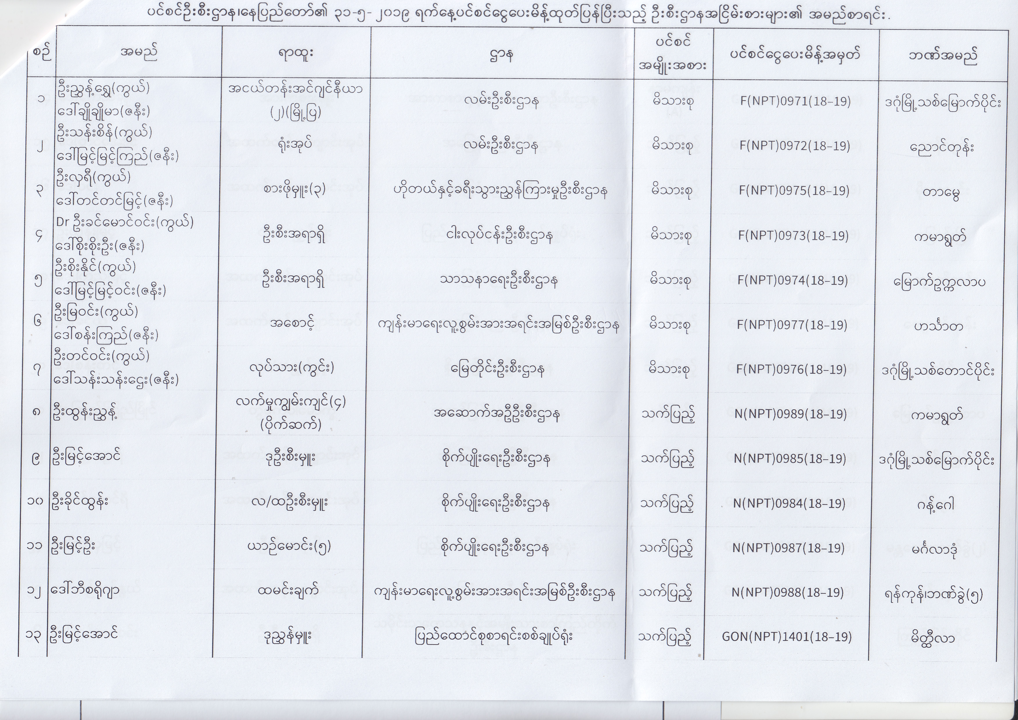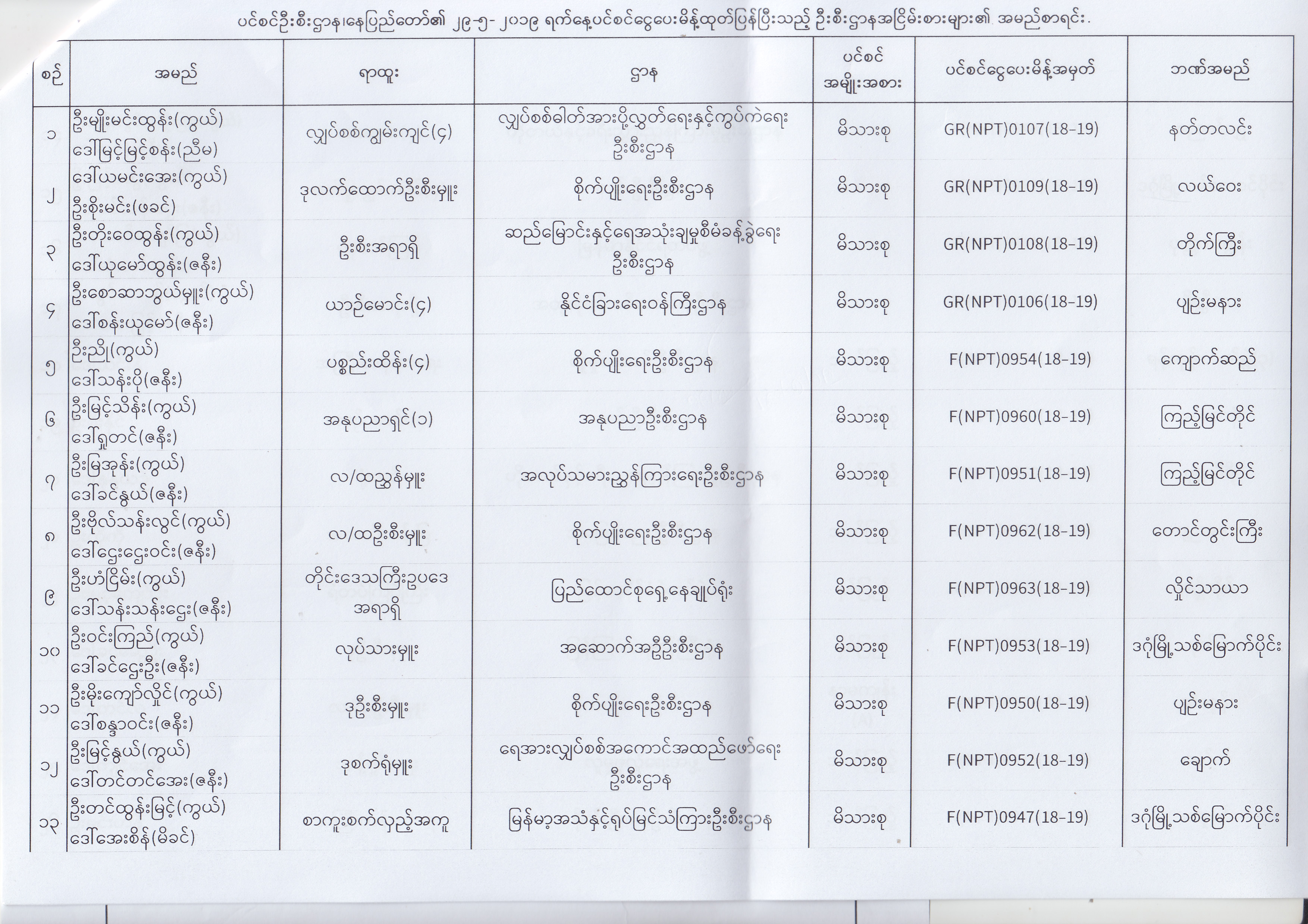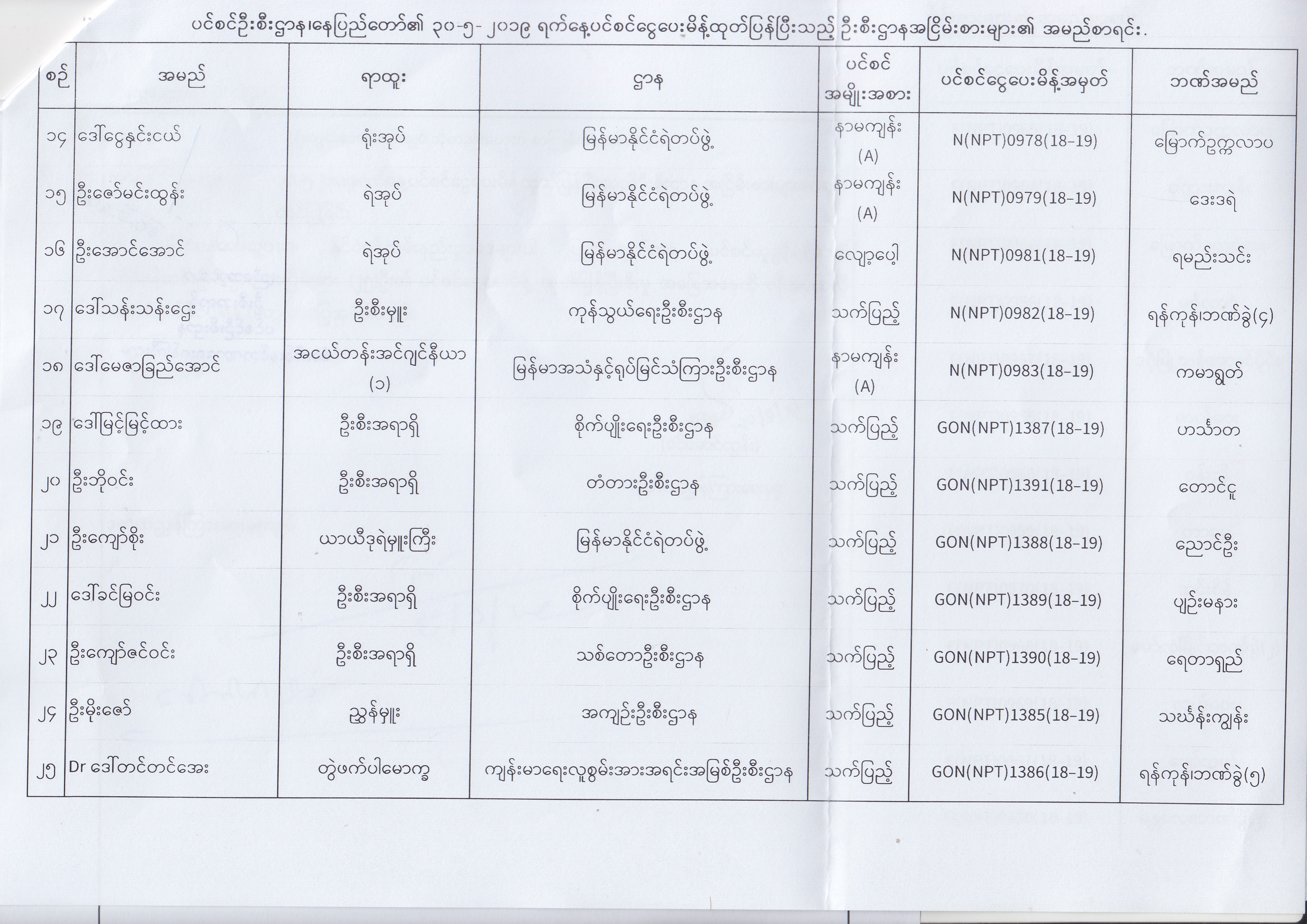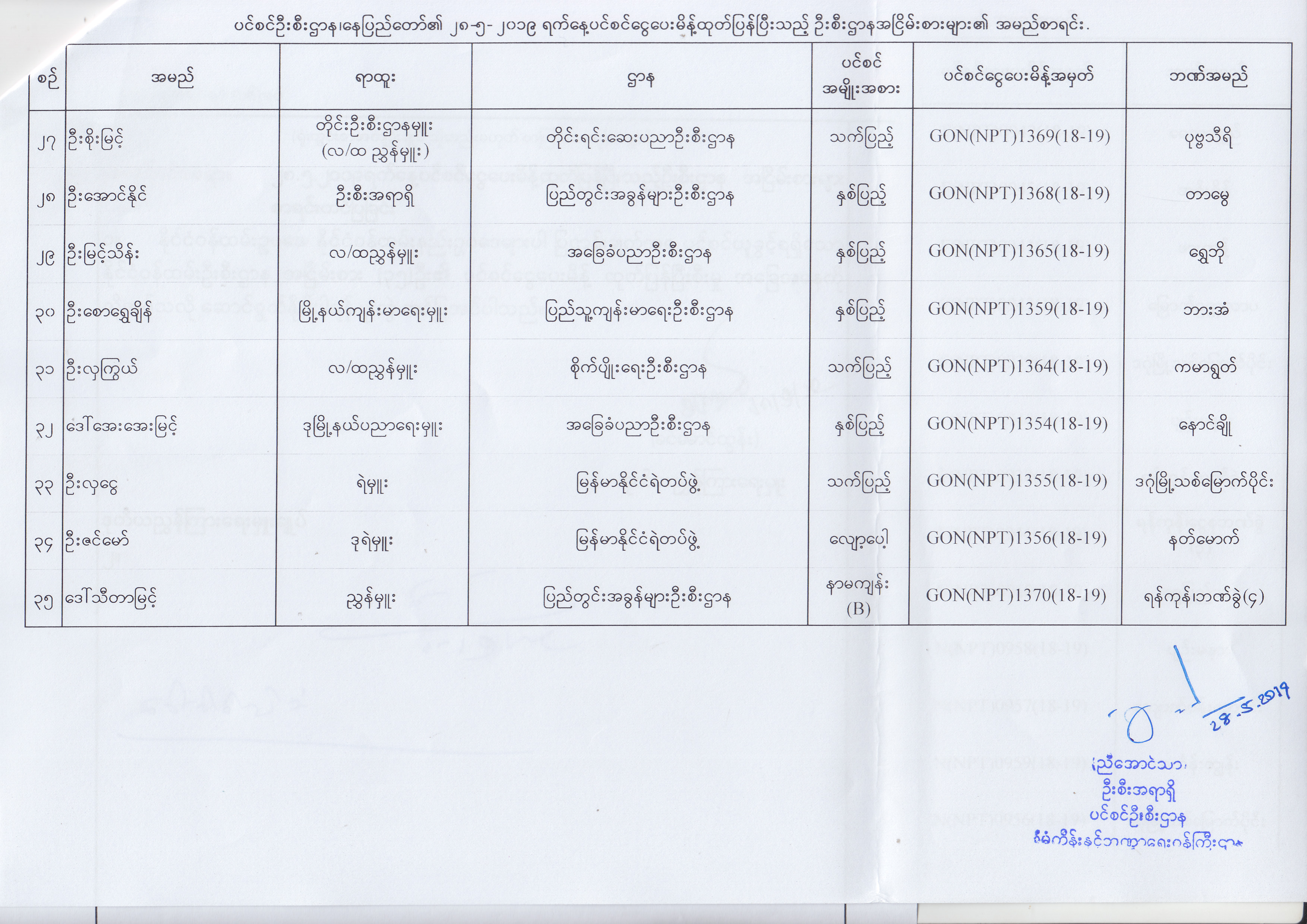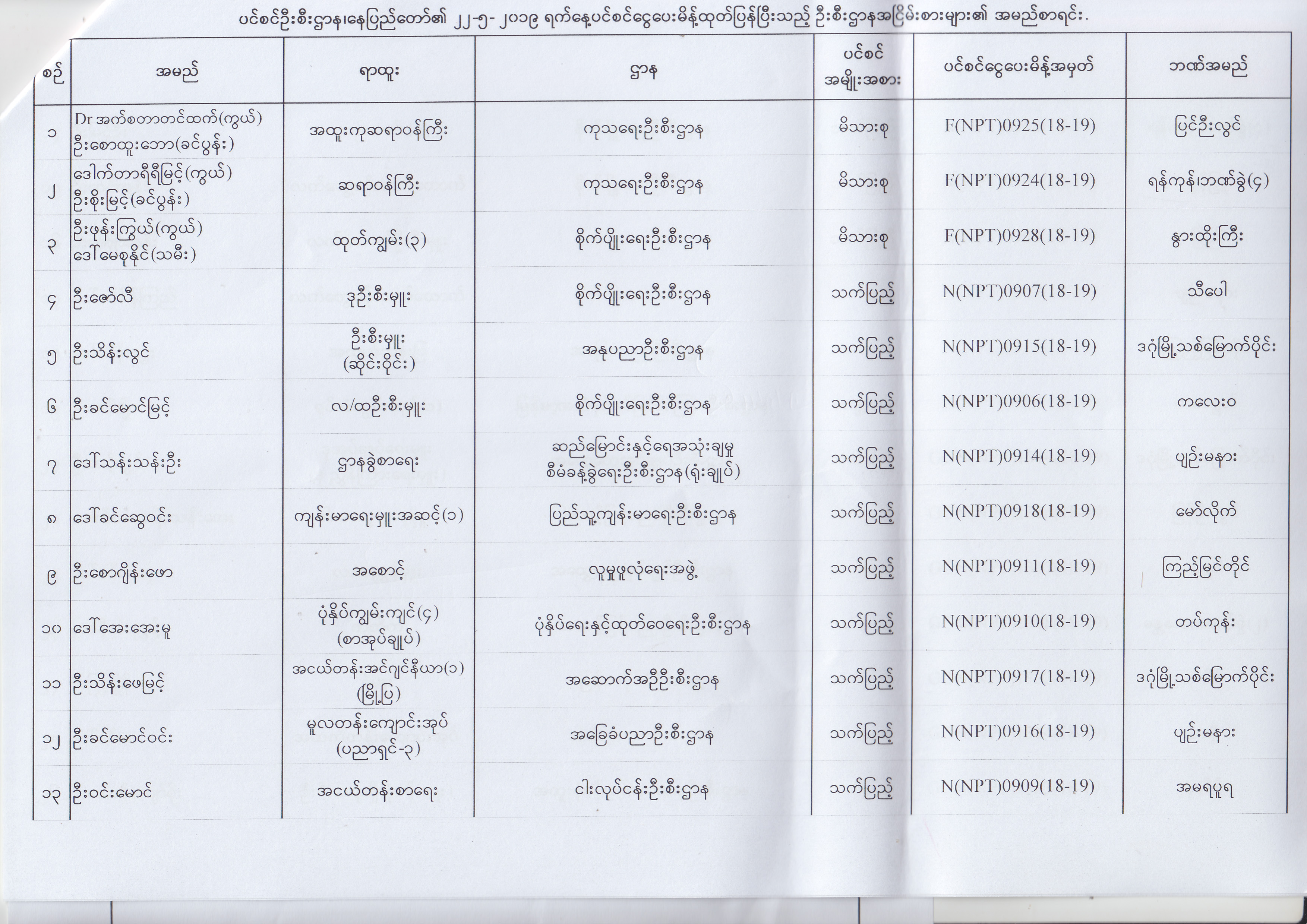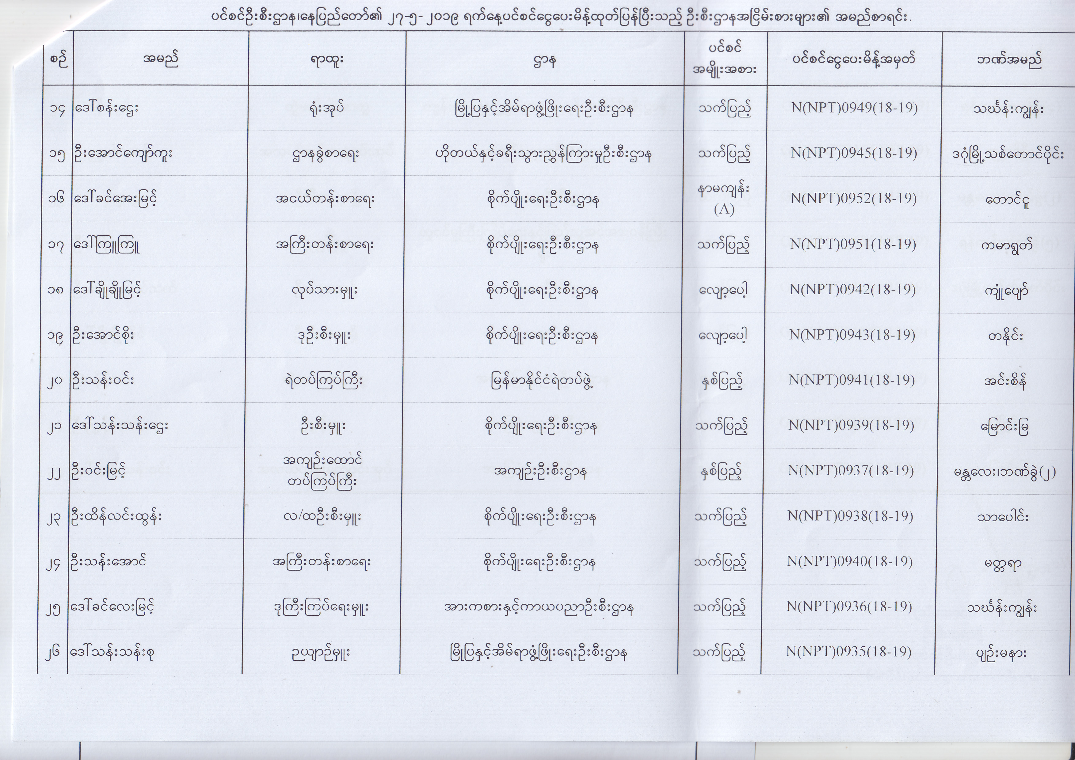 ပင်စင်ဦးစီးဌာ၊ နေပြည်တော်၏ ၂၁.၅.၂၀၁၉ မှ ၃၁.၅.၂၀၁၉ ရက်နေ့အထိ ပင်စင်ငွေပေးမိန့်ထုတ်ပြန်ပြီးသည့် ဦးစီးဌာနအငြိမ်းစားများ၏ အမည်စာရင်း pension_editor Tue, 06/04/2019 - 11:13