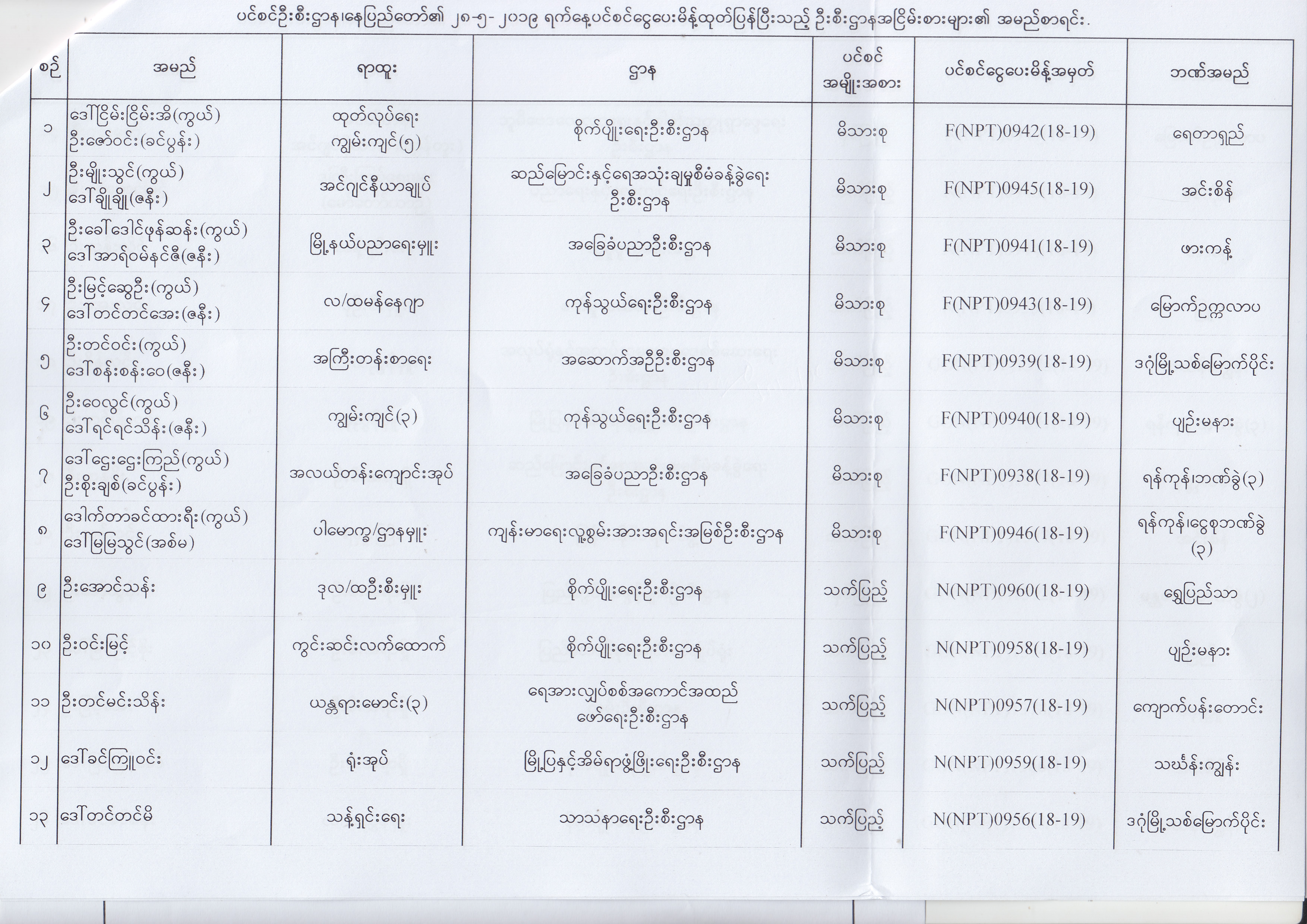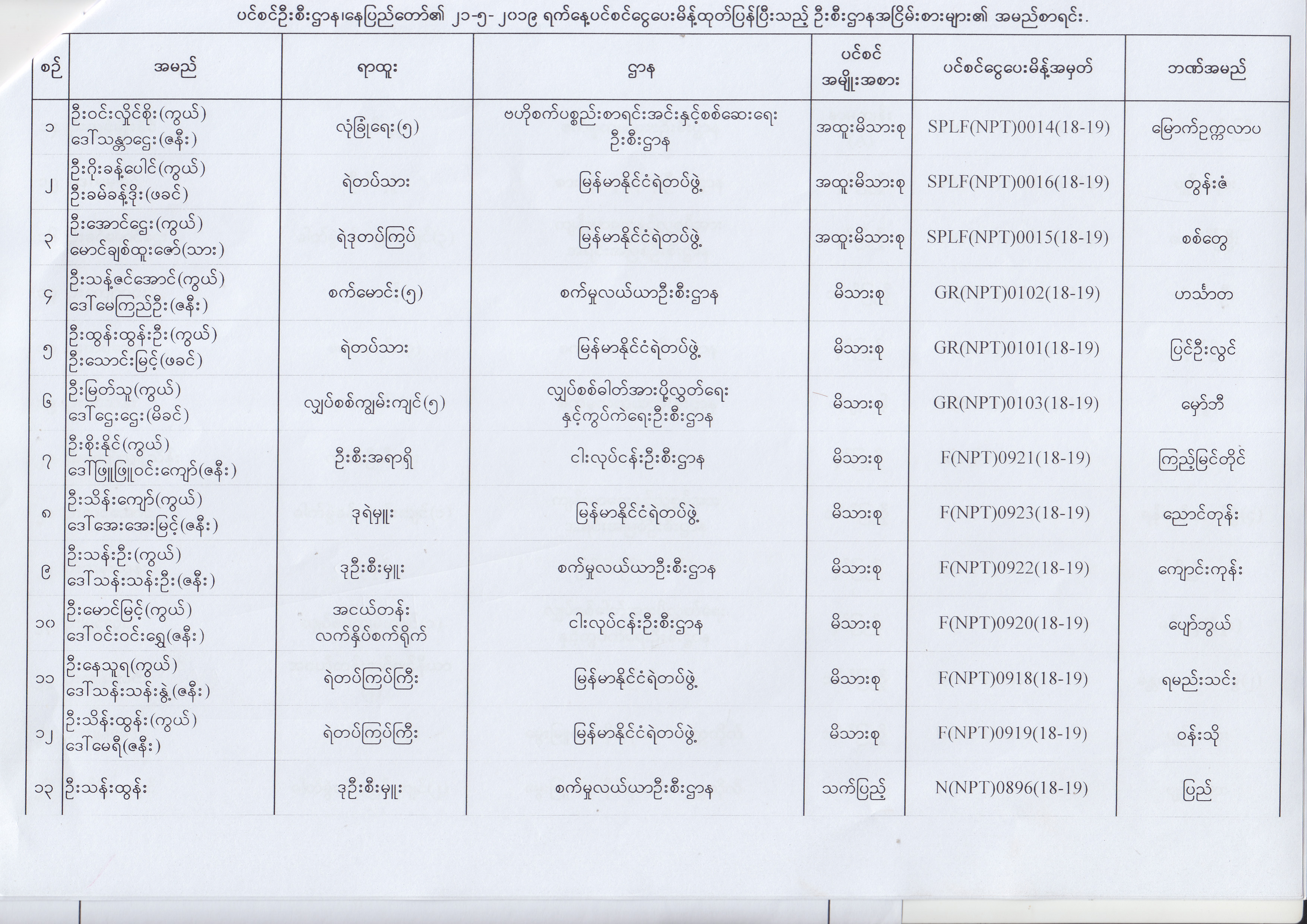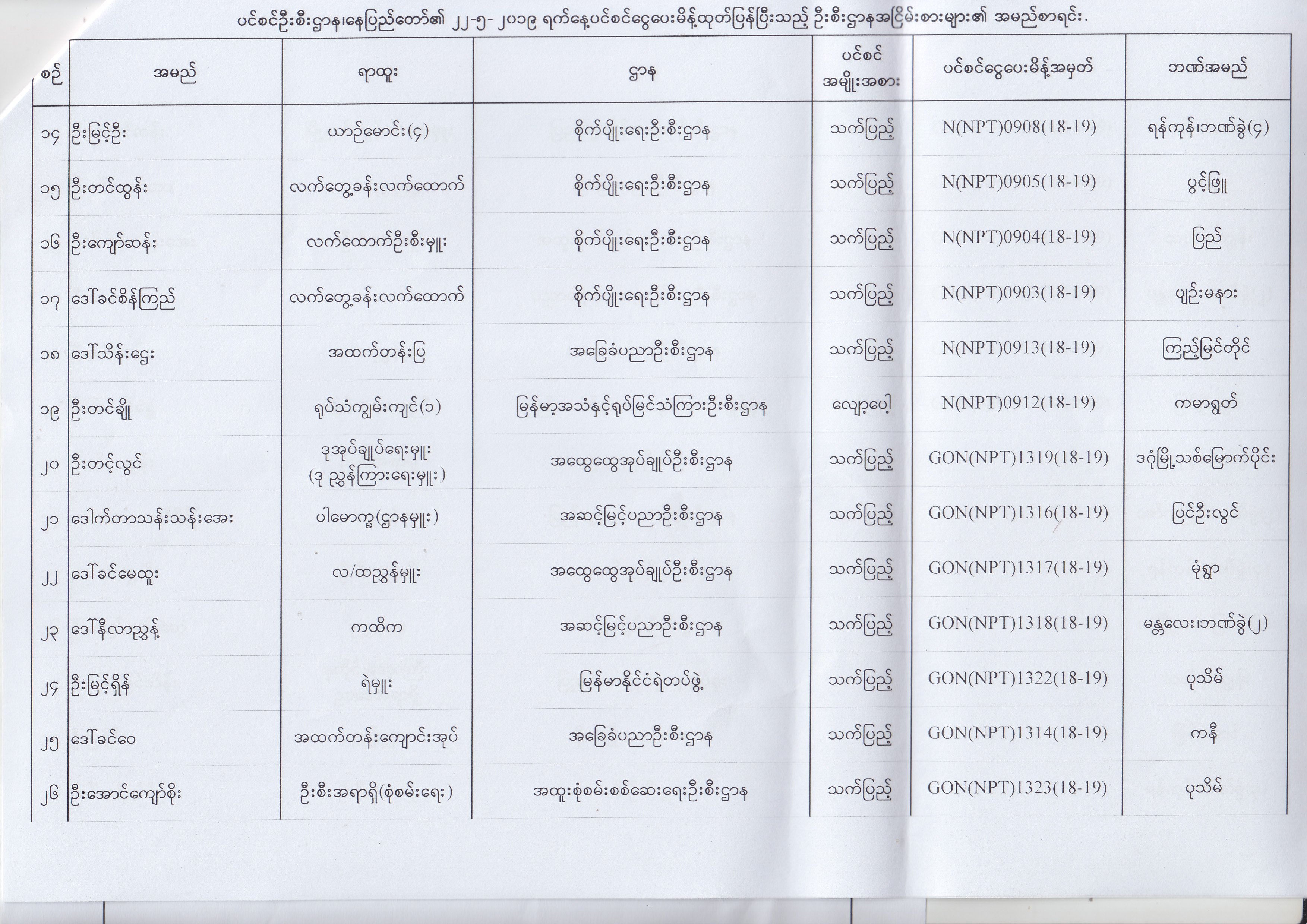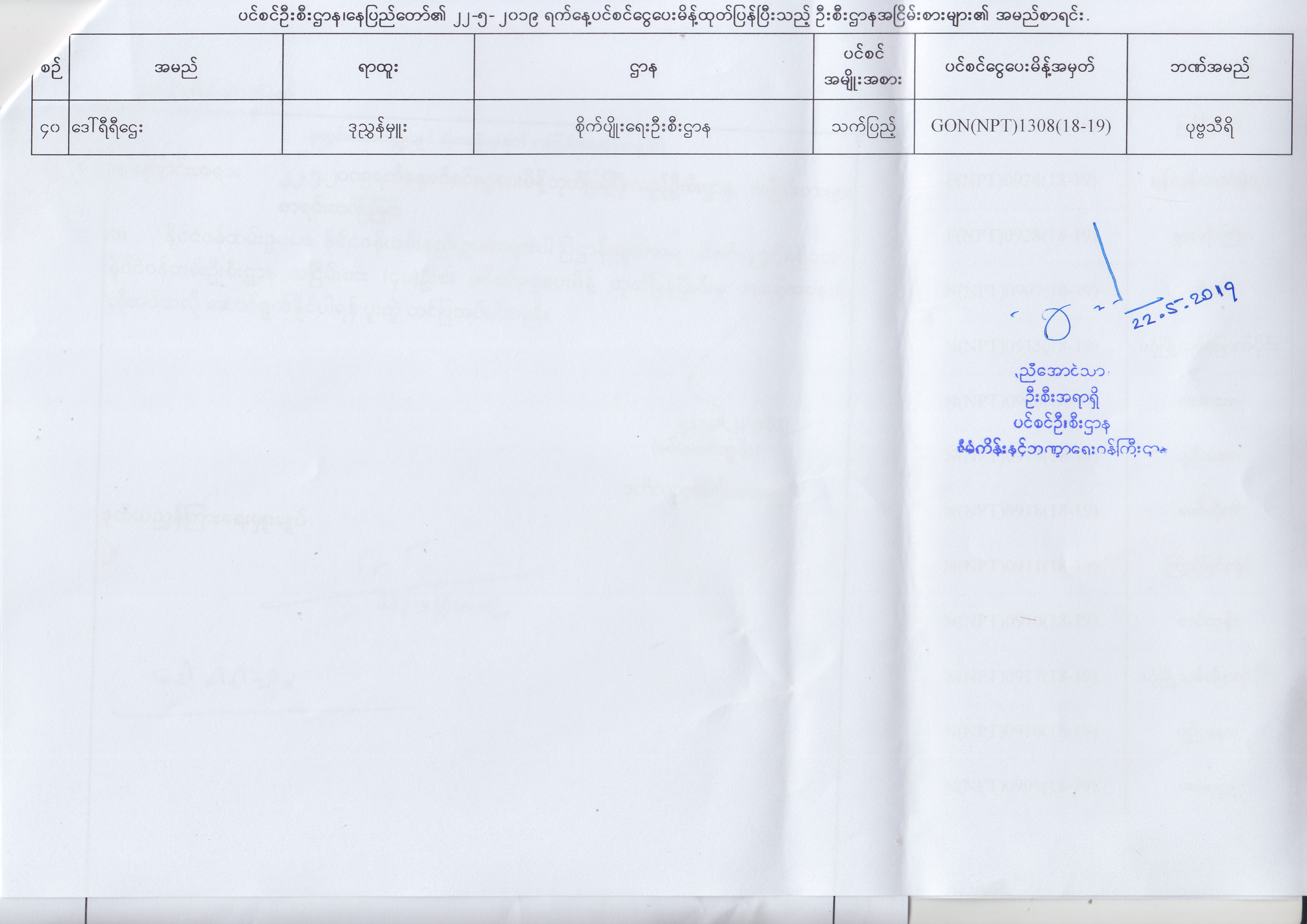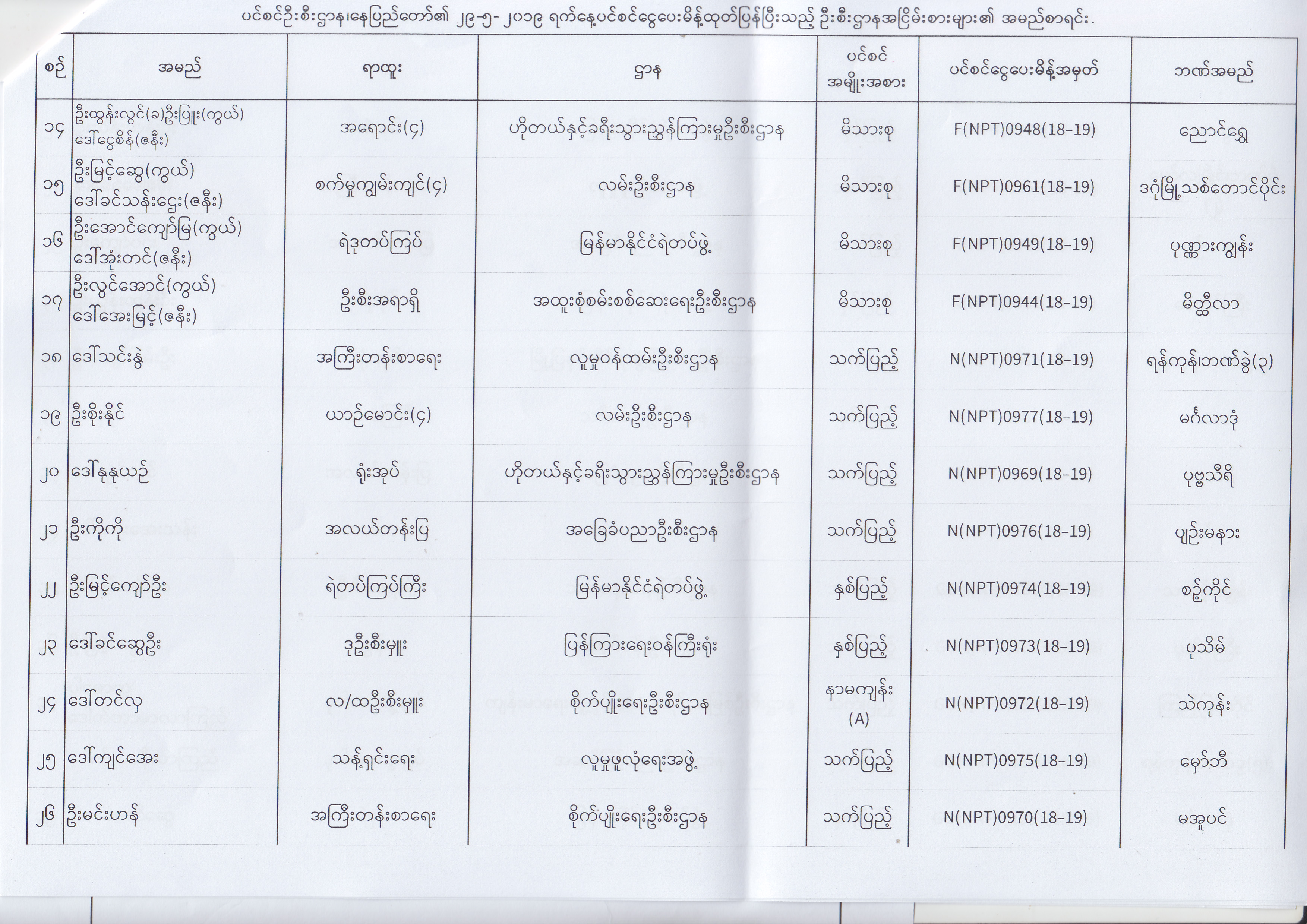 ပင်စင်ဦးစီးဌာ၊ နေပြည်တော်၏ ၂၁.၅.၂၀၁၉ မှ ၃၁.၅.၂၀၁၉ ရက်နေ့အထိ ပင်စင်ငွေပေးမိန့်ထုတ်ပြန်ပြီးသည့် ဦးစီးဌာနအငြိမ်းစားများ၏ အမည်စာရင်း pension_editor Tue, 06/04/2019 - 11:13