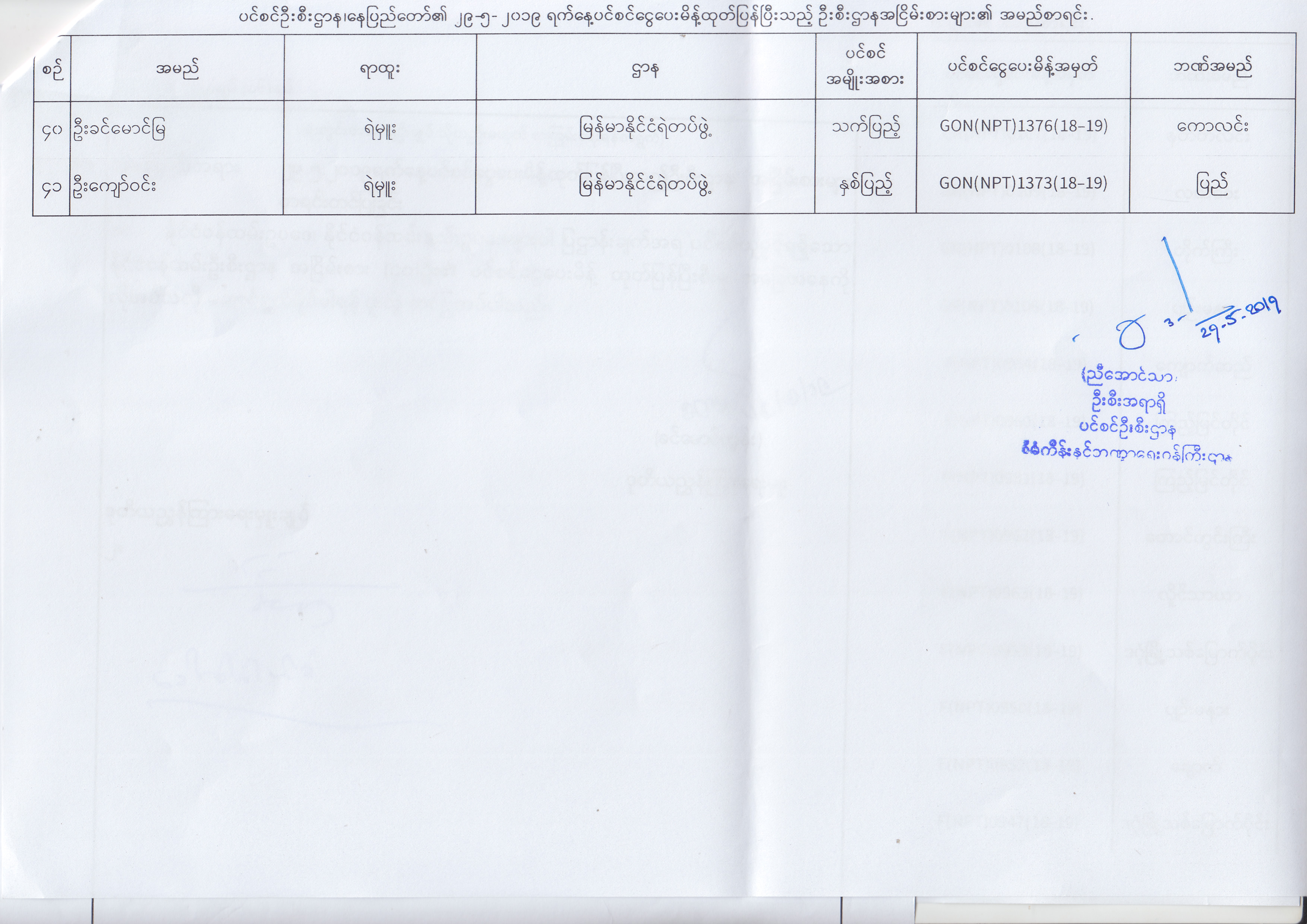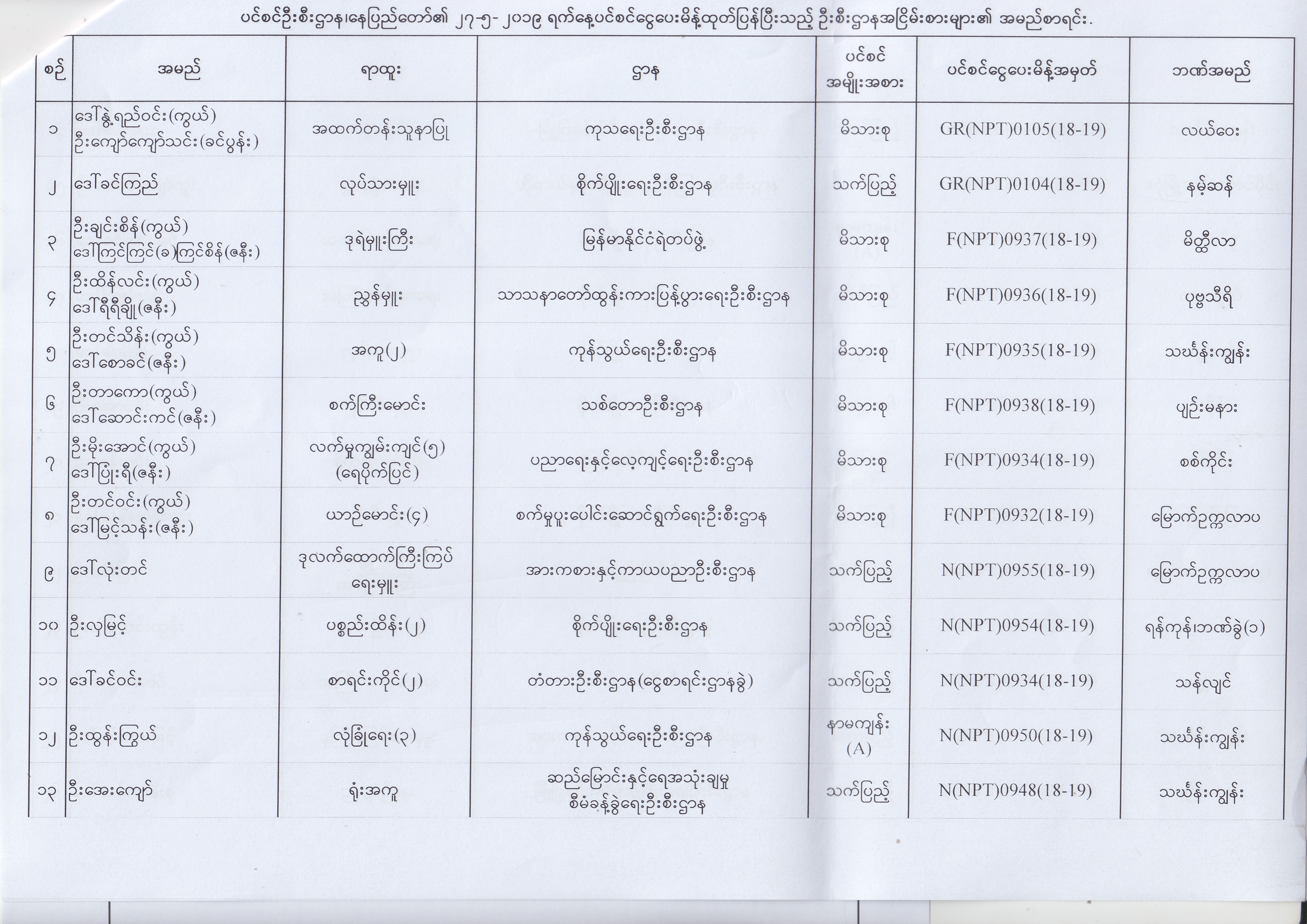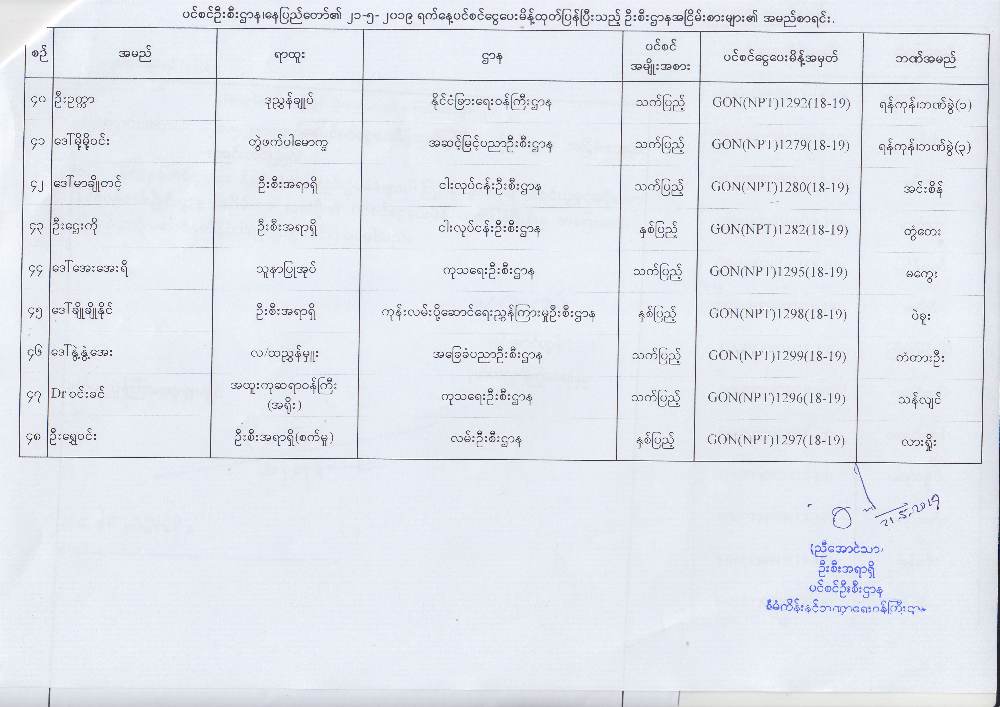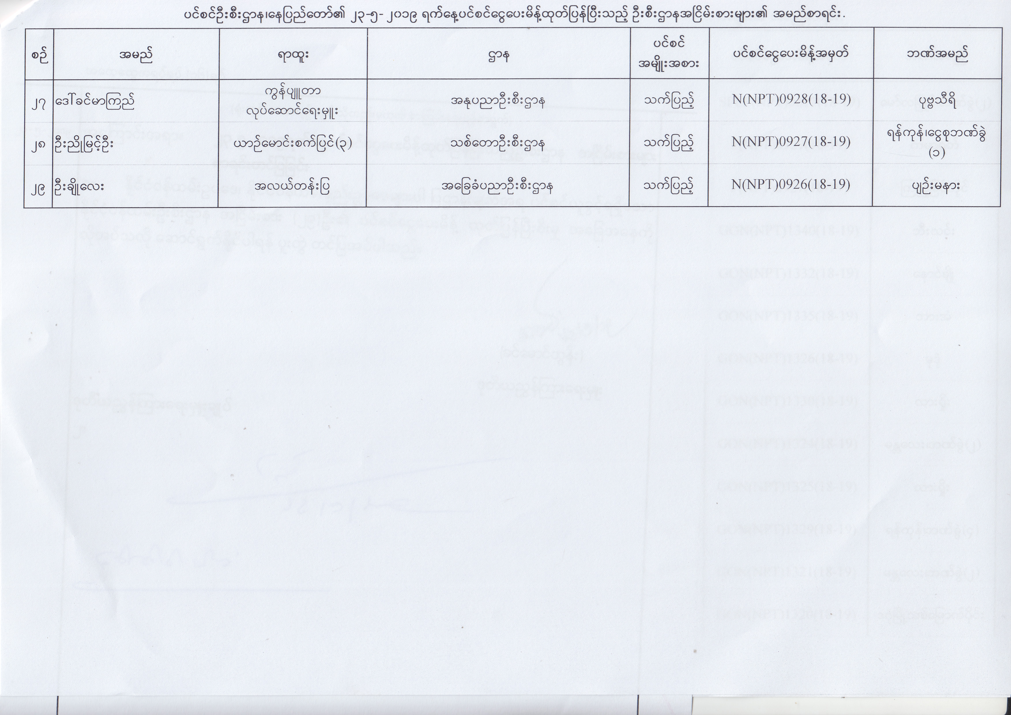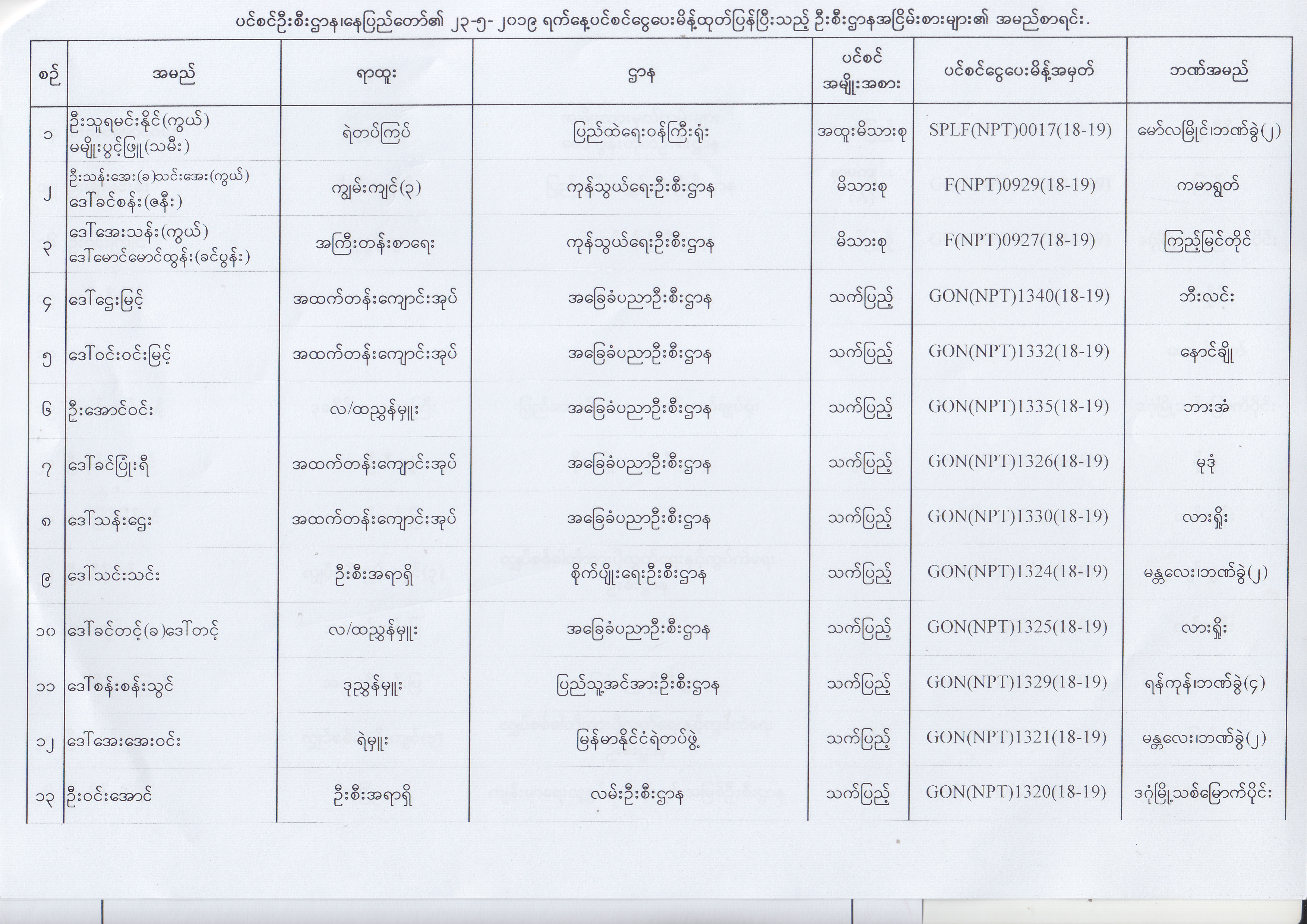 ပင်စင်ဦးစီးဌာ၊ နေပြည်တော်၏ ၂၁.၅.၂၀၁၉ မှ ၃၁.၅.၂၀၁၉ ရက်နေ့အထိ ပင်စင်ငွေပေးမိန့်ထုတ်ပြန်ပြီးသည့် ဦးစီးဌာနအငြိမ်းစားများ၏ အမည်စာရင်း pension_editor Tue, 06/04/2019 - 11:13