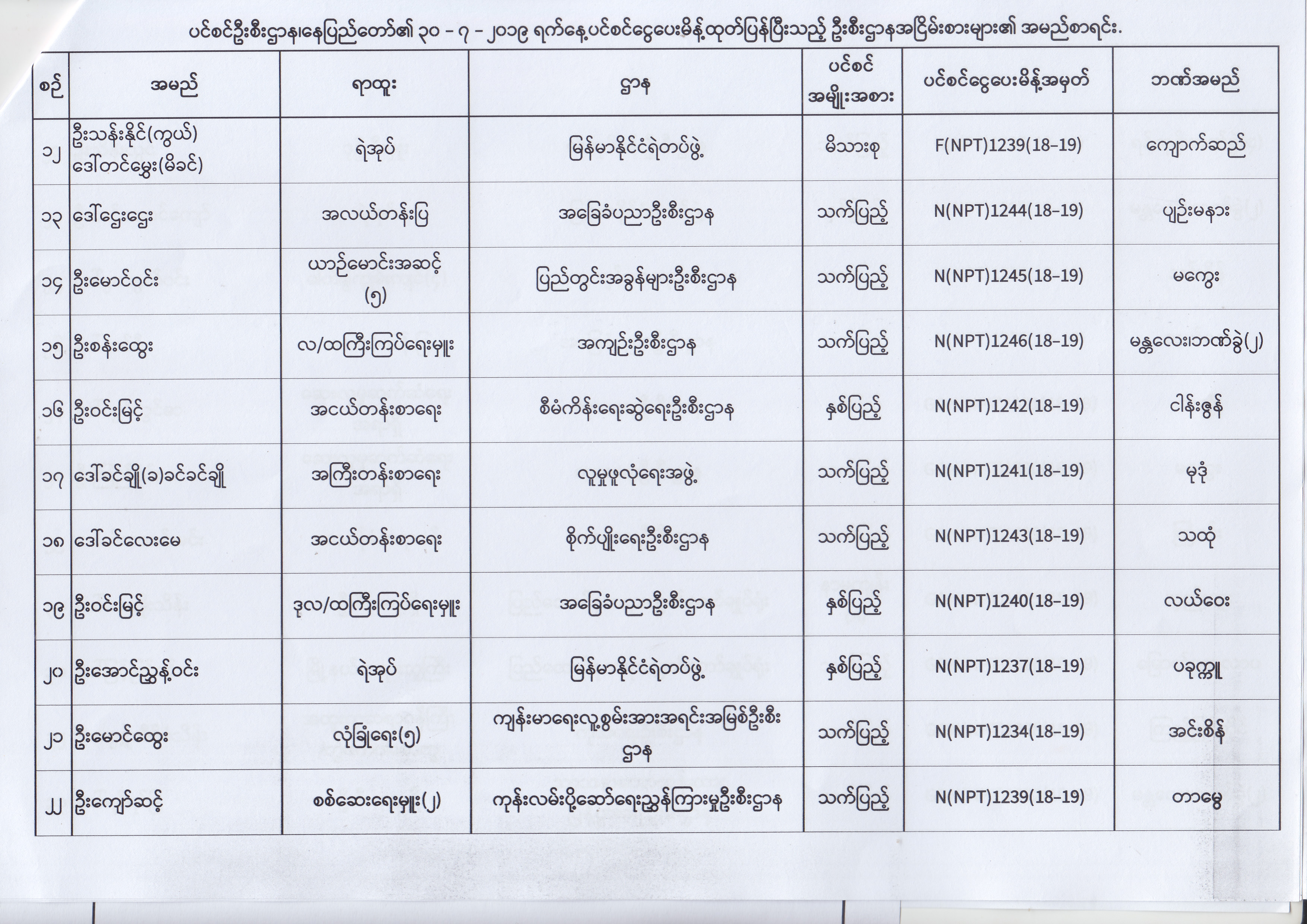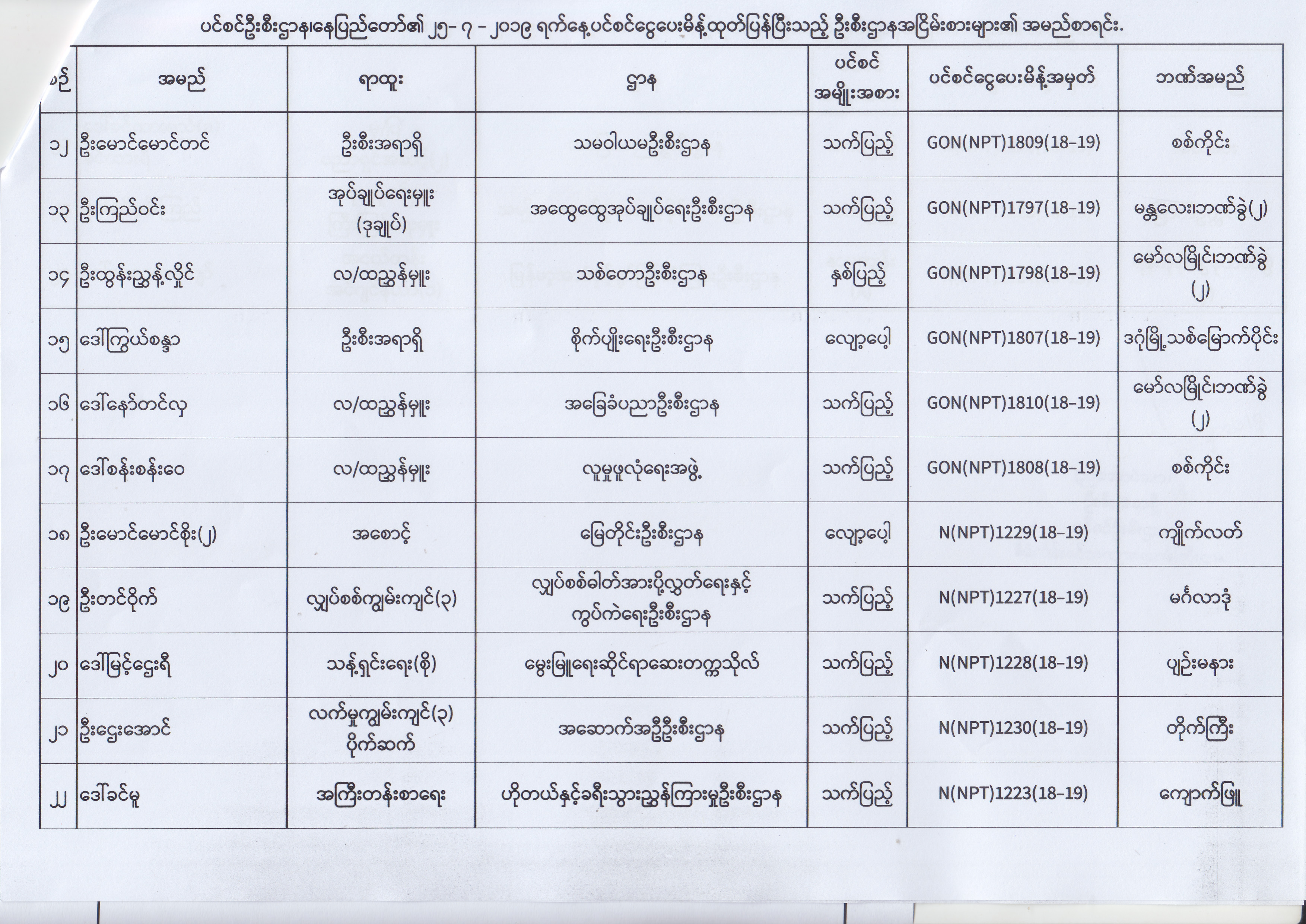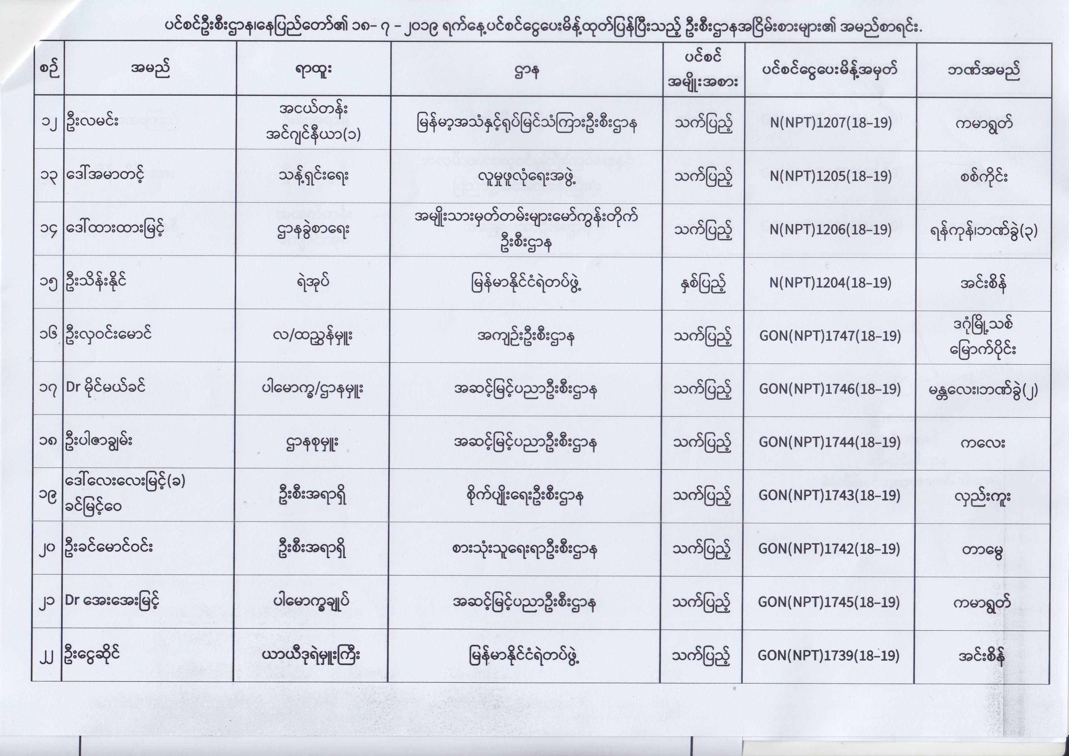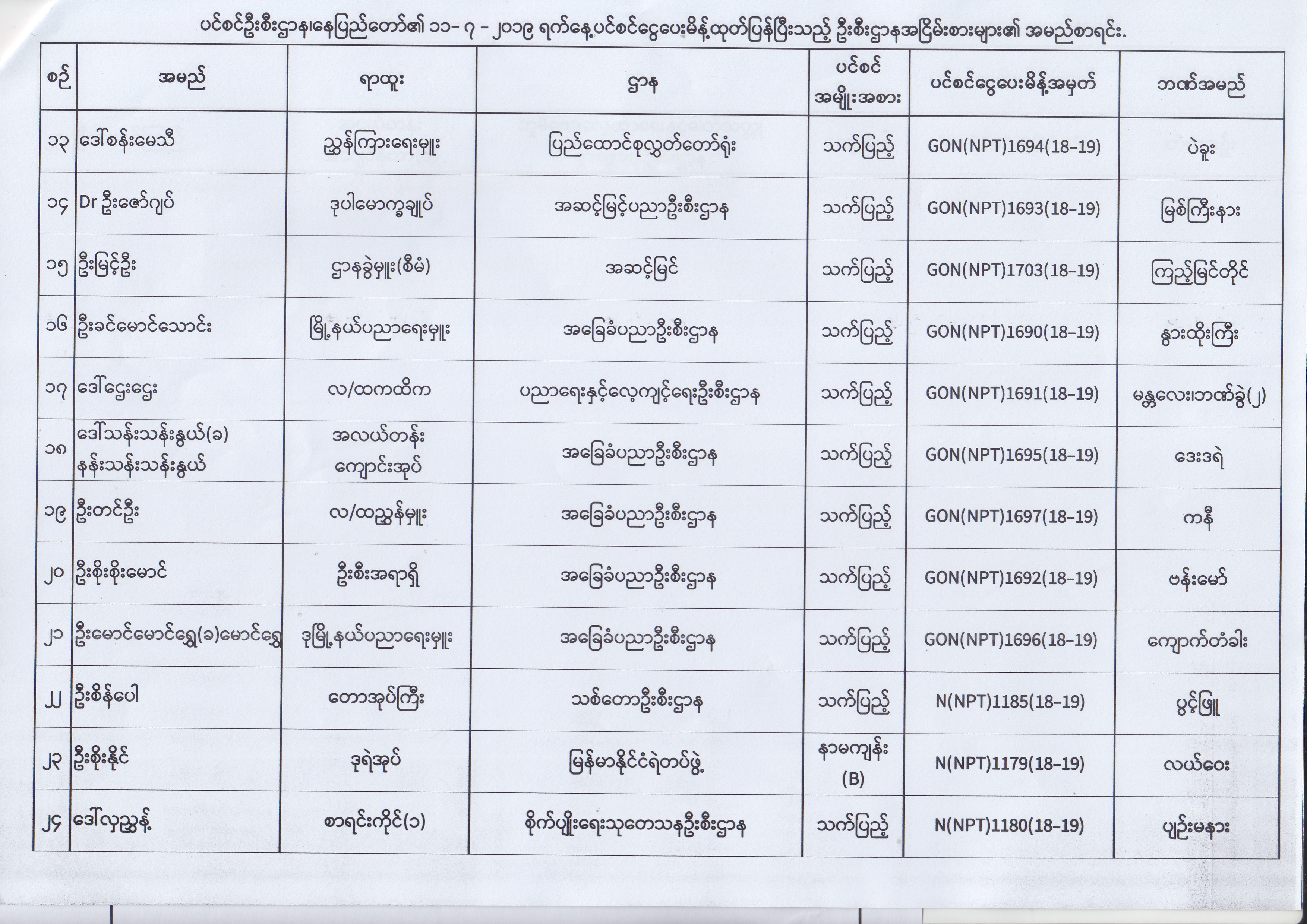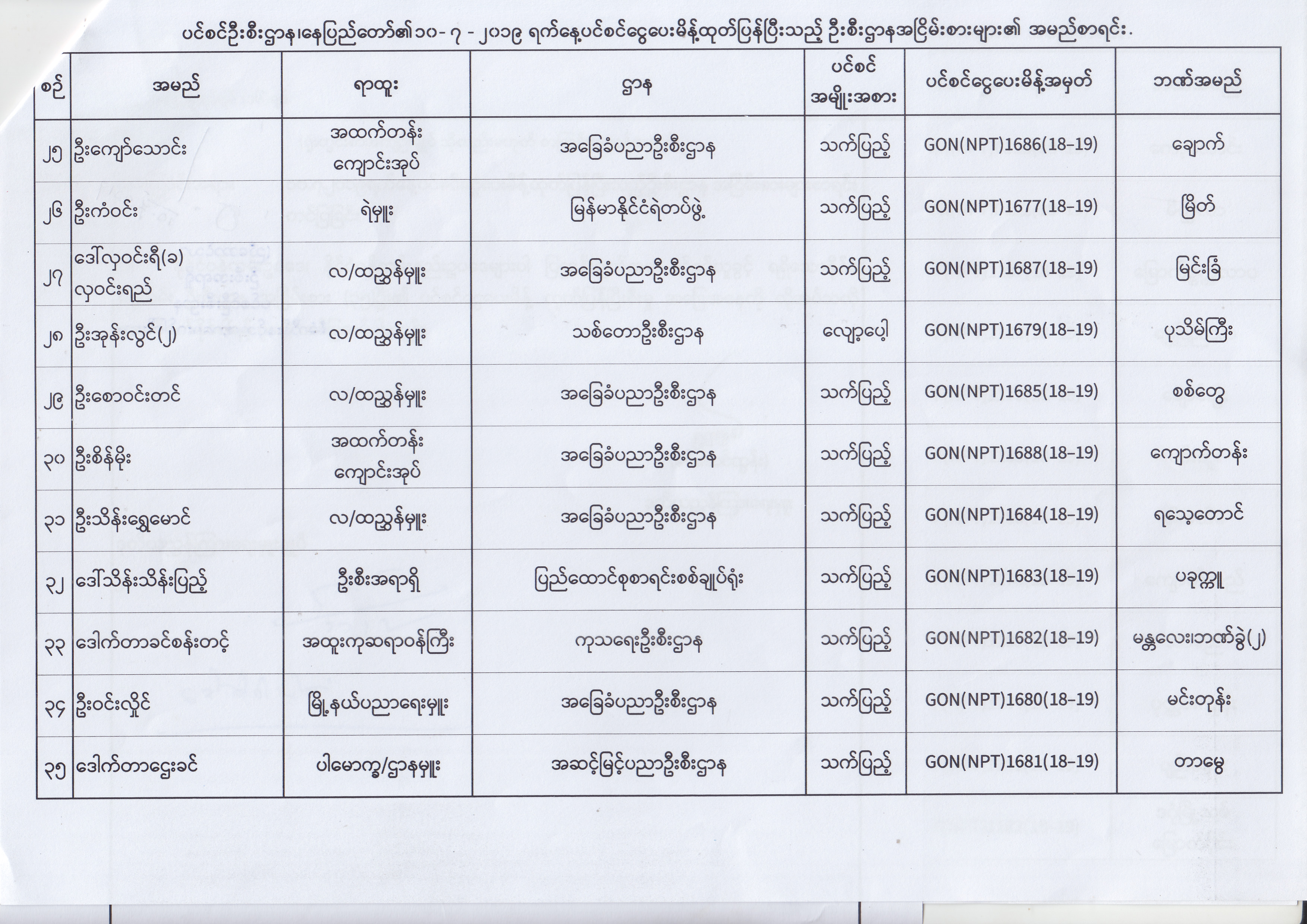 ပင်စင်ဦးစီးဌာန၊ နေပြည်တော်၏ (၂၄.၆.၂၀၁၉) မှ (၆.၈.၂၀၁၉) ရက်နေ့အထိ ပင်စင်ငွေပေးမိန့်ထုတ်ပြန်ပြီးသည့် ဦးစီးဌာနအငြိမ်းစားများ၏ အမည်စာရင်း pension_editor Thu, 08/08/2019 - 11:59