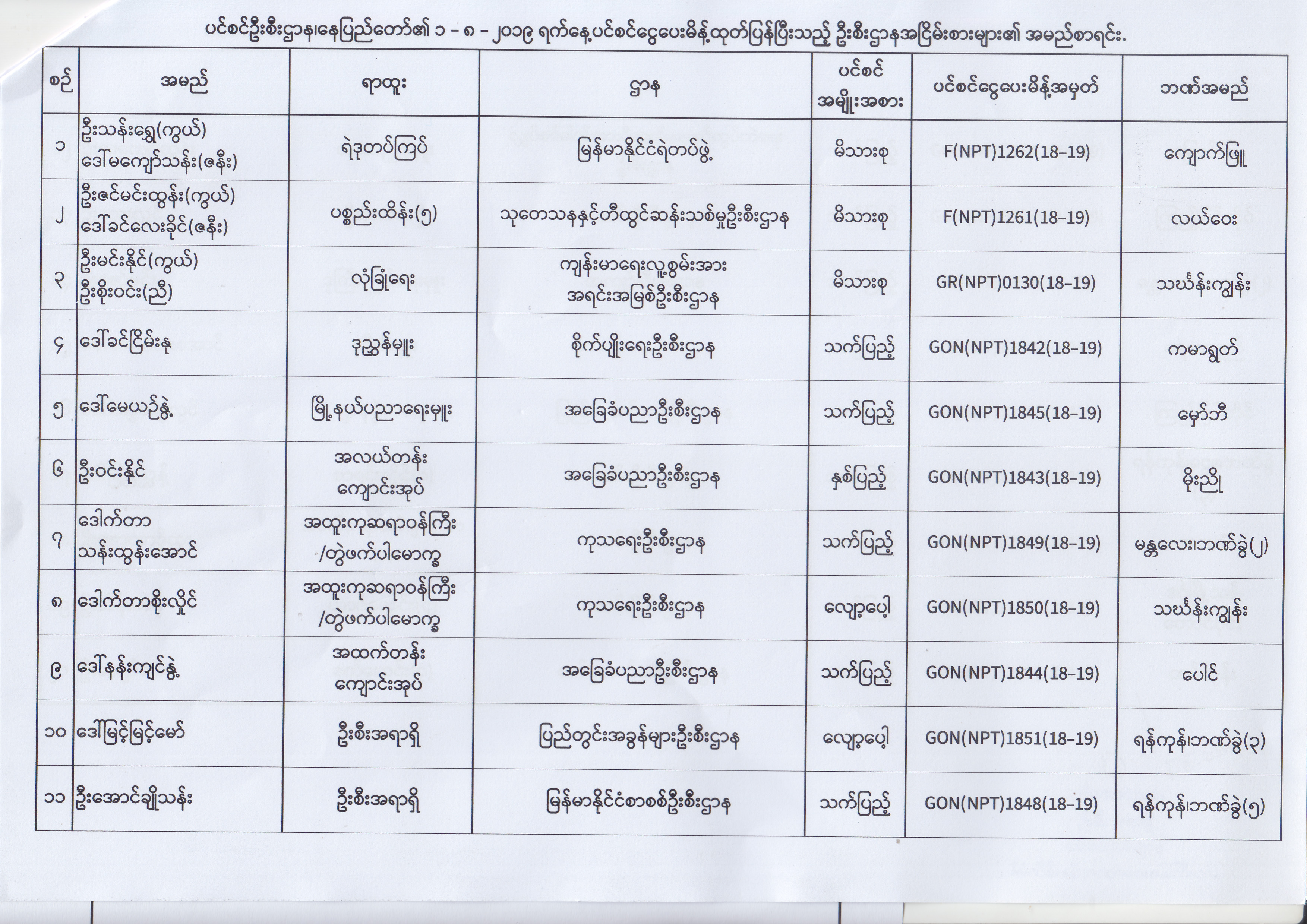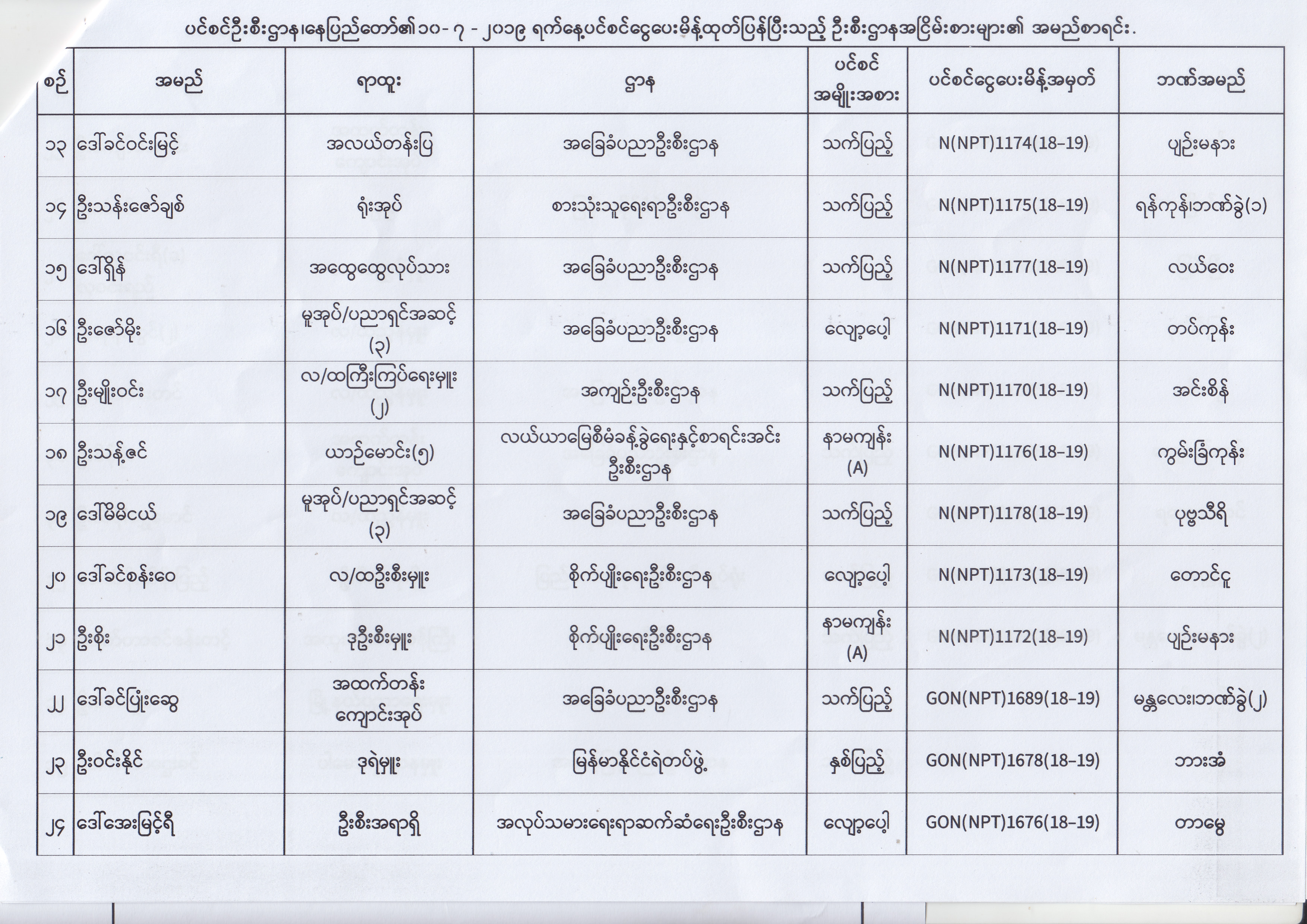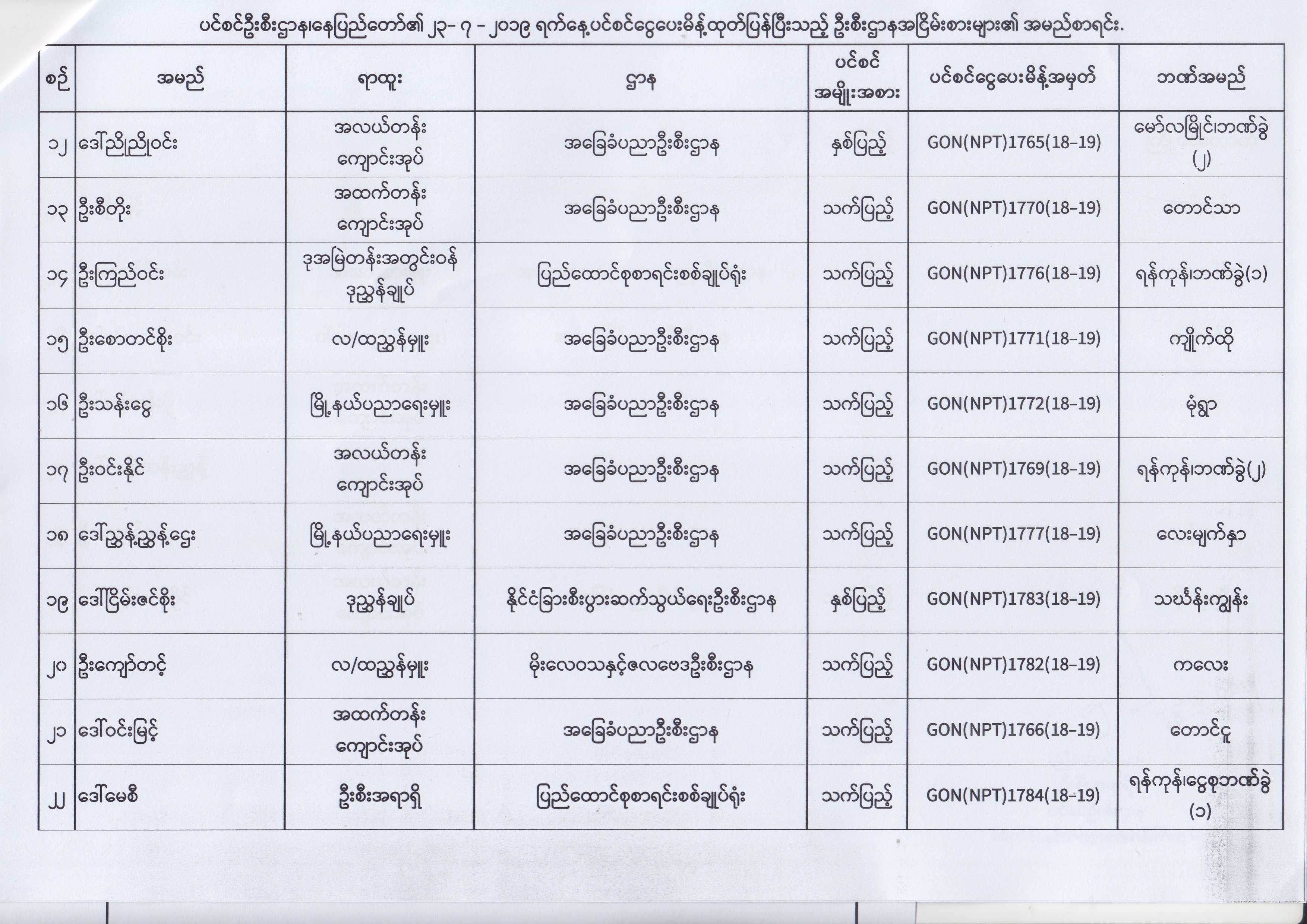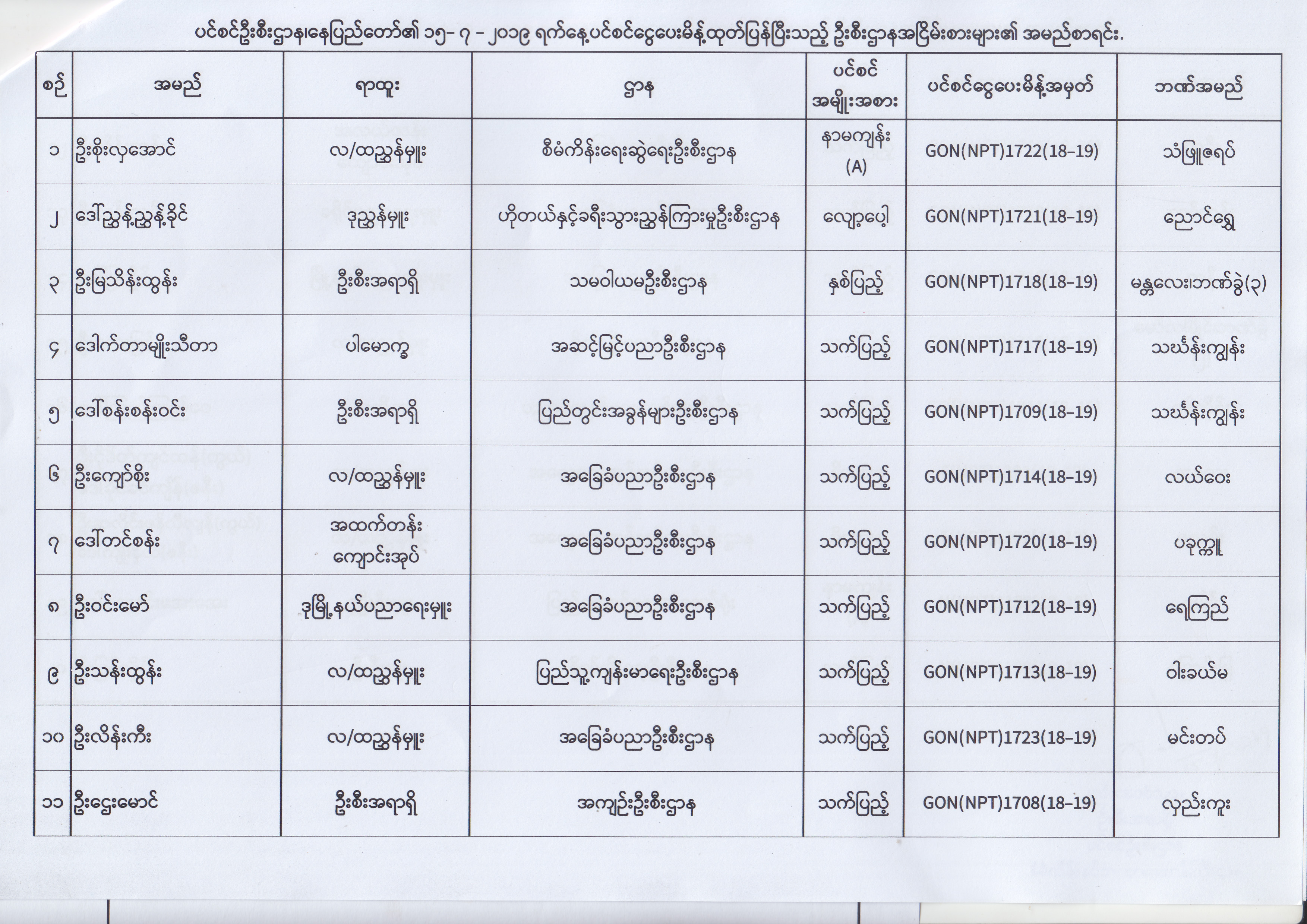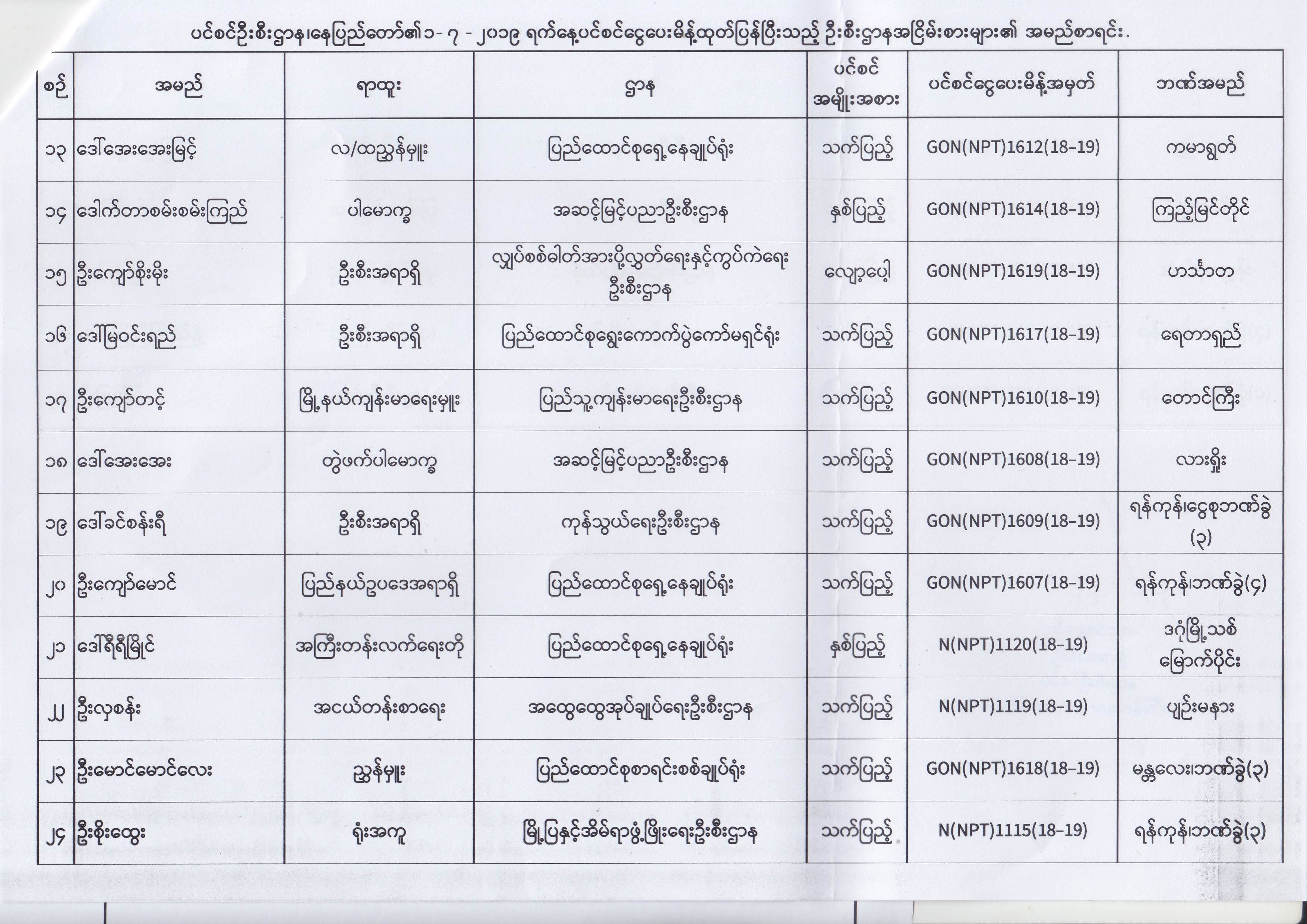 ပင်စင်ဦးစီးဌာန၊ နေပြည်တော်၏ (၂၄.၆.၂၀၁၉) မှ (၆.၈.၂၀၁၉) ရက်နေ့အထိ ပင်စင်ငွေပေးမိန့်ထုတ်ပြန်ပြီးသည့် ဦးစီးဌာနအငြိမ်းစားများ၏ အမည်စာရင်း pension_editor Thu, 08/08/2019 - 11:59