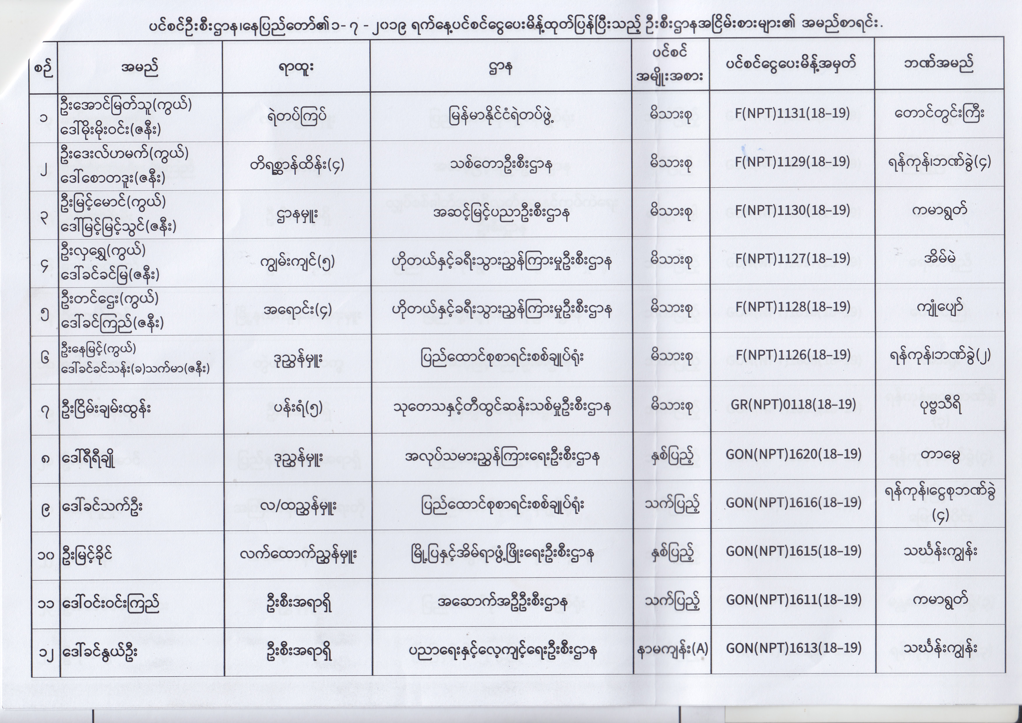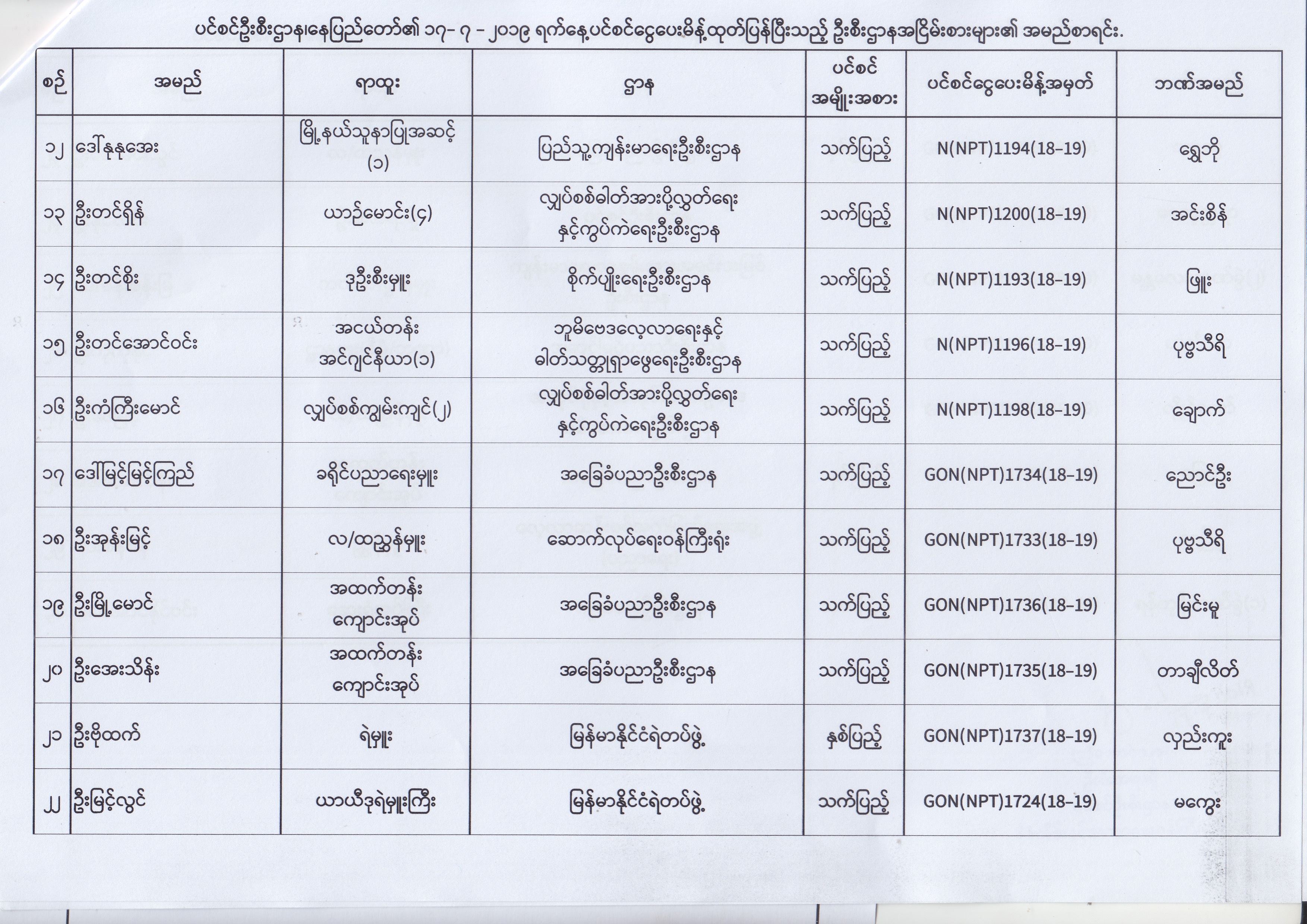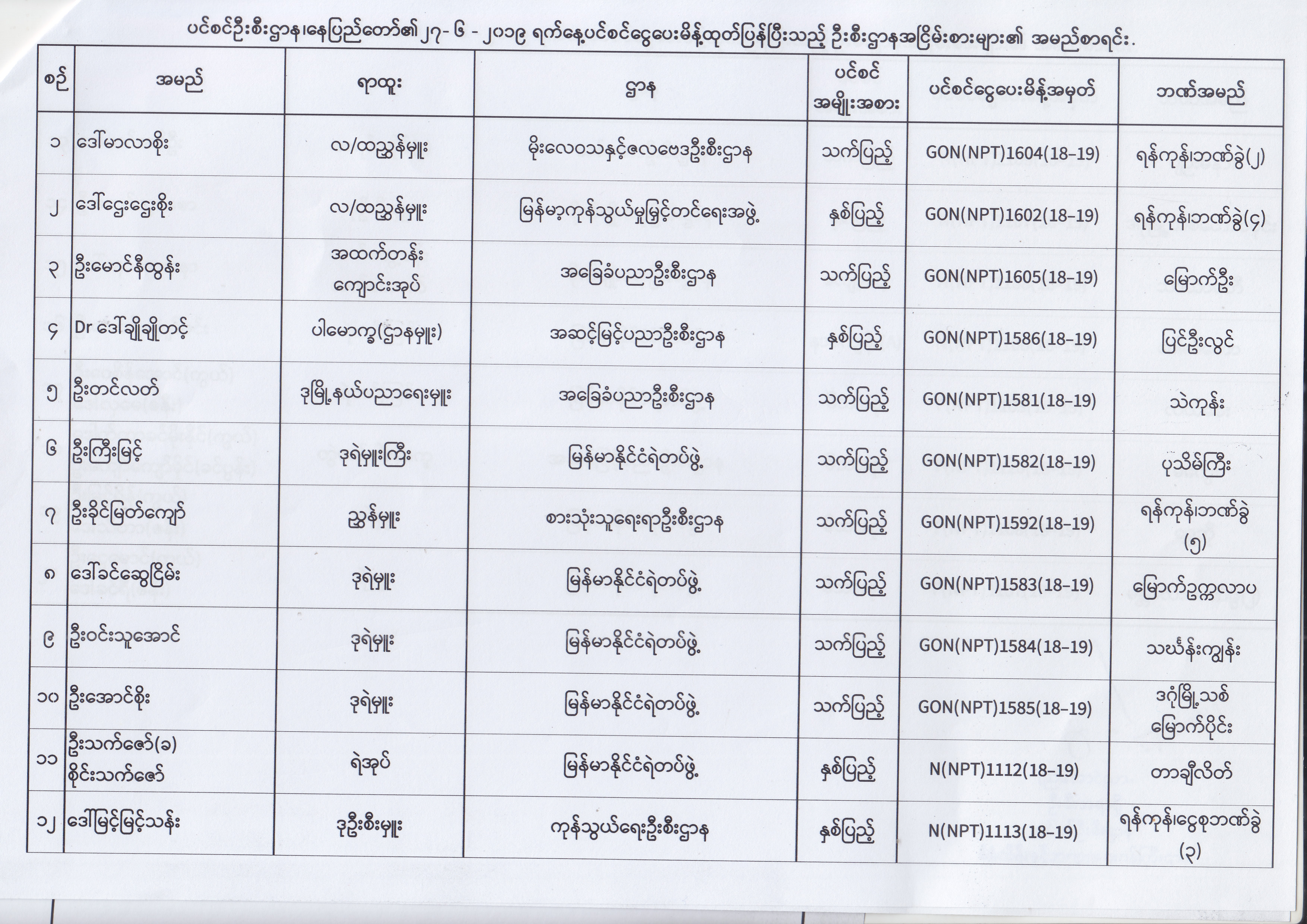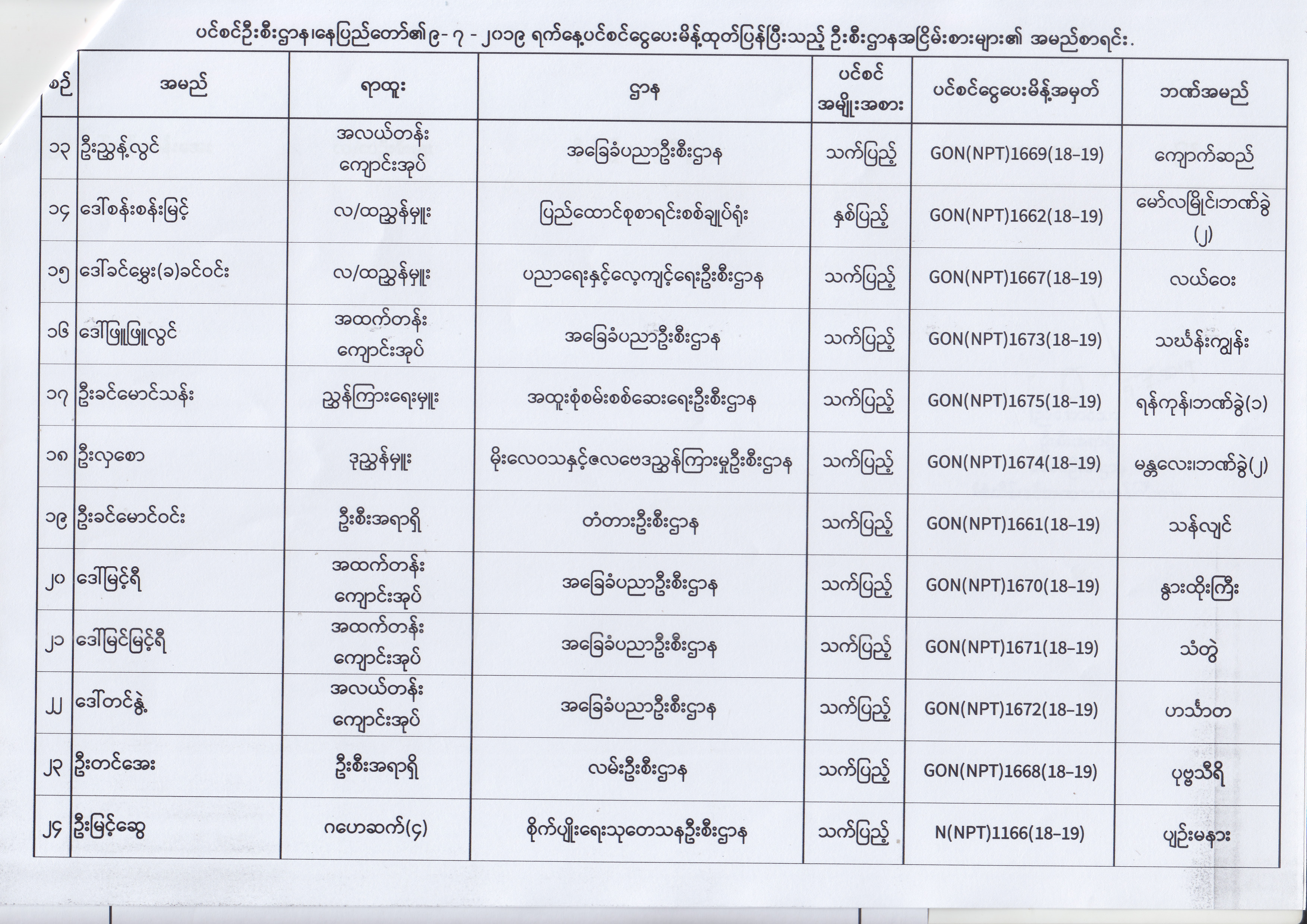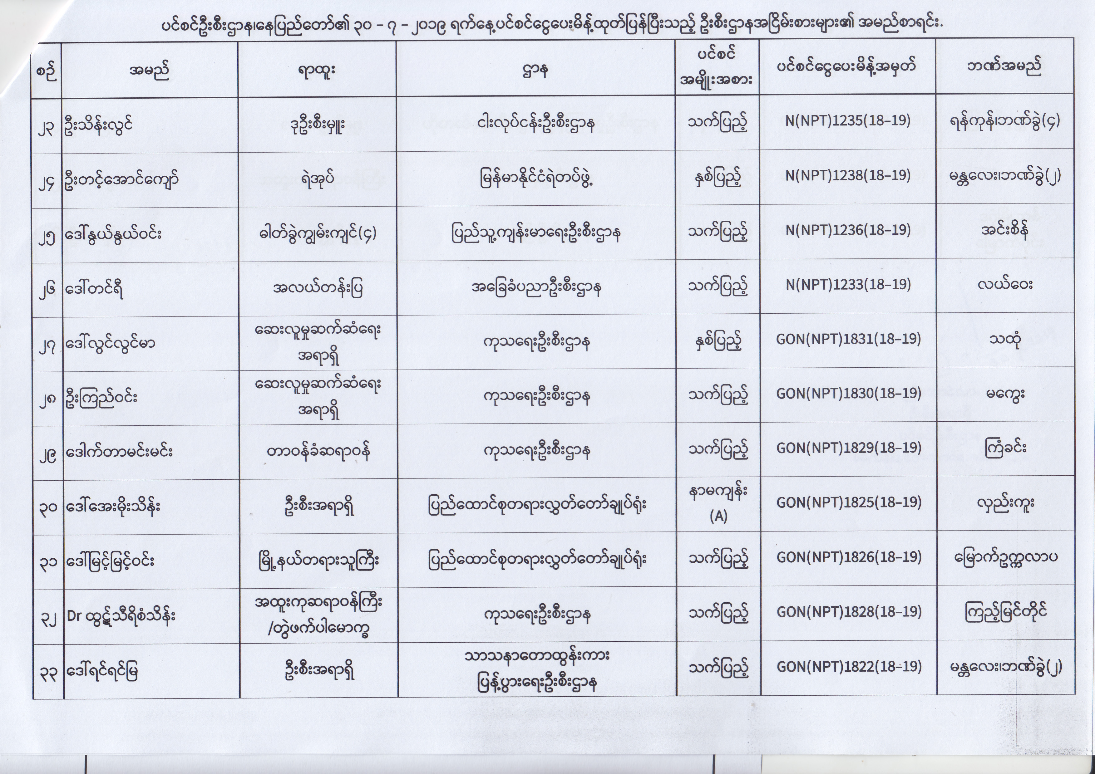 ပင်စင်ဦးစီးဌာန၊ နေပြည်တော်၏ (၂၄.၆.၂၀၁၉) မှ (၆.၈.၂၀၁၉) ရက်နေ့အထိ ပင်စင်ငွေပေးမိန့်ထုတ်ပြန်ပြီးသည့် ဦးစီးဌာနအငြိမ်းစားများ၏ အမည်စာရင်း pension_editor Thu, 08/08/2019 - 11:59