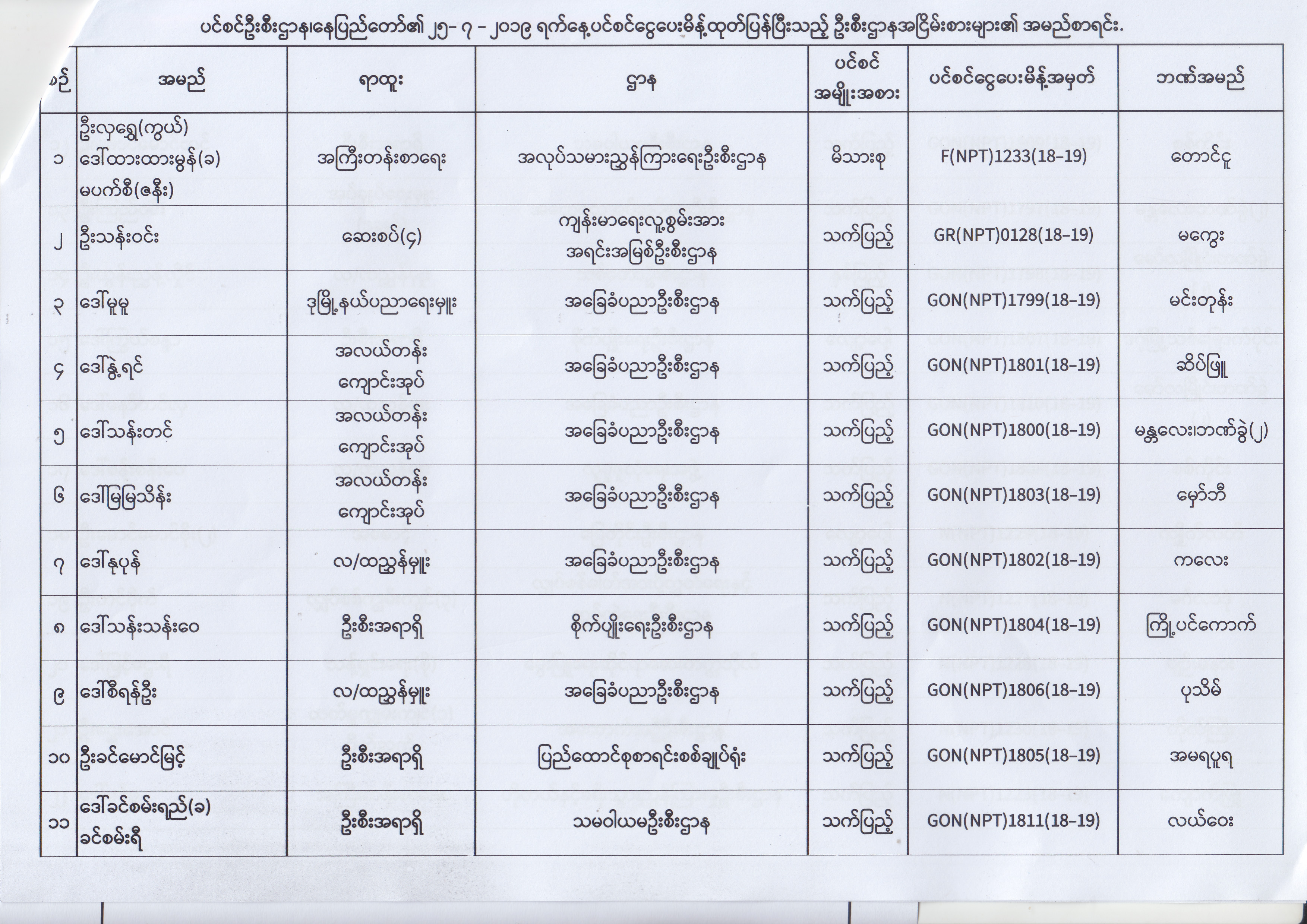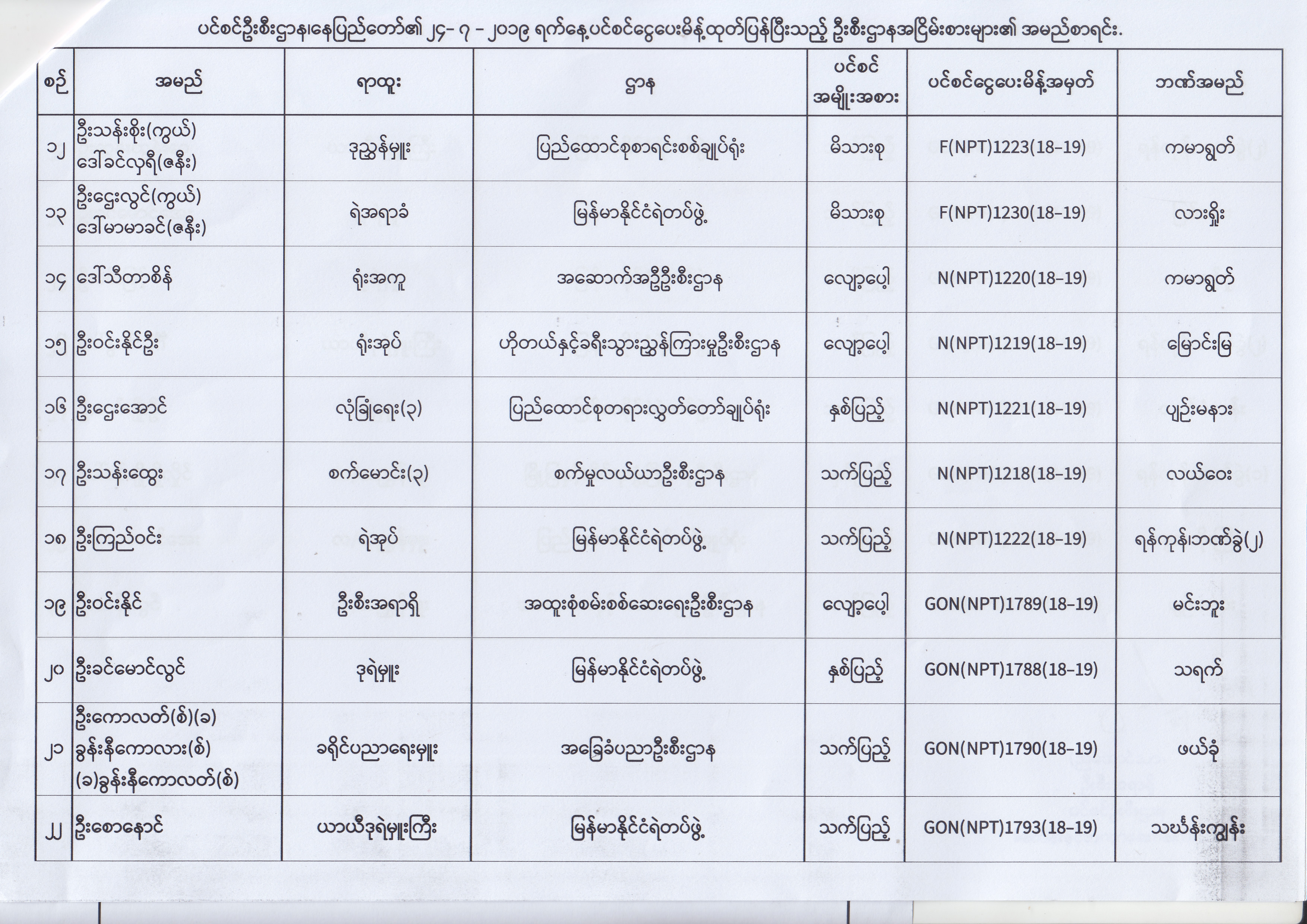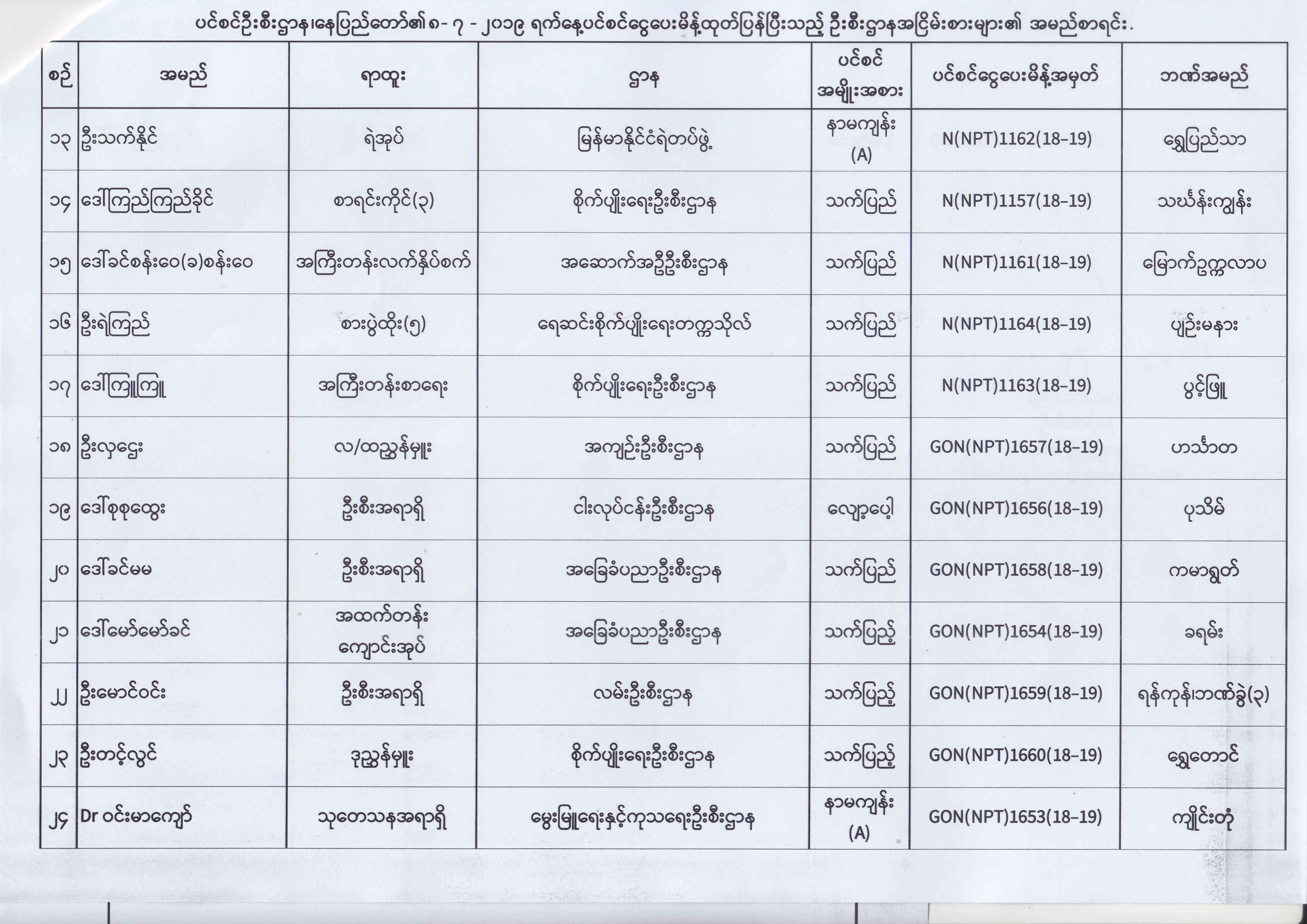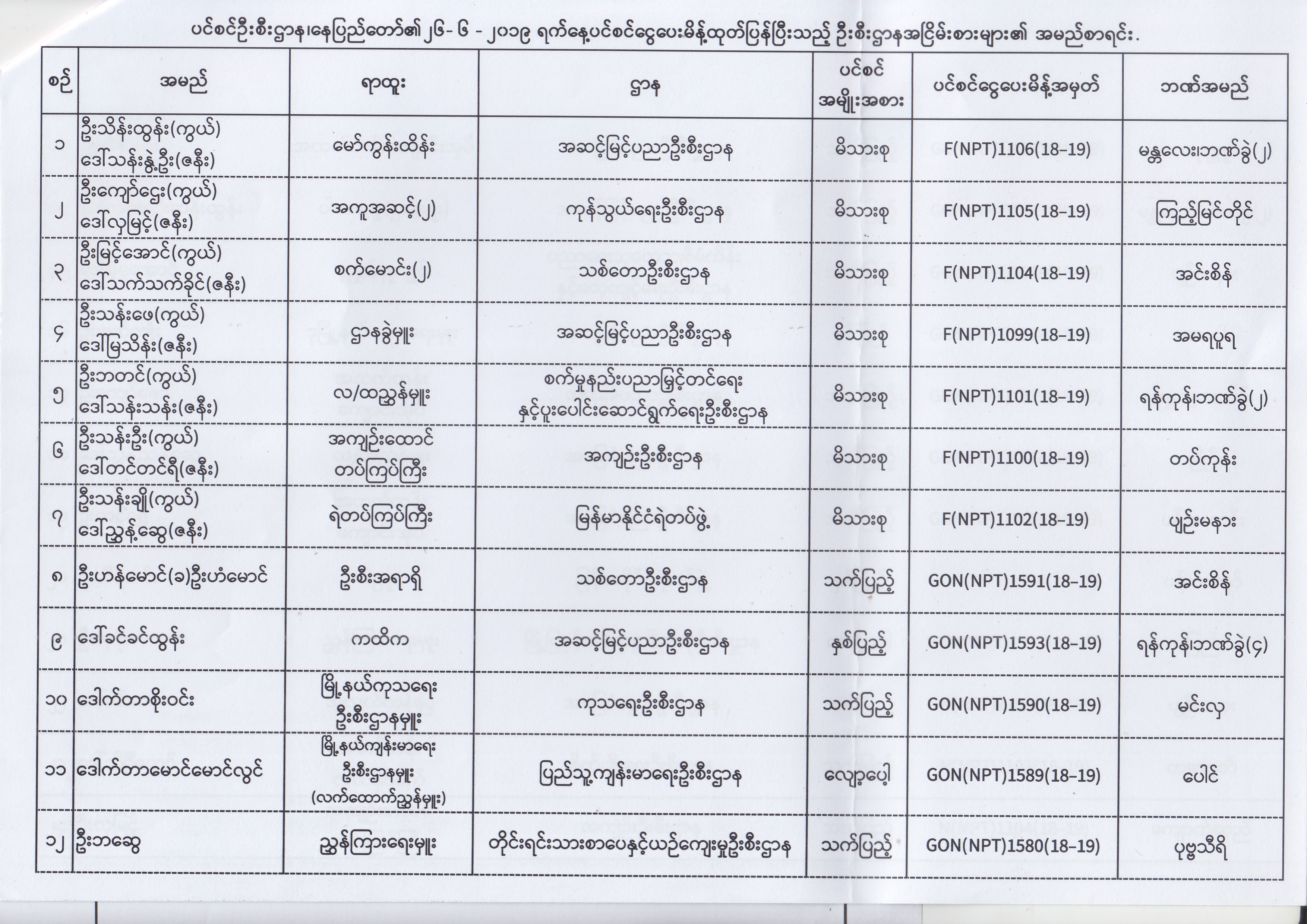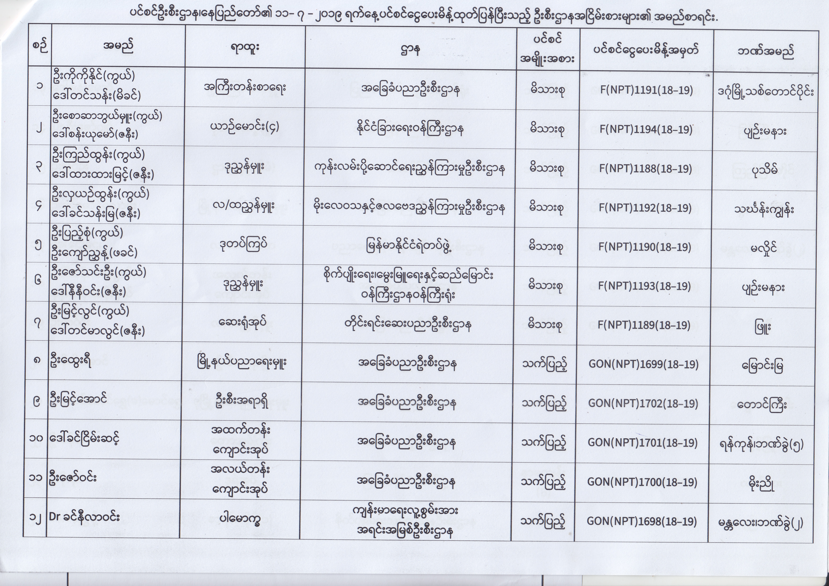 ပင်စင်ဦးစီးဌာန၊ နေပြည်တော်၏ (၂၄.၆.၂၀၁၉) မှ (၆.၈.၂၀၁၉) ရက်နေ့အထိ ပင်စင်ငွေပေးမိန့်ထုတ်ပြန်ပြီးသည့် ဦးစီးဌာနအငြိမ်းစားများ၏ အမည်စာရင်း pension_editor Thu, 08/08/2019 - 11:59