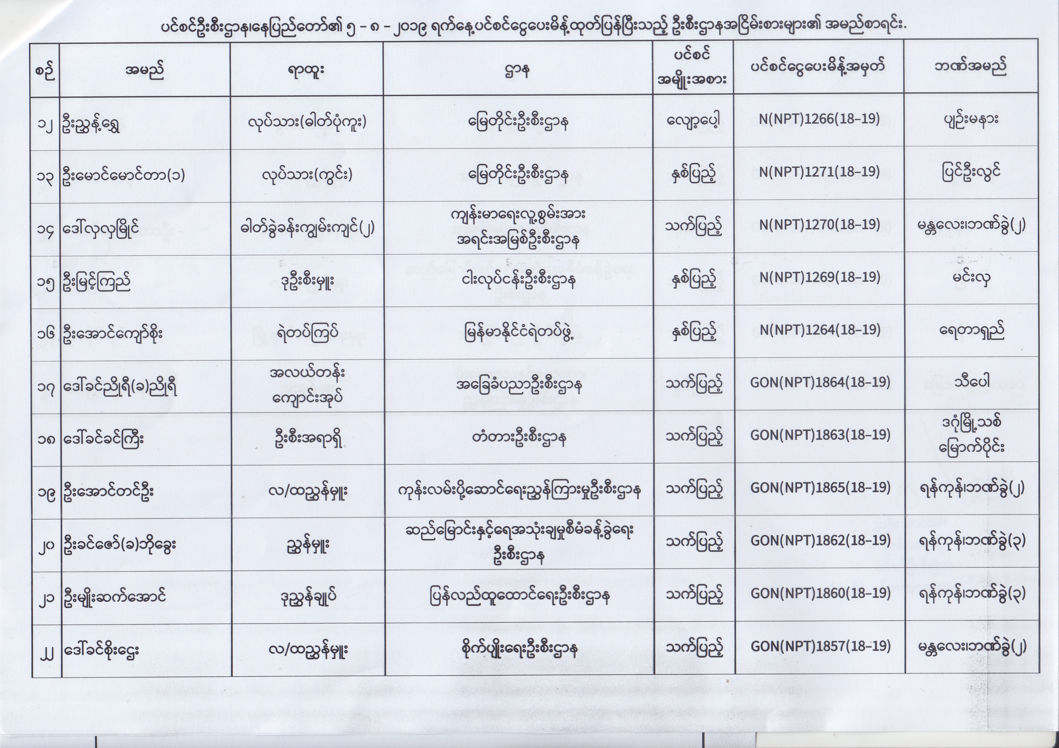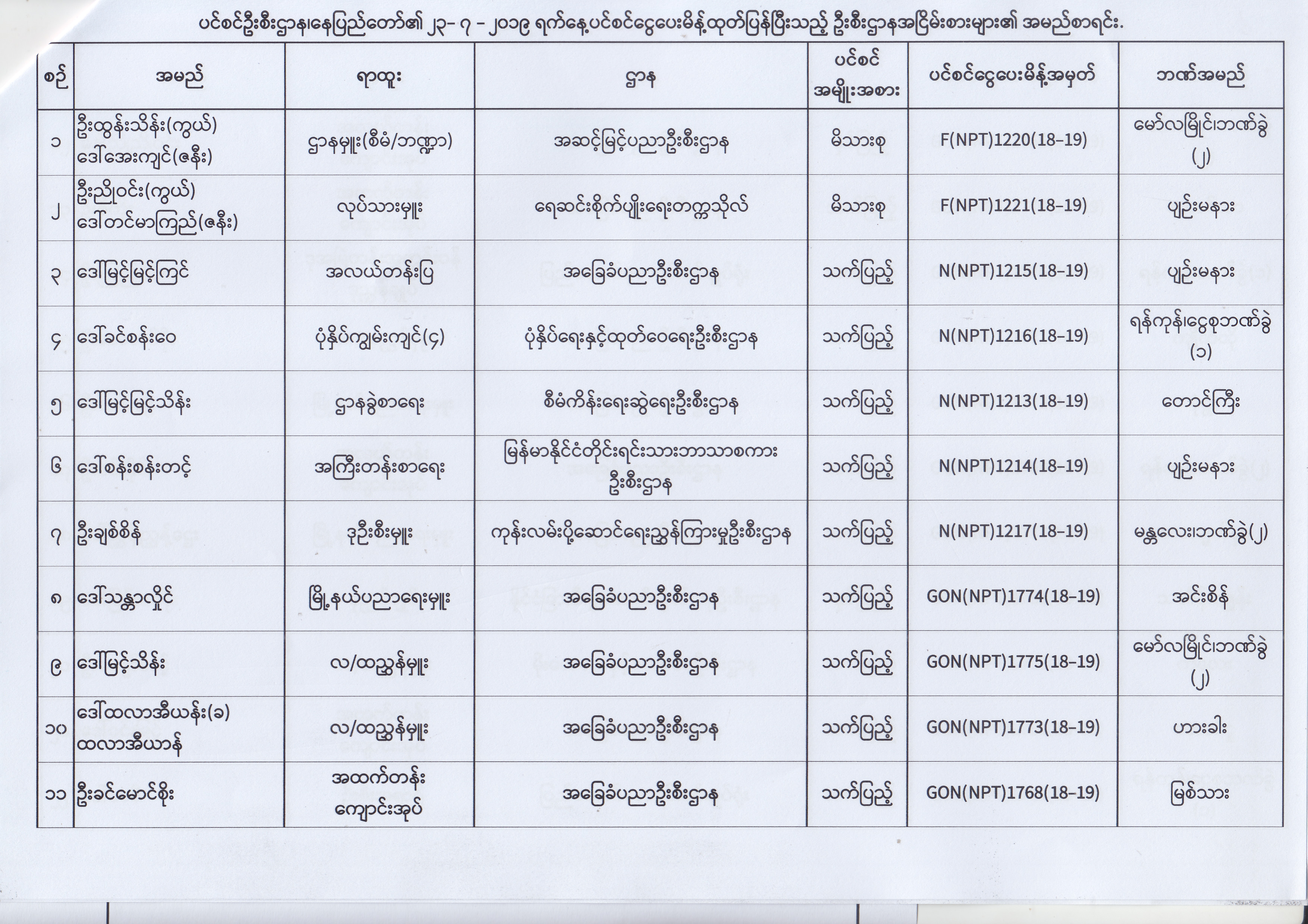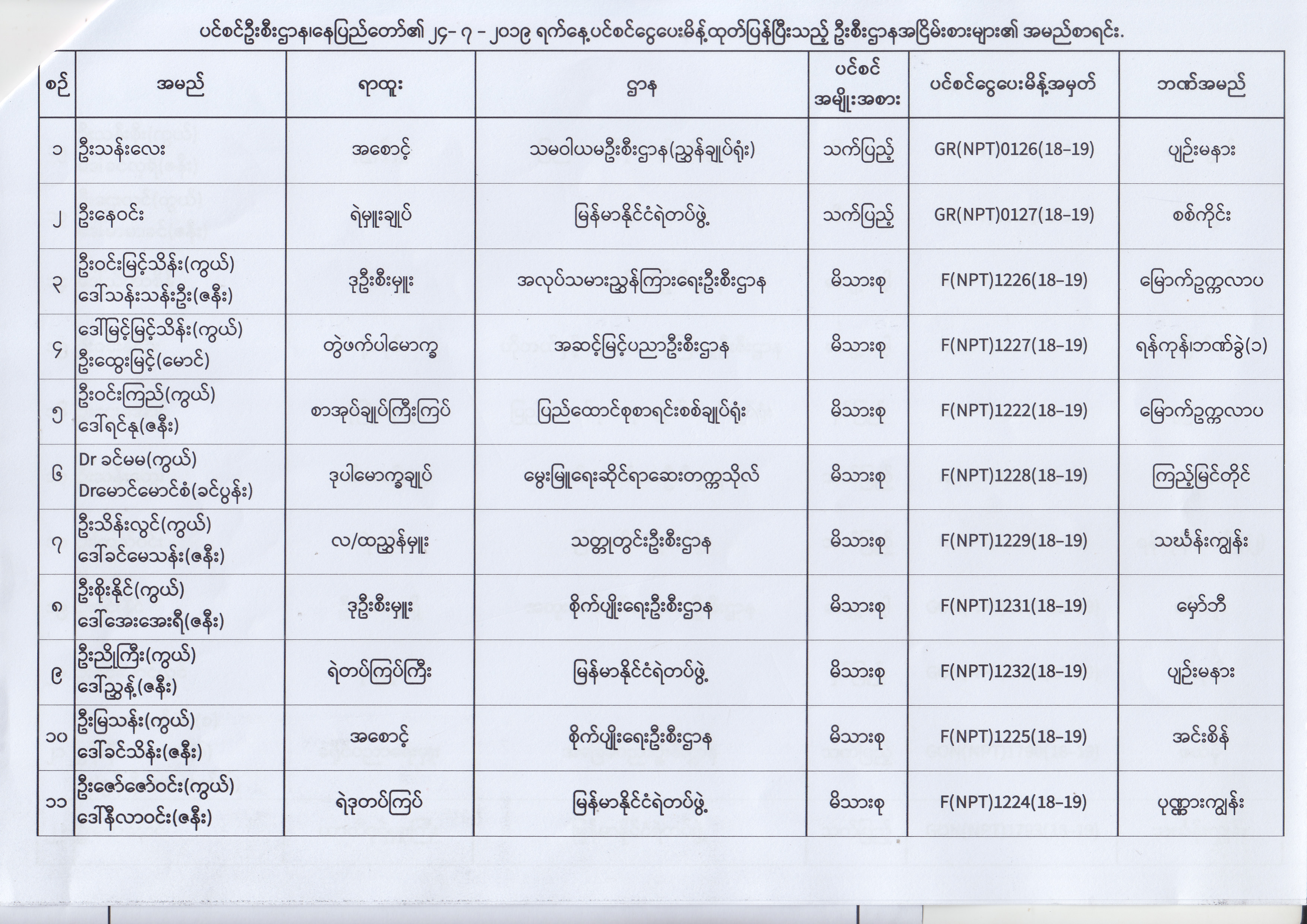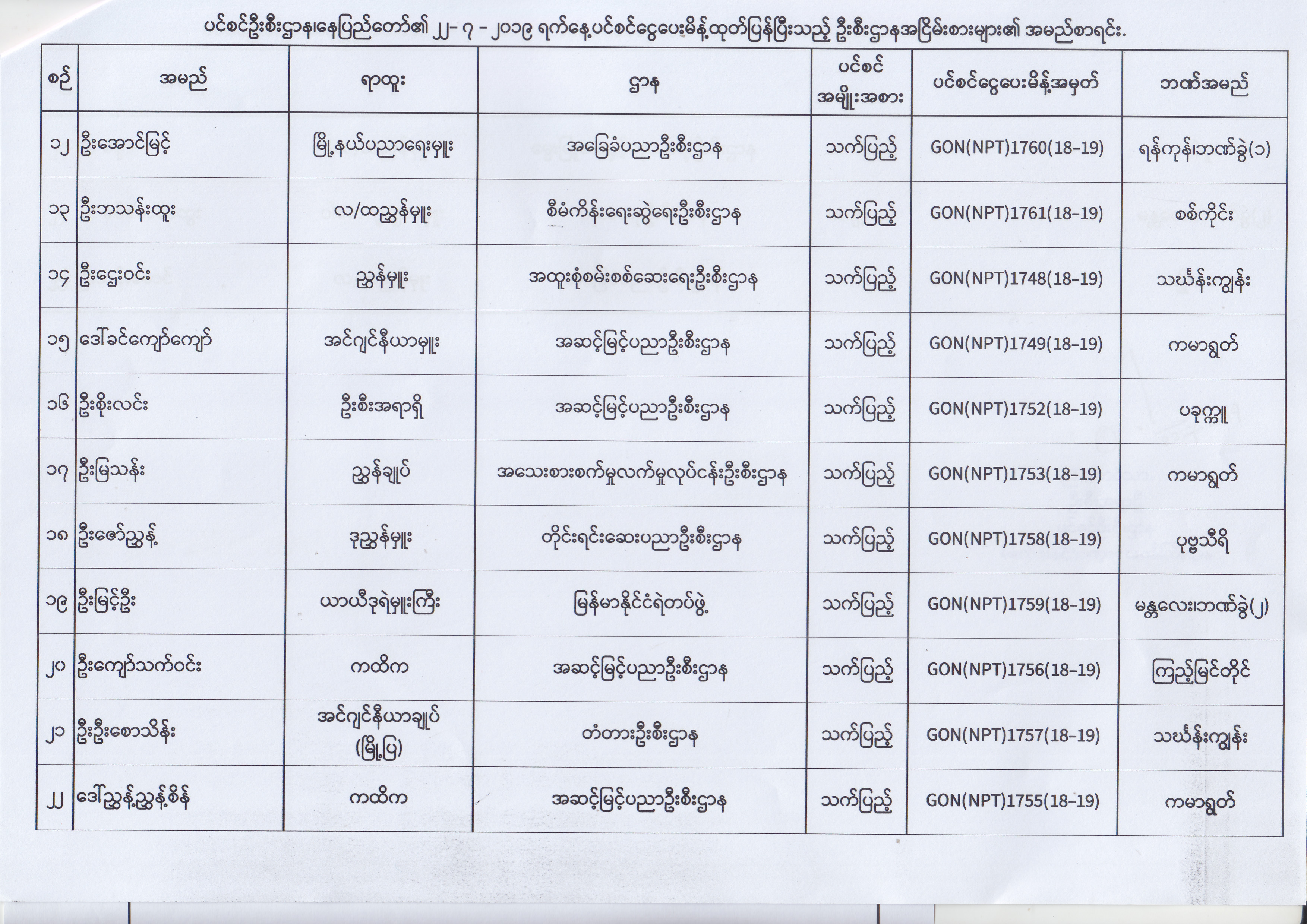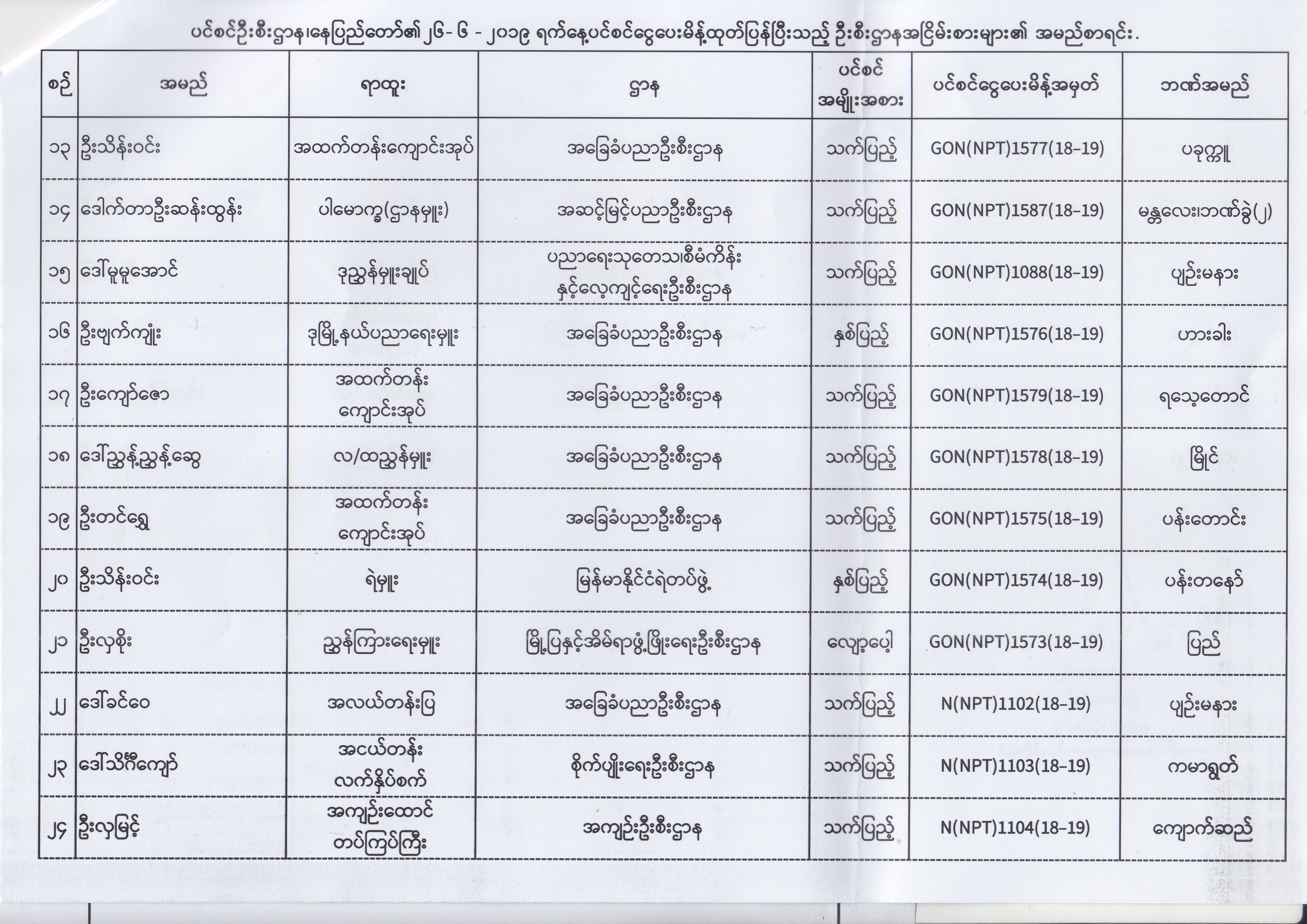ပင်စင်ဦးစီးဌာန၊ နေပြည်တော်၏ (၂၄.၆.၂၀၁၉) မှ (၆.၈.၂၀၁၉) ရက်နေ့အထိ ပင်စင်ငွေပေးမိန့်ထုတ်ပြန်ပြီးသည့် ဦးစီးဌာနအငြိမ်းစားများ၏ အမည်စာရင်း pension_editor Thu, 08/08/2019 - 11:59