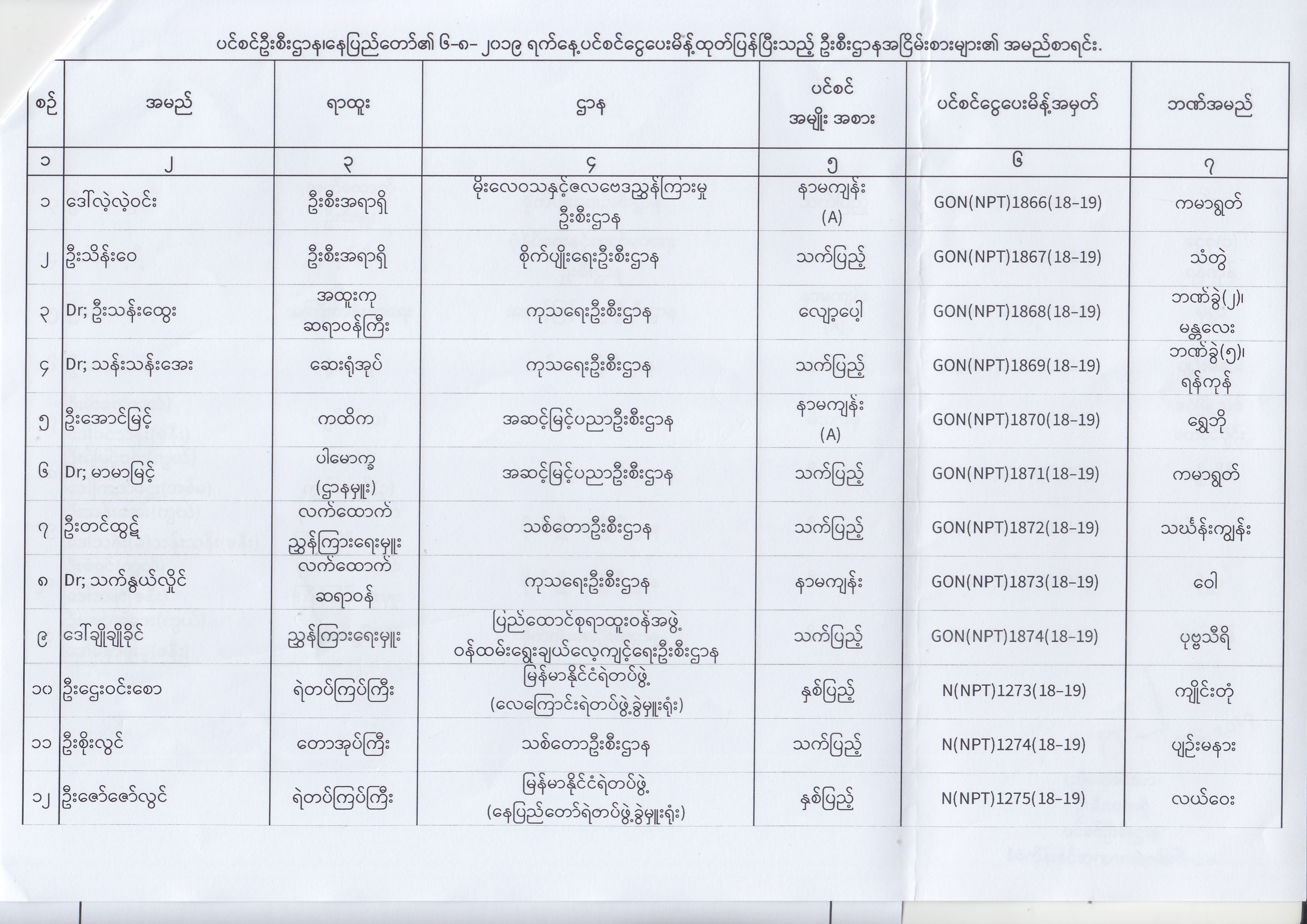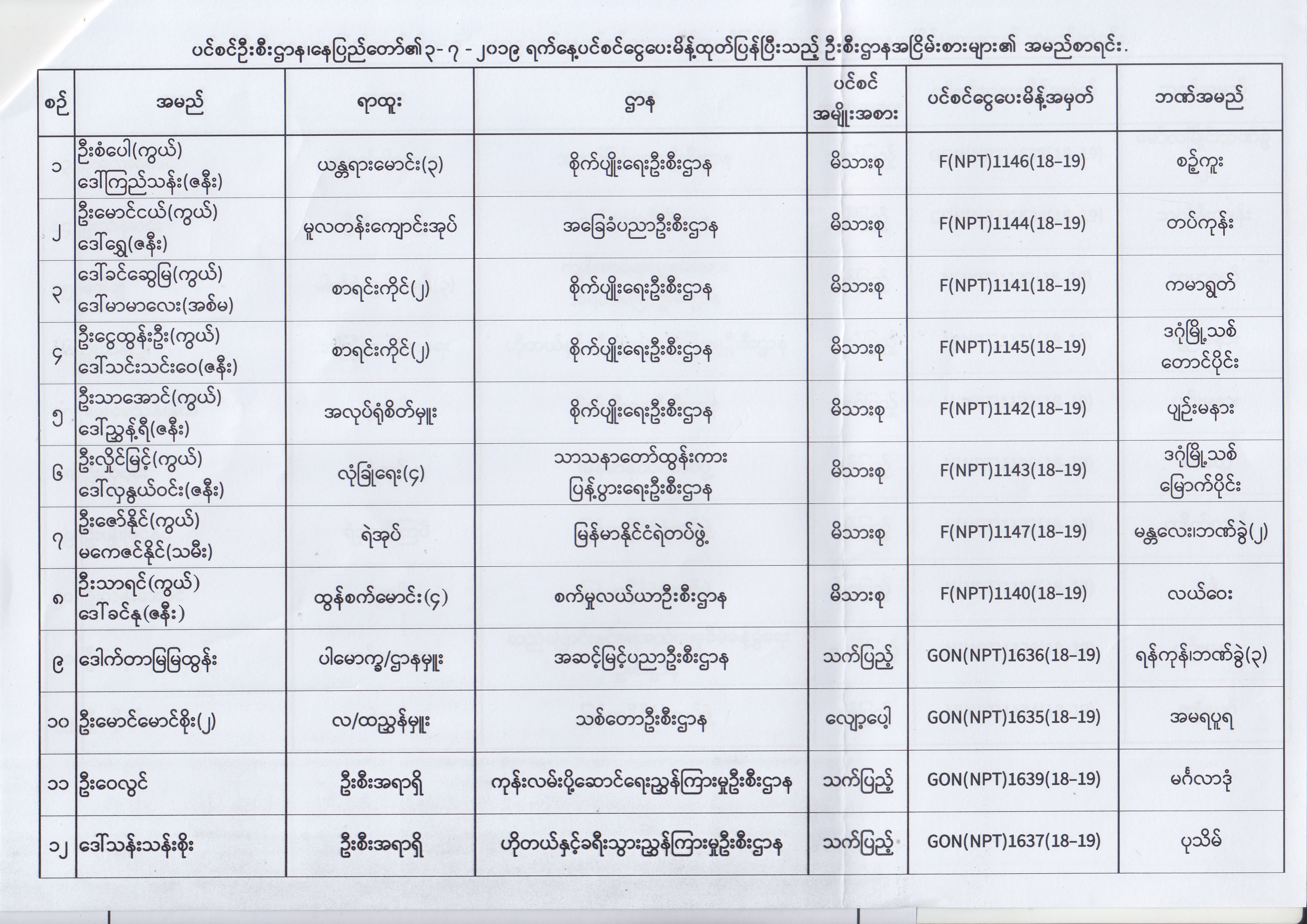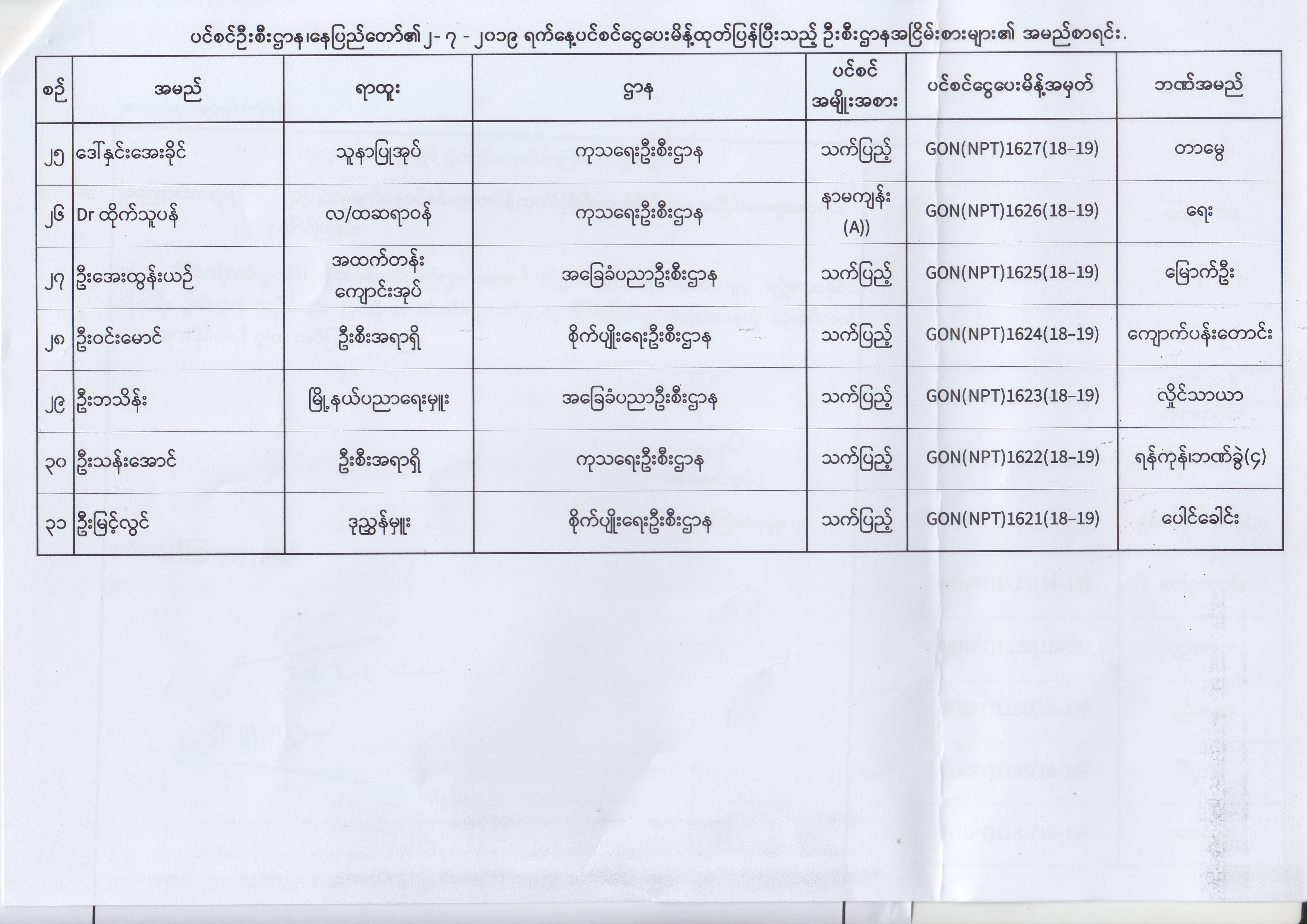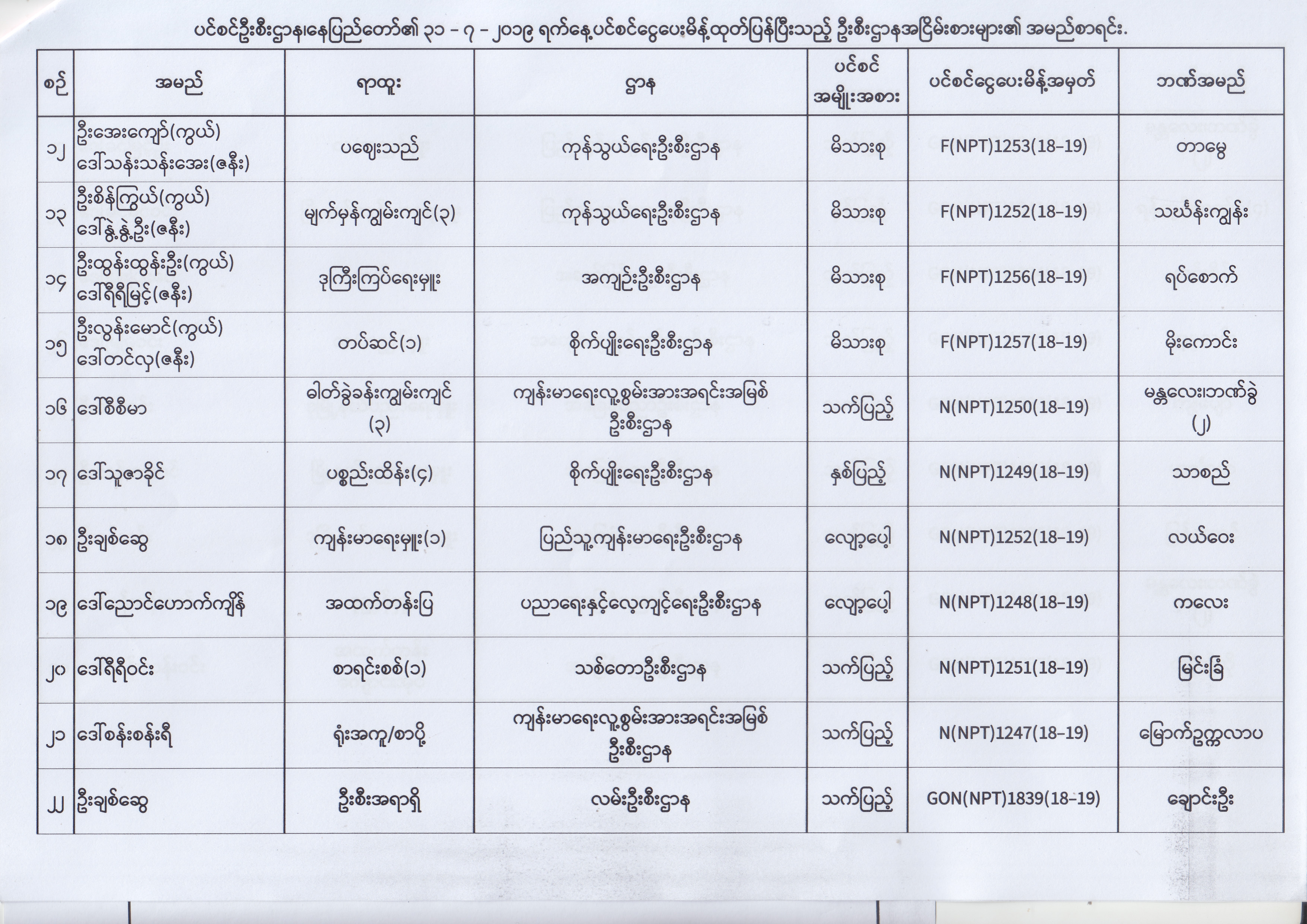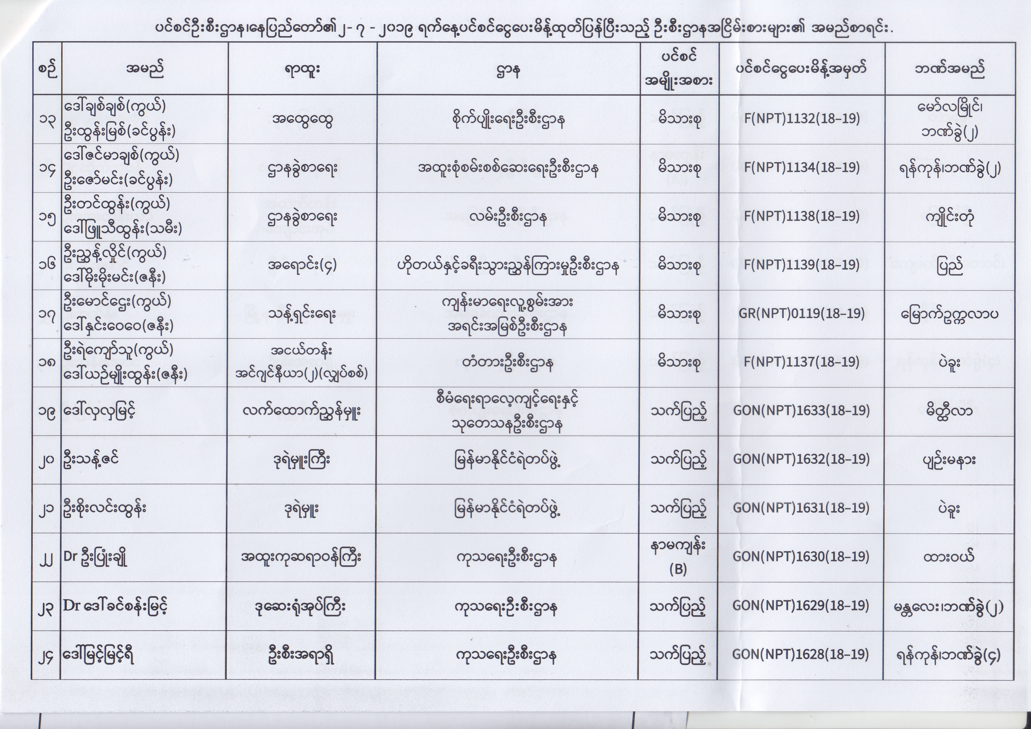 ပင်စင်ဦးစီးဌာန၊ နေပြည်တော်၏ (၂၄.၆.၂၀၁၉) မှ (၆.၈.၂၀၁၉) ရက်နေ့အထိ ပင်စင်ငွေပေးမိန့်ထုတ်ပြန်ပြီးသည့် ဦးစီးဌာနအငြိမ်းစားများ၏ အမည်စာရင်း pension_editor Thu, 08/08/2019 - 11:59