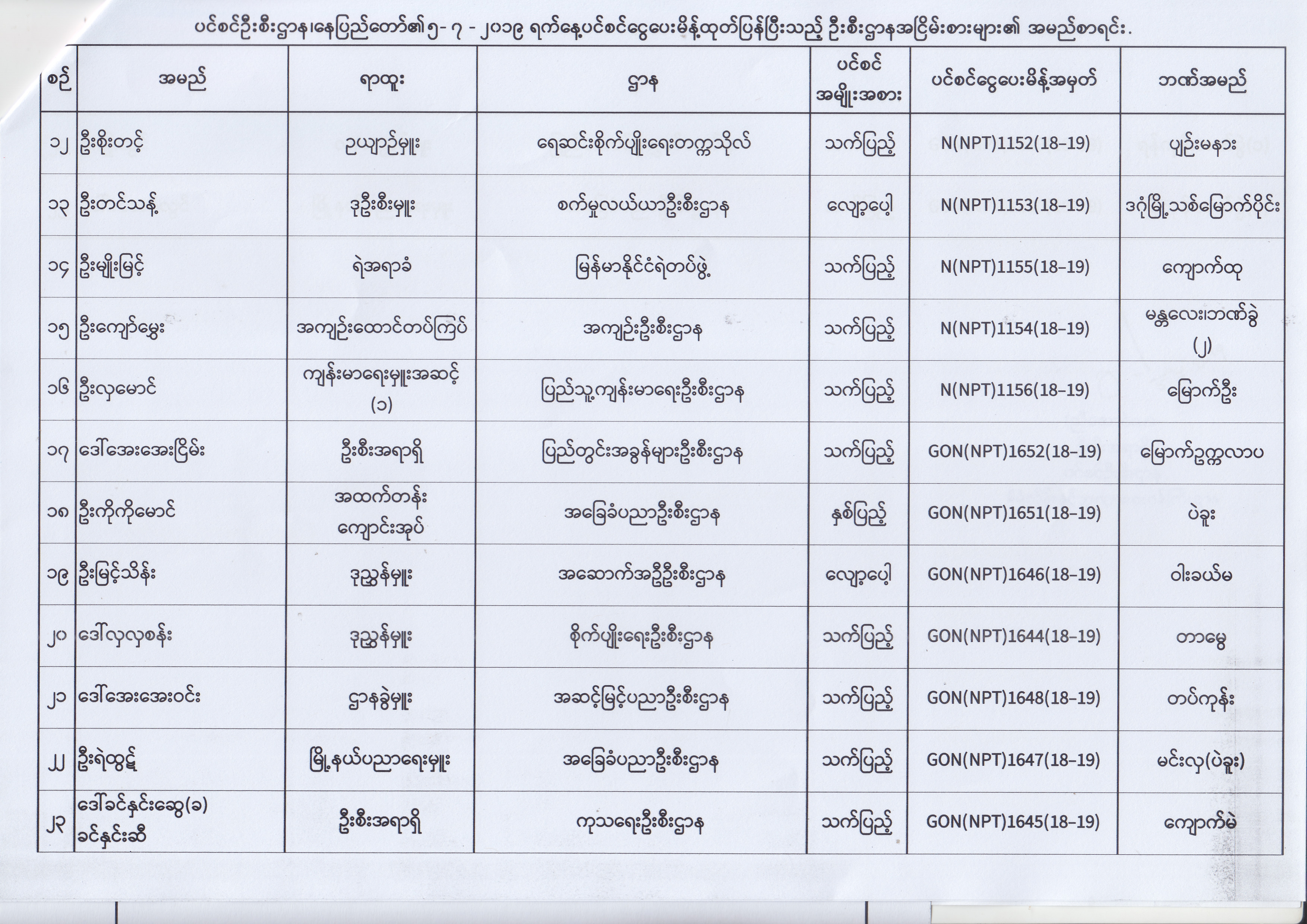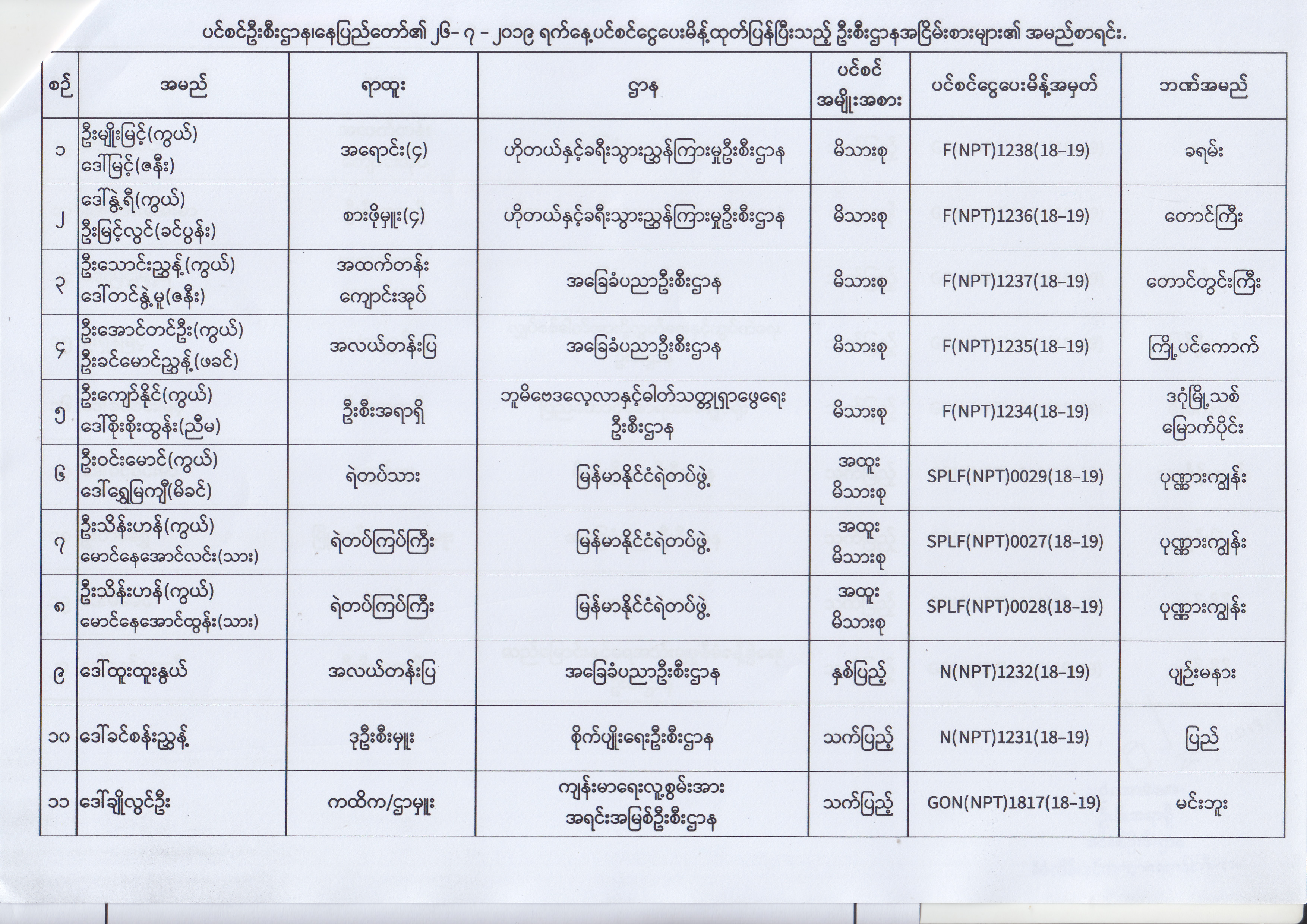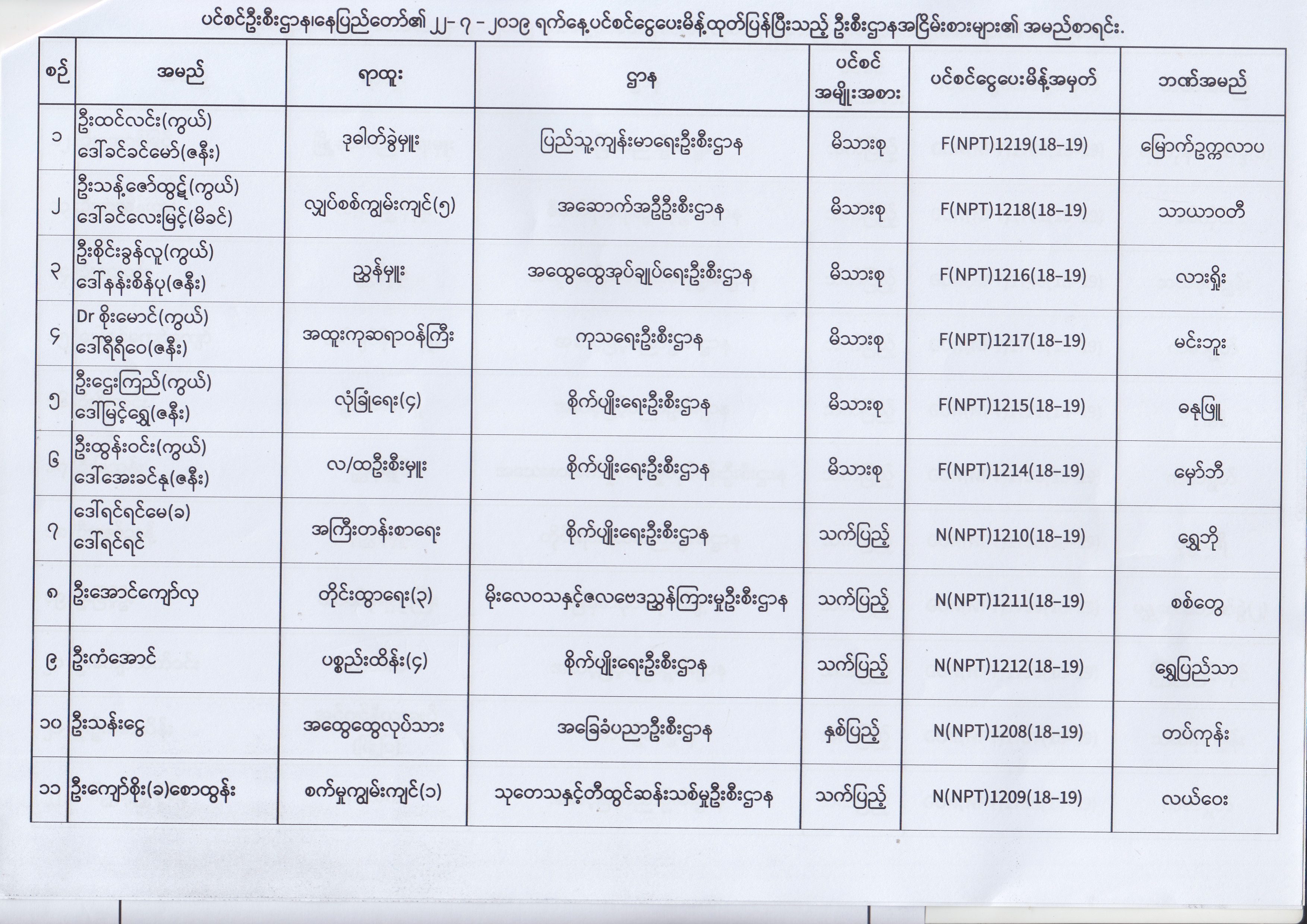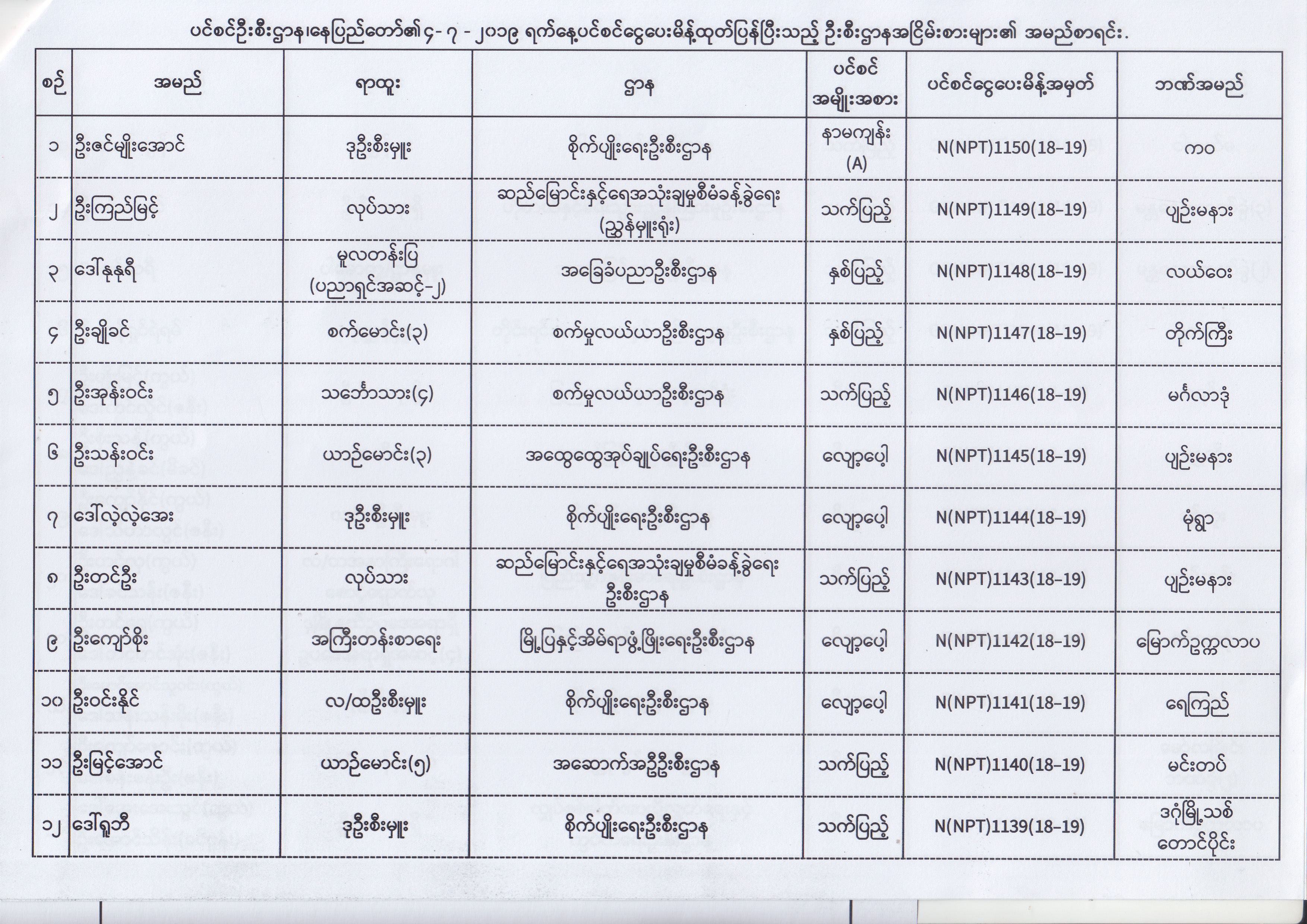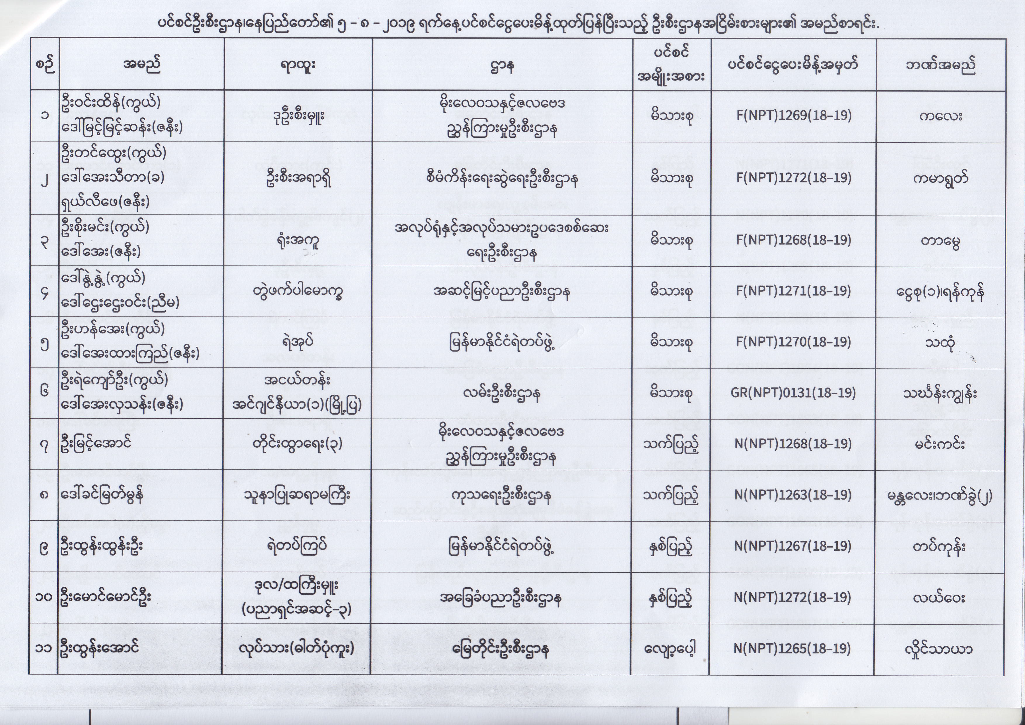 ပင်စင်ဦးစီးဌာန၊ နေပြည်တော်၏ (၂၄.၆.၂၀၁၉) မှ (၆.၈.၂၀၁၉) ရက်နေ့အထိ ပင်စင်ငွေပေးမိန့်ထုတ်ပြန်ပြီးသည့် ဦးစီးဌာနအငြိမ်းစားများ၏ အမည်စာရင်း pension_editor Thu, 08/08/2019 - 11:59