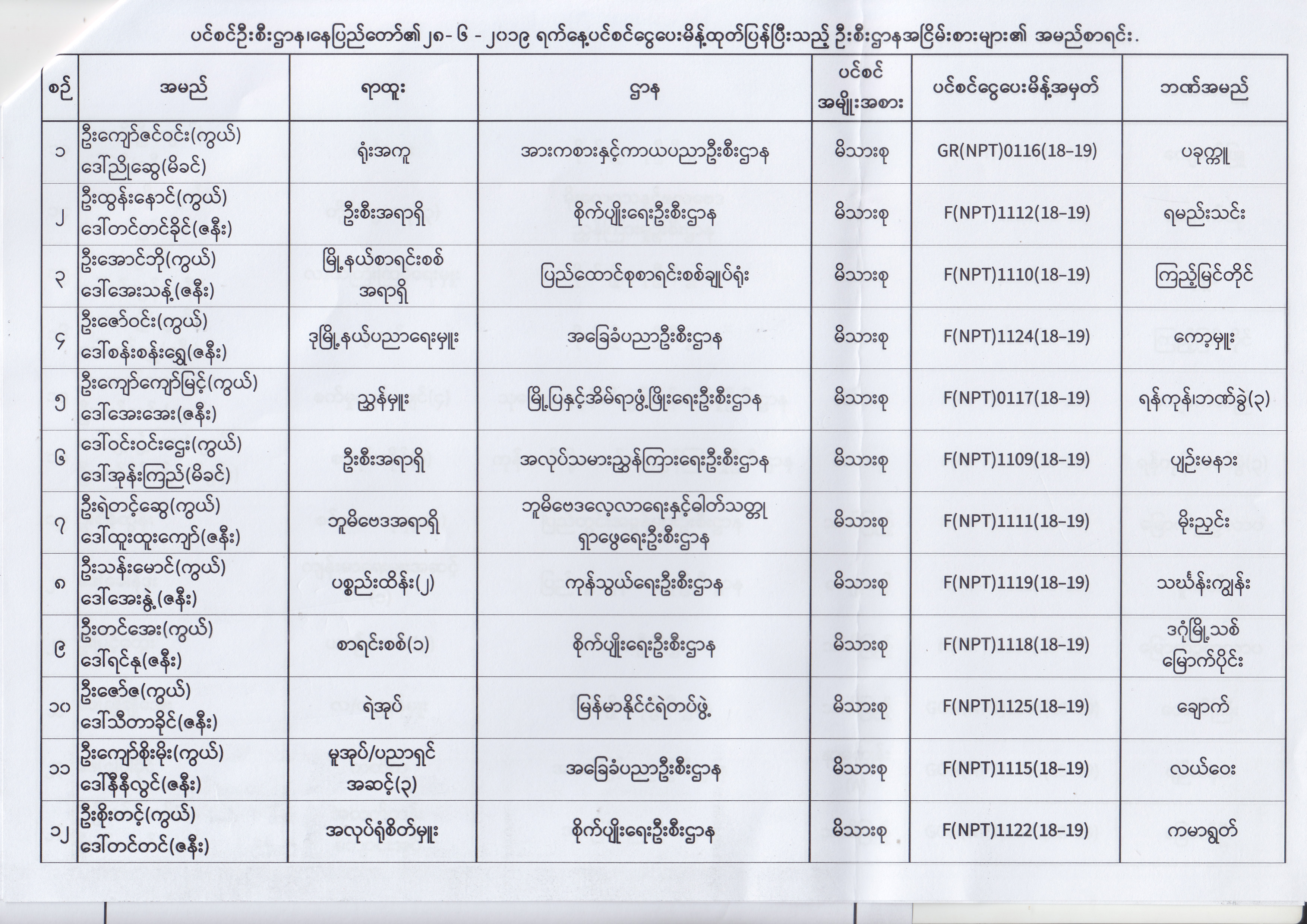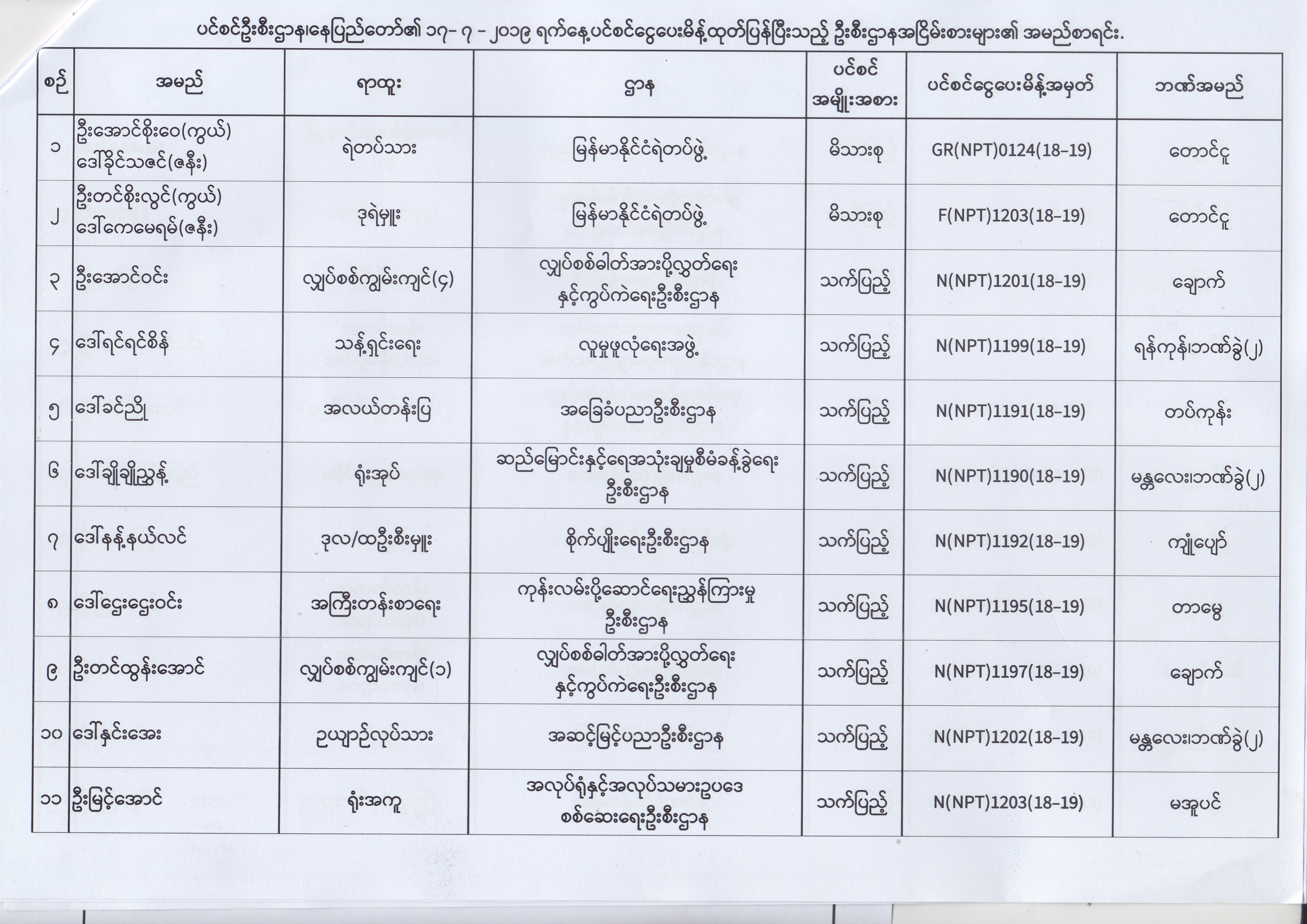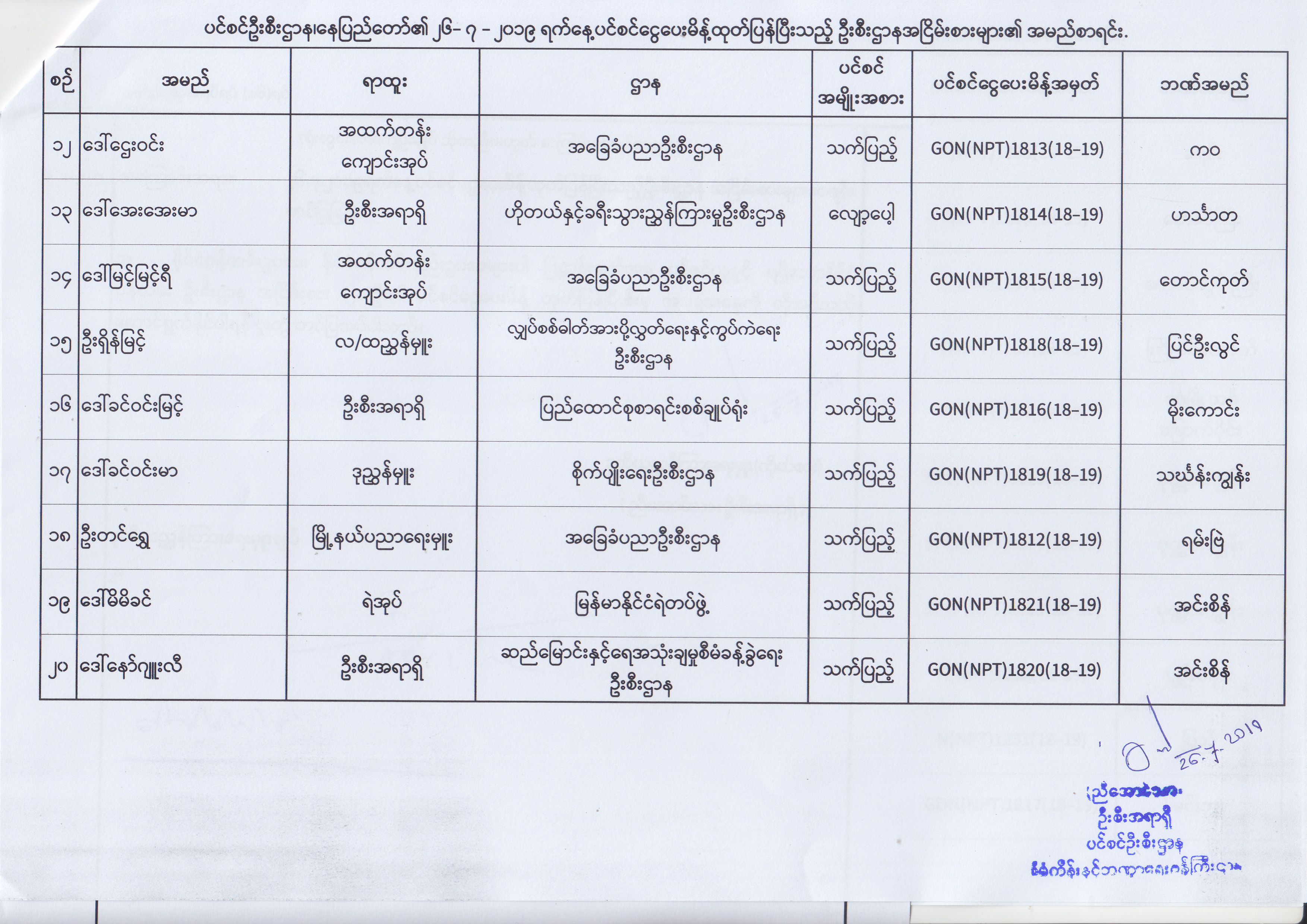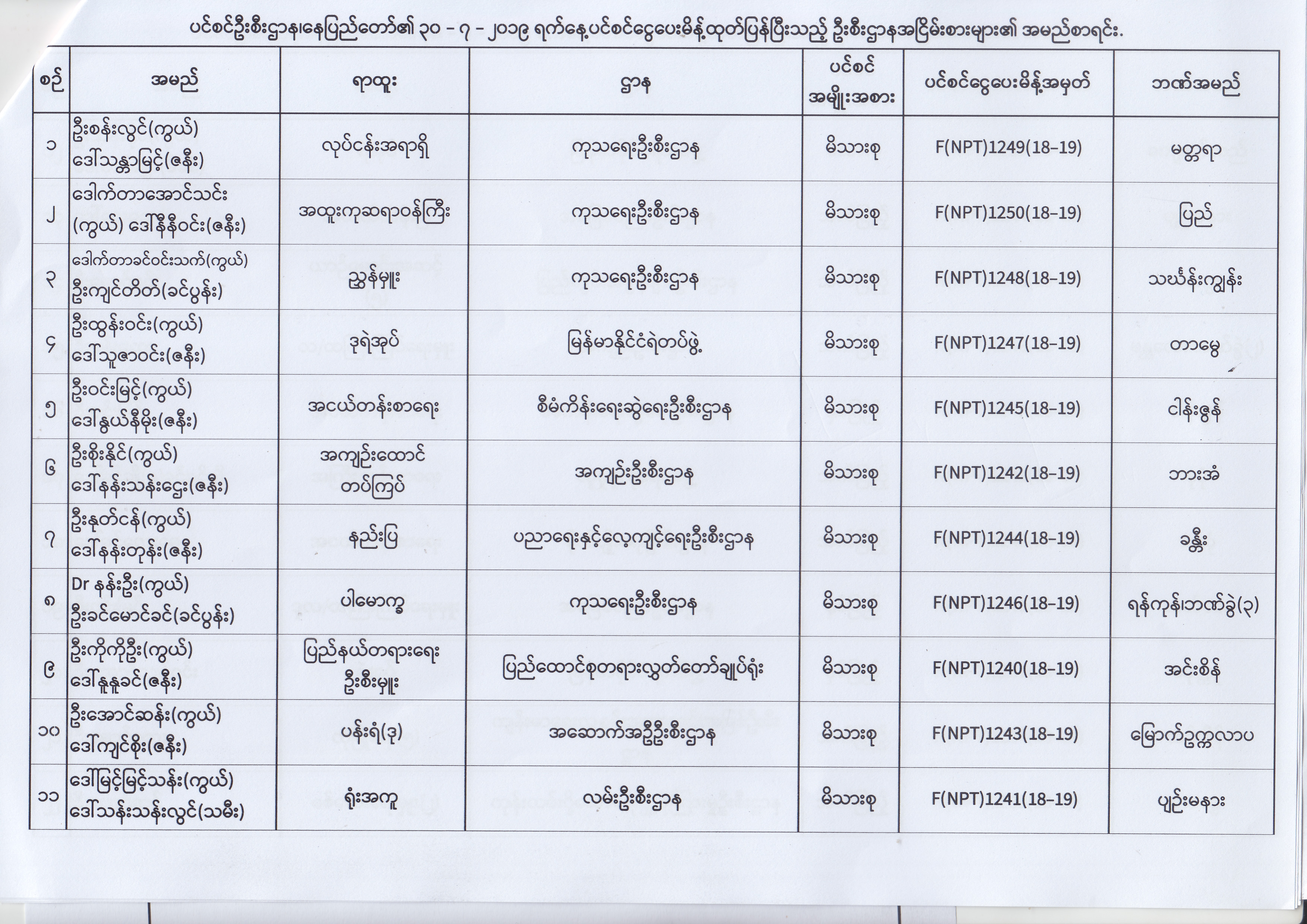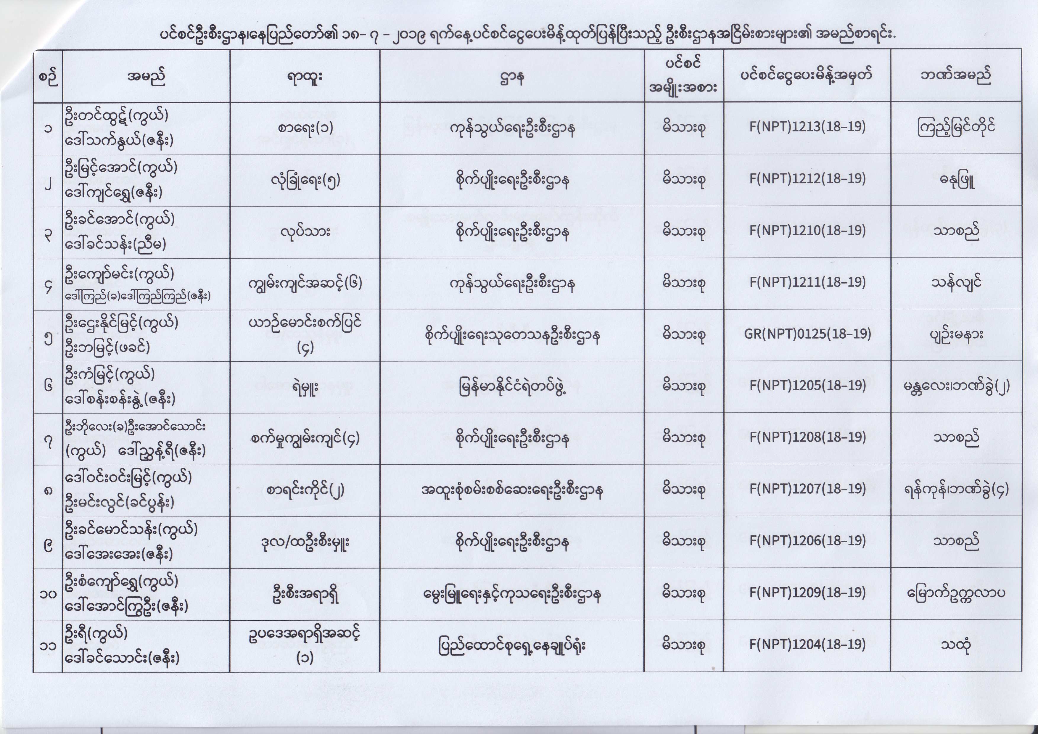 ပင်စင်ဦးစီးဌာန၊ နေပြည်တော်၏ (၂၄.၆.၂၀၁၉) မှ (၆.၈.၂၀၁၉) ရက်နေ့အထိ ပင်စင်ငွေပေးမိန့်ထုတ်ပြန်ပြီးသည့် ဦးစီးဌာနအငြိမ်းစားများ၏ အမည်စာရင်း pension_editor Thu, 08/08/2019 - 11:59