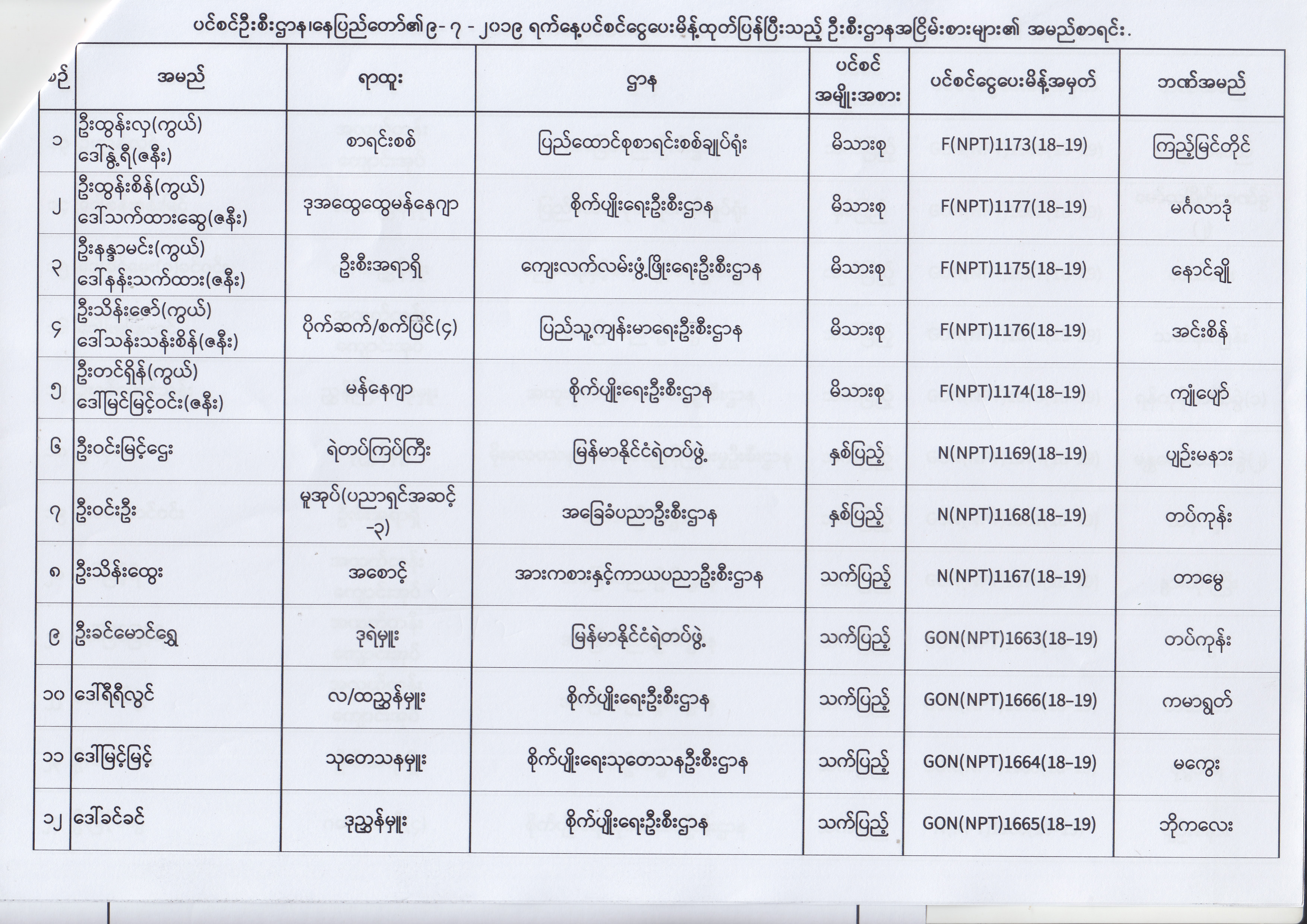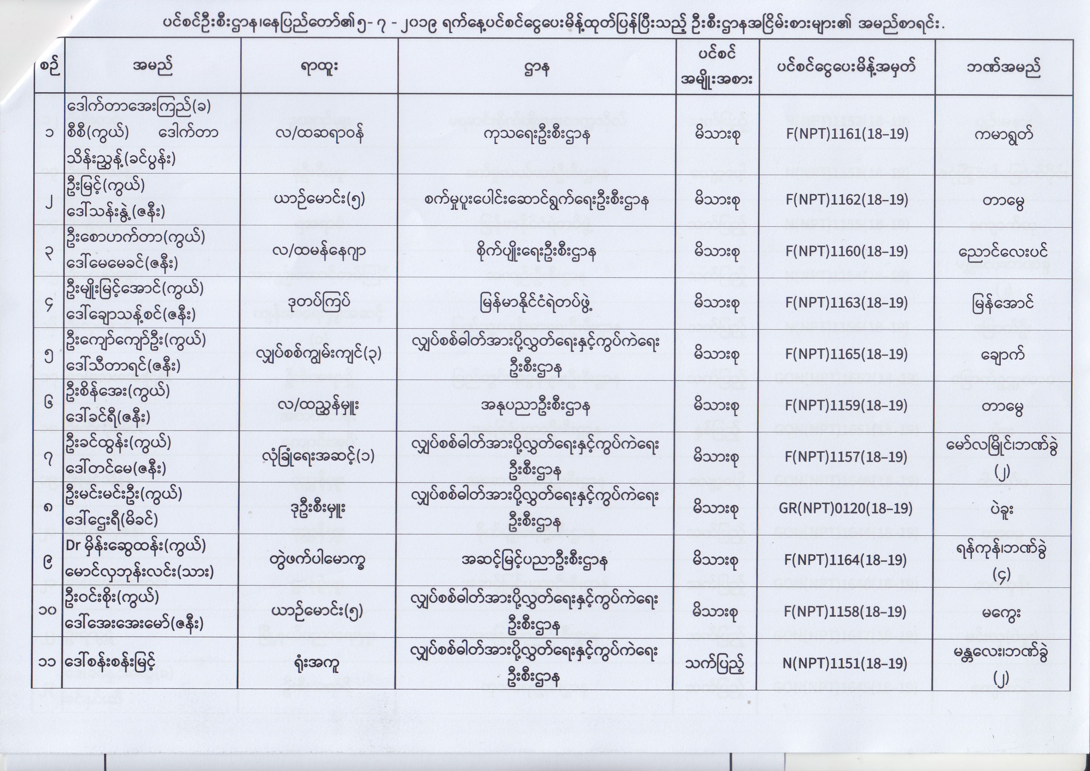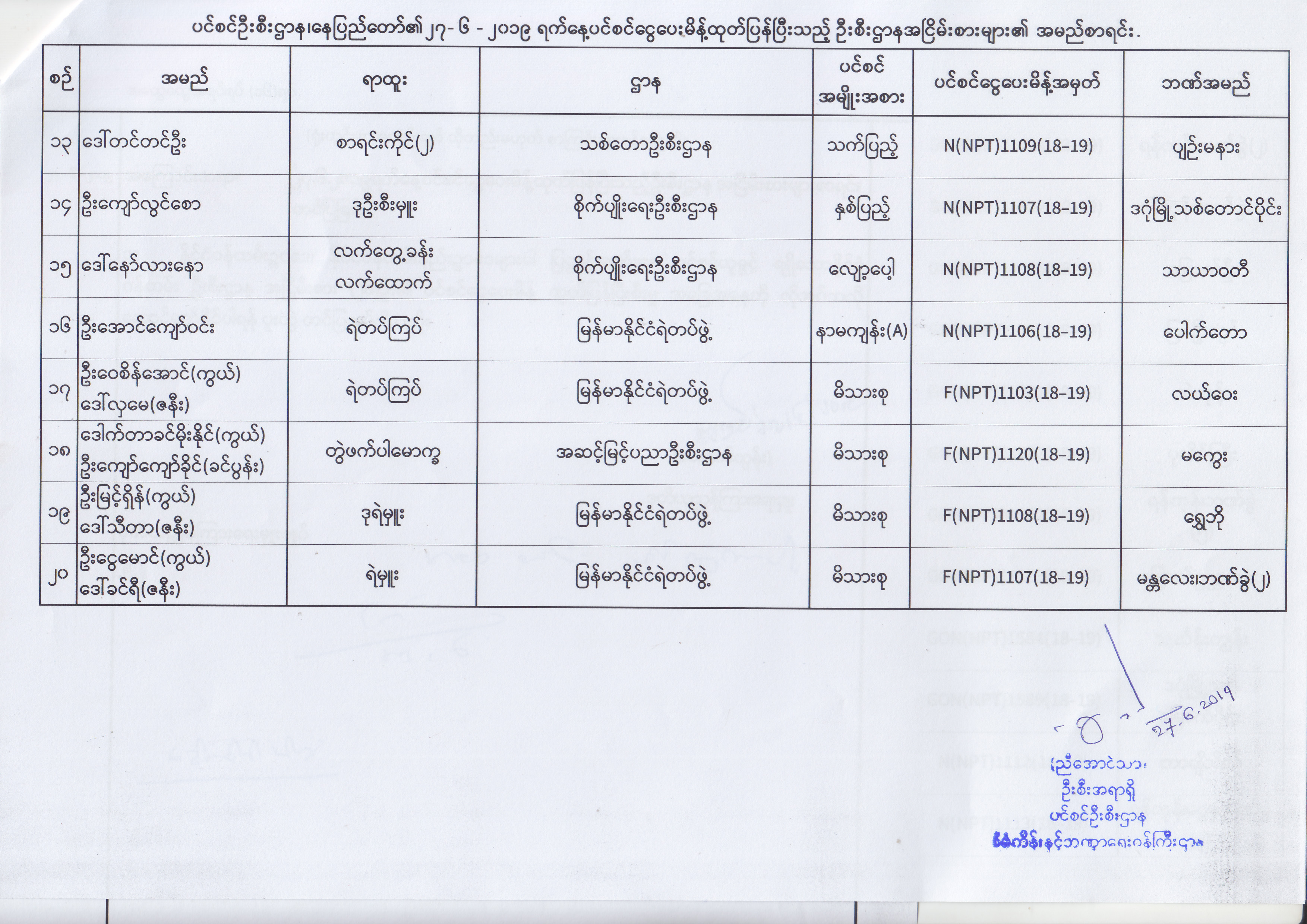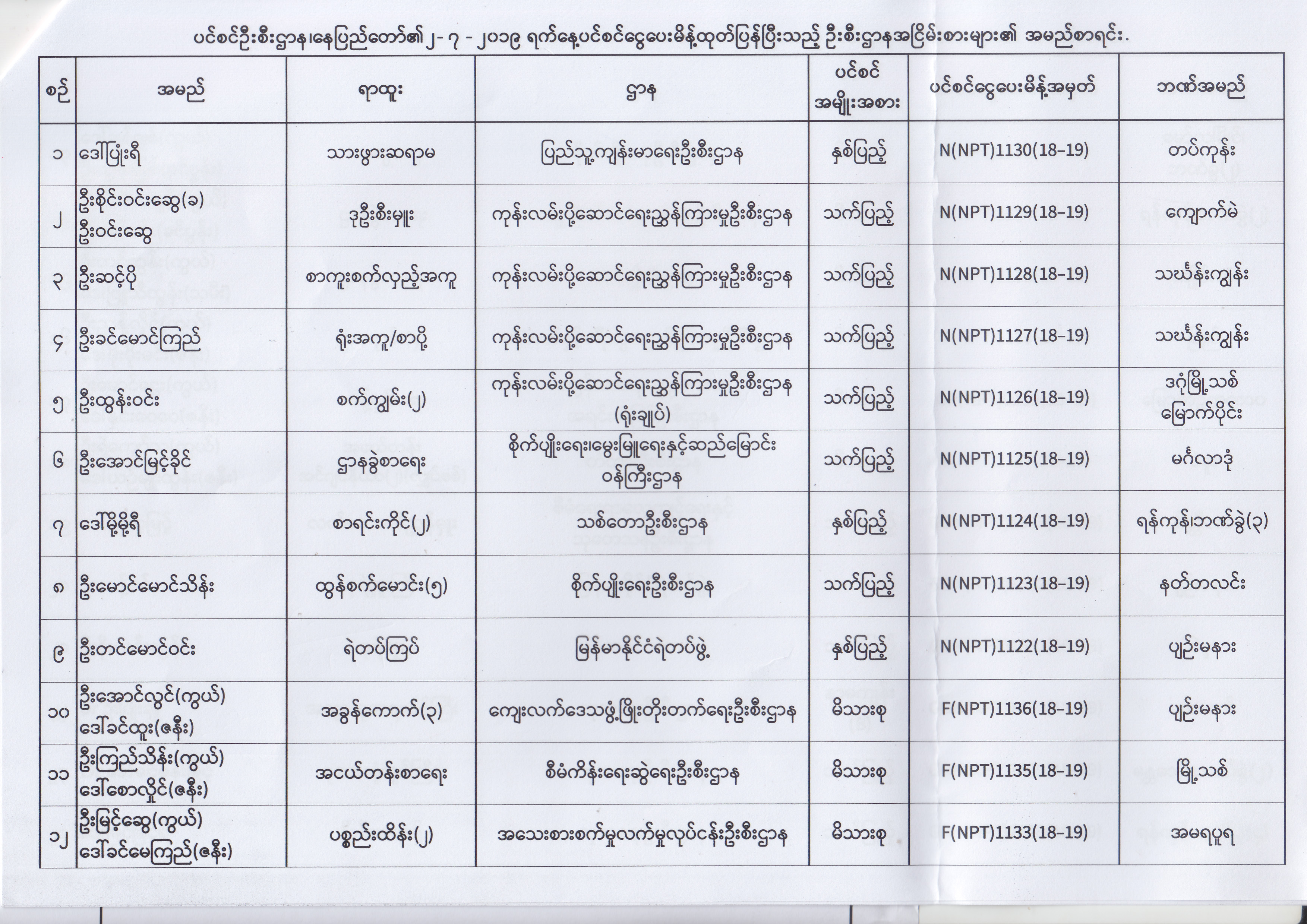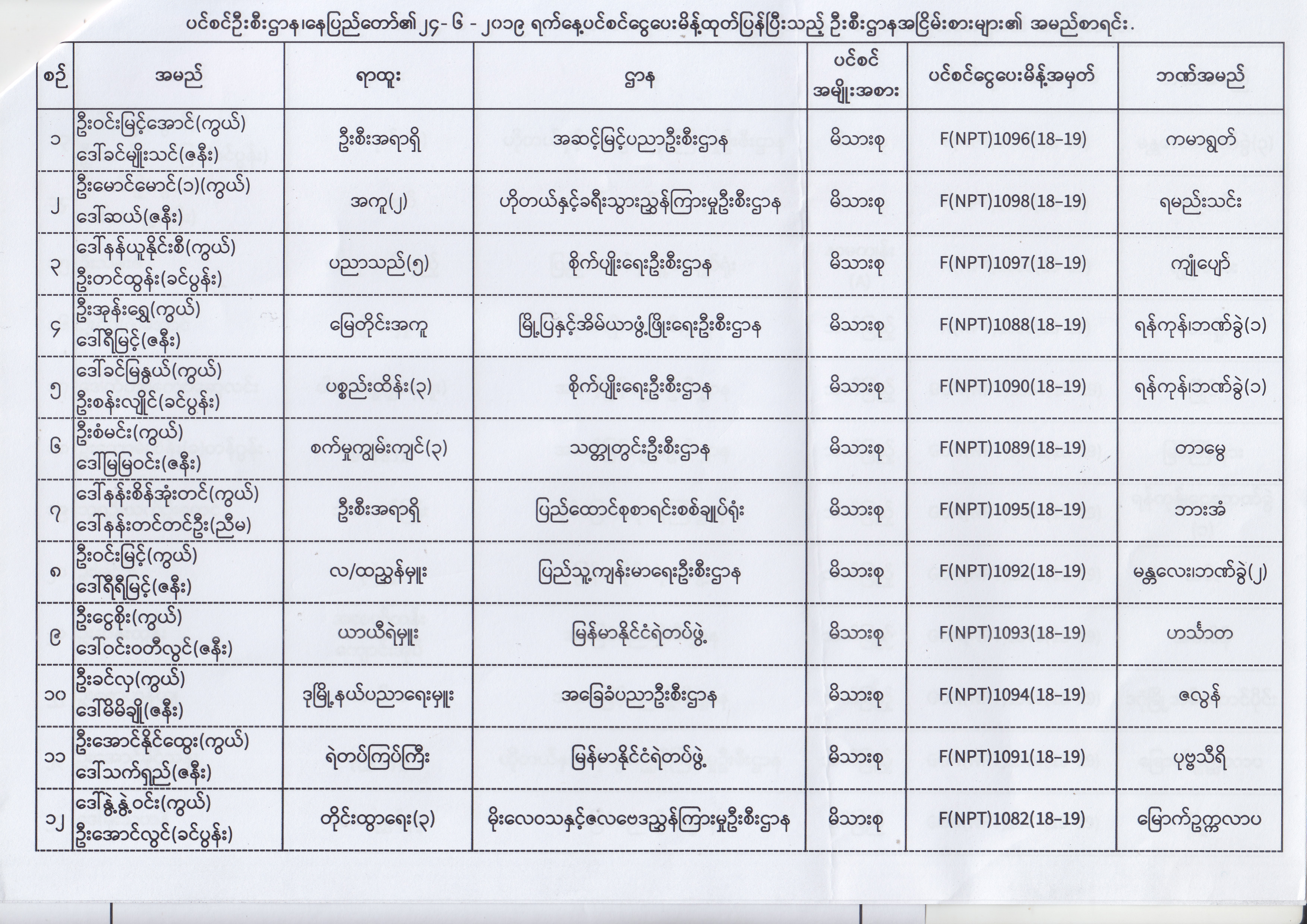 ပင်စင်ဦးစီးဌာန၊ နေပြည်တော်၏ (၂၄.၆.၂၀၁၉) မှ (၆.၈.၂၀၁၉) ရက်နေ့အထိ ပင်စင်ငွေပေးမိန့်ထုတ်ပြန်ပြီးသည့် ဦးစီးဌာနအငြိမ်းစားများ၏ အမည်စာရင်း pension_editor Thu, 08/08/2019 - 11:59