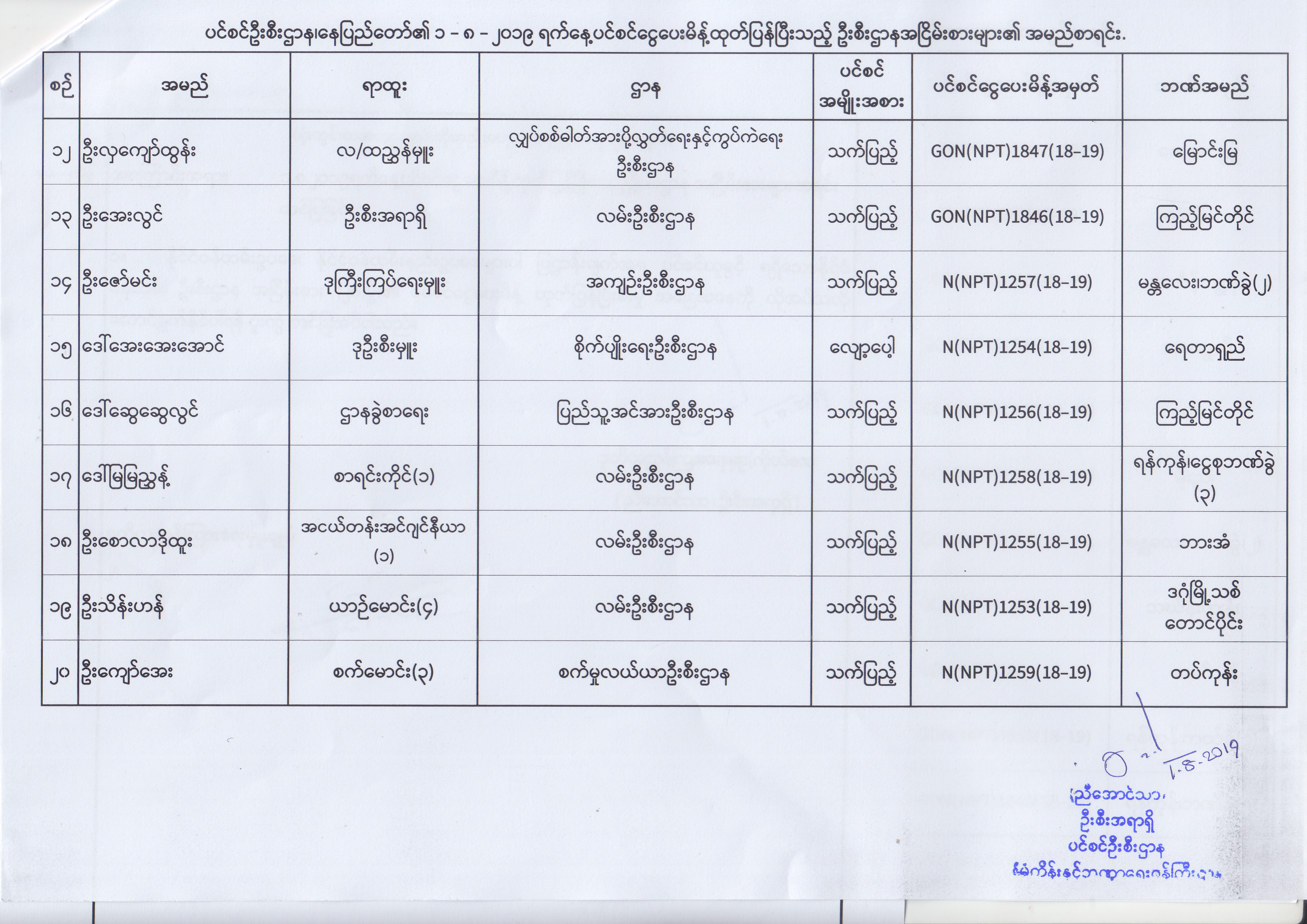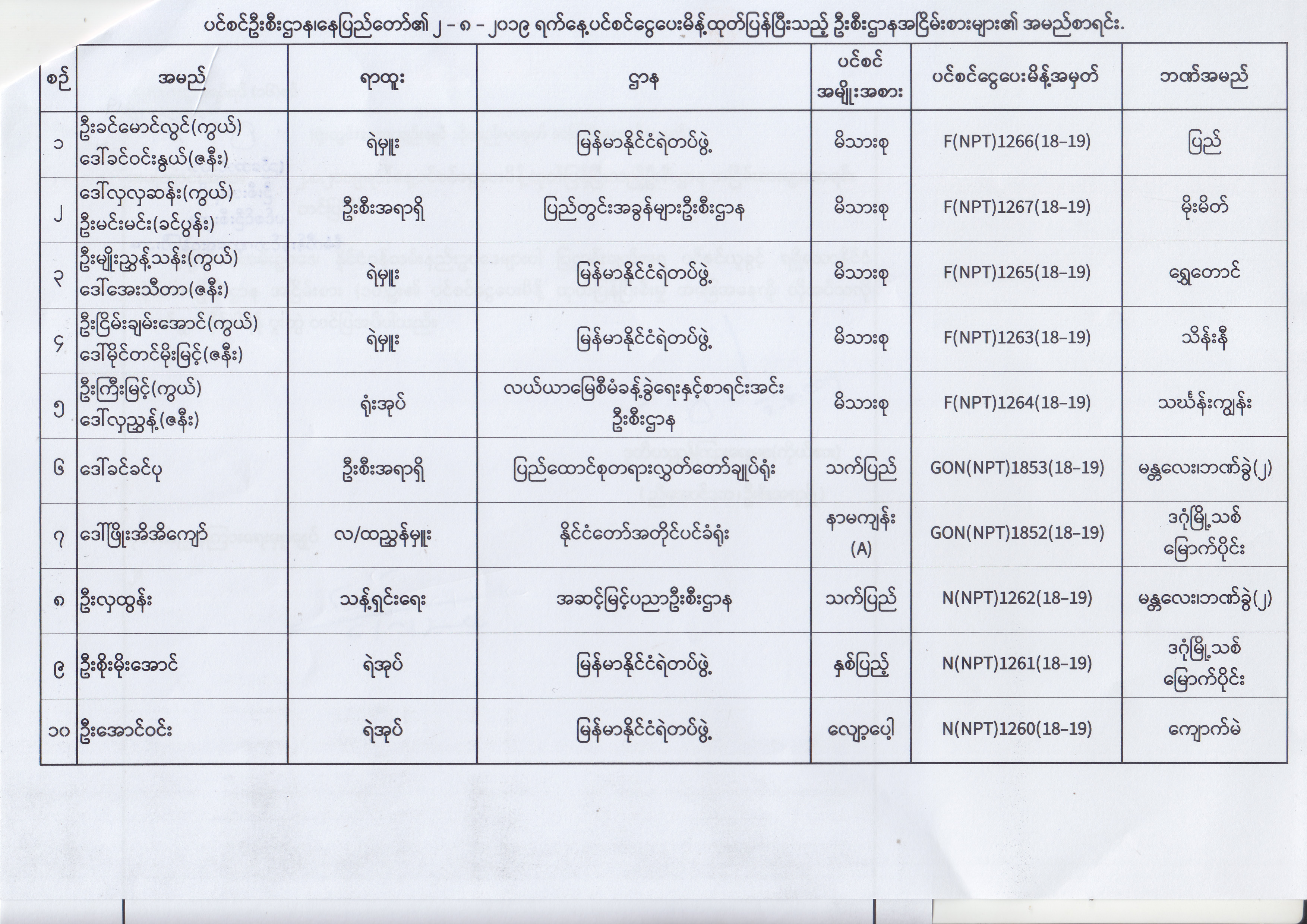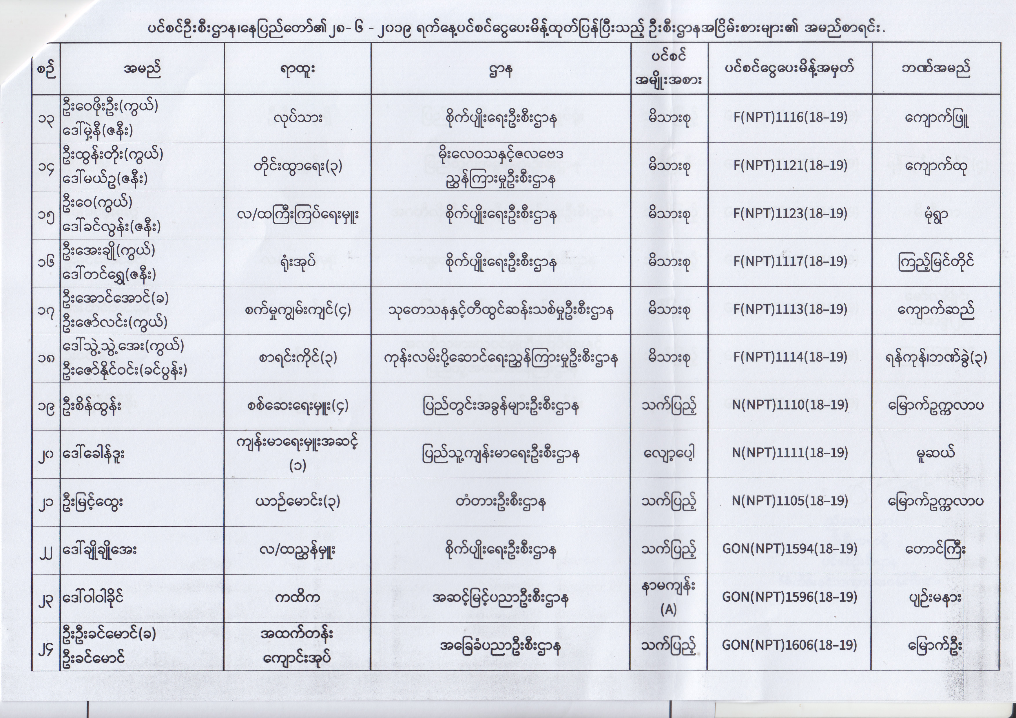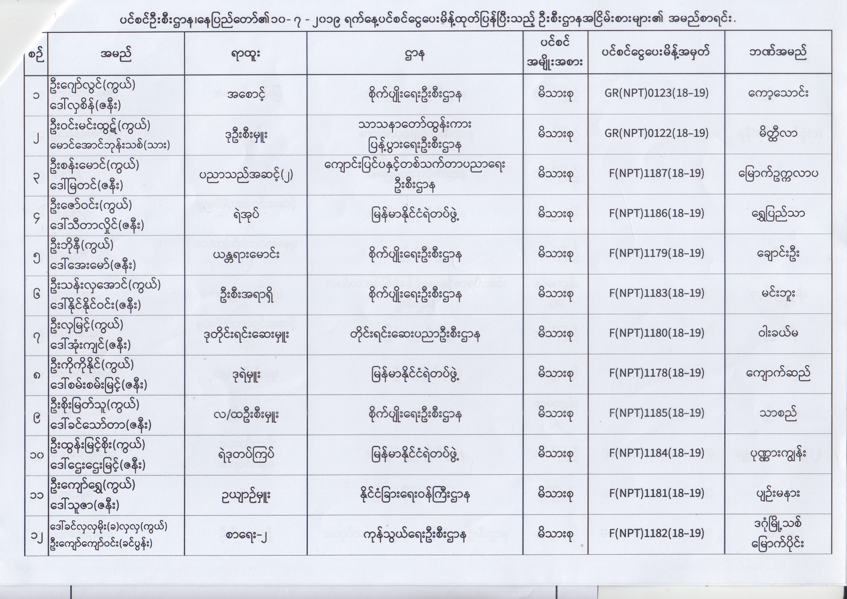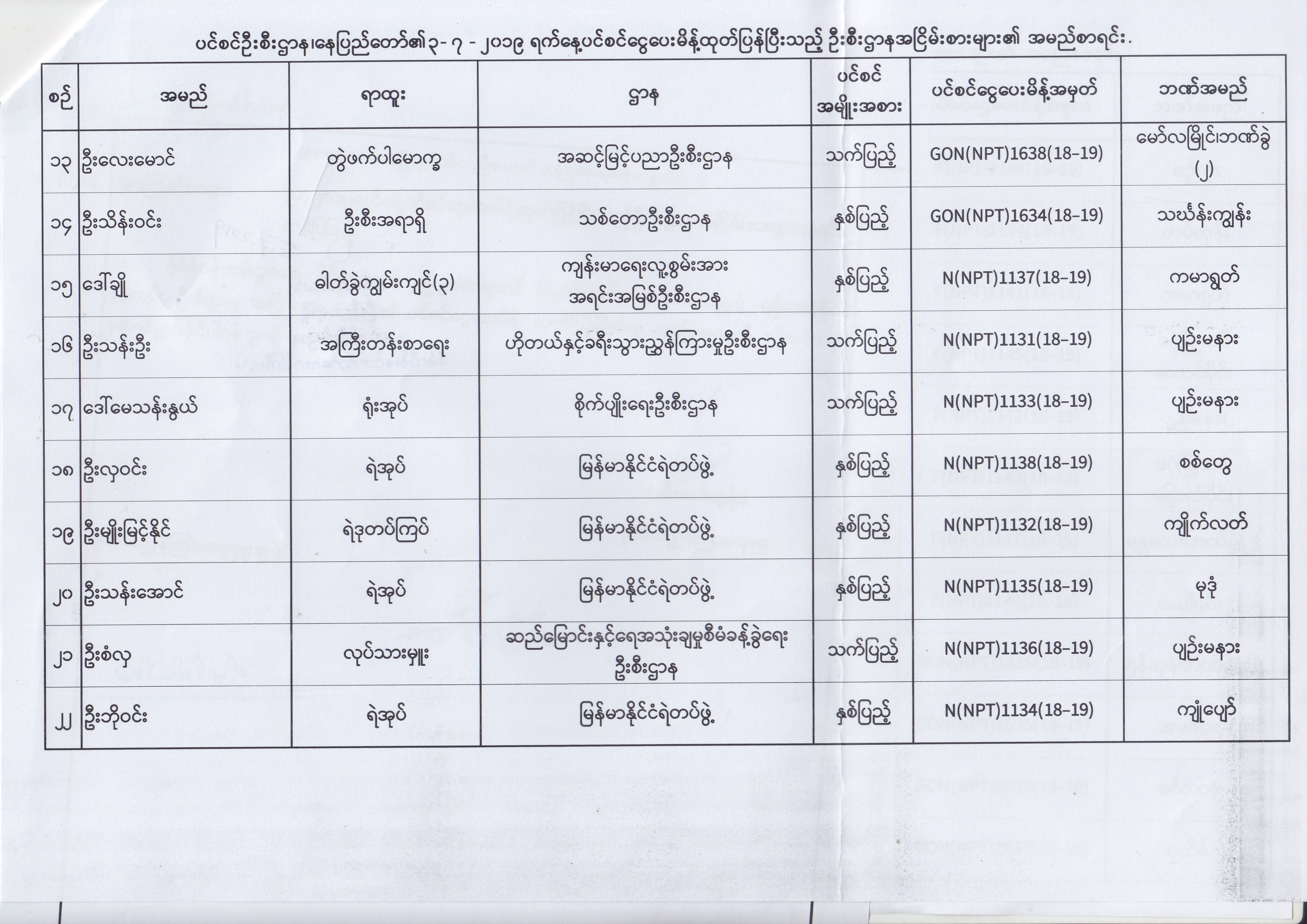 ပင်စင်ဦးစီးဌာန၊ နေပြည်တော်၏ (၂၄.၆.၂၀၁၉) မှ (၆.၈.၂၀၁၉) ရက်နေ့အထိ ပင်စင်ငွေပေးမိန့်ထုတ်ပြန်ပြီးသည့် ဦးစီးဌာနအငြိမ်းစားများ၏ အမည်စာရင်း pension_editor Thu, 08/08/2019 - 11:59