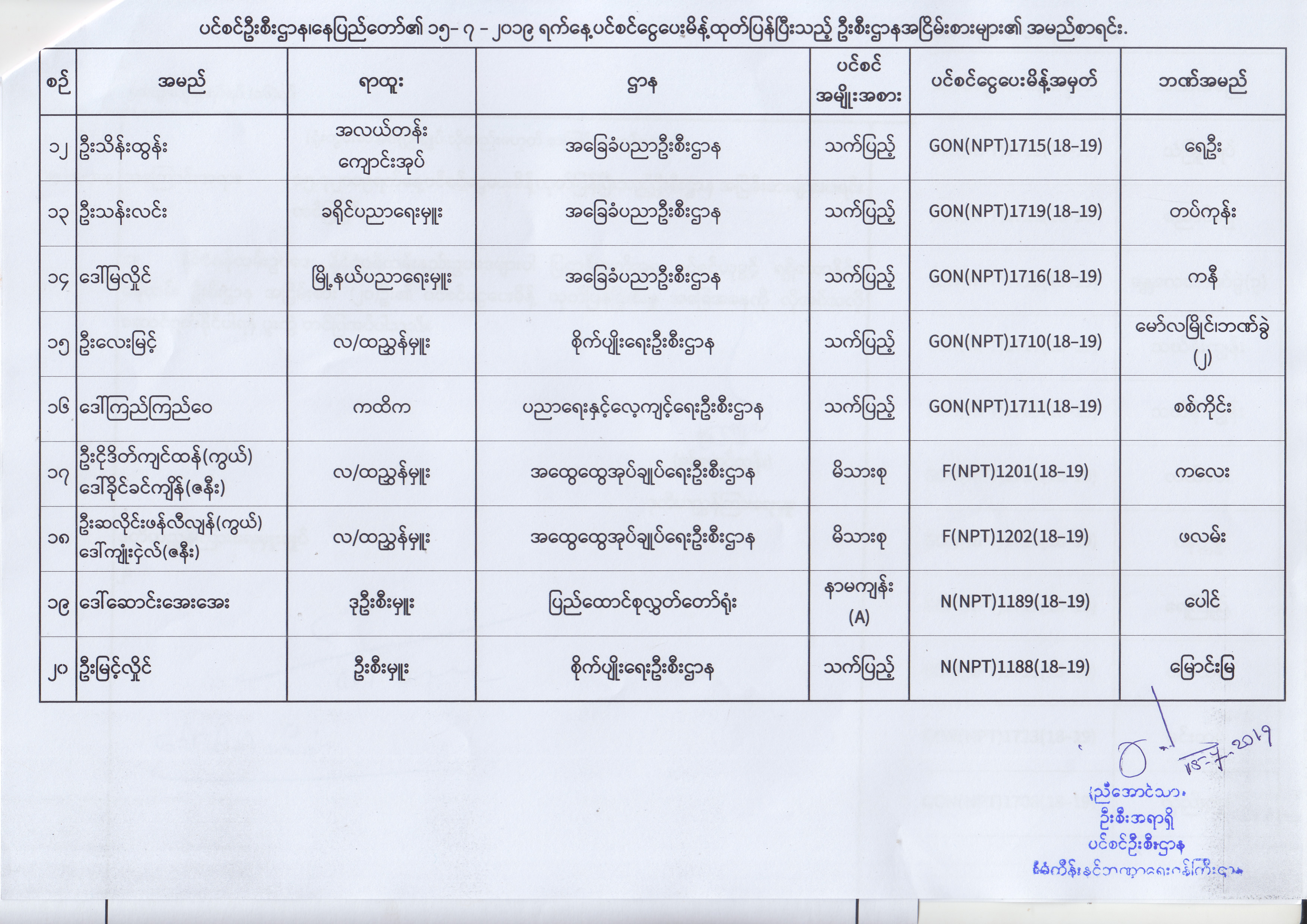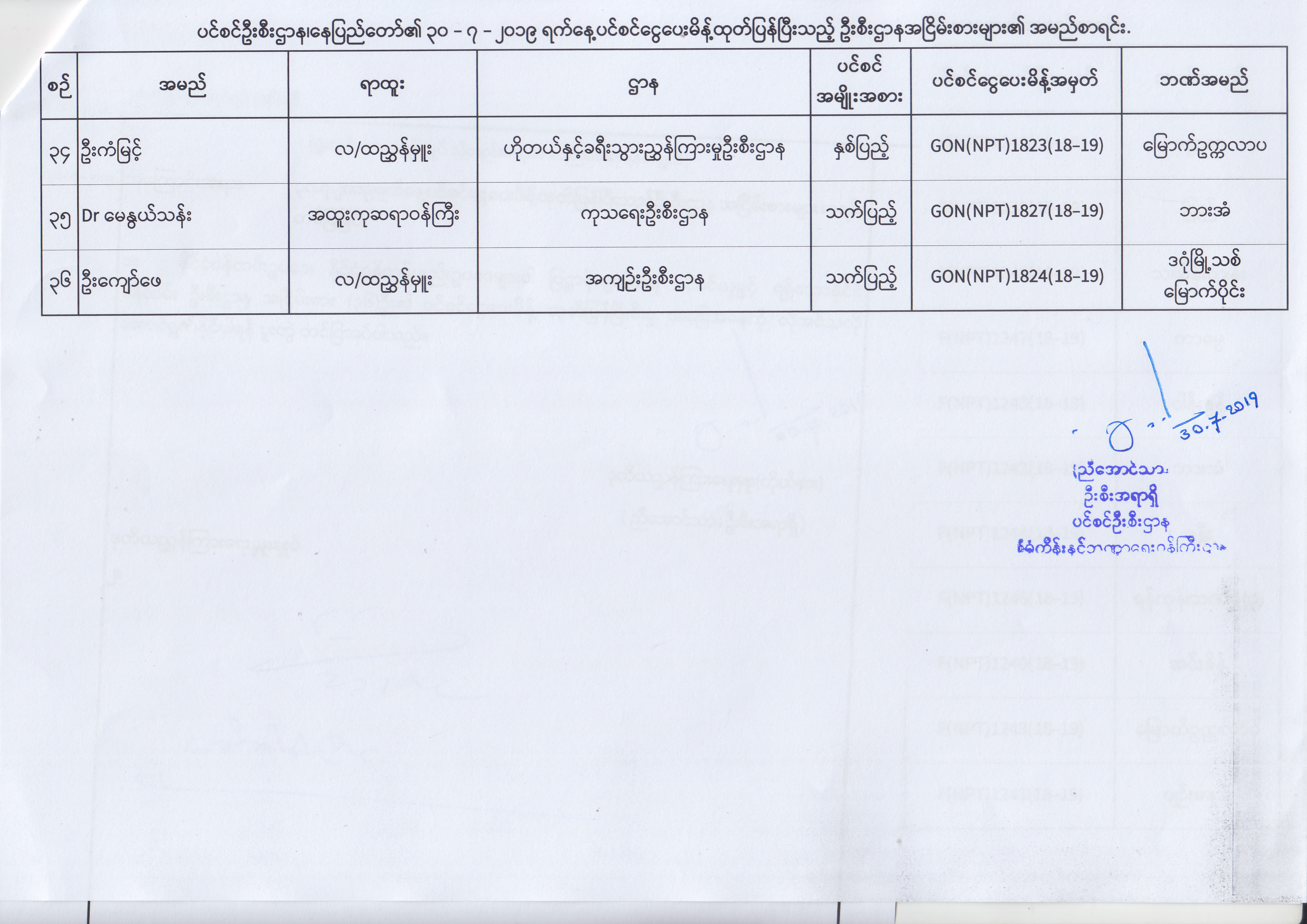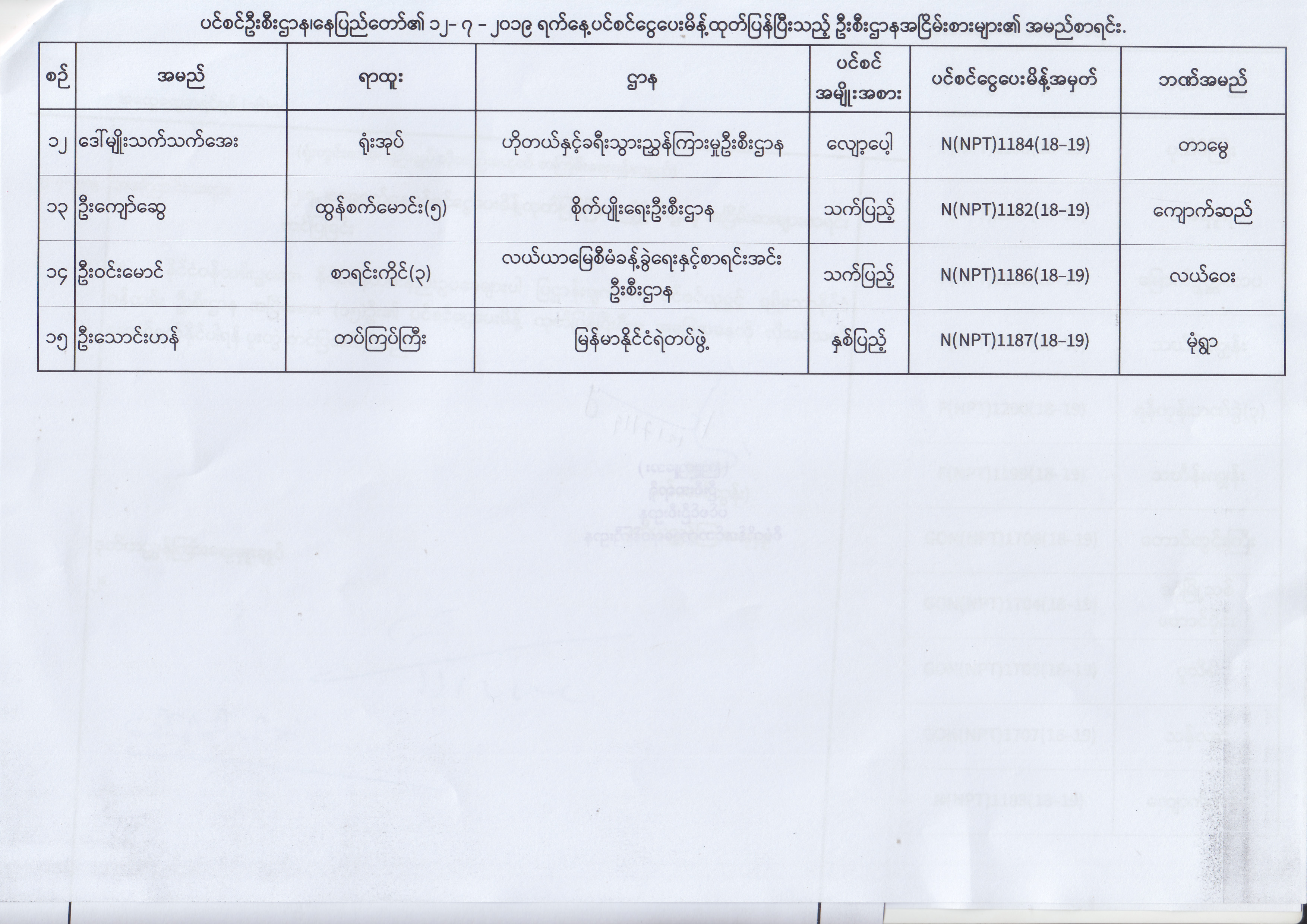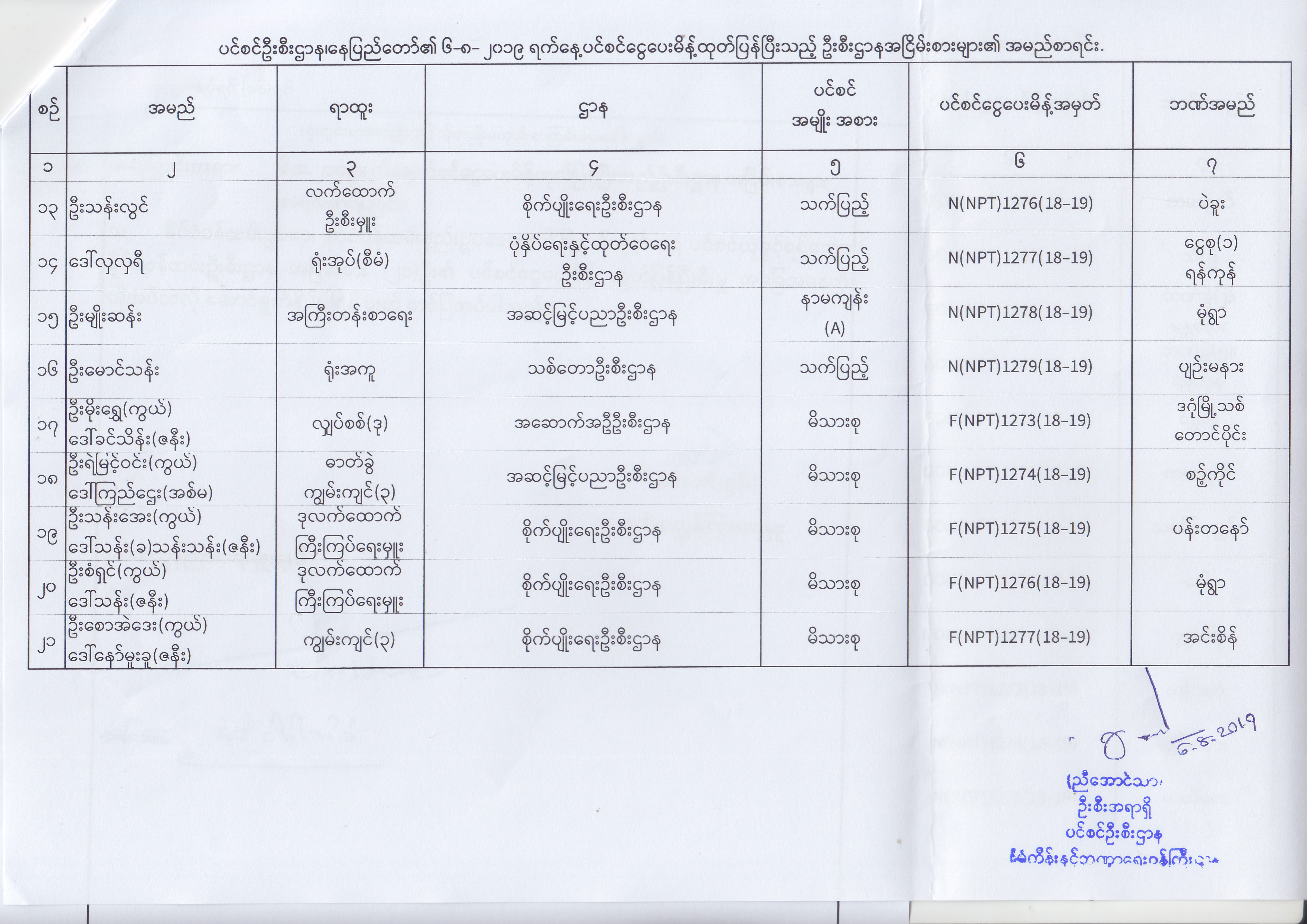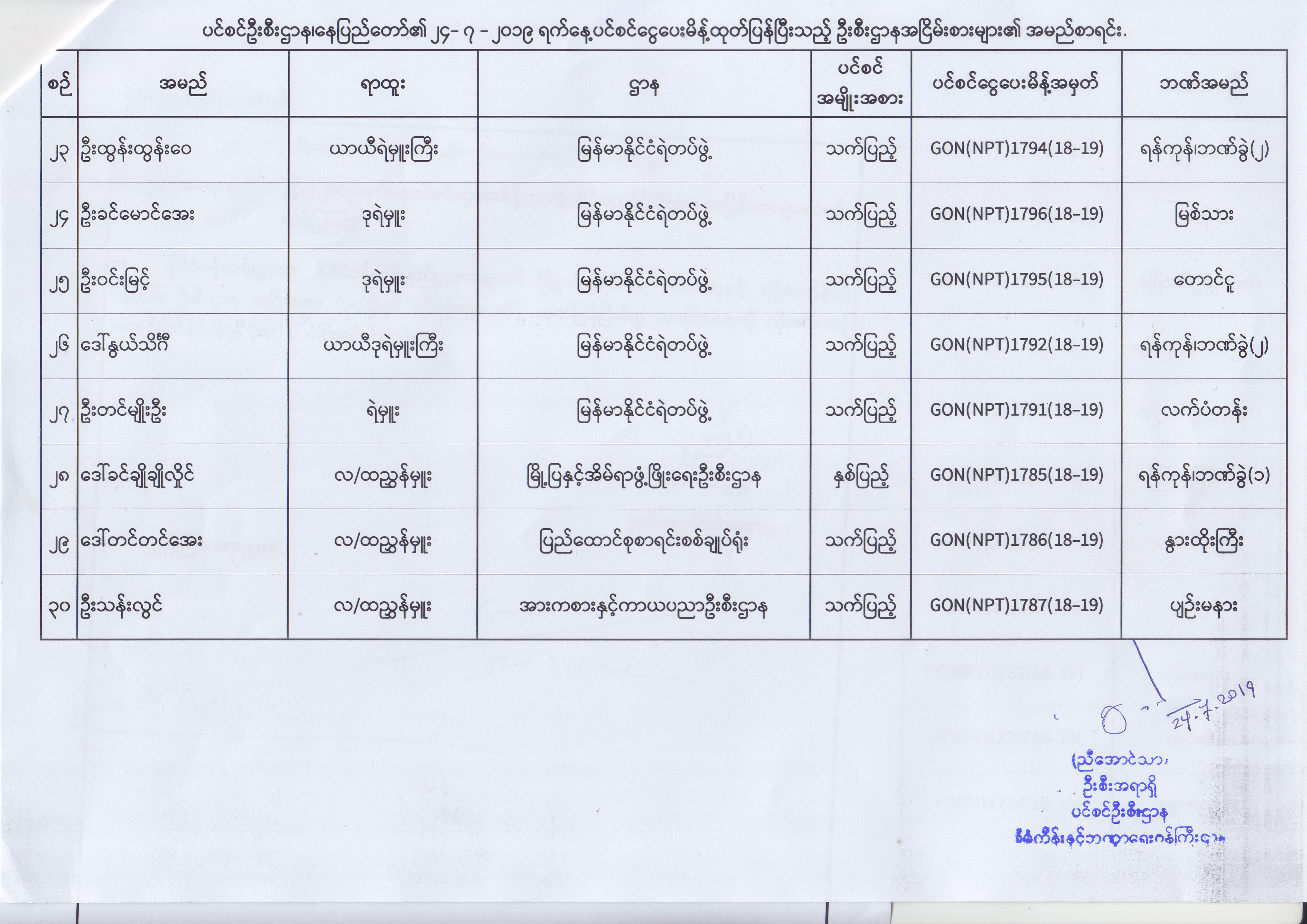 ပင်စင်ဦးစီးဌာန၊ နေပြည်တော်၏ (၂၄.၆.၂၀၁၉) မှ (၆.၈.၂၀၁၉) ရက်နေ့အထိ ပင်စင်ငွေပေးမိန့်ထုတ်ပြန်ပြီးသည့် ဦးစီးဌာနအငြိမ်းစားများ၏ အမည်စာရင်း pension_editor Thu, 08/08/2019 - 11:59