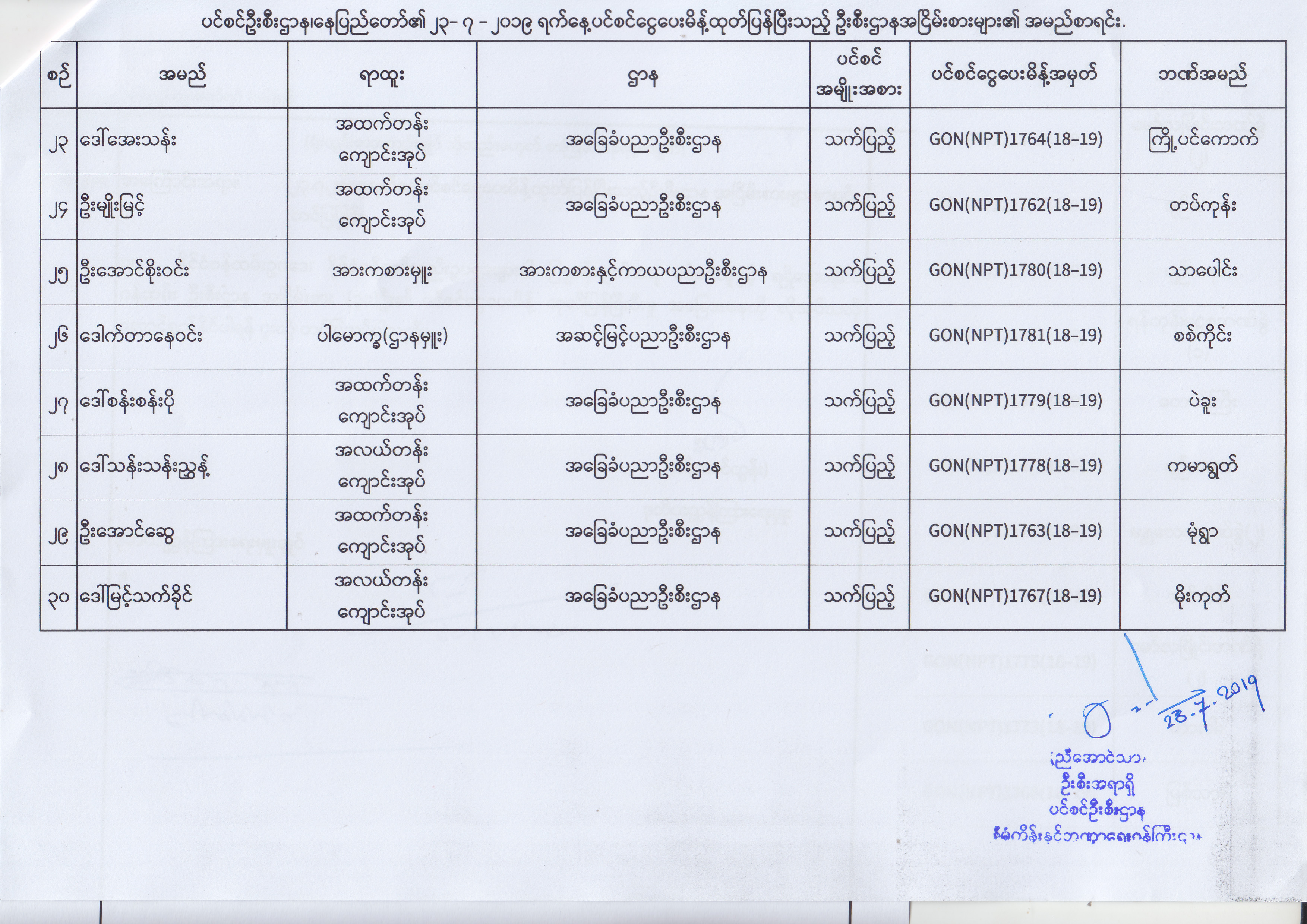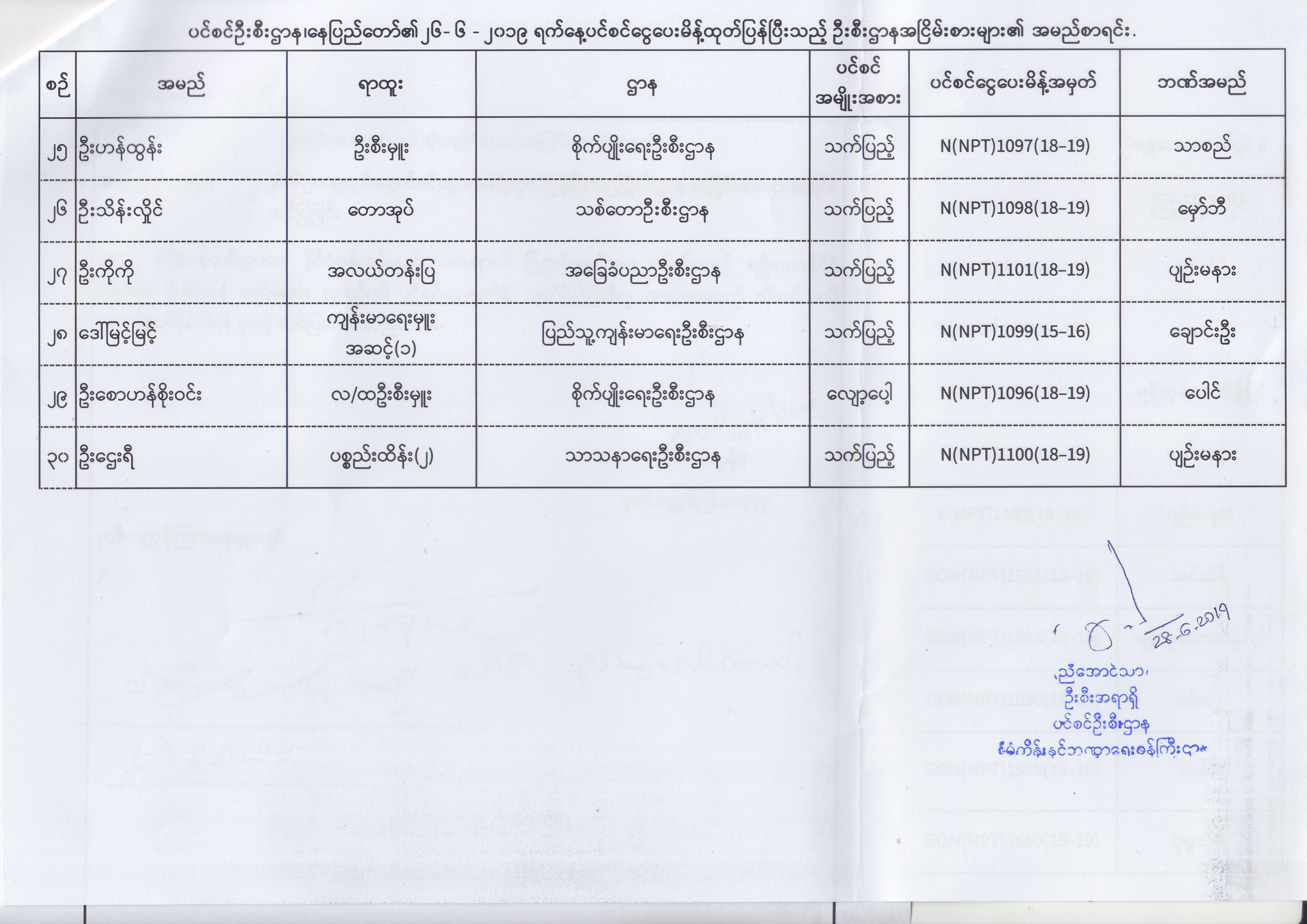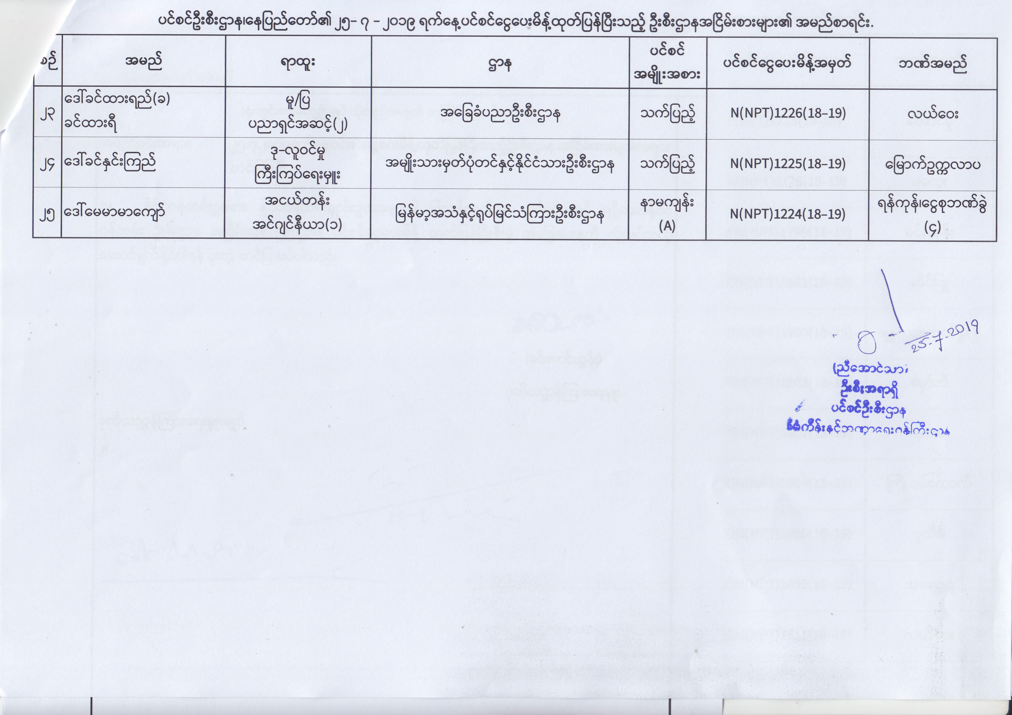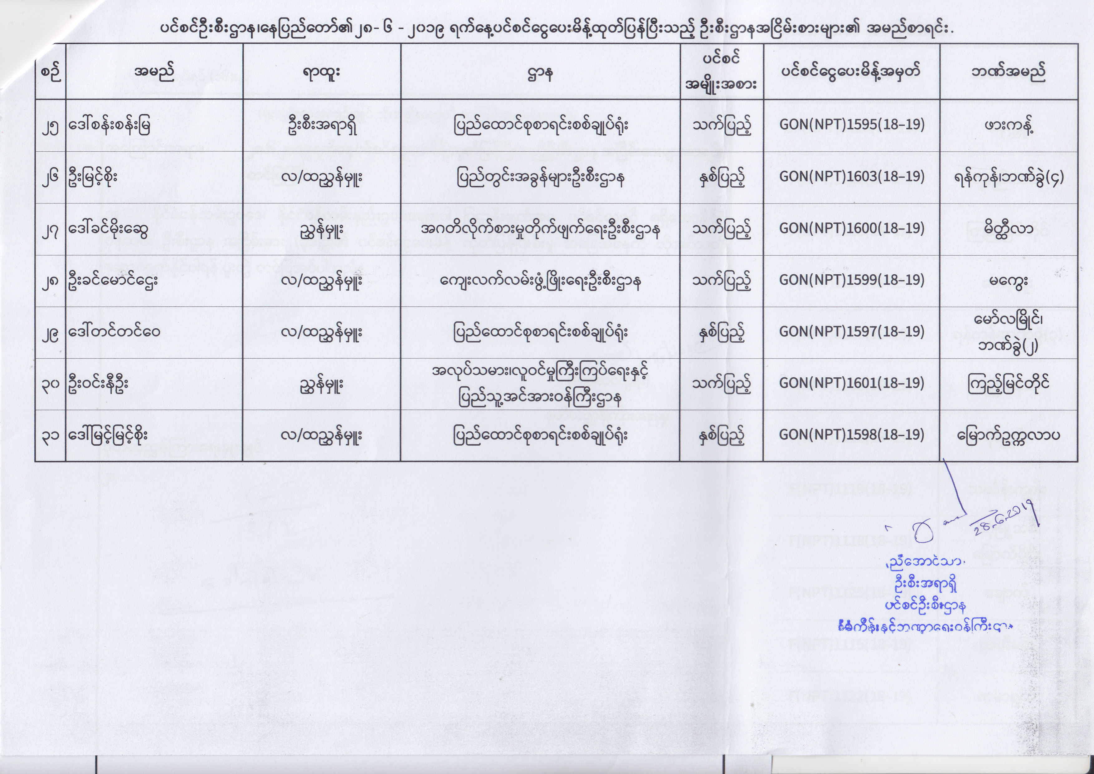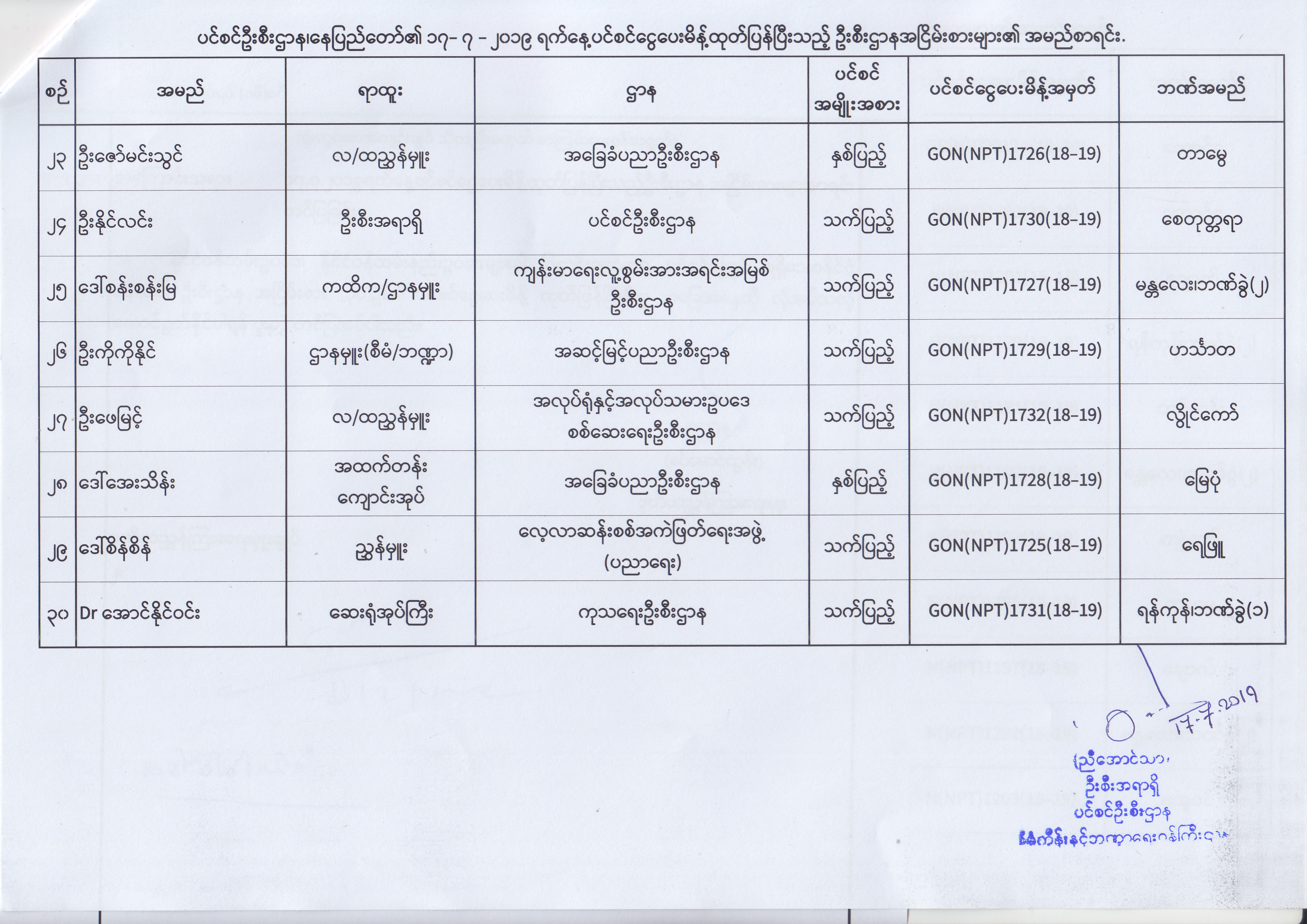 ပင်စင်ဦးစီးဌာန၊ နေပြည်တော်၏ (၂၄.၆.၂၀၁၉) မှ (၆.၈.၂၀၁၉) ရက်နေ့အထိ ပင်စင်ငွေပေးမိန့်ထုတ်ပြန်ပြီးသည့် ဦးစီးဌာနအငြိမ်းစားများ၏ အမည်စာရင်း pension_editor Thu, 08/08/2019 - 11:59