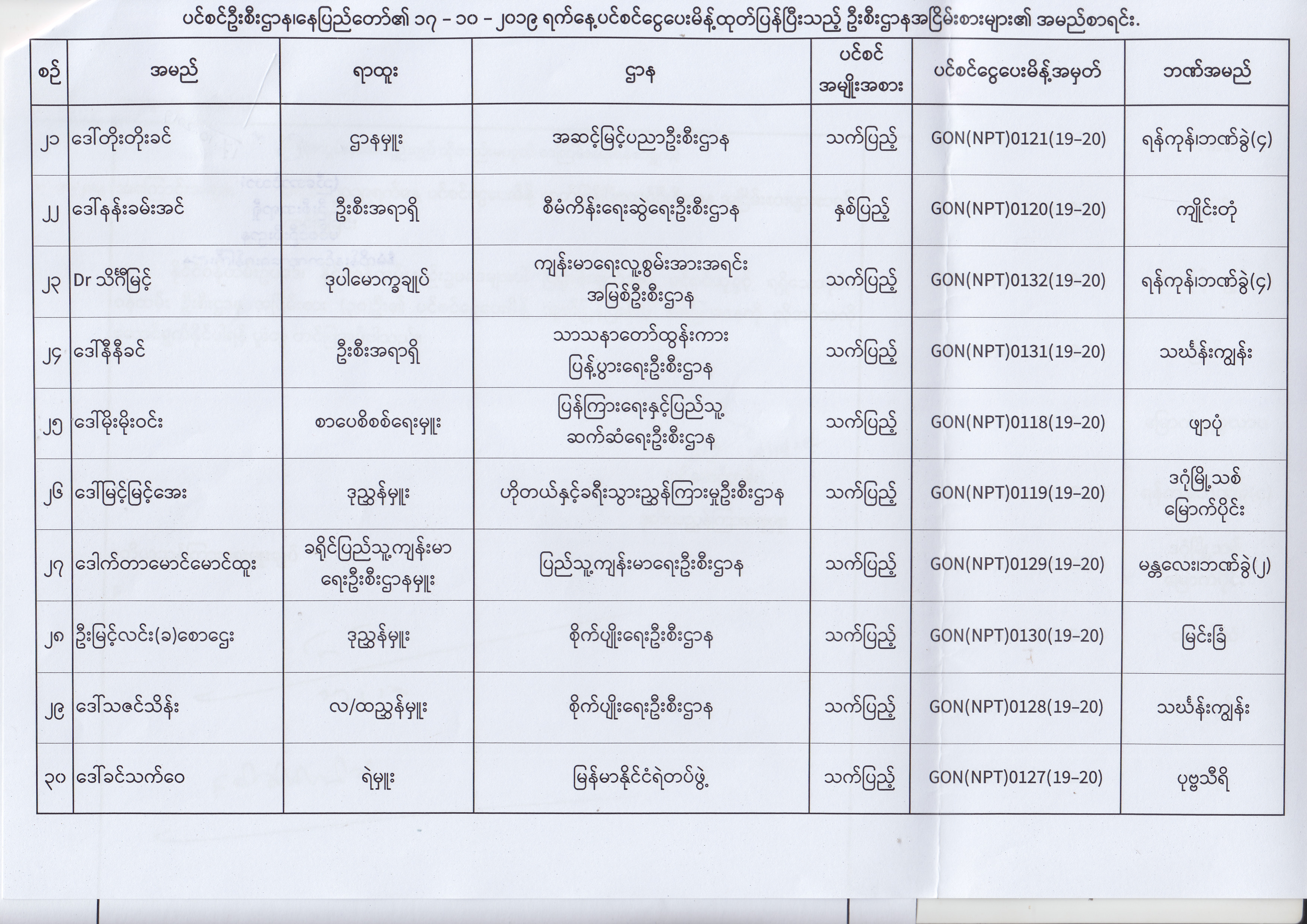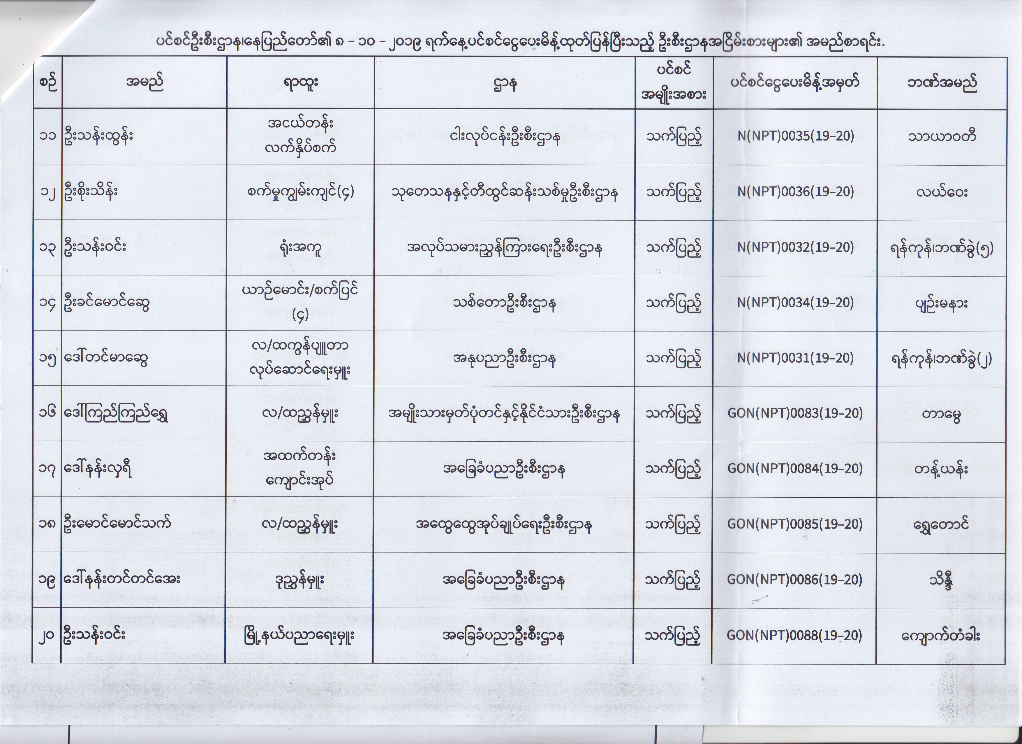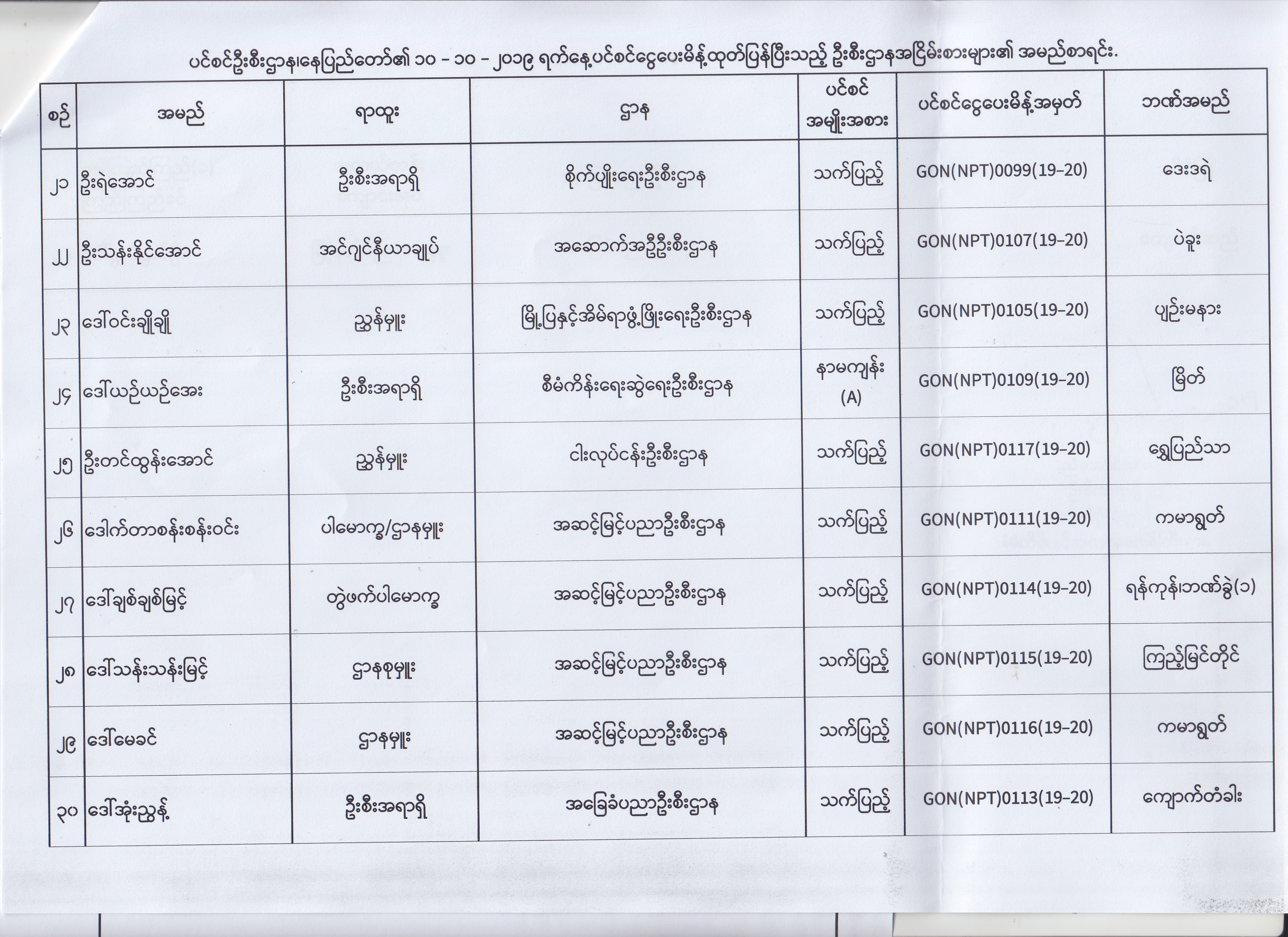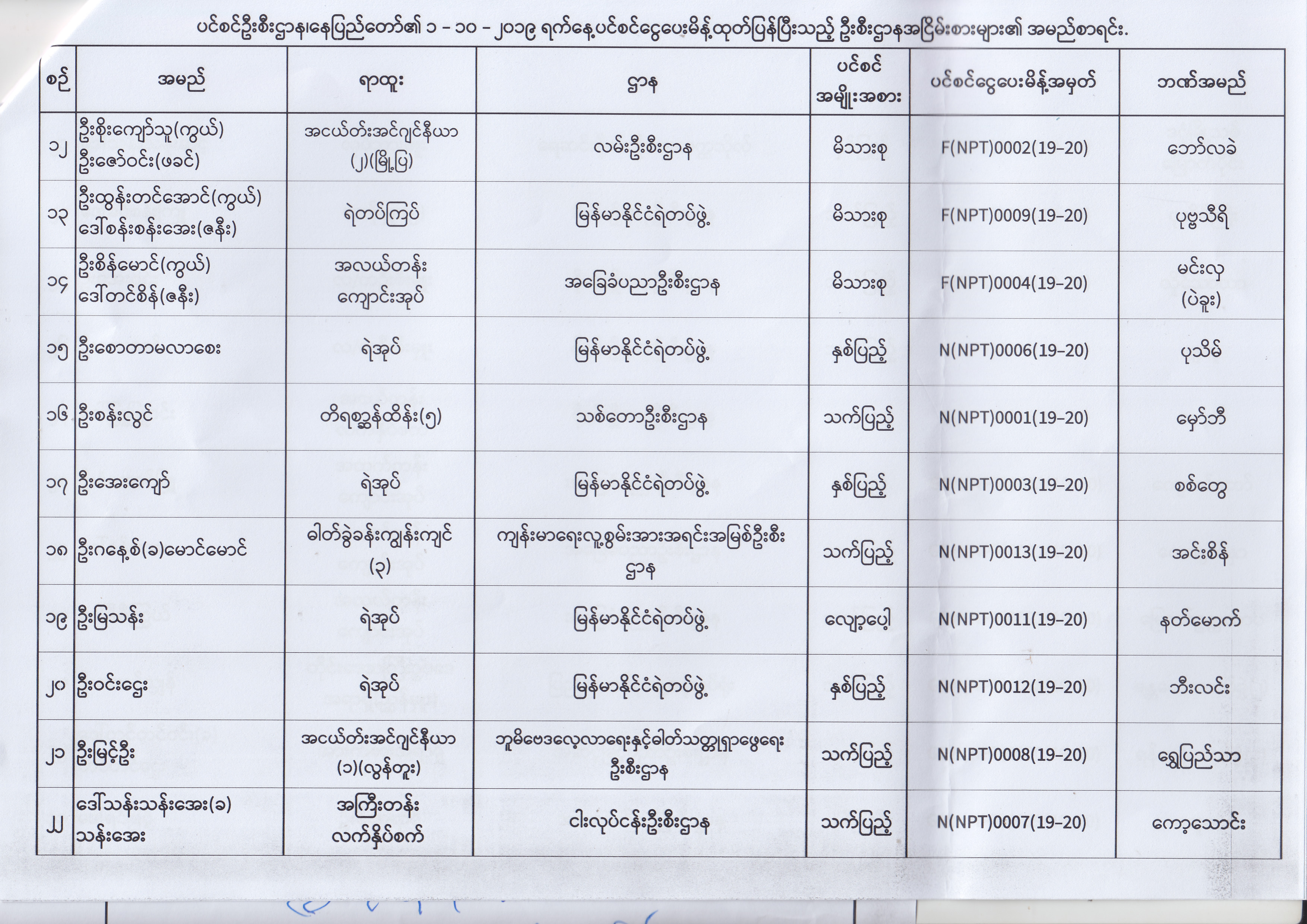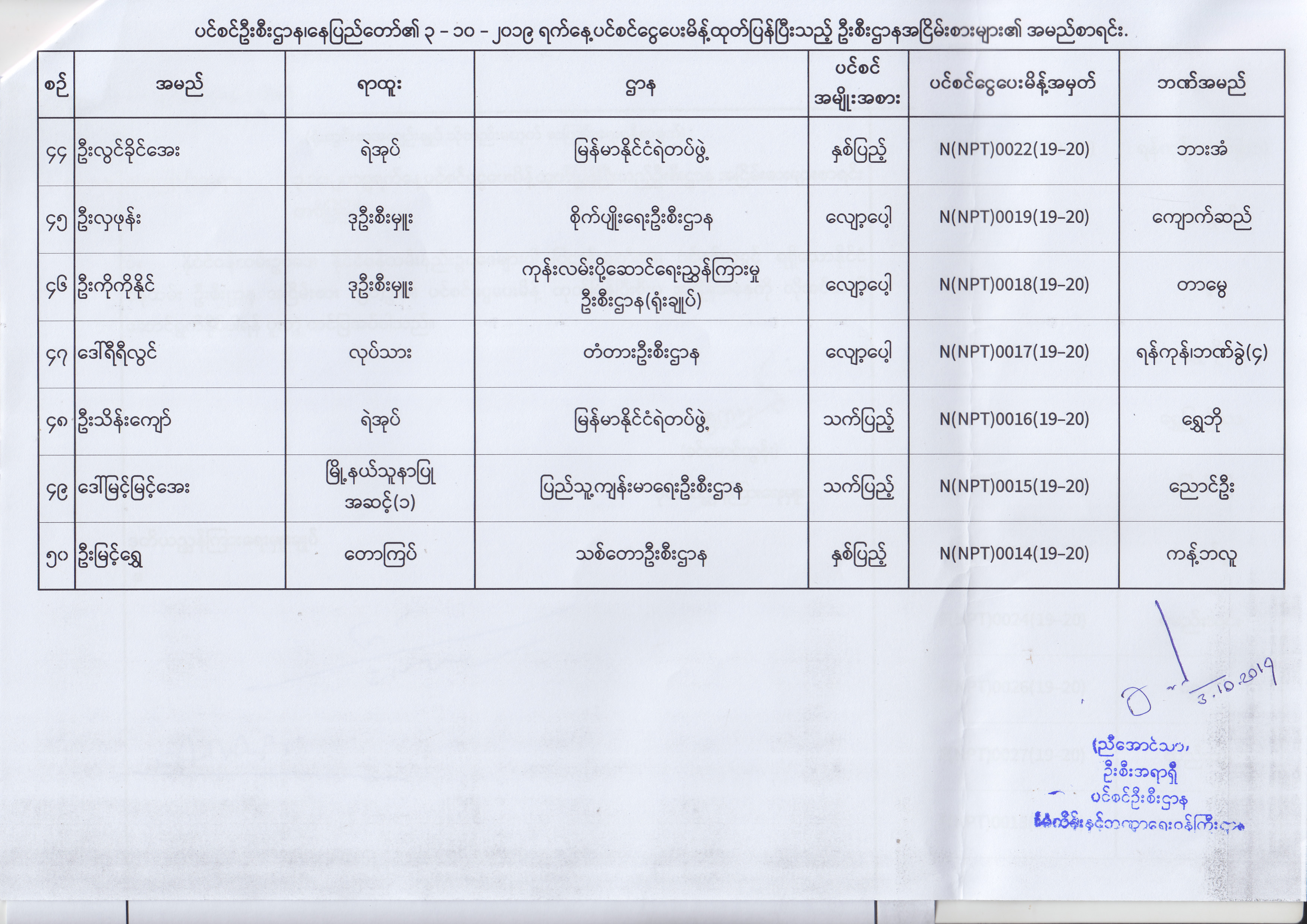 ပင်စင်ဦးစီးဌာန၊ နေပြည်တော်၏ (၁.၁၀.၂၀၁၉) မှ (၃၁.၁၀.၂၀၁၉) ရက်နေ့အထိ ပင်စင်ငွေပေးမိန့်ထုတ်ပြန်ပြီးသည့် ဦးစီးဌာနအငြိမ်းစားများ၏ အမည်စာရင်း