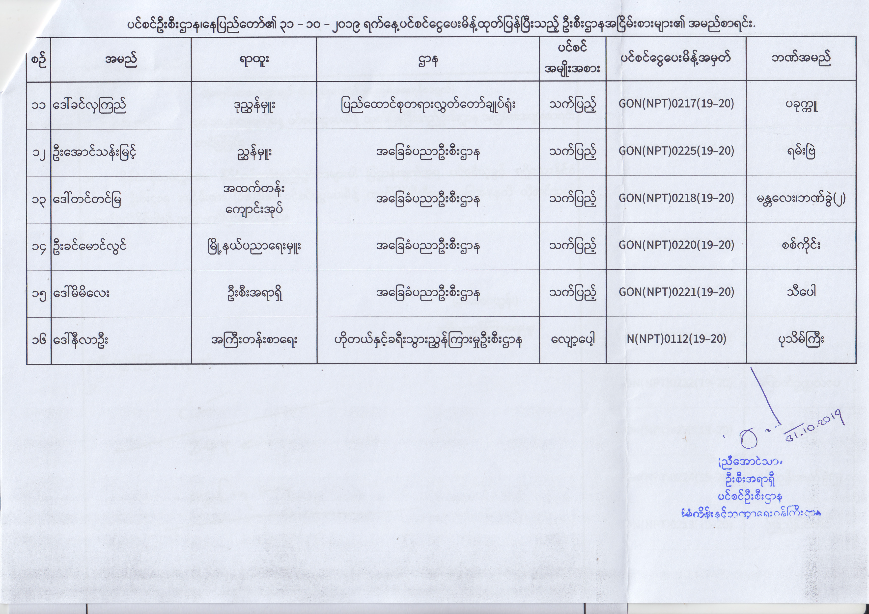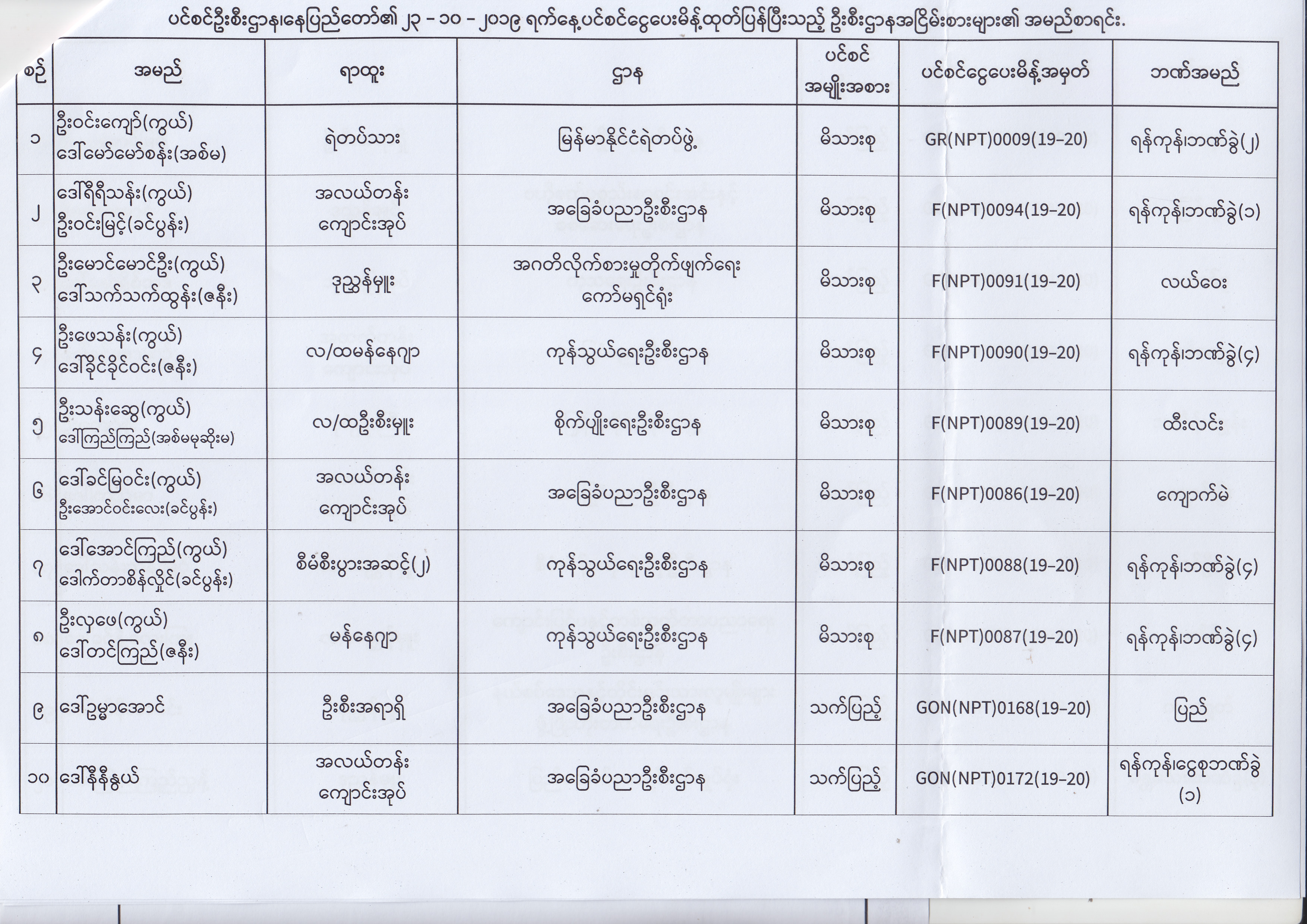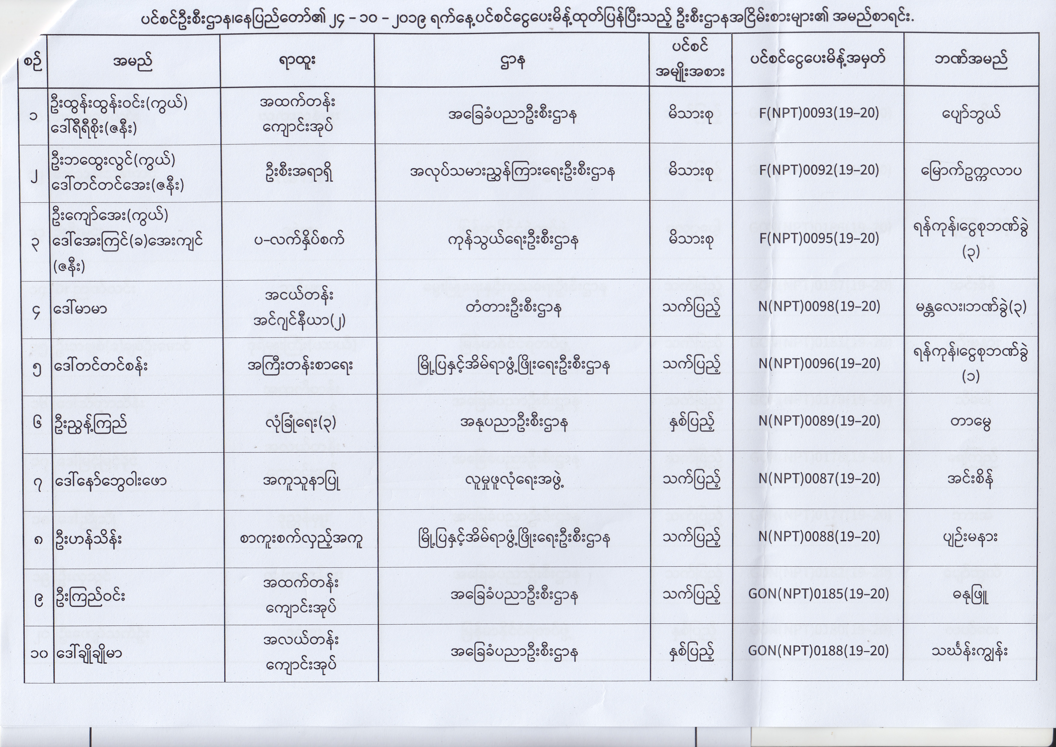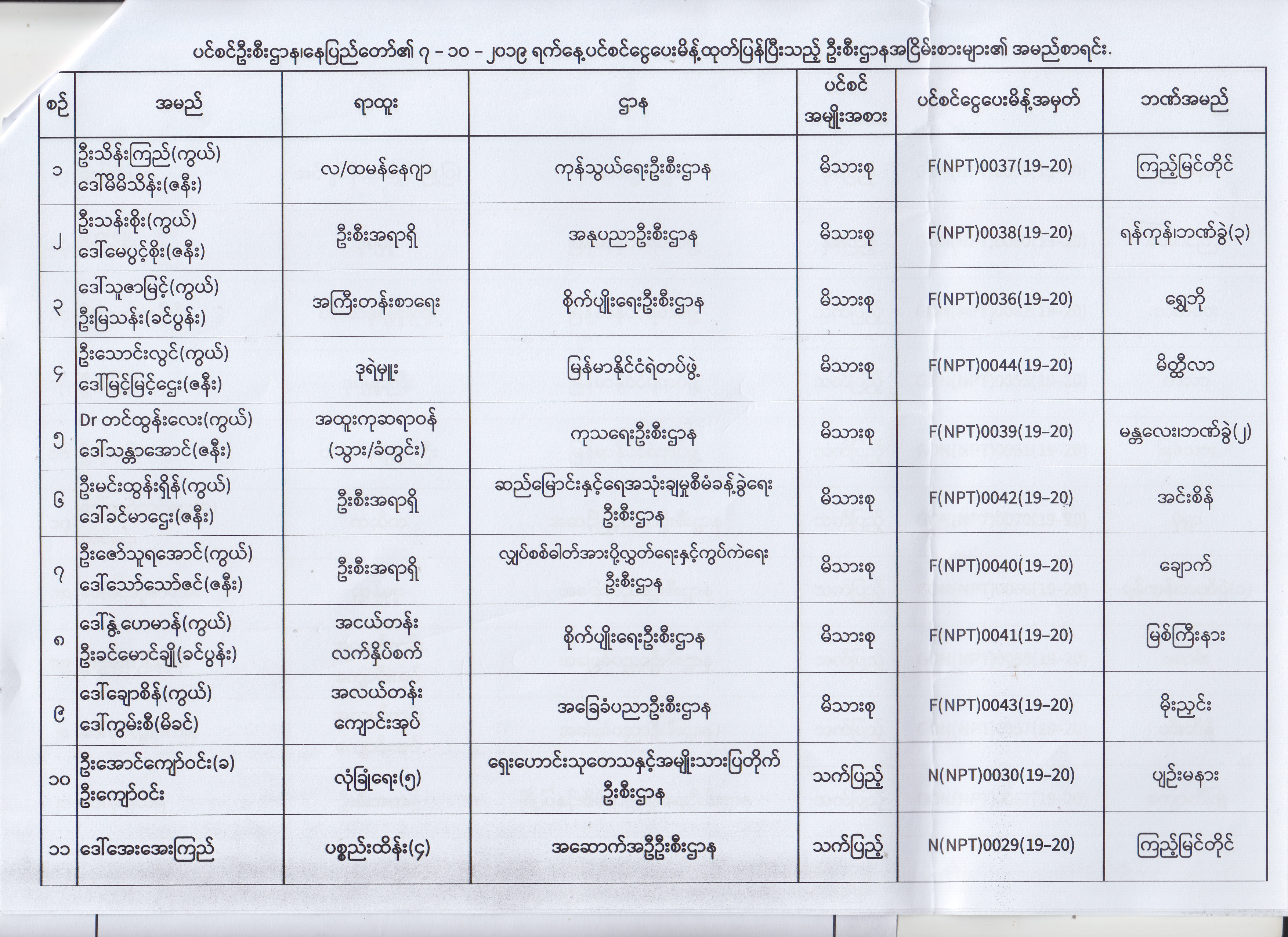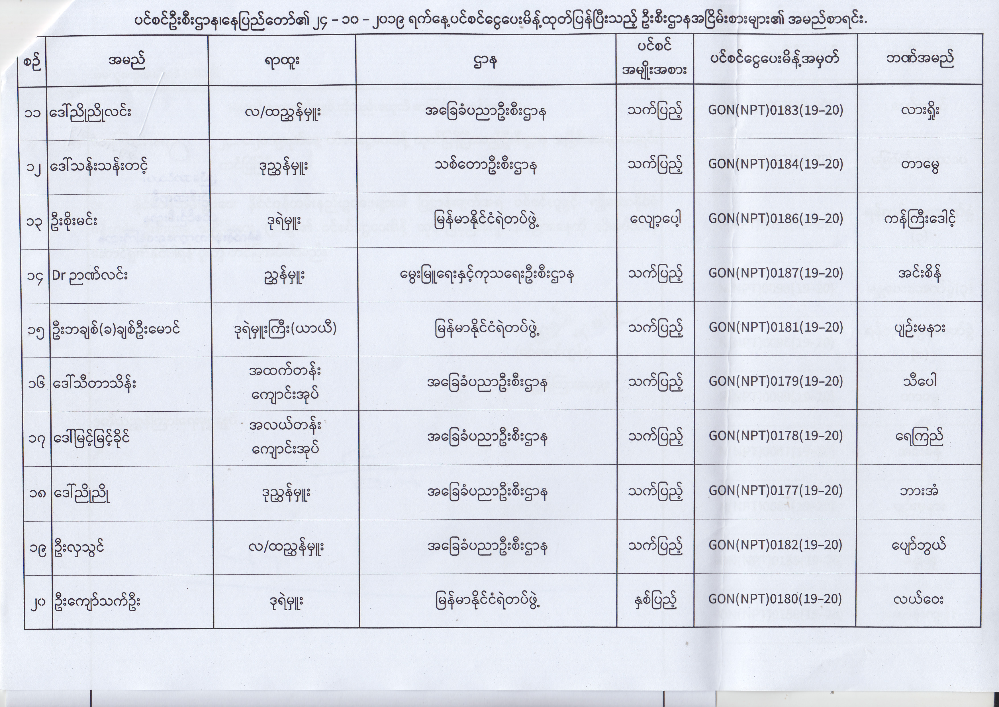 ပင်စင်ဦးစီးဌာန၊ နေပြည်တော်၏ (၁.၁၀.၂၀၁၉) မှ (၃၁.၁၀.၂၀၁၉) ရက်နေ့အထိ ပင်စင်ငွေပေးမိန့်ထုတ်ပြန်ပြီးသည့် ဦးစီးဌာနအငြိမ်းစားများ၏ အမည်စာရင်း