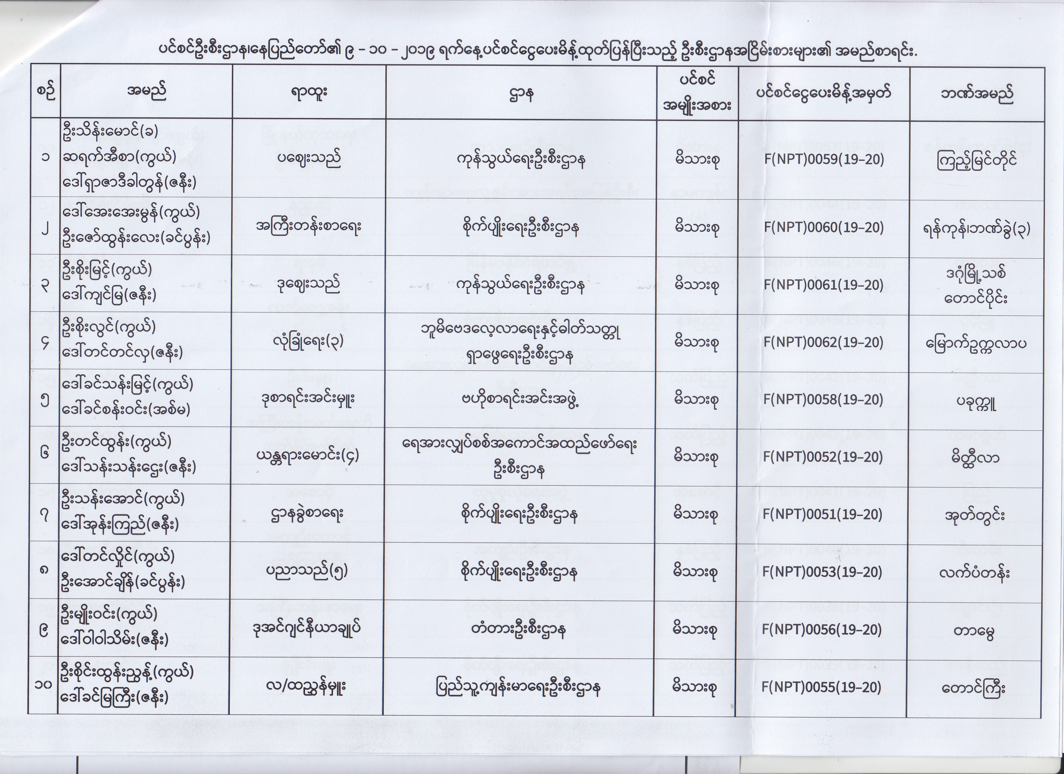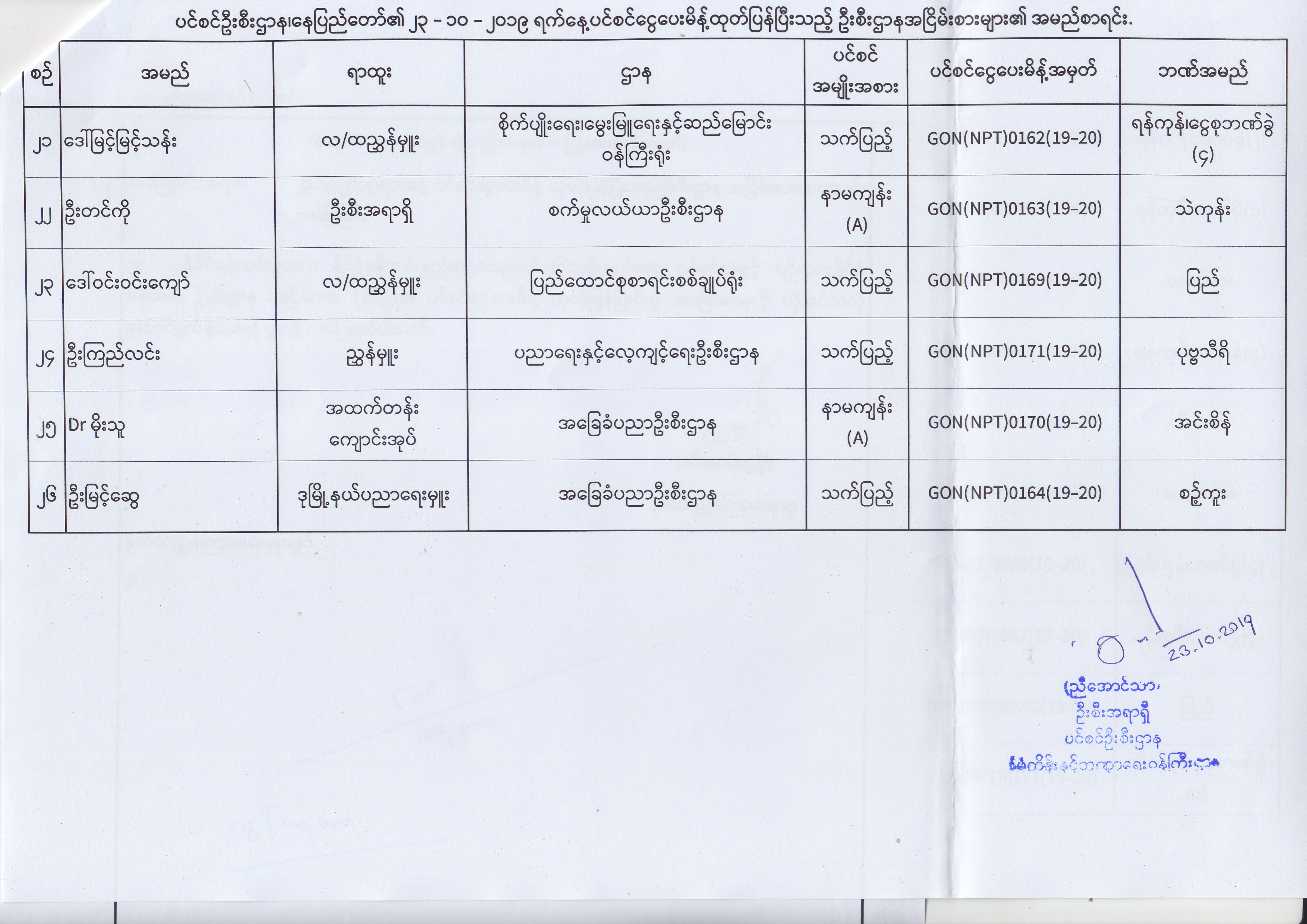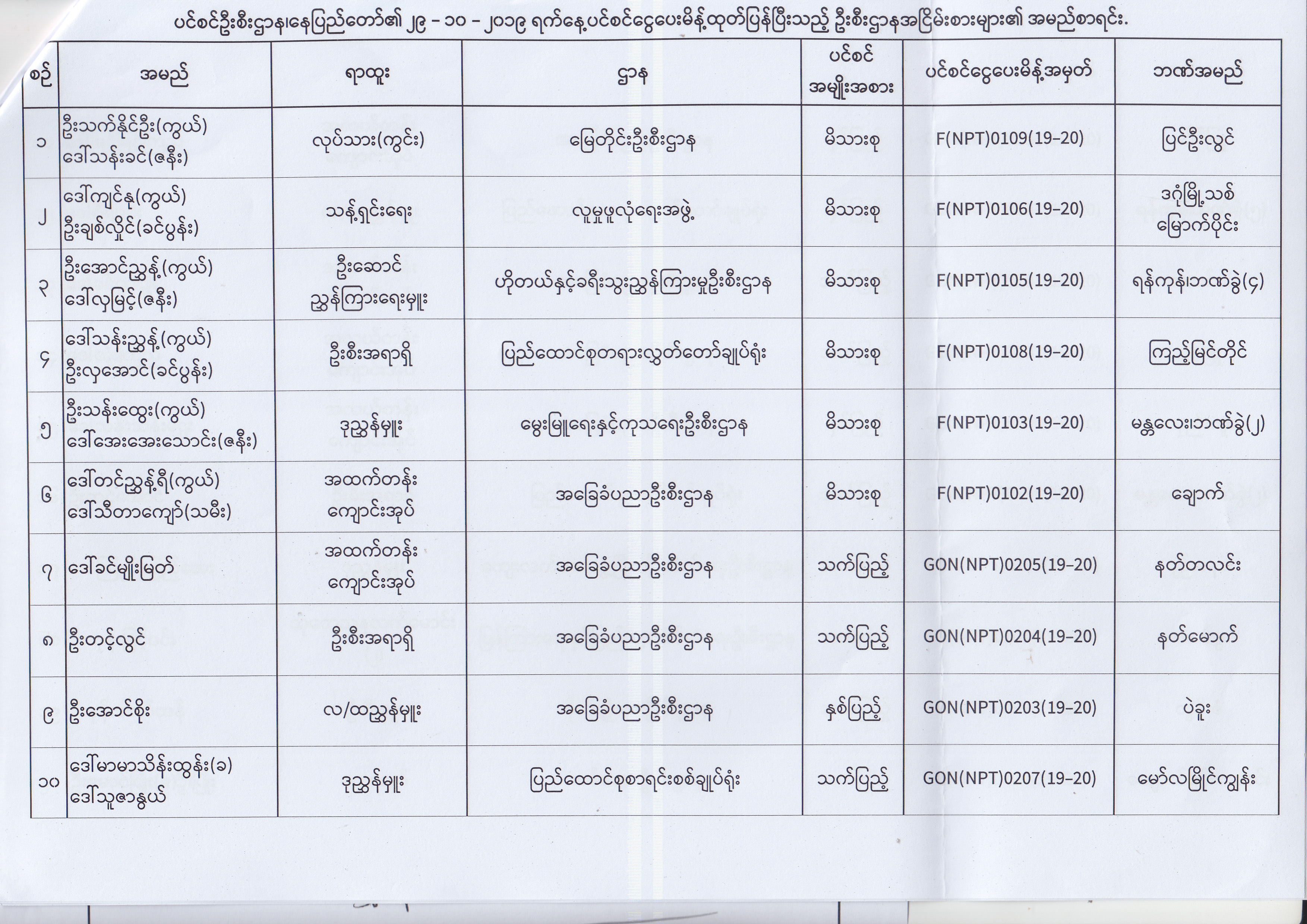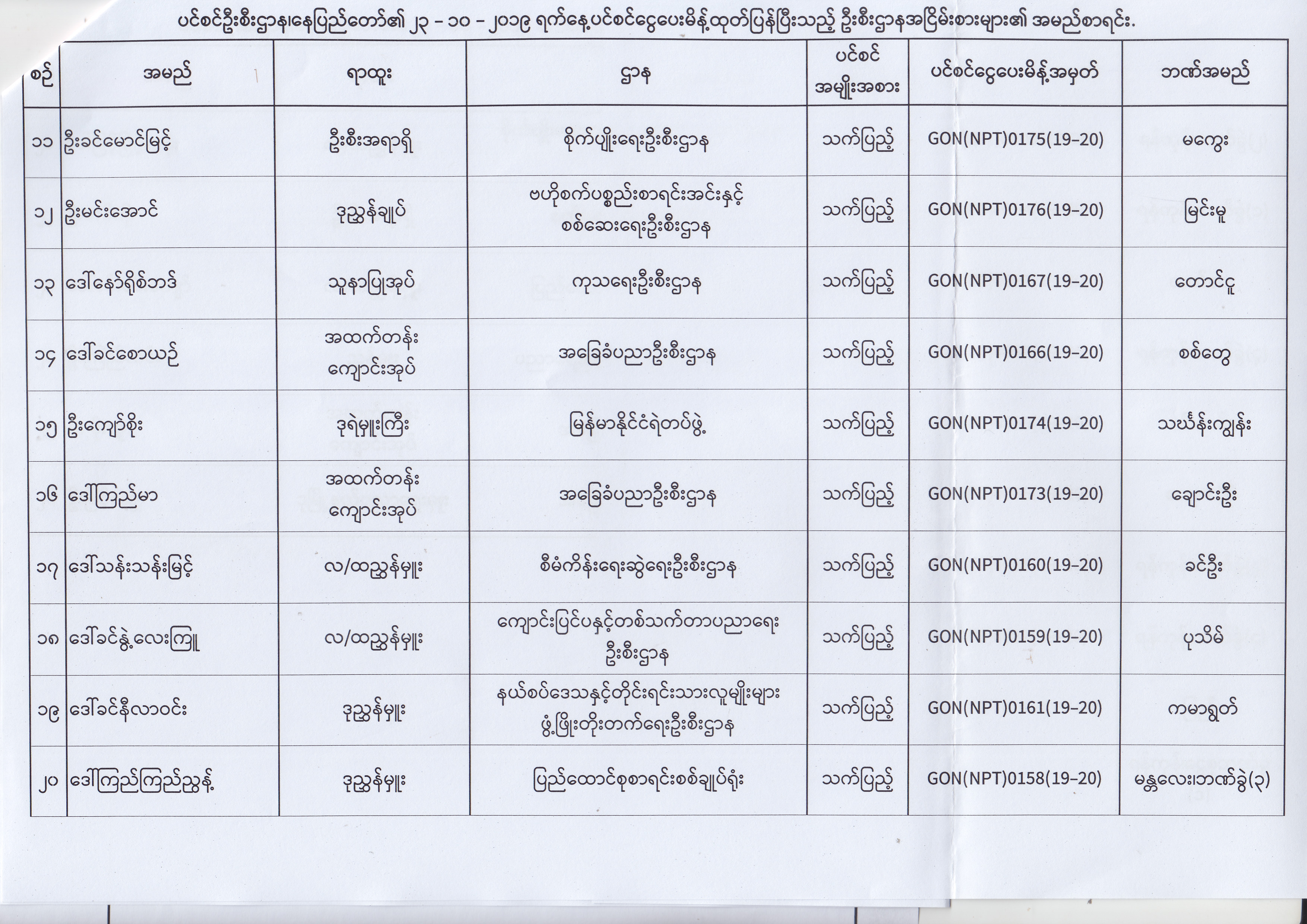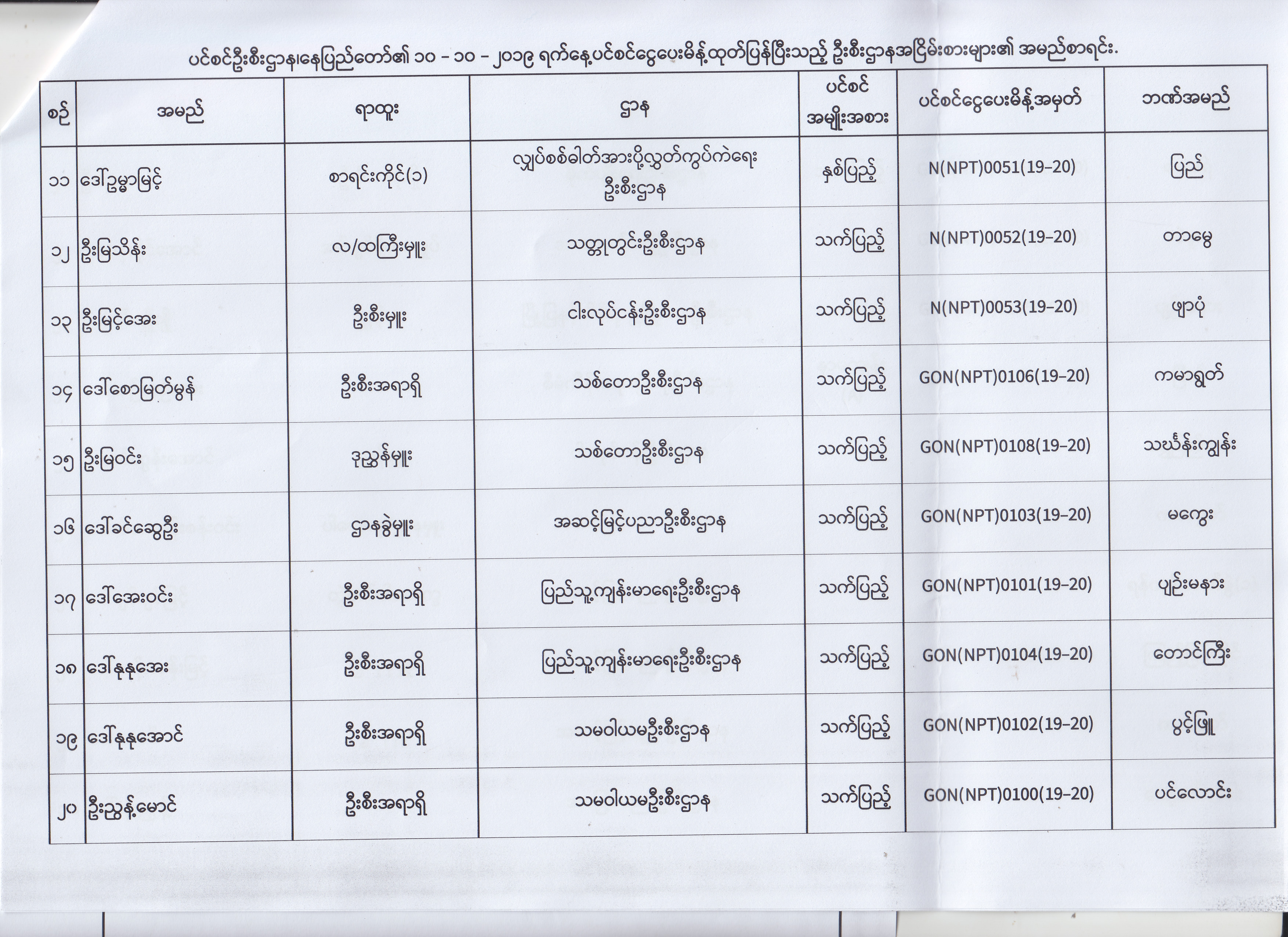 ပင်စင်ဦးစီးဌာန၊ နေပြည်တော်၏ (၁.၁၀.၂၀၁၉) မှ (၃၁.၁၀.၂၀၁၉) ရက်နေ့အထိ ပင်စင်ငွေပေးမိန့်ထုတ်ပြန်ပြီးသည့် ဦးစီးဌာနအငြိမ်းစားများ၏ အမည်စာရင်း