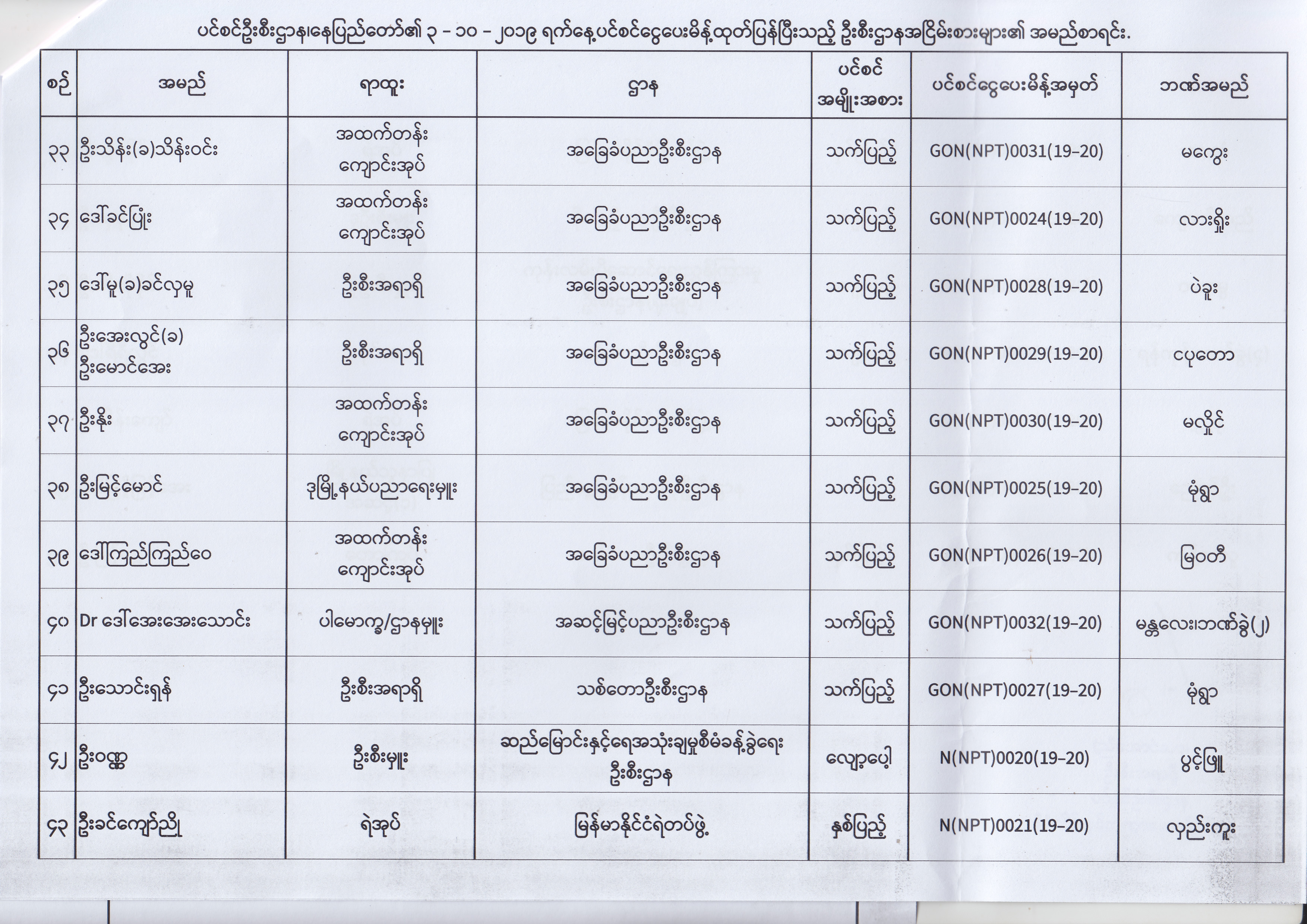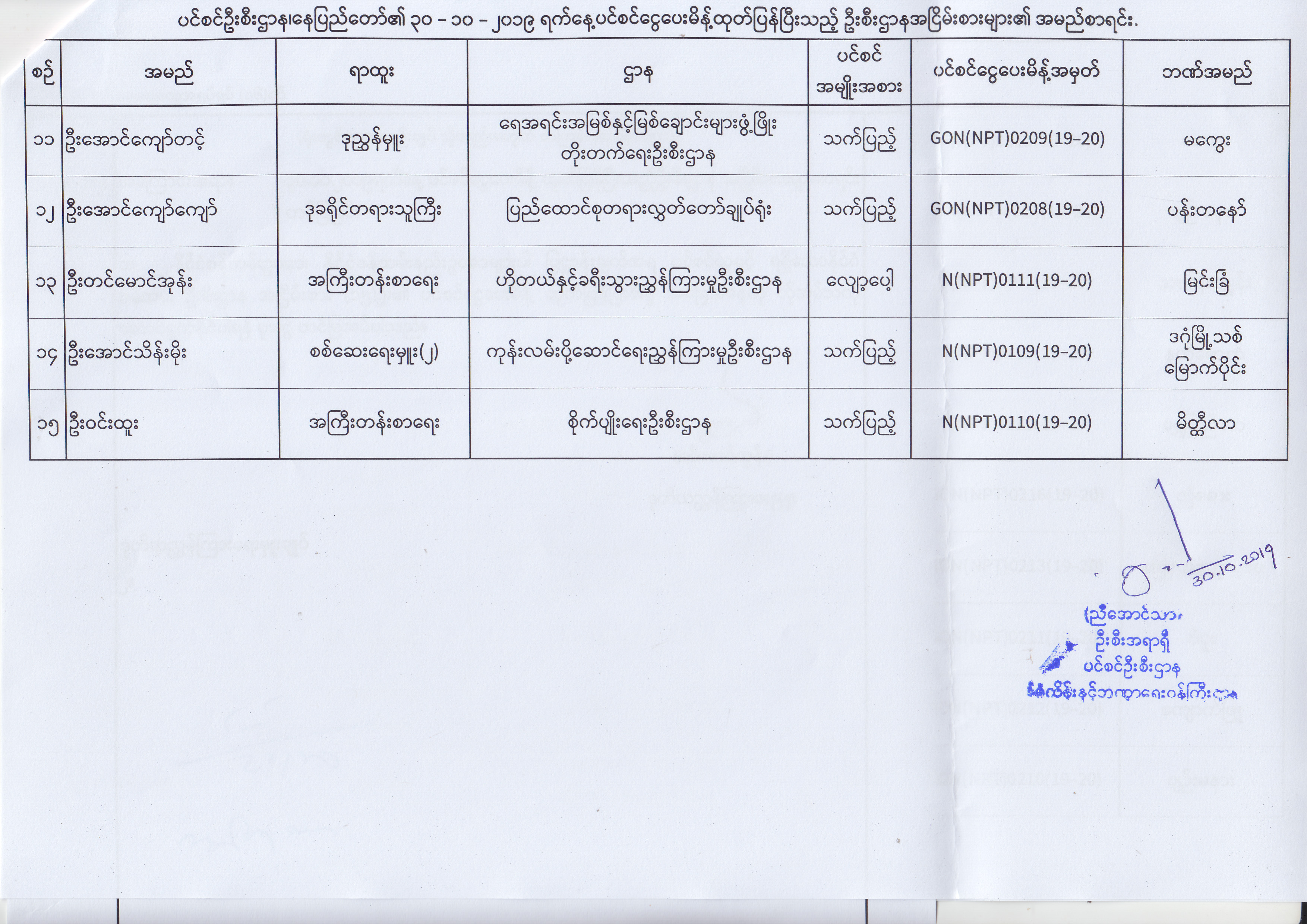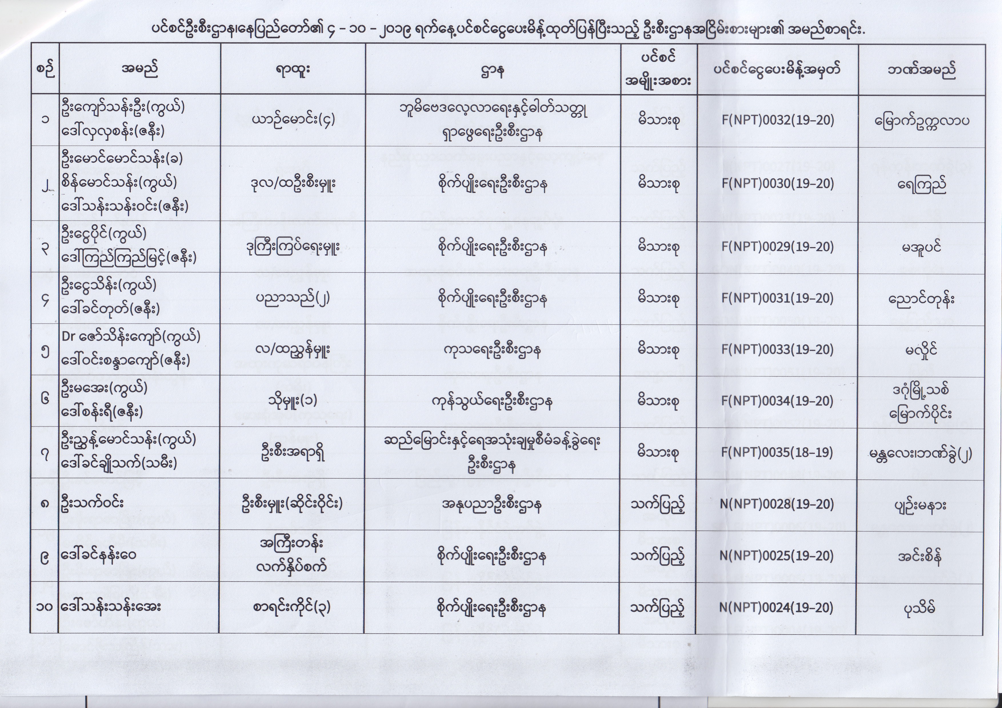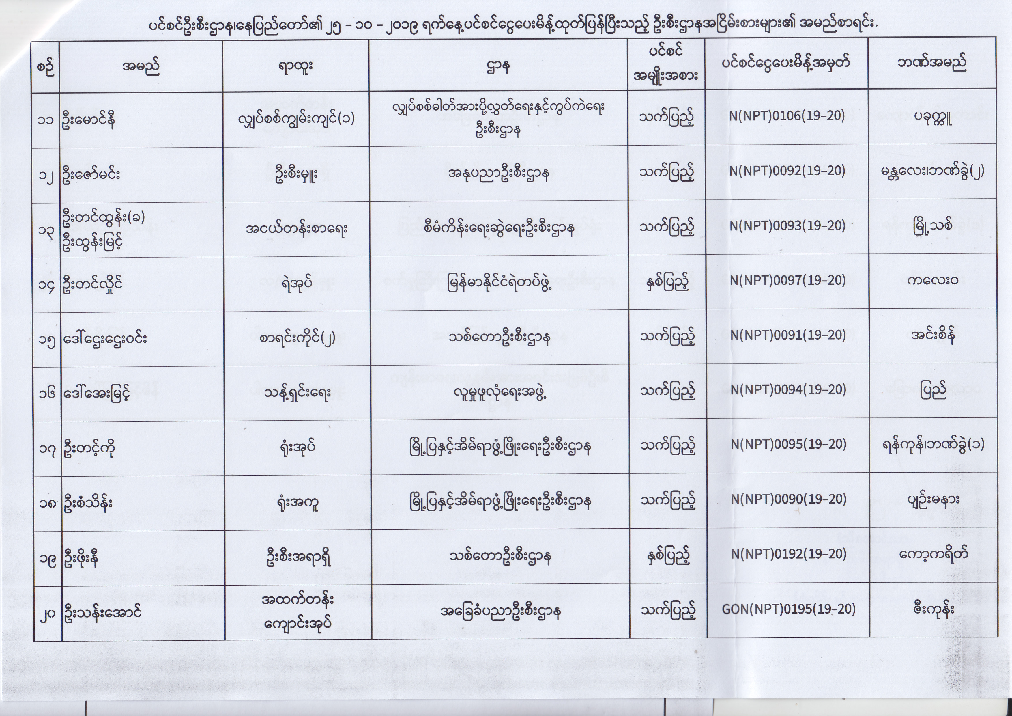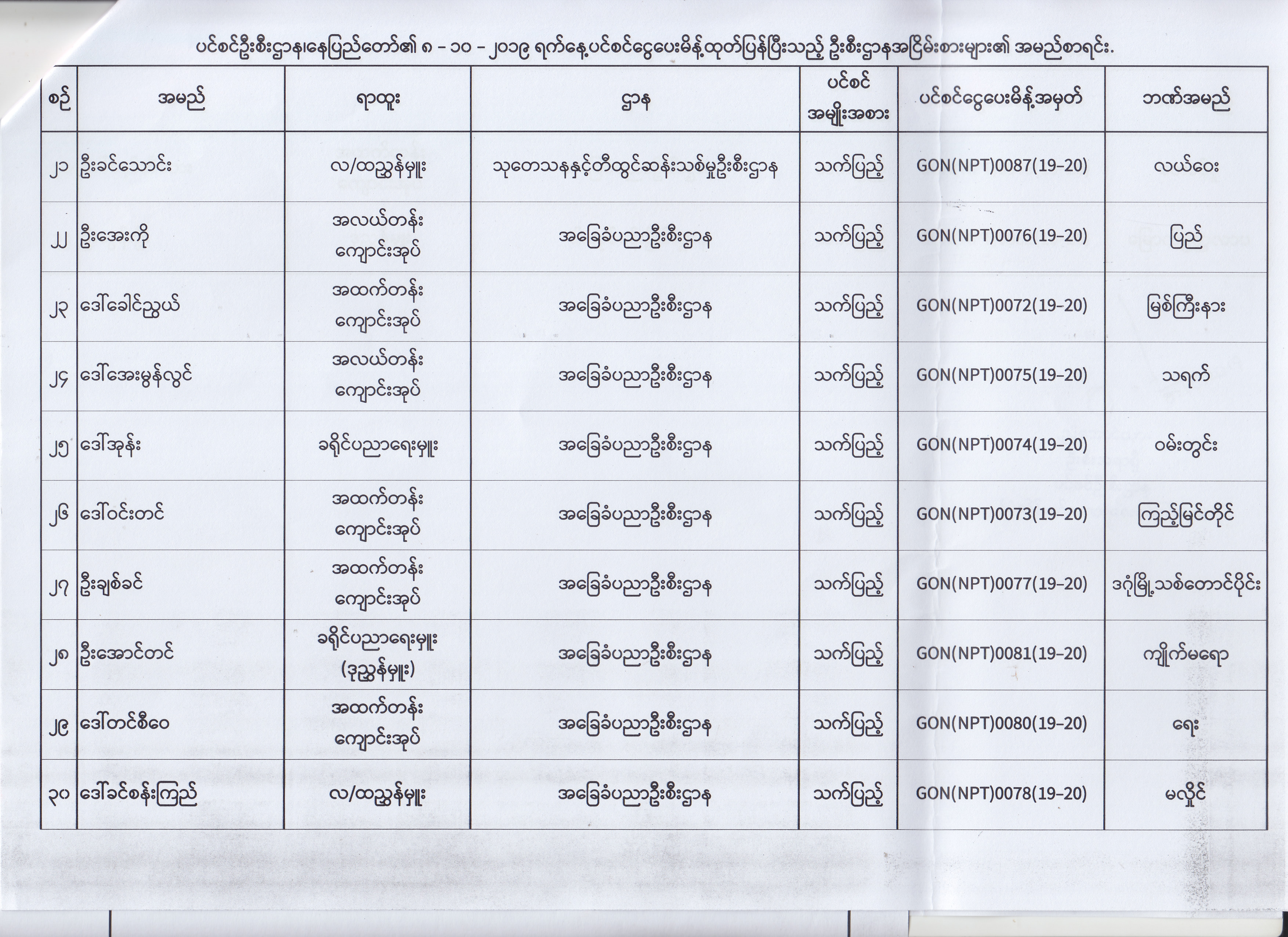 ပင်စင်ဦးစီးဌာန၊ နေပြည်တော်၏ (၁.၁၀.၂၀၁၉) မှ (၃၁.၁၀.၂၀၁၉) ရက်နေ့အထိ ပင်စင်ငွေပေးမိန့်ထုတ်ပြန်ပြီးသည့် ဦးစီးဌာနအငြိမ်းစားများ၏ အမည်စာရင်း