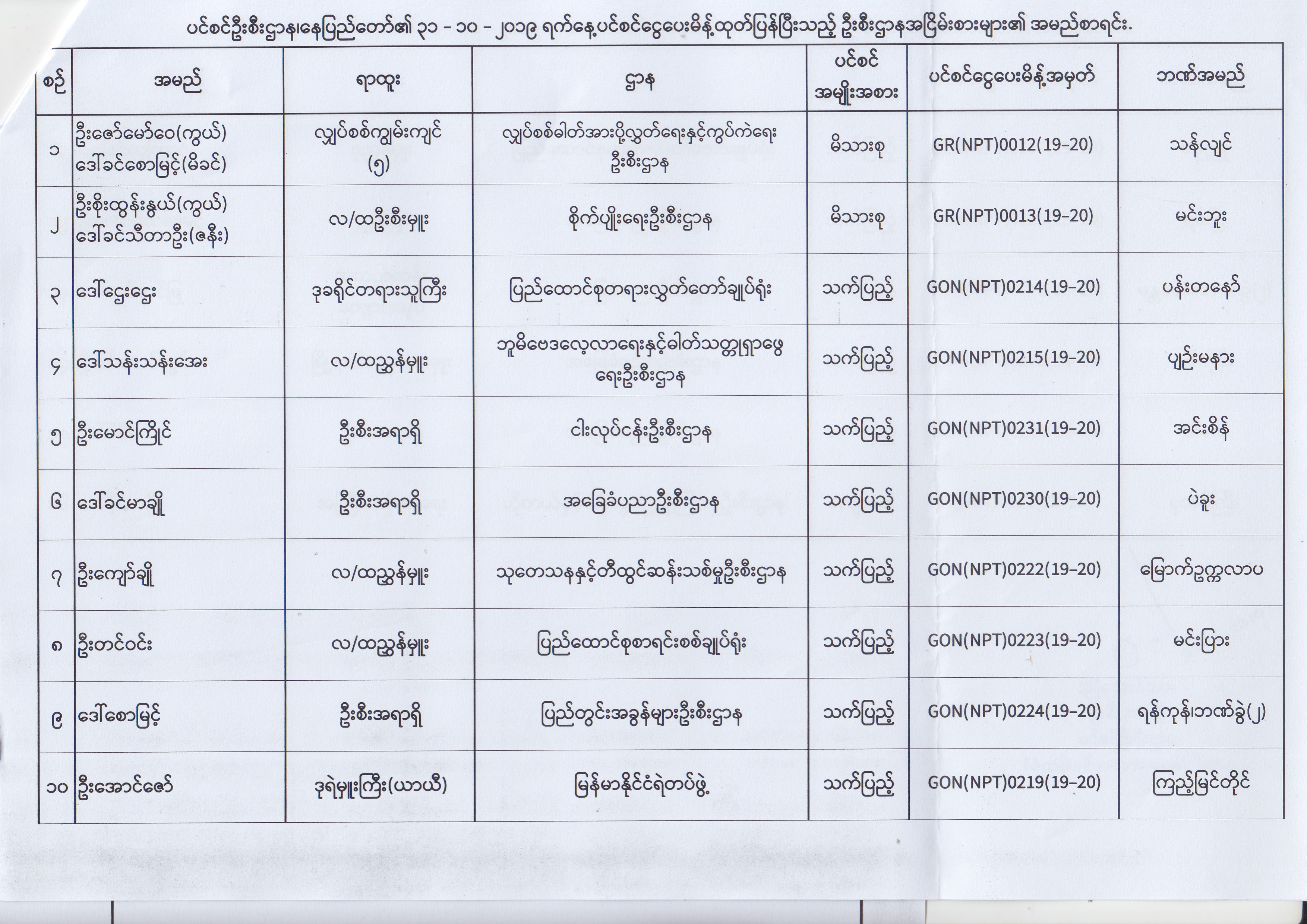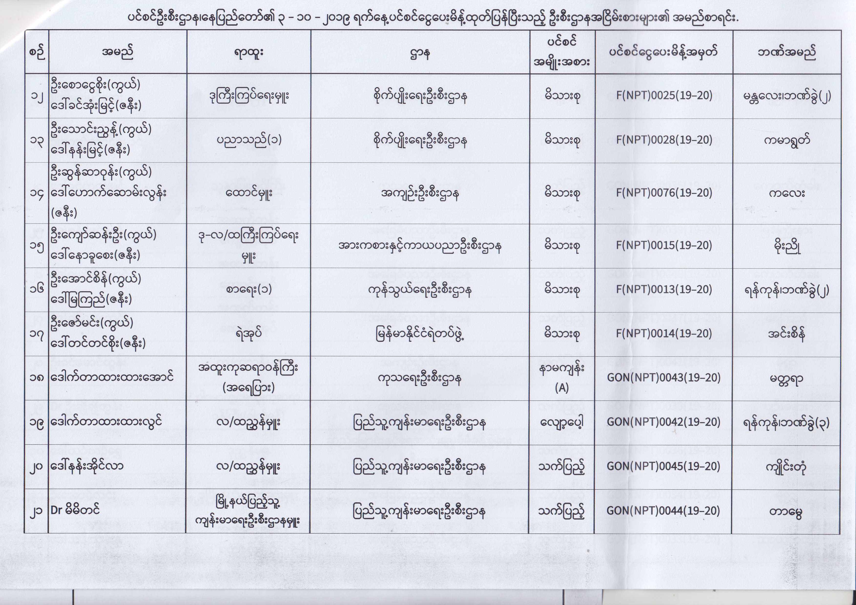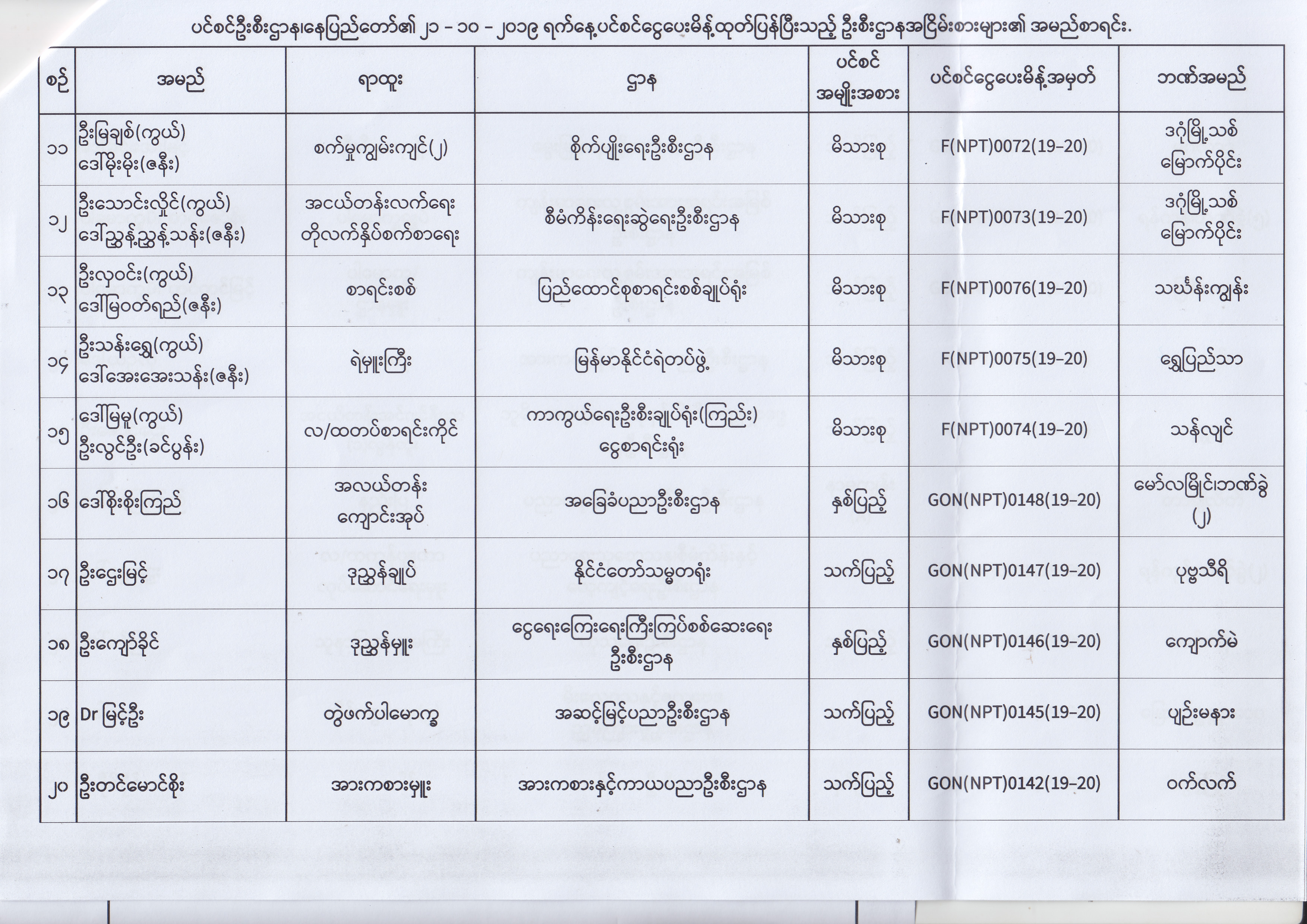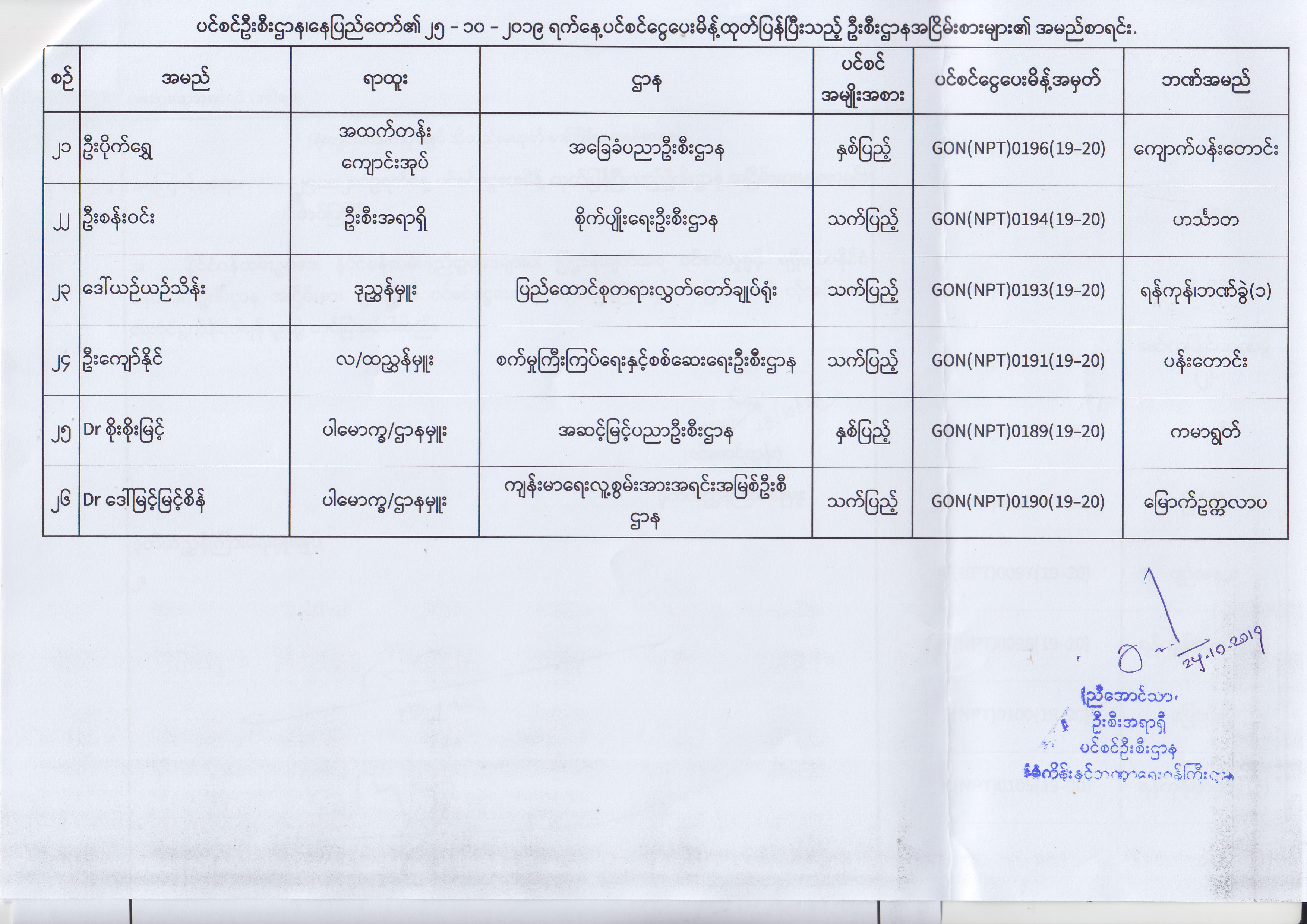 ပင်စင်ဦးစီးဌာန၊ နေပြည်တော်၏ (၁.၁၀.၂၀၁၉) မှ (၃၁.၁၀.၂၀၁၉) ရက်နေ့အထိ ပင်စင်ငွေပေးမိန့်ထုတ်ပြန်ပြီးသည့် ဦးစီးဌာနအငြိမ်းစားများ၏ အမည်စာရင်း