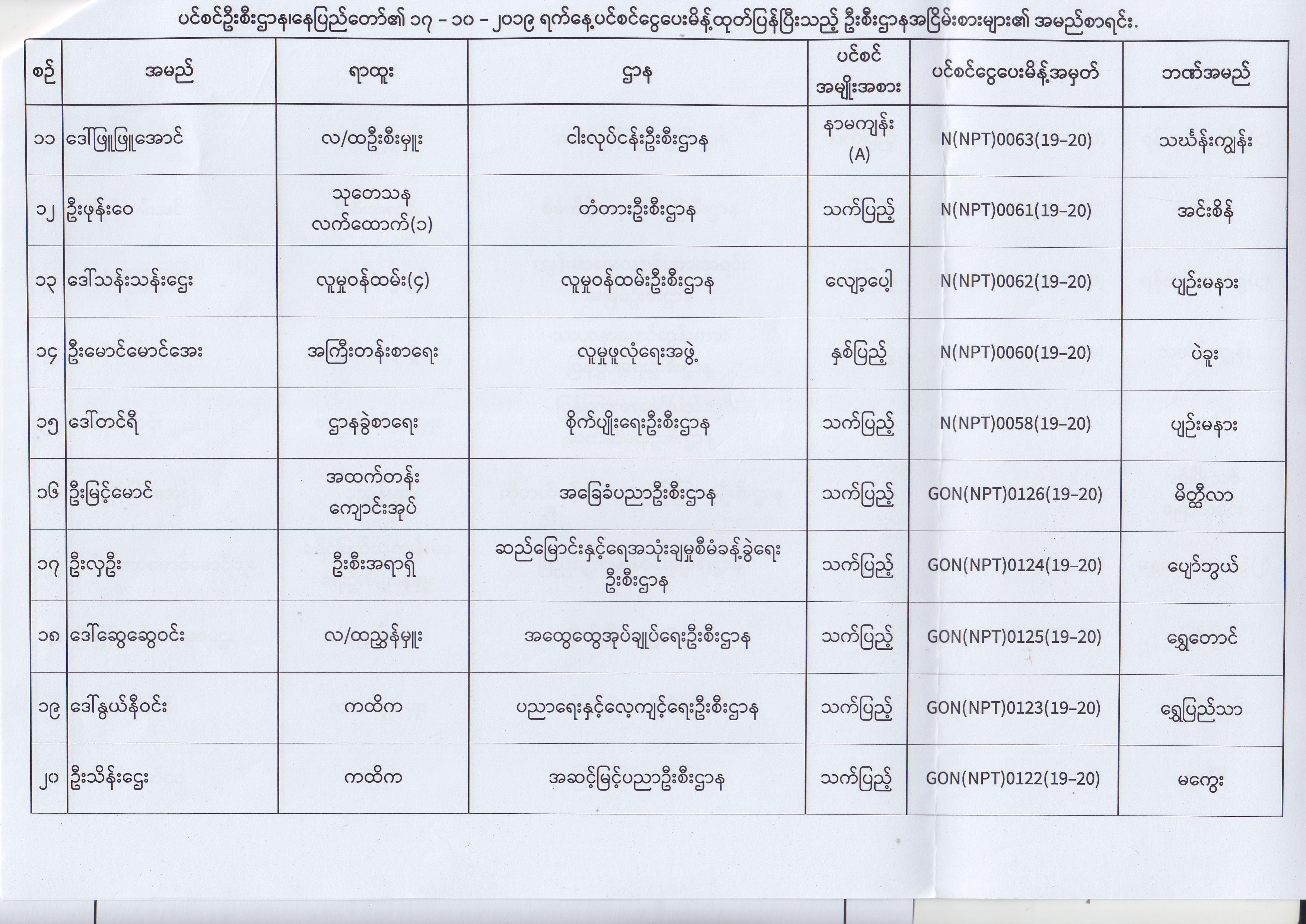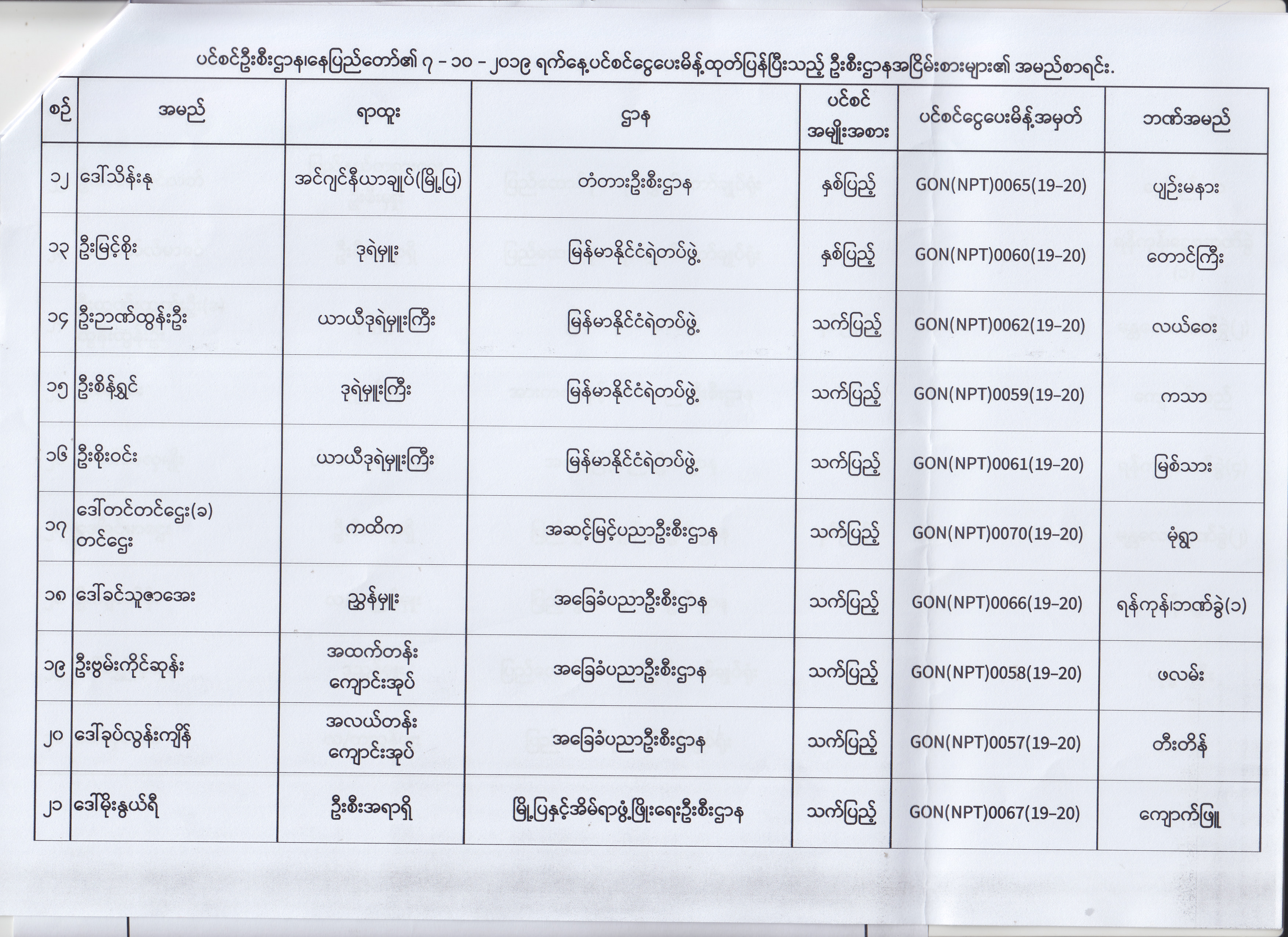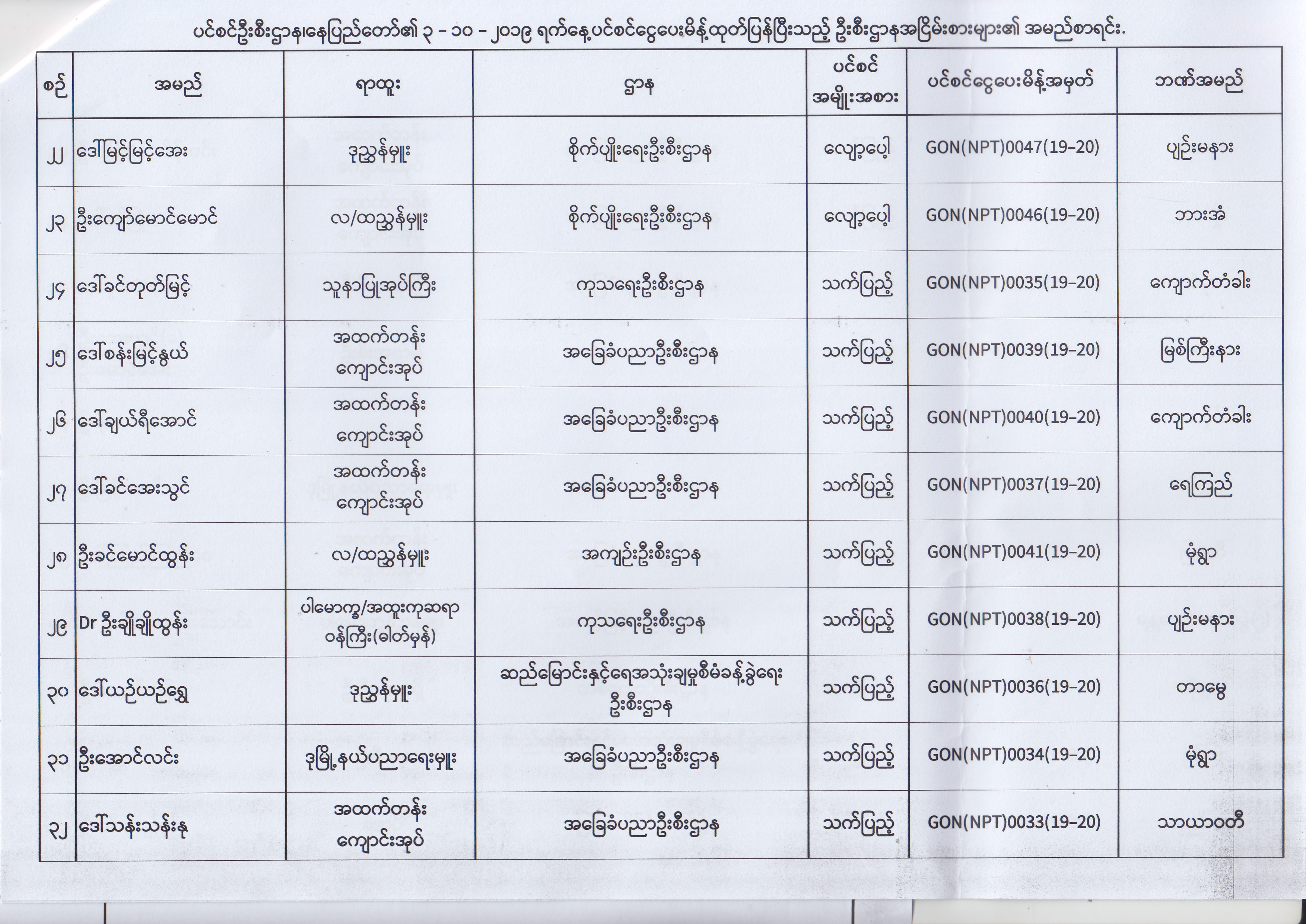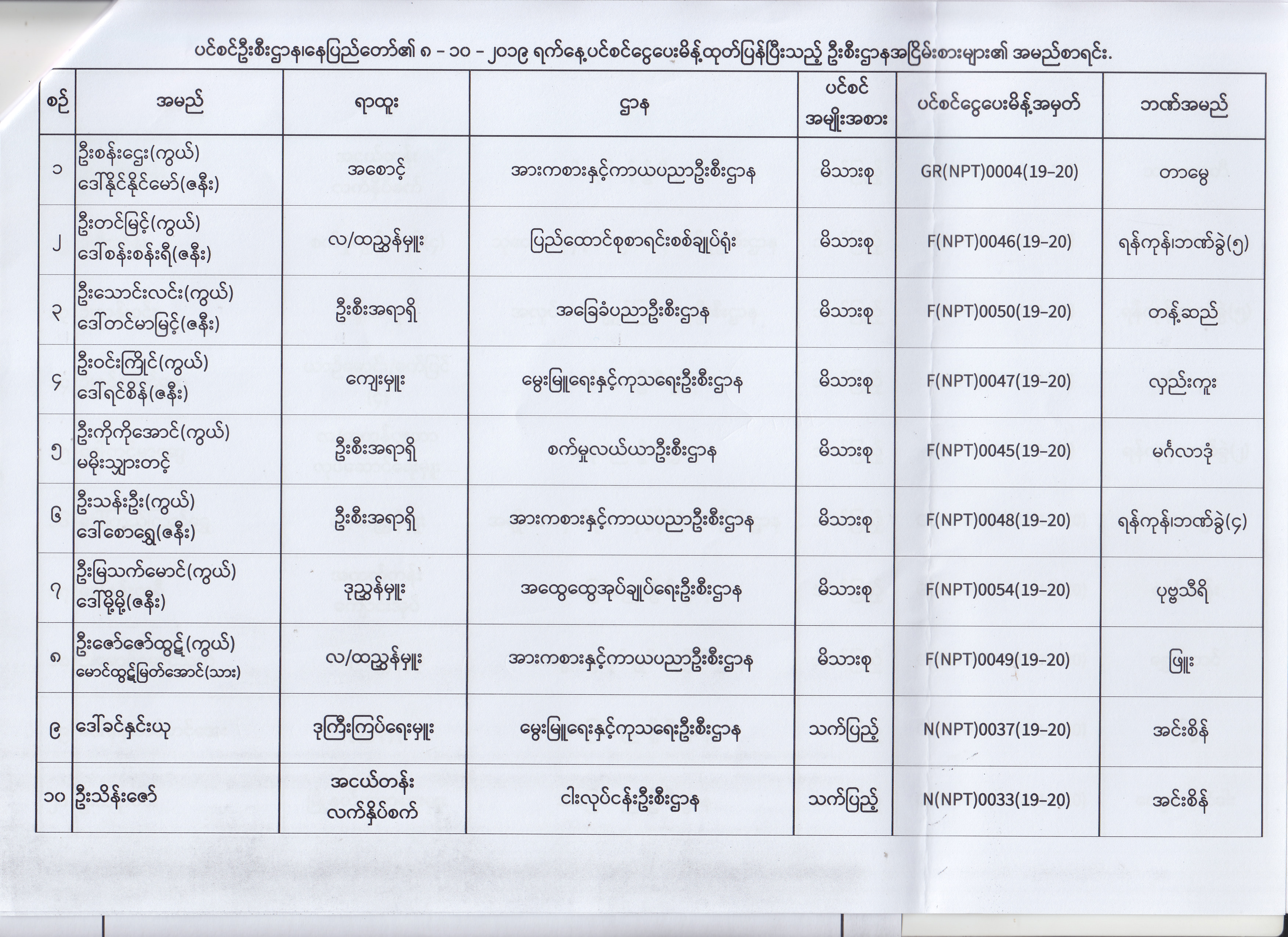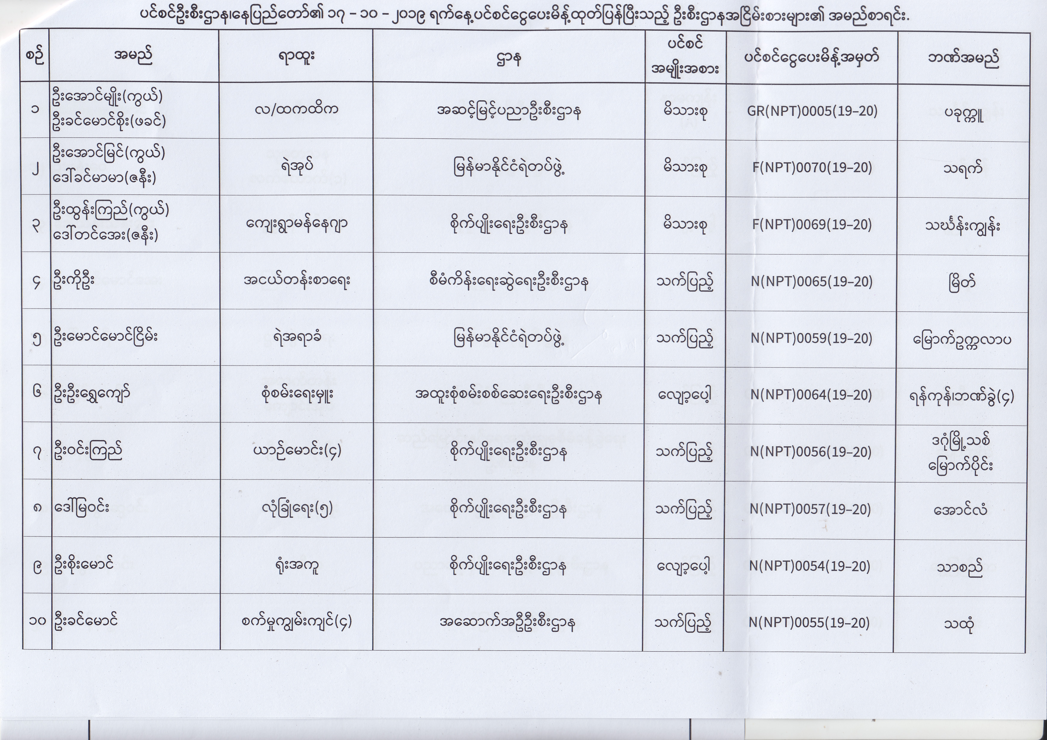 ပင်စင်ဦးစီးဌာန၊ နေပြည်တော်၏ (၁.၁၀.၂၀၁၉) မှ (၃၁.၁၀.၂၀၁၉) ရက်နေ့အထိ ပင်စင်ငွေပေးမိန့်ထုတ်ပြန်ပြီးသည့် ဦးစီးဌာနအငြိမ်းစားများ၏ အမည်စာရင်း