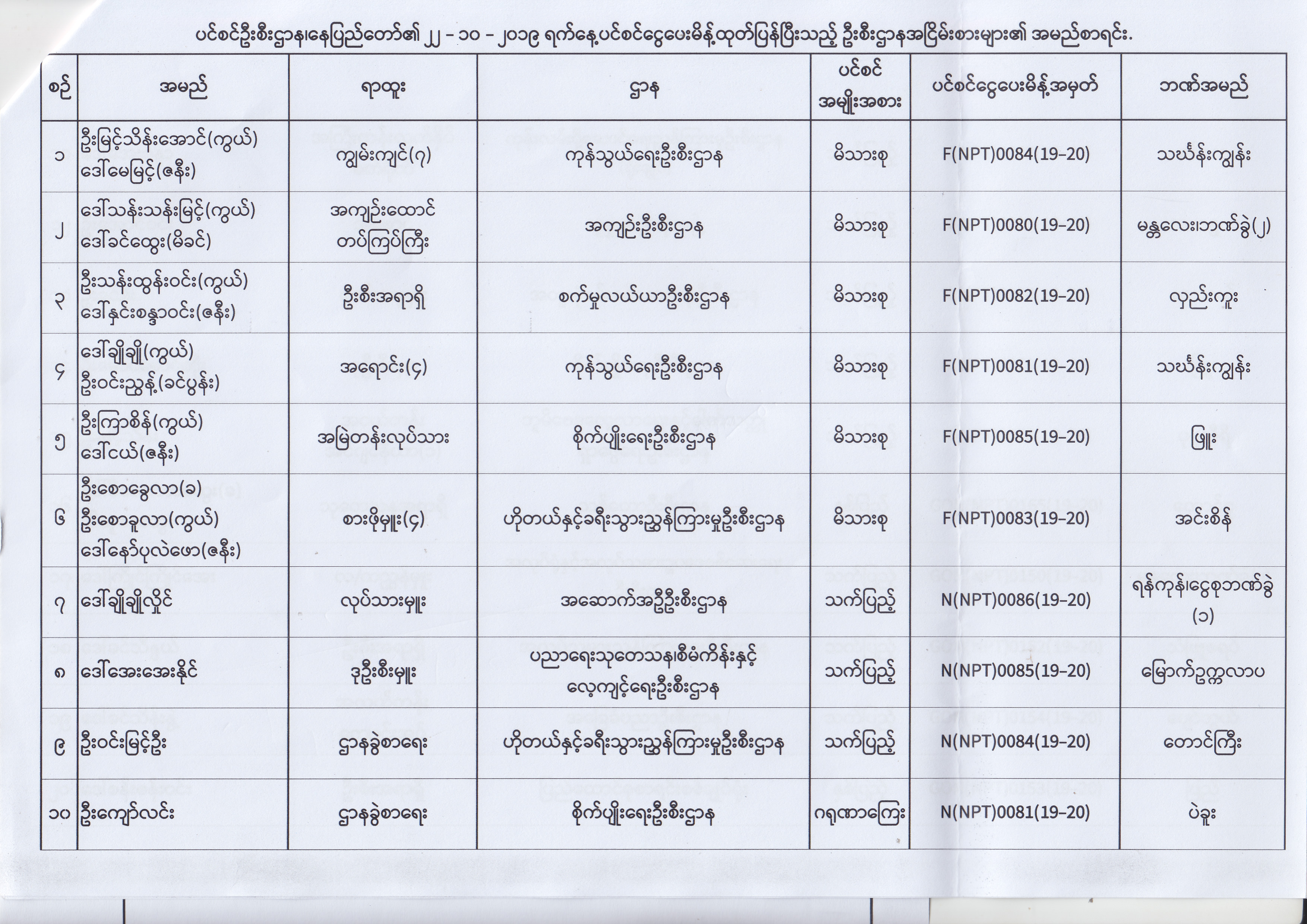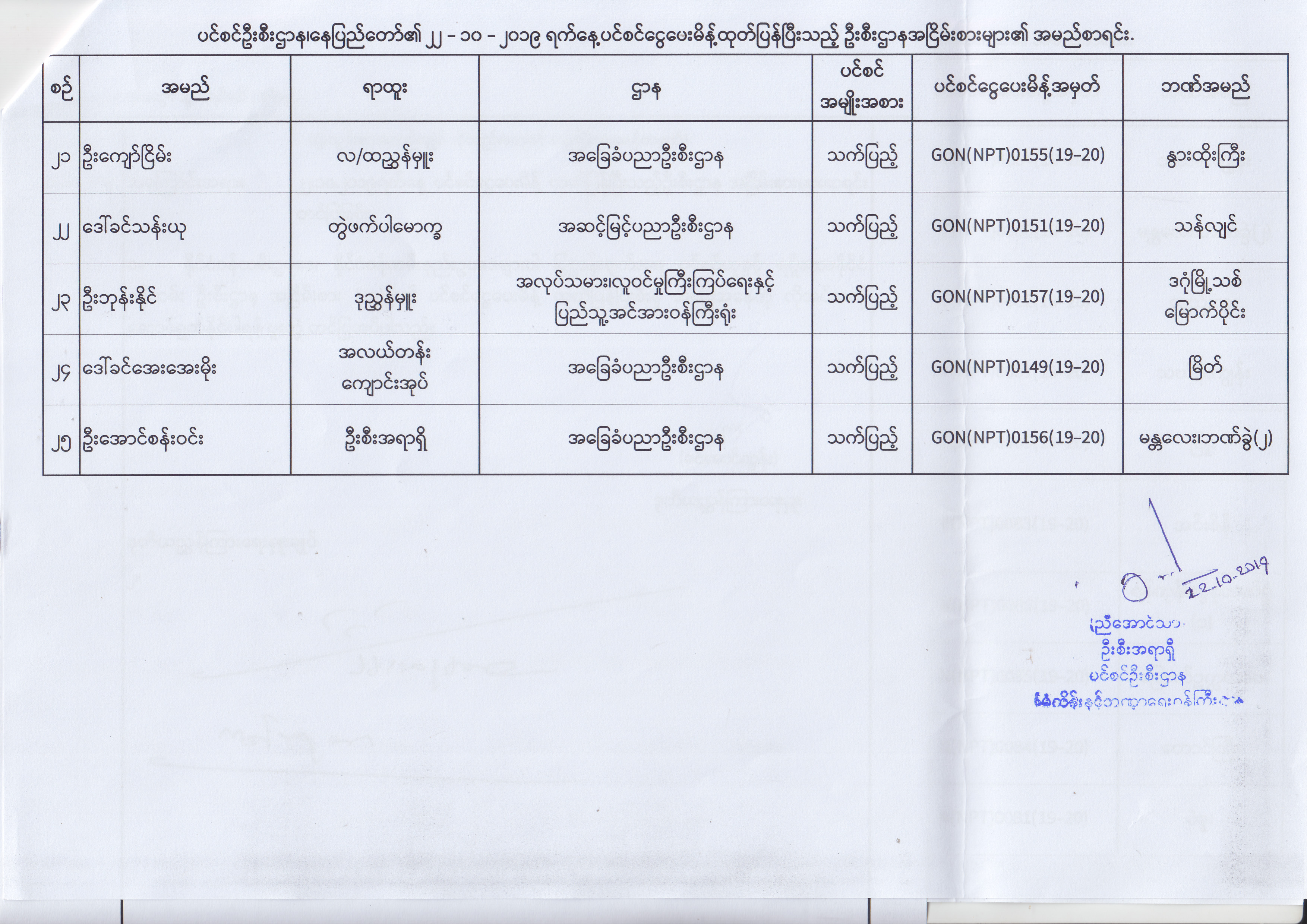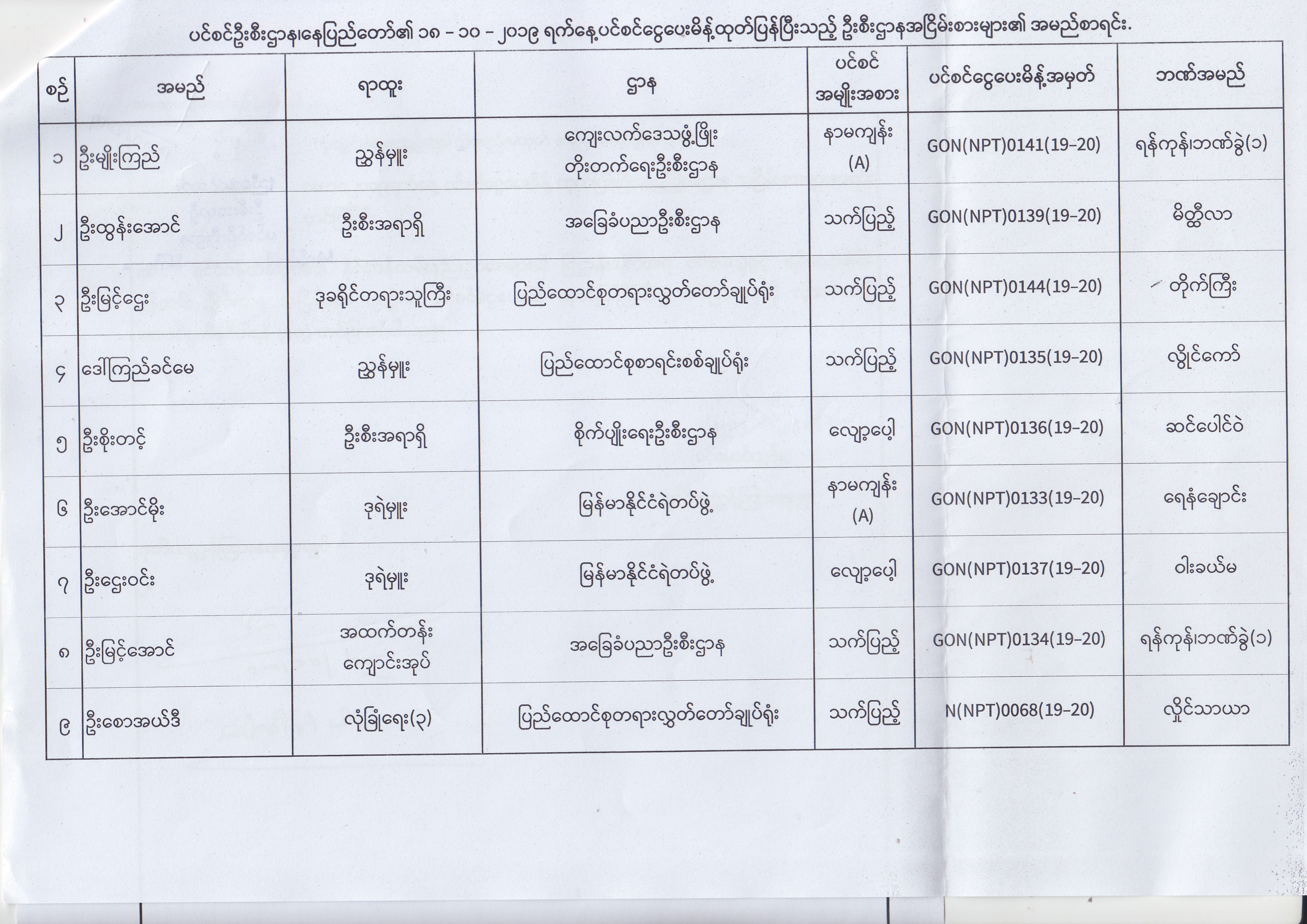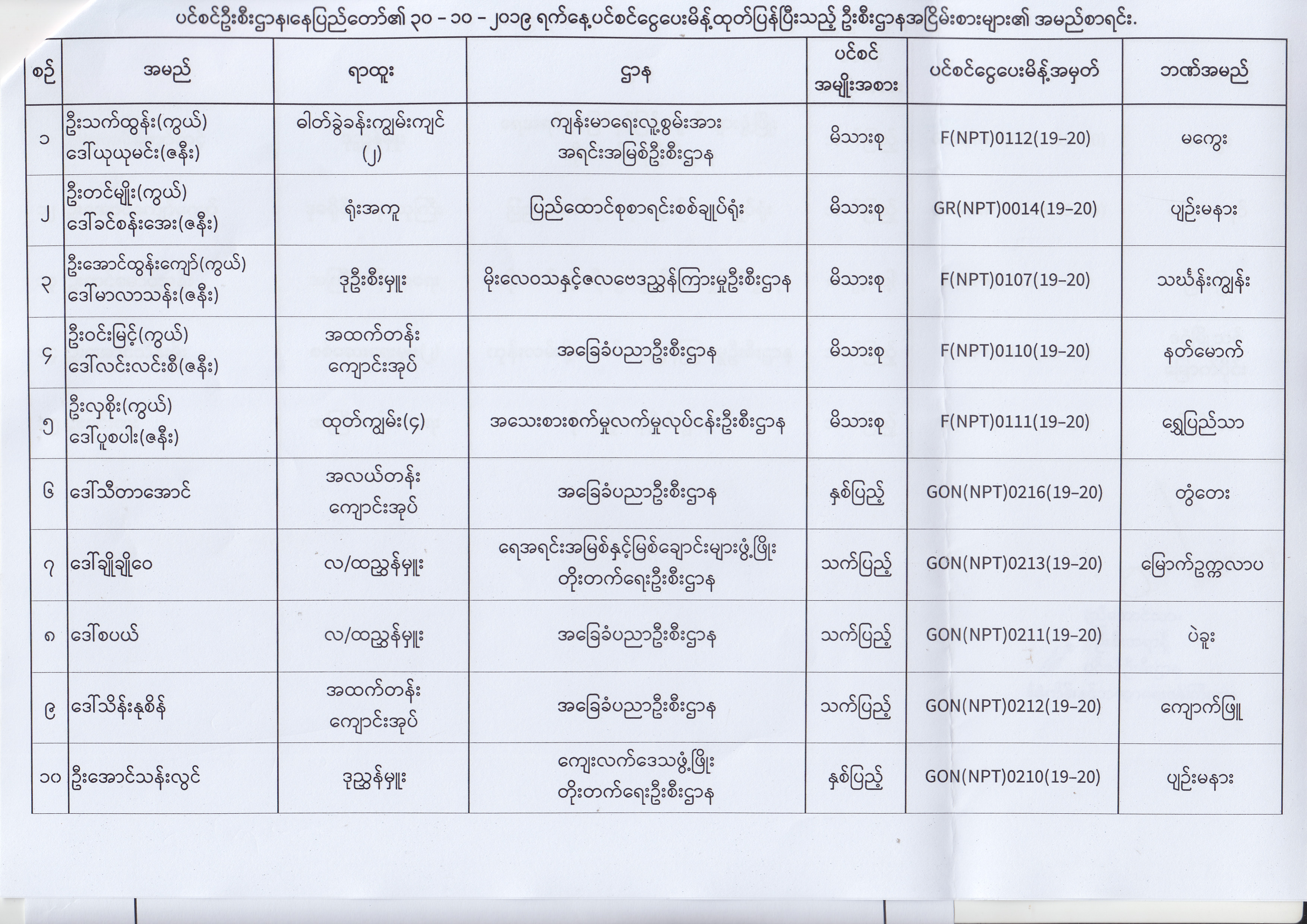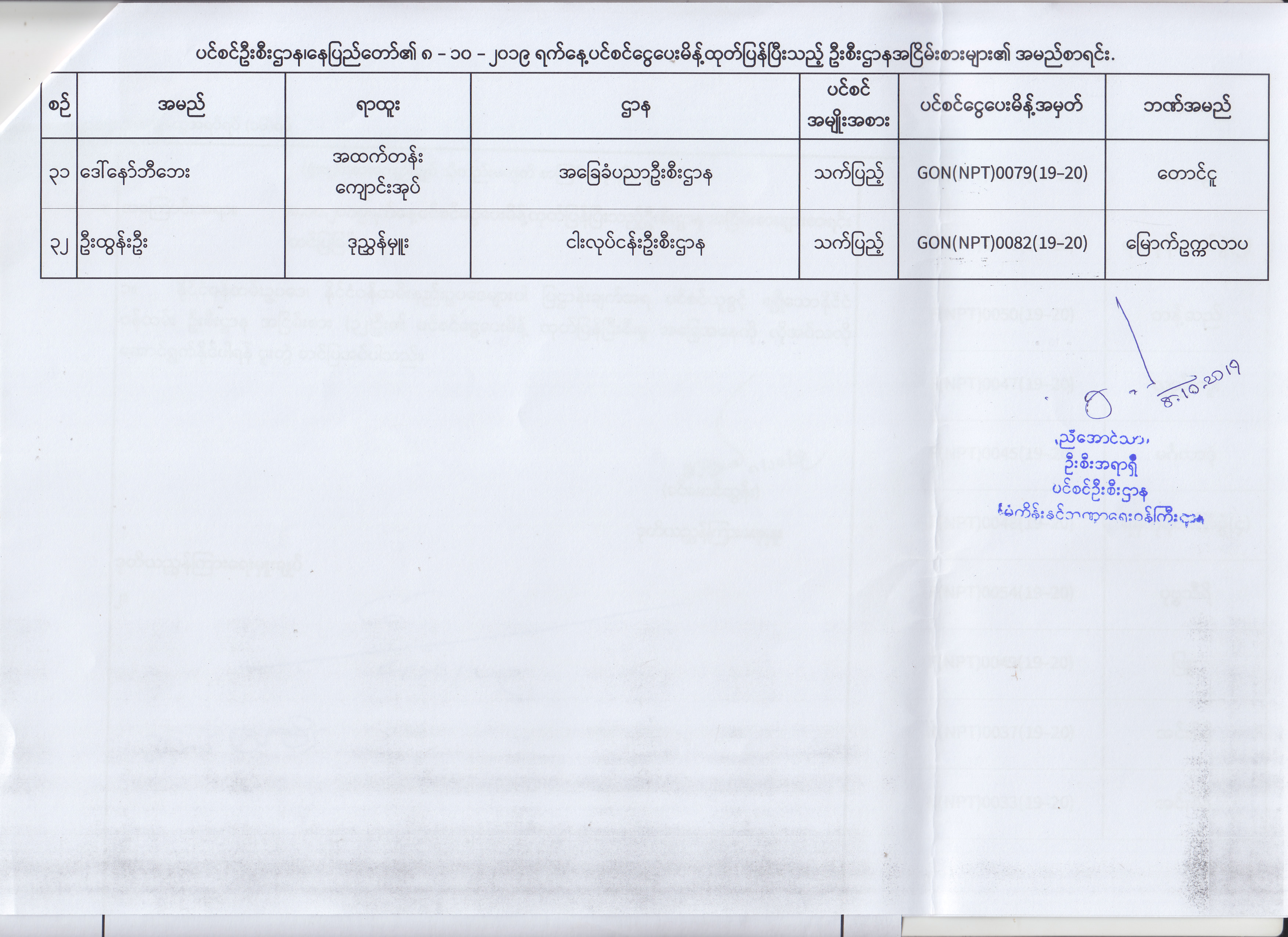 ပင်စင်ဦးစီးဌာန၊ နေပြည်တော်၏ (၁.၁၀.၂၀၁၉) မှ (၃၁.၁၀.၂၀၁၉) ရက်နေ့အထိ ပင်စင်ငွေပေးမိန့်ထုတ်ပြန်ပြီးသည့် ဦးစီးဌာနအငြိမ်းစားများ၏ အမည်စာရင်း