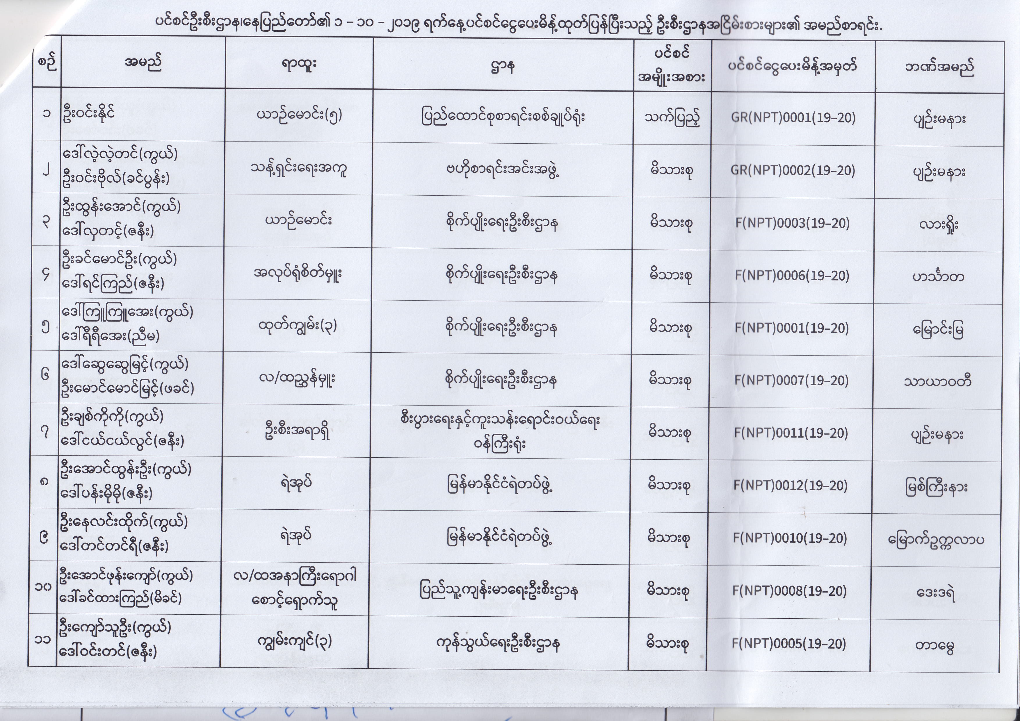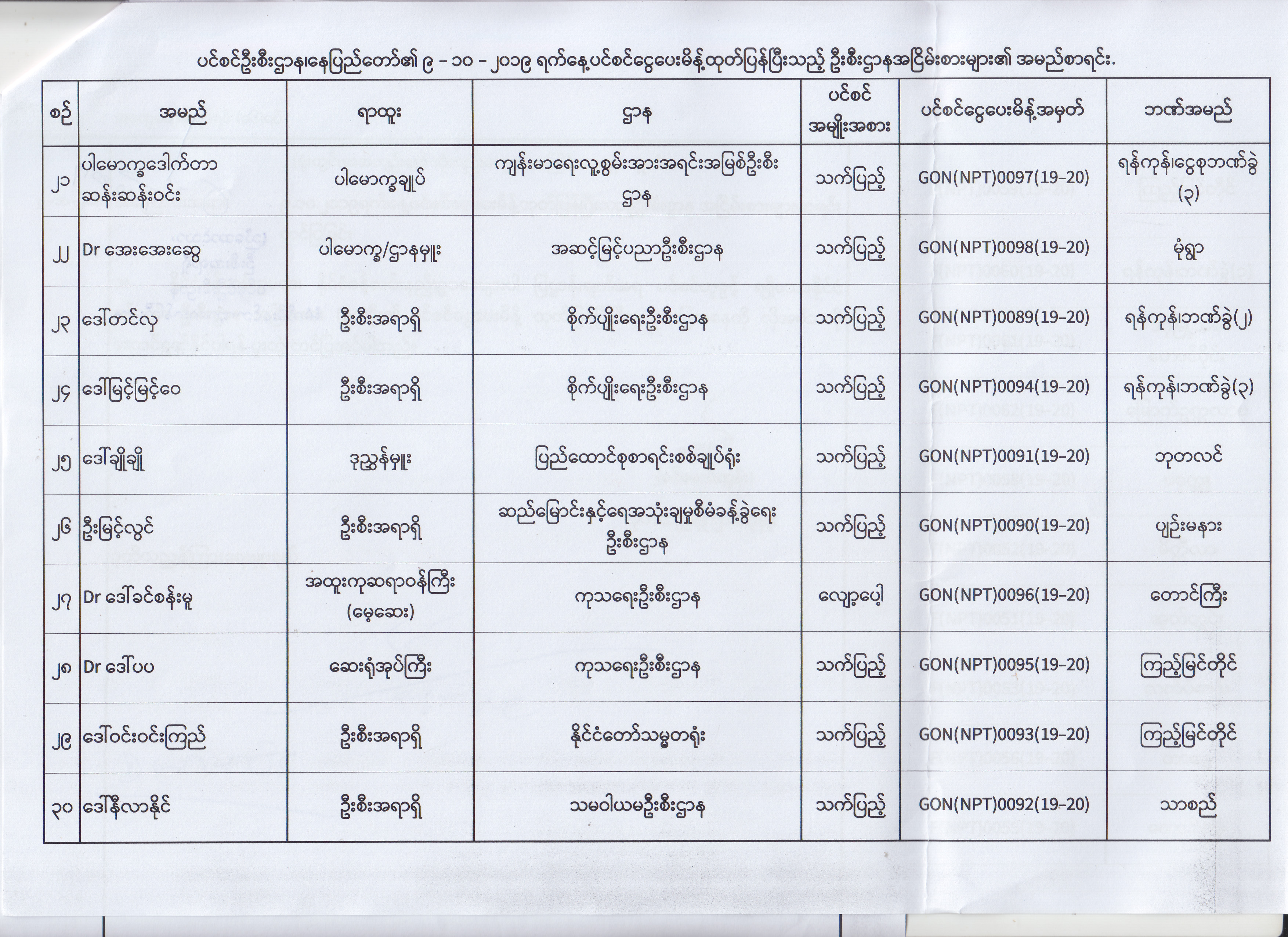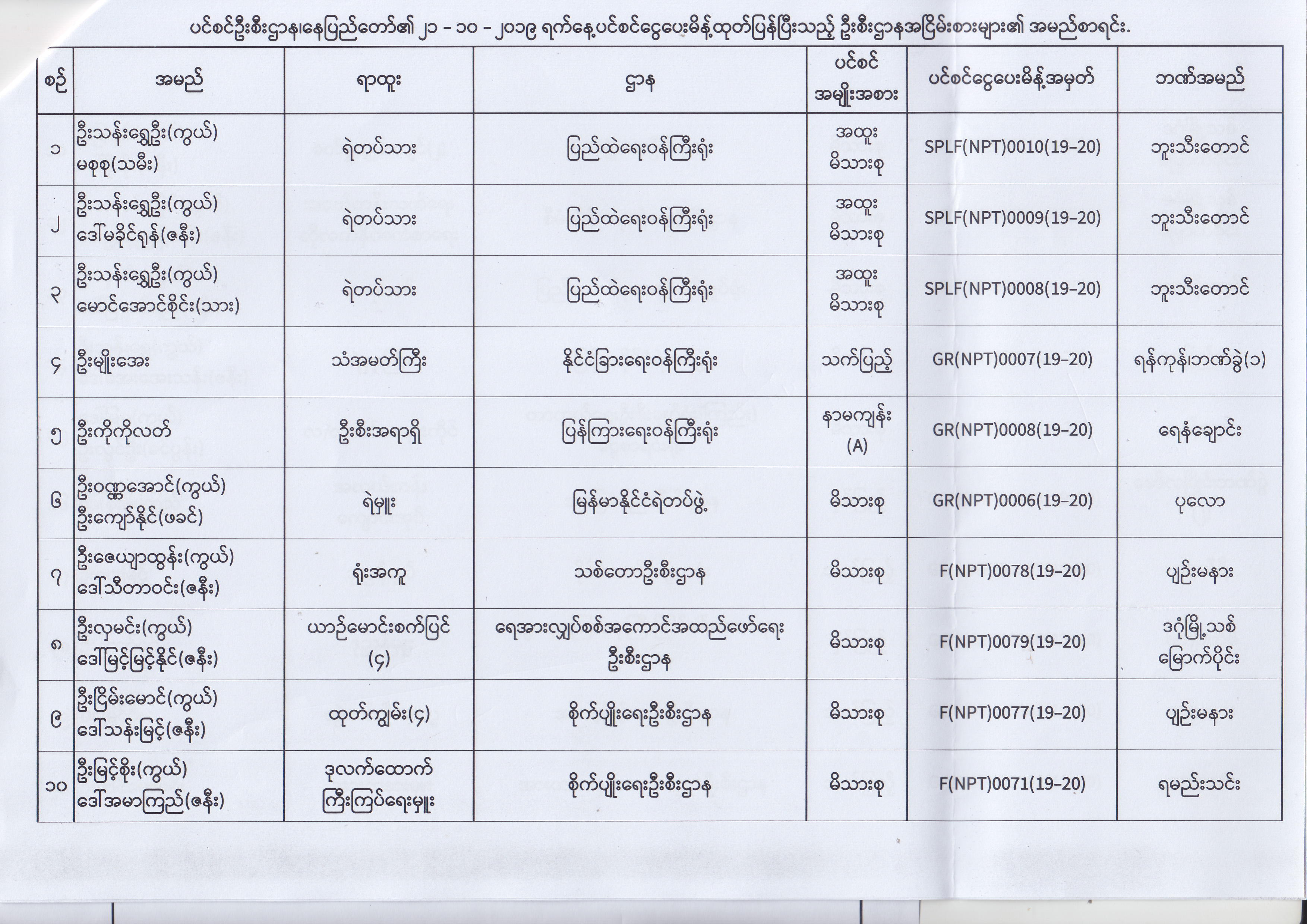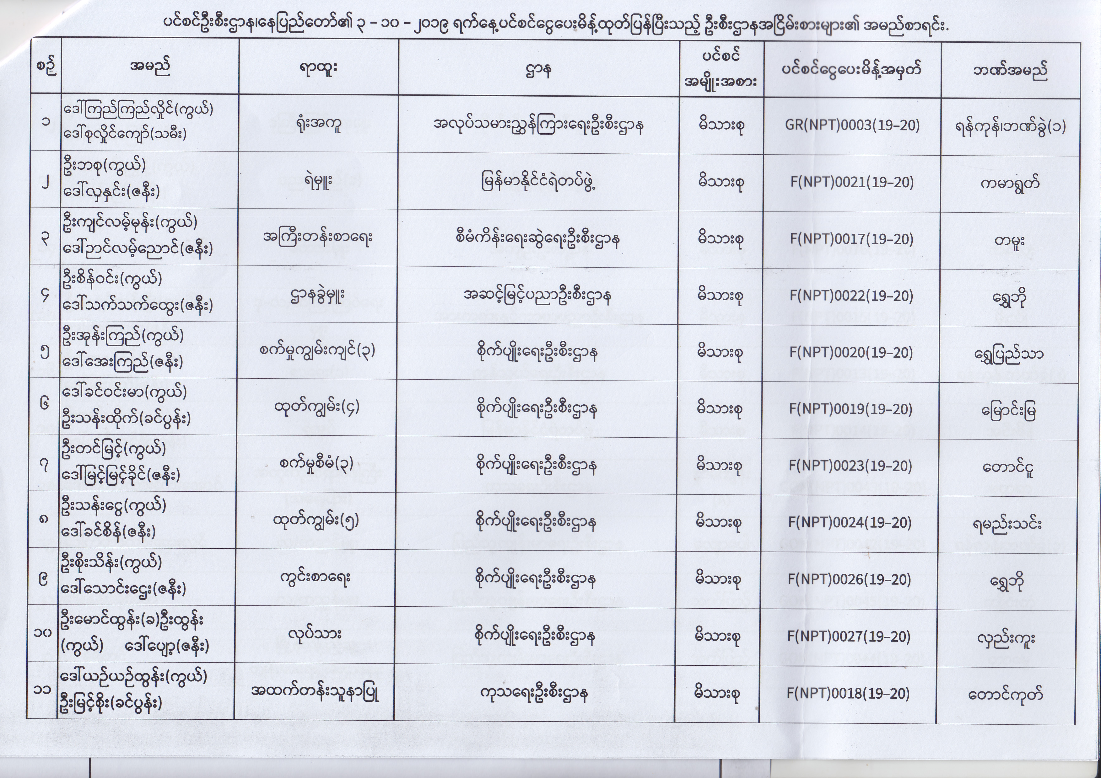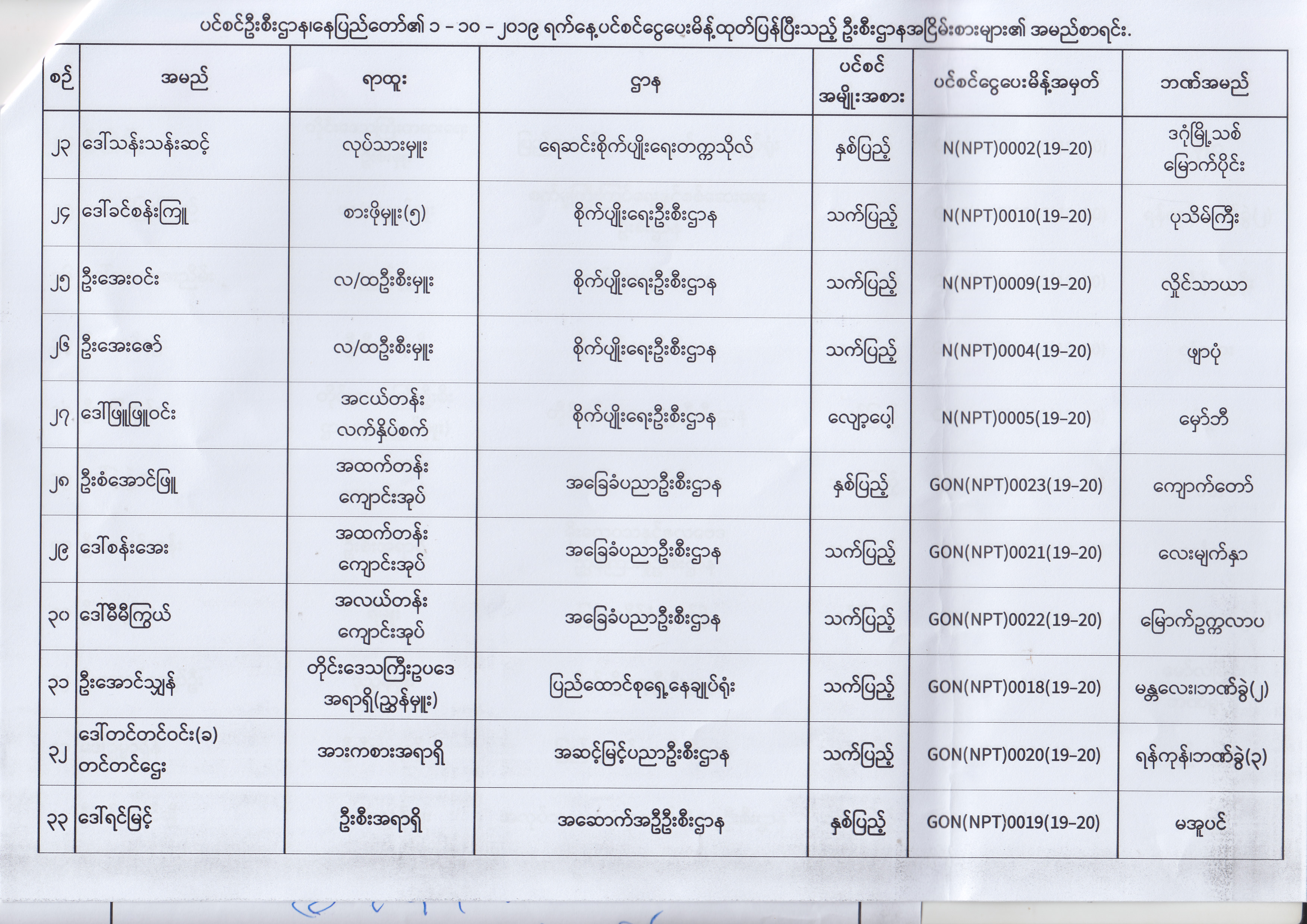 ပင်စင်ဦးစီးဌာန၊ နေပြည်တော်၏ (၁.၁၀.၂၀၁၉) မှ (၃၁.၁၀.၂၀၁၉) ရက်နေ့အထိ ပင်စင်ငွေပေးမိန့်ထုတ်ပြန်ပြီးသည့် ဦးစီးဌာနအငြိမ်းစားများ၏ အမည်စာရင်း