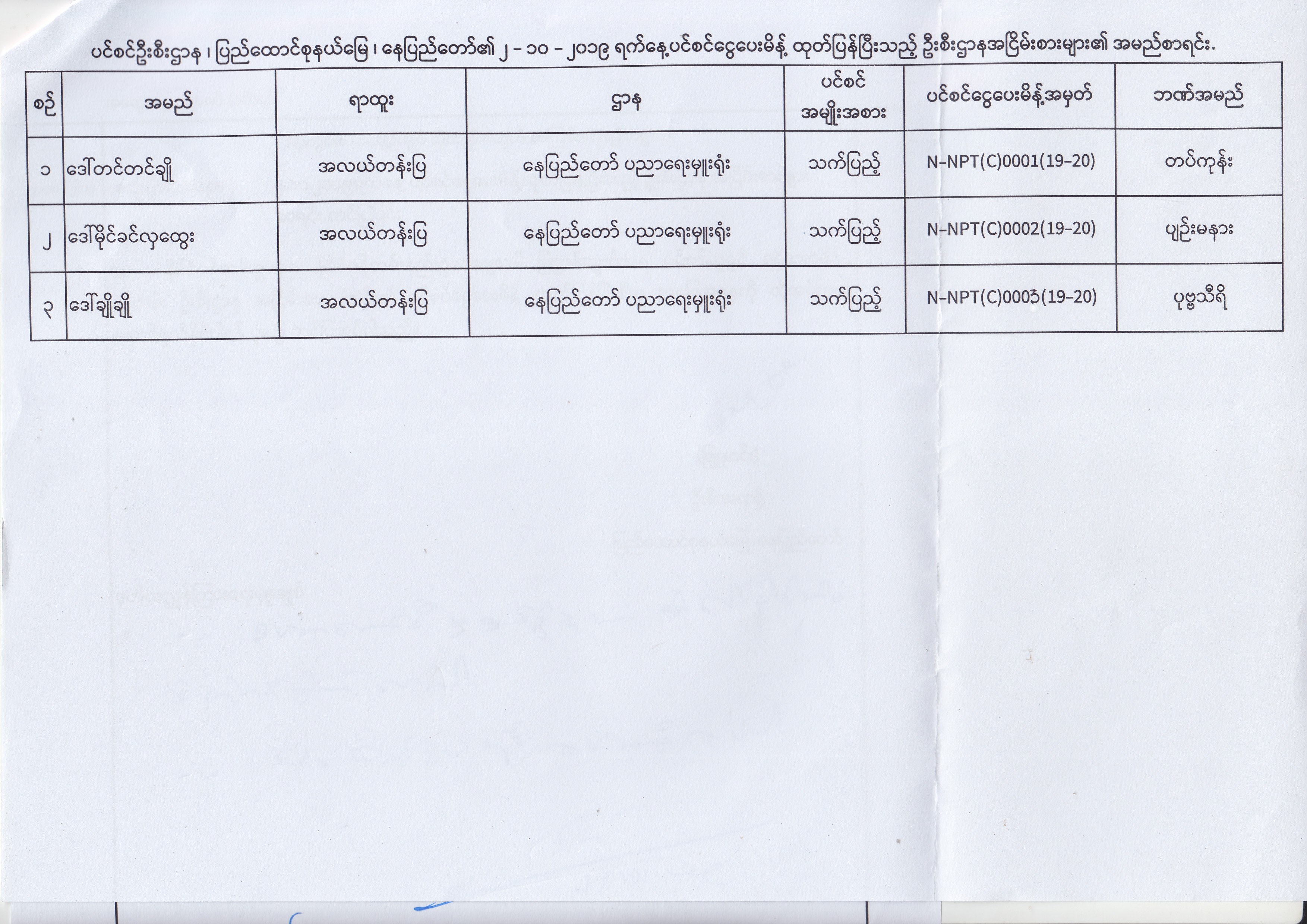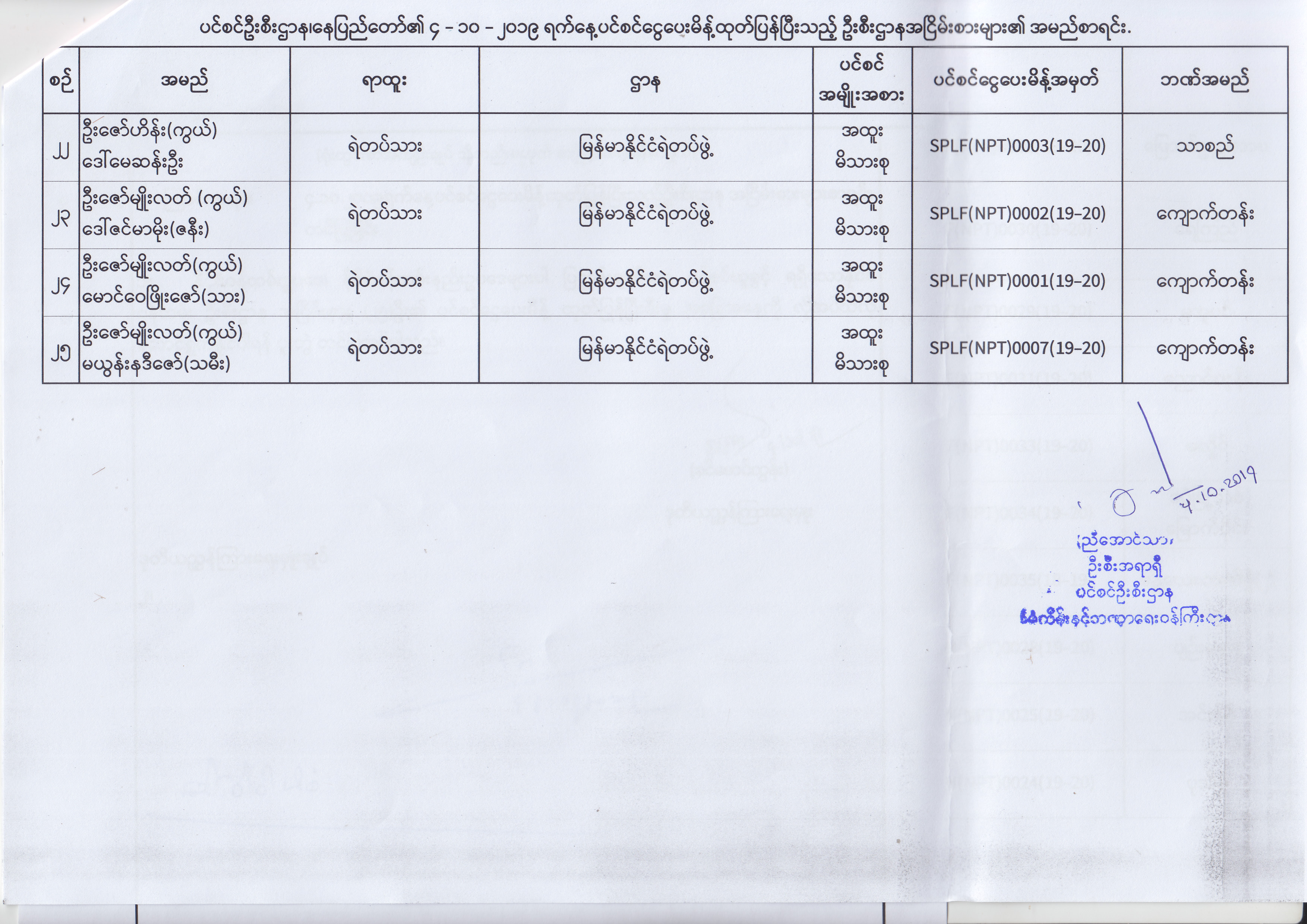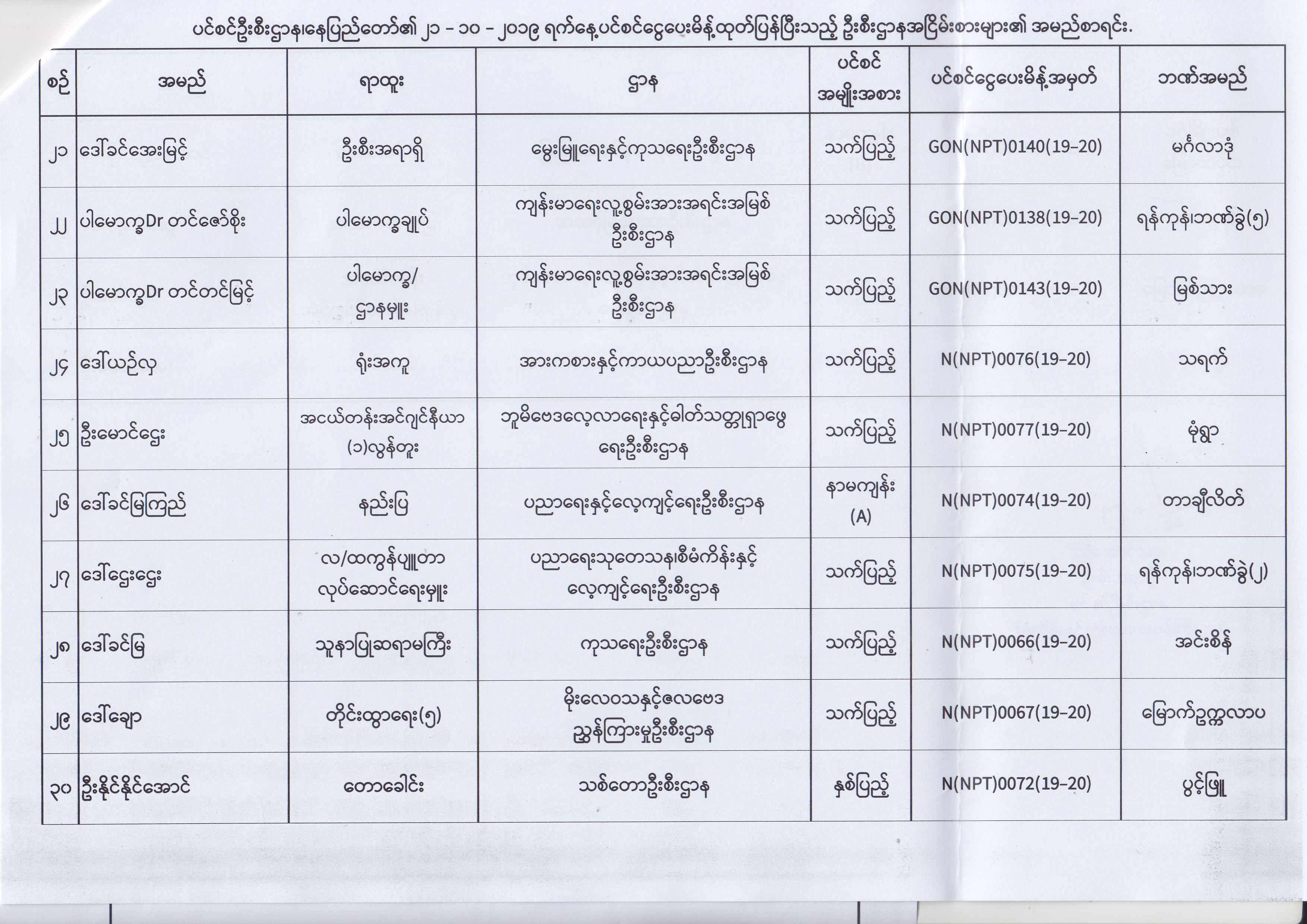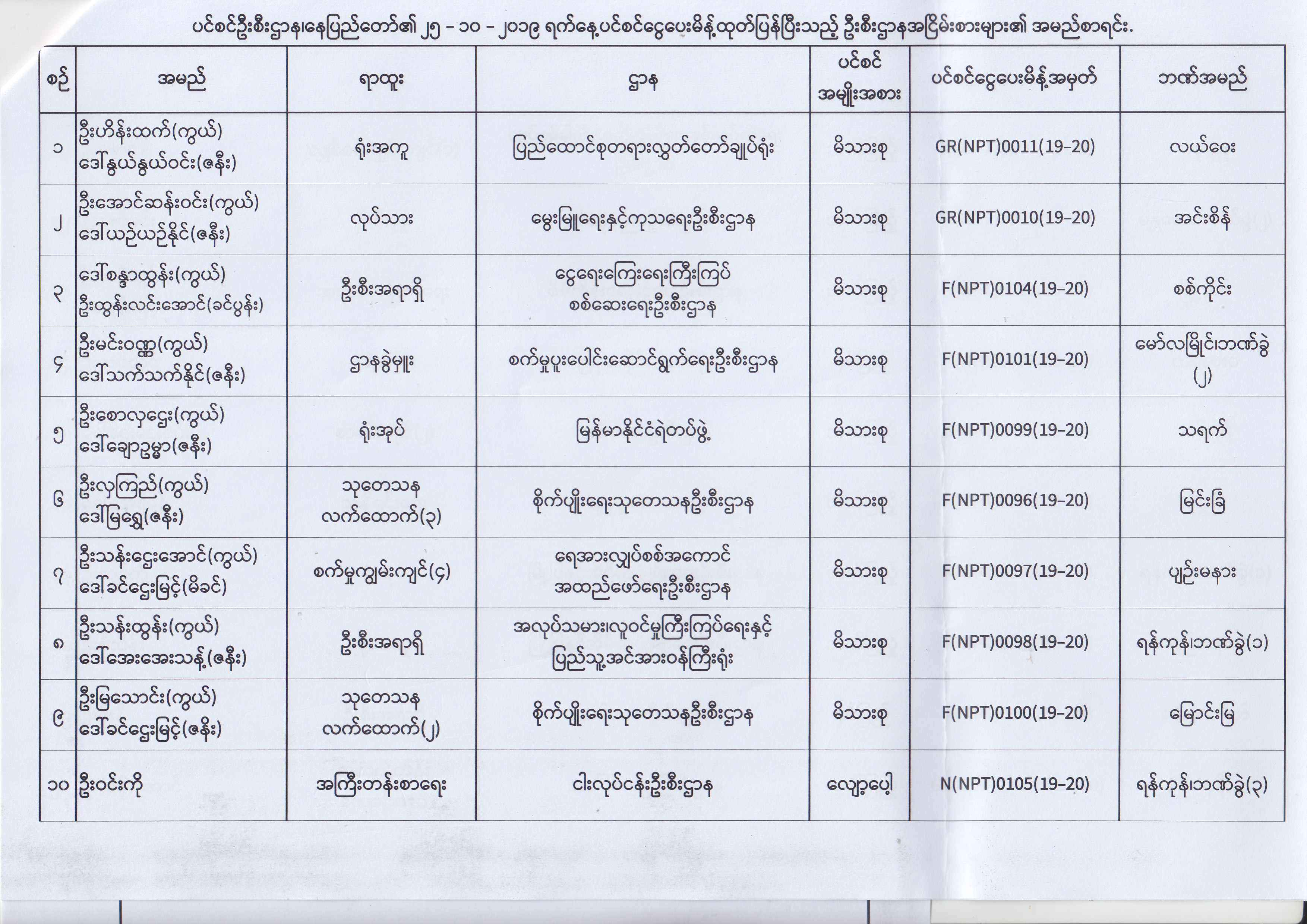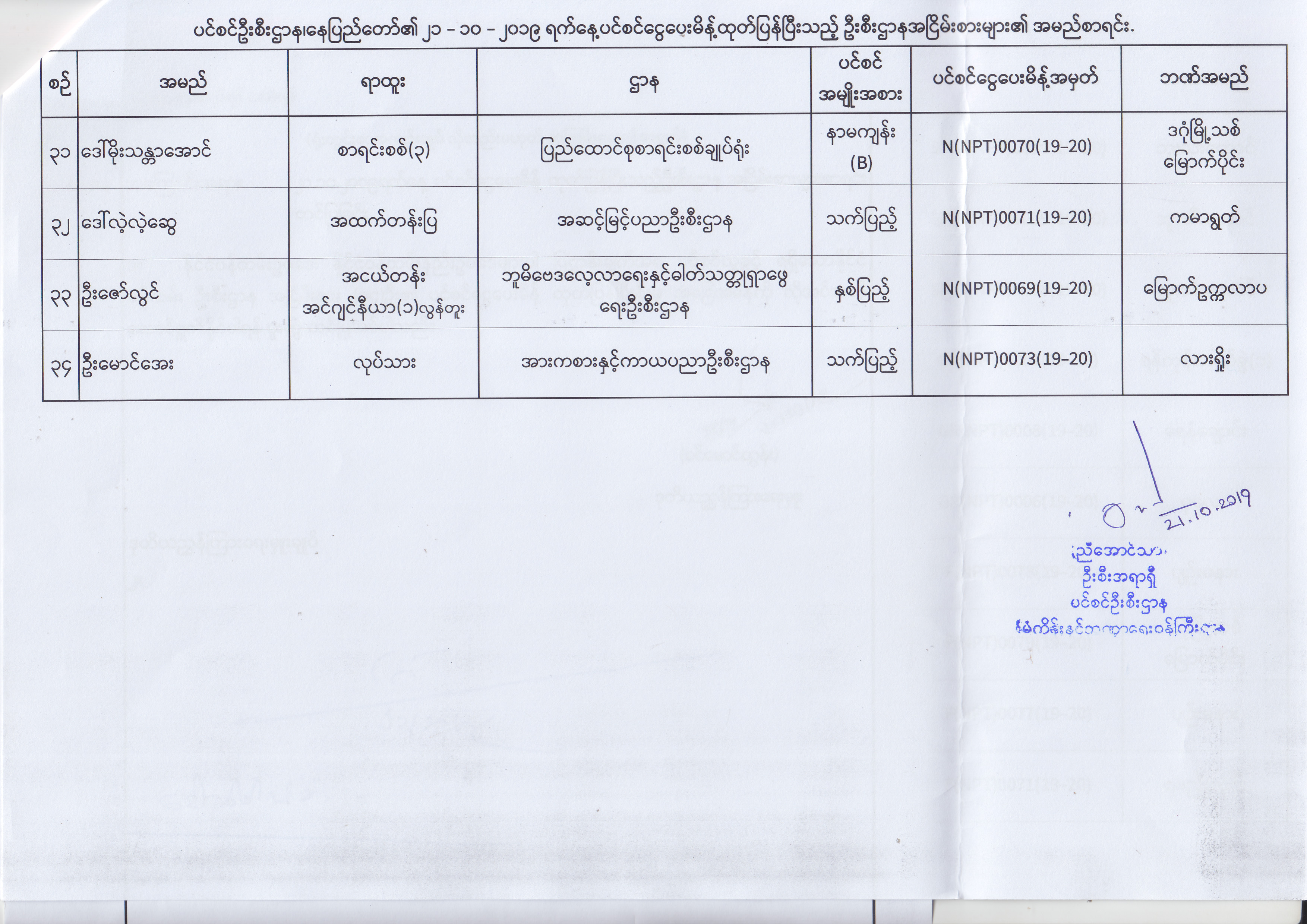 ပင်စင်ဦးစီးဌာန၊ နေပြည်တော်၏ (၁.၁၀.၂၀၁၉) မှ (၃၁.၁၀.၂၀၁၉) ရက်နေ့အထိ ပင်စင်ငွေပေးမိန့်ထုတ်ပြန်ပြီးသည့် ဦးစီးဌာနအငြိမ်းစားများ၏ အမည်စာရင်း